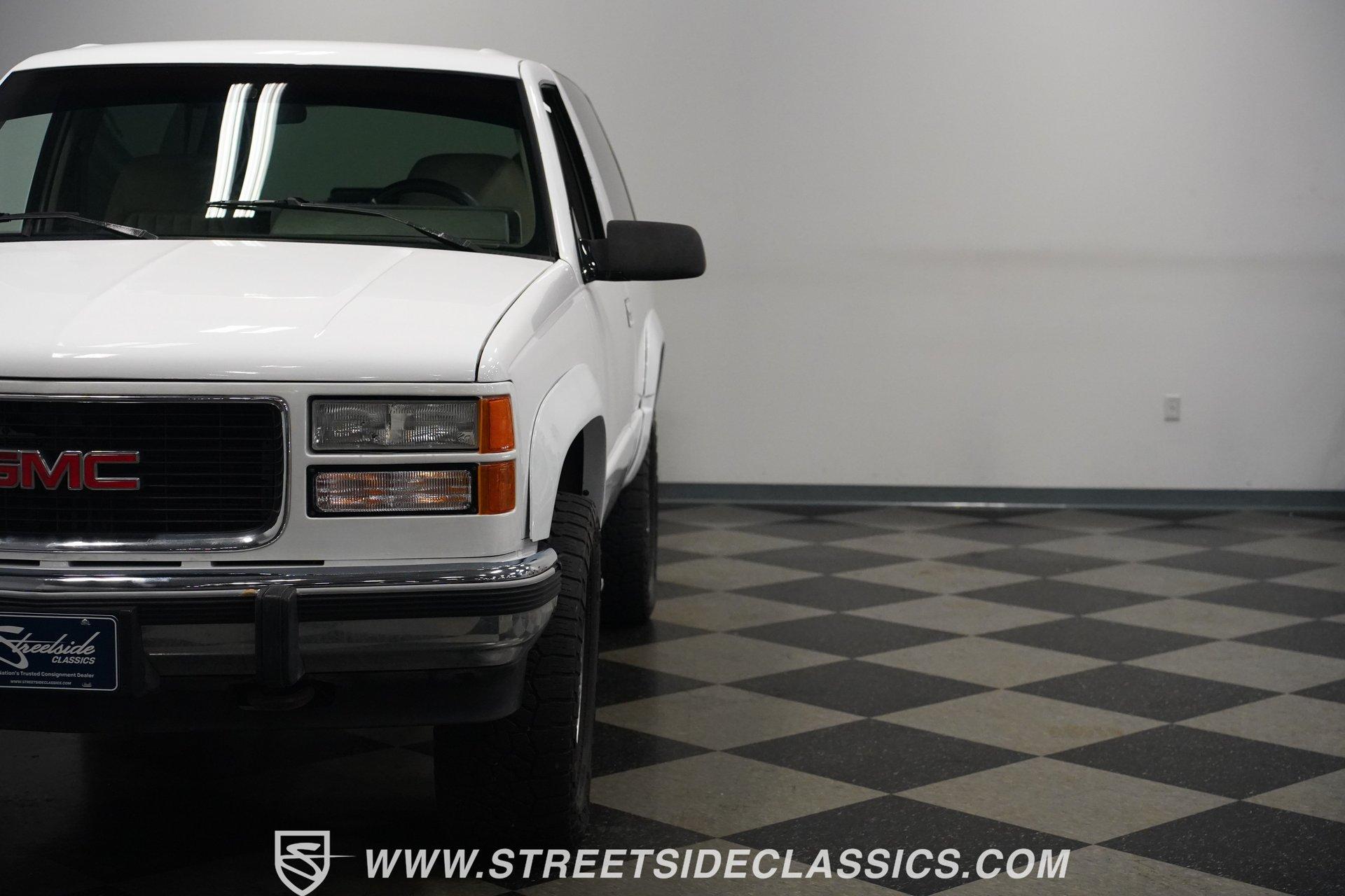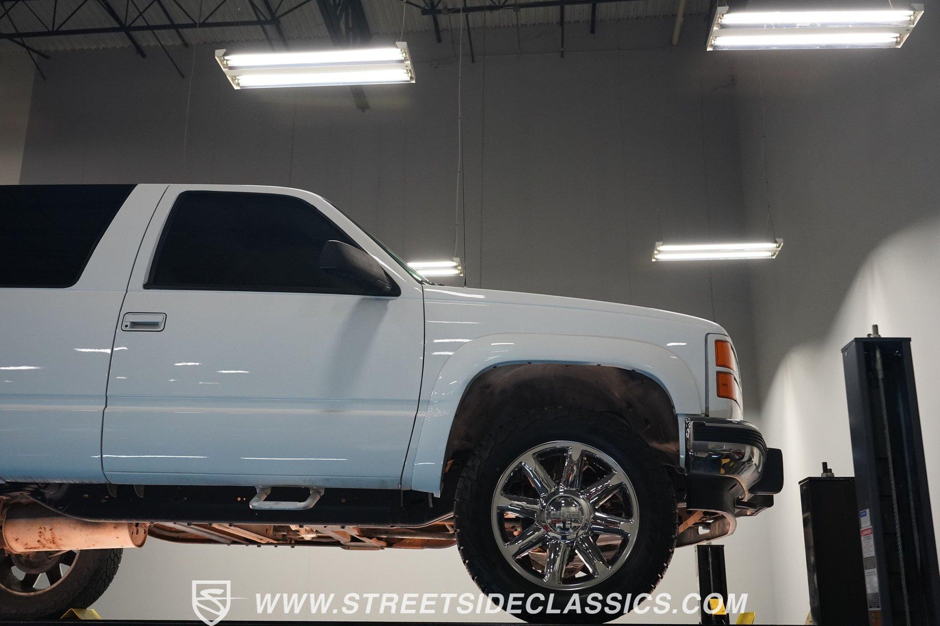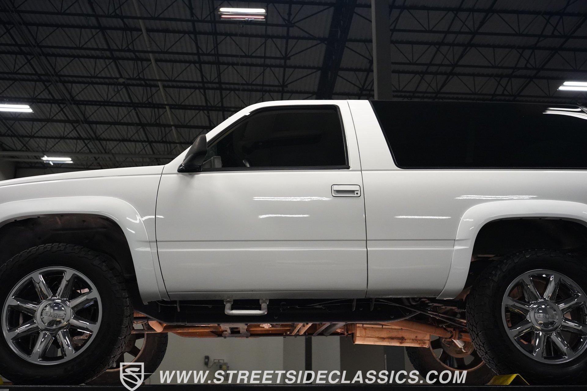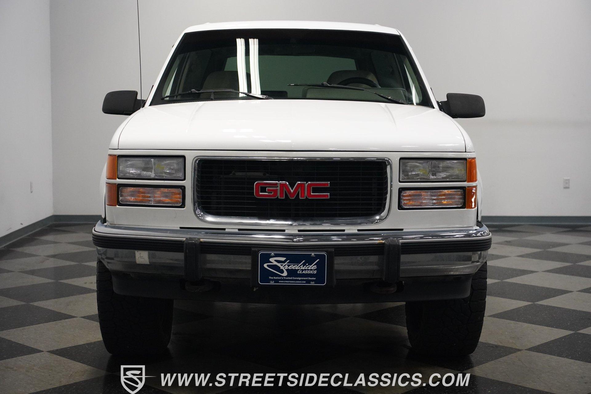 An Olympic White 1994 GMC Yukon 4X4 sits ready for action with its Rough Country lift kit elevating this off-road warrior to new heights. The pristinely applied paint highlights the bold, angular design of this two-door trail blazer, while custom painted headlight bezels and bright new lighting units modernize its front fascia. Gleaming chrome accents on the bumpers and steps create striking contrast against the snow-white exterior, and massive 20" GMC chrome wheels wrapped in aggressive LT305/55R20 tires establish an unmistakable presence. Dark tinted windows complete the look of this backcountry explorer, built for venturing where ordinary vehicles fear to tread. The light gray cloth interior welcomes adventurers with supportive bucket seats designed for comfort during extended expeditions. Time has been kind to the dash and door panels, which remain free of unsightly cracks despite countless outdoor excursions. The upgraded aftermarket sound system provides modern connectivity through AUX, USB, and SD card inputs - perfect for curating the soundtrack to your wilderness journeys. The uncluttered cabin layout features a practical column shifter maintaining classic GMC functionality, while power seats and mirrors allow for quick adjustments when switching drivers mid-adventure. The muscular 5.7 Liter V8 engine pairs flawlessly with a 4L60E 4-speed automatic transmission for conquering diverse terrains. This Yukon's advanced suspension system includes specialized Rough Country shocks working in concert with reinforced upper A-arms to absorb punishment from rugged landscapes. A 3.73 Positraction rear end optimizes traction distribution when traversing challenging surfaces, ensuring all four wheels maintain maximum grip. Power disc brakes provide exceptional control, while the dual exhaust system lets the capable V8 announce its presence with authority during spirited driving sessions. HIGHLIGHTS: 5.7 Liter V8 Engine 4 Speed Automatic Transmission (4L60E) Electronic Fuel Injection 3.73 Positraction Rear End 4X4 Drivetrain Rough Country Lift Kit Upgraded Upper A-Arms Power Disc Brakes Dual Exhaust Olympic White Paint 20" GMC Chrome Wheels in LT305/55R20 Tires Chrome Bumpers and Steps Painted Headlight Bezels Newer Headlights Tinted Windows 2-Door Body Style Light Gray Cloth Interior with Bucket Seats Power Seats Power Mirrors Aftermarket Stereo (AUX, USB, SD Card) Power Steering Column Shifter Owner's Manual Fusing genuine off-road capability with everyday drivability, this 1994 GMC Yukon 4X4 delivers V8 power, exceptional ground clearance, and driver-friendly features in one complete package. From weekend trail adventures to daily commutes, this lifted Yukon stands ready for your next expedition. Call today!