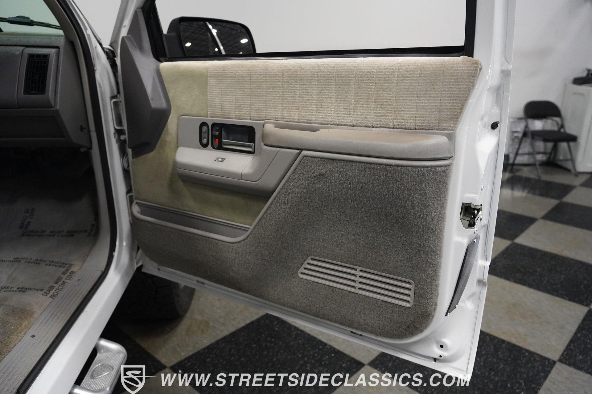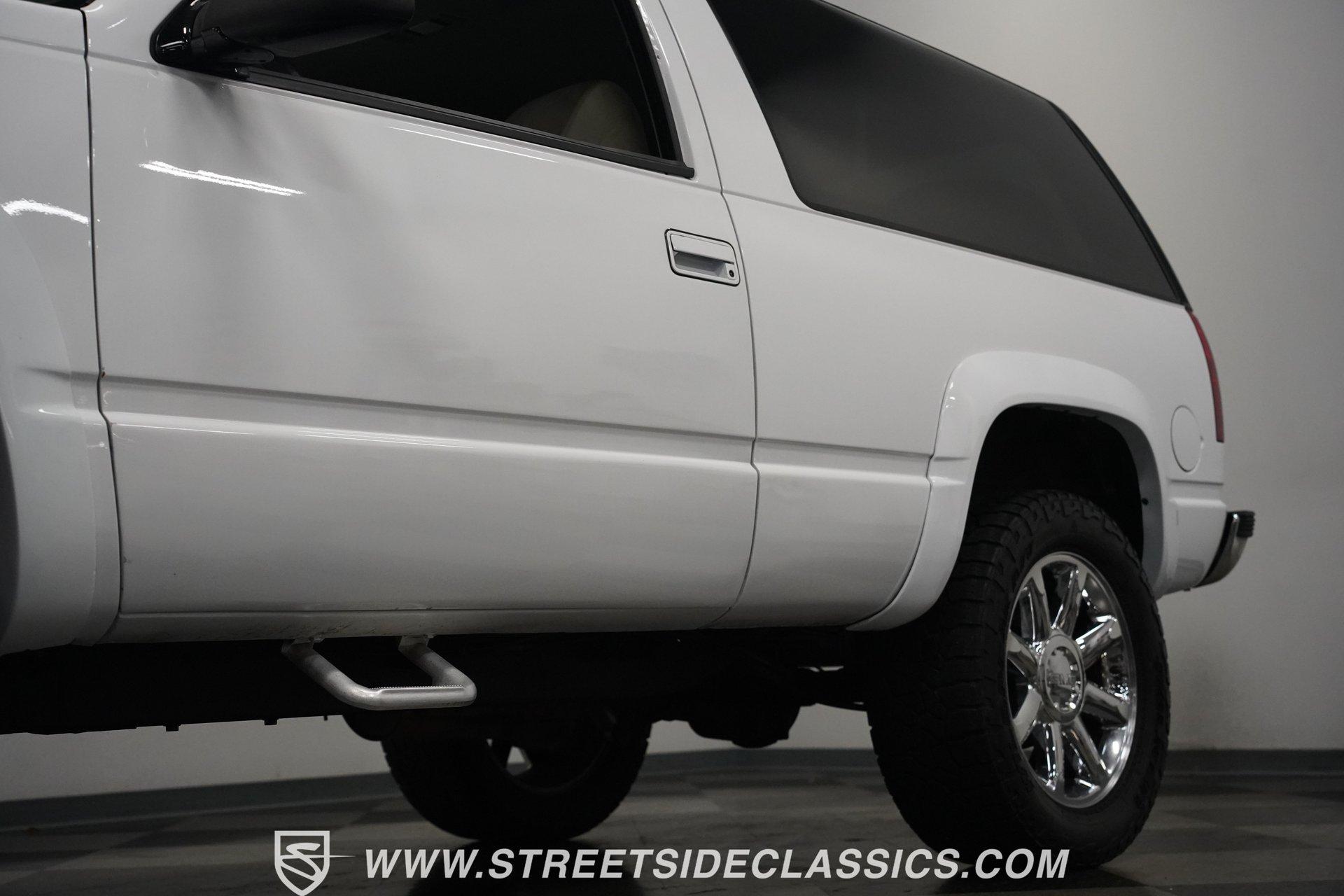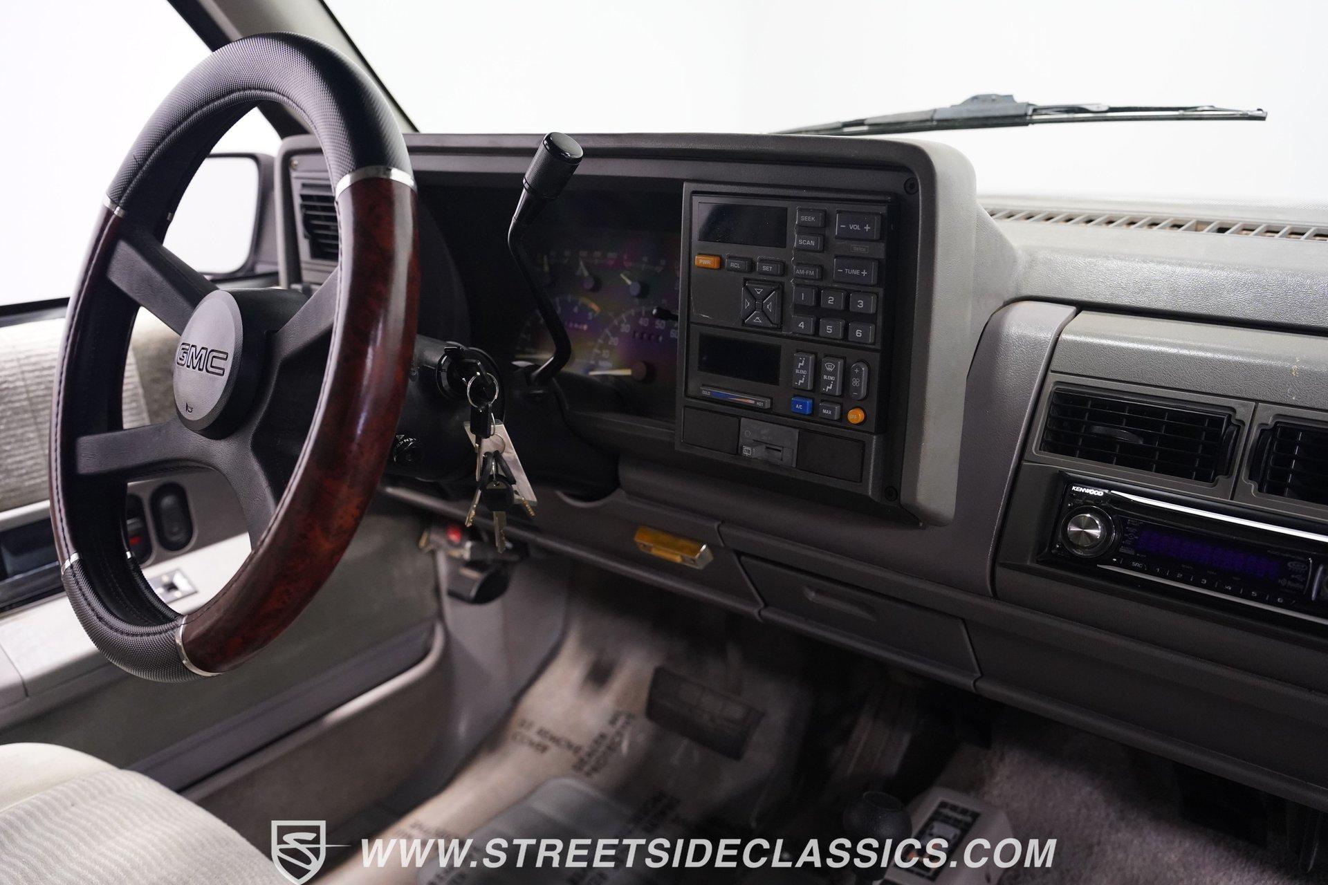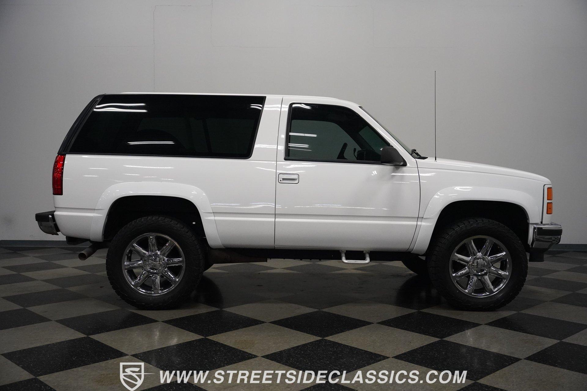 An Olympic White 1994 GMC Yukon 4X4 sits ready for action with its Rough Country lift kit elevating this off-road warrior to new heights. The pristinely applied paint highlights the bold, angular design of this two-door trail blazer, while custom painted headlight bezels and bright new lighting units modernize its front fascia. Gleaming chrome accents on the bumpers and steps create striking contrast against the snow-white exterior, and massive 20" GMC chrome wheels wrapped in aggressive LT305/55R20 tires establish an unmistakable presence. Dark tinted windows complete the look of this backcountry explorer, built for venturing where ordinary vehicles fear to tread. The light gray cloth interior welcomes adventurers with supportive bucket seats designed for comfort during extended expeditions. Time has been kind to the dash and door panels, which remain free of unsightly cracks despite countless outdoor excursions. The upgraded aftermarket sound system provides modern connectivity through AUX, USB, and SD card inputs - perfect for curating the soundtrack to your wilderness journeys. The uncluttered cabin layout features a practical column shifter maintaining classic GMC functionality, while power seats and mirrors allow for quick adjustments when switching drivers mid-adventure. The muscular 5.7 Liter V8 engine pairs flawlessly with a 4L60E 4-speed automatic transmission for conquering diverse terrains. This Yukon's advanced suspension system includes specialized Rough Country shocks working in concert with reinforced upper A-arms to absorb punishment from rugged landscapes. A 3.73 Positraction rear end optimizes traction distribution when traversing challenging surfaces, ensuring all four wheels maintain maximum grip. Power disc brakes provide exceptional control, while the dual exhaust system lets the capable V8 announce its presence with authority during spirited driving sessions. HIGHLIGHTS: 5.7 Liter V8 Engine 4 Speed Automatic Transmission (4L60E) Electronic Fuel Injection 3.73 Positraction Rear End 4X4 Drivetrain Rough Country Lift Kit Upgraded Upper A-Arms Power Disc Brakes Dual Exhaust Olympic White Paint 20" GMC Chrome Wheels in LT305/55R20 Tires Chrome Bumpers and Steps Painted Headlight Bezels Newer Headlights Tinted Windows 2-Door Body Style Light Gray Cloth Interior with Bucket Seats Power Seats Power Mirrors Aftermarket Stereo (AUX, USB, SD Card) Power Steering Column Shifter Owner's Manual Fusing genuine off-road capability with everyday drivability, this 1994 GMC Yukon 4X4 delivers V8 power, exceptional ground clearance, and driver-friendly features in one complete package. From weekend trail adventures to daily commutes, this lifted Yukon stands ready for your next expedition. Call today!