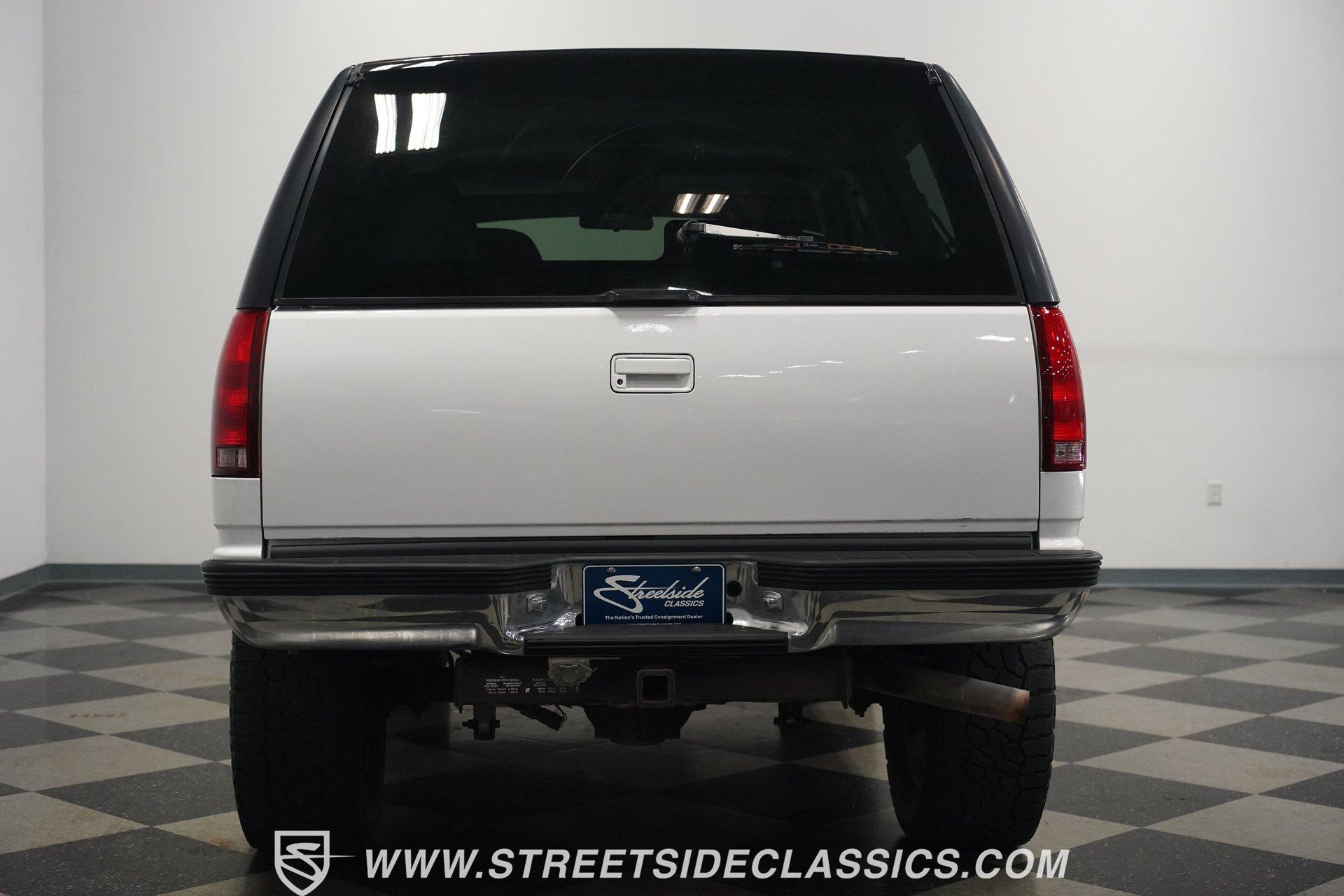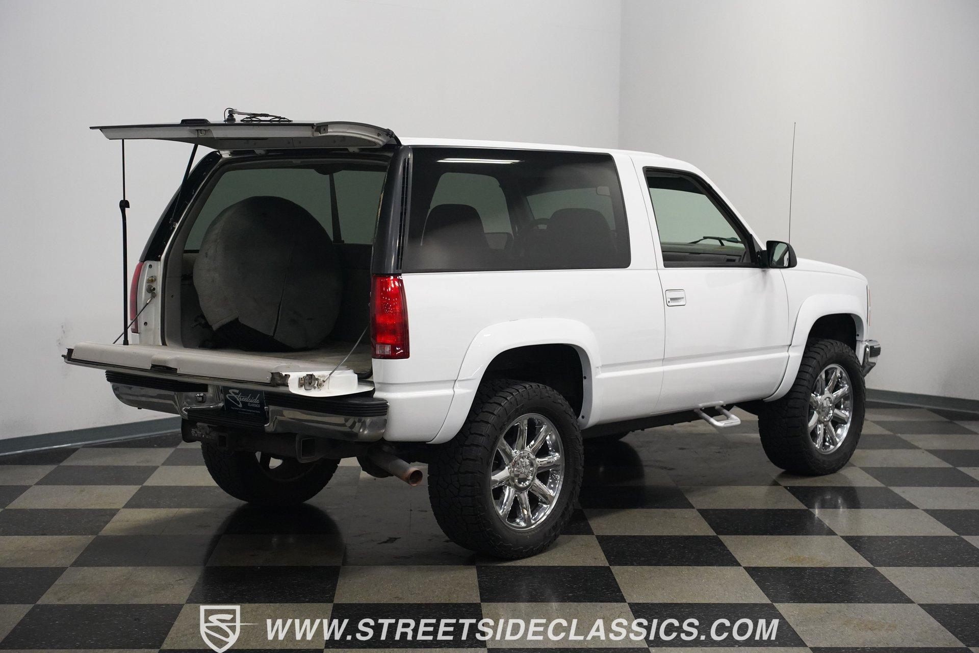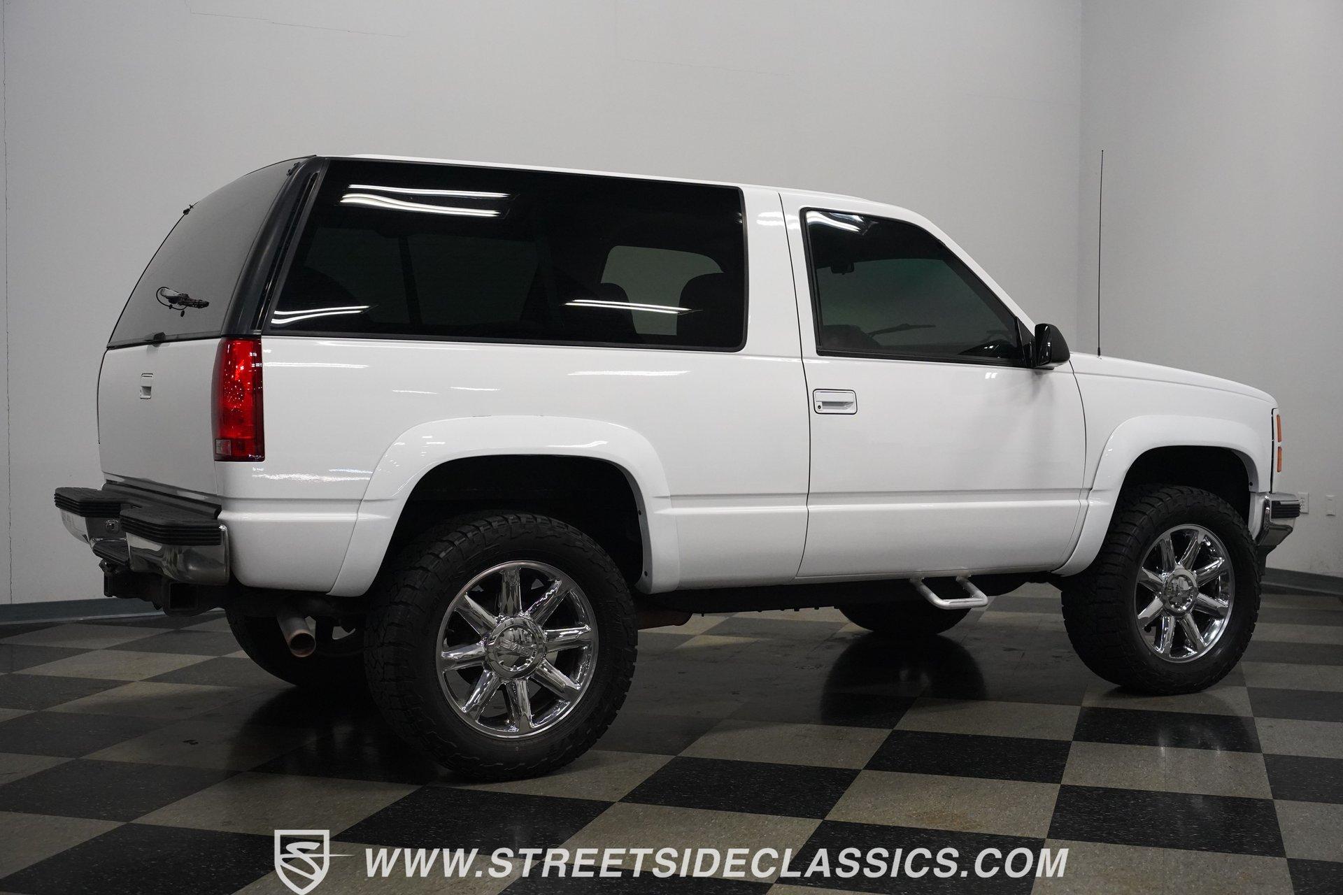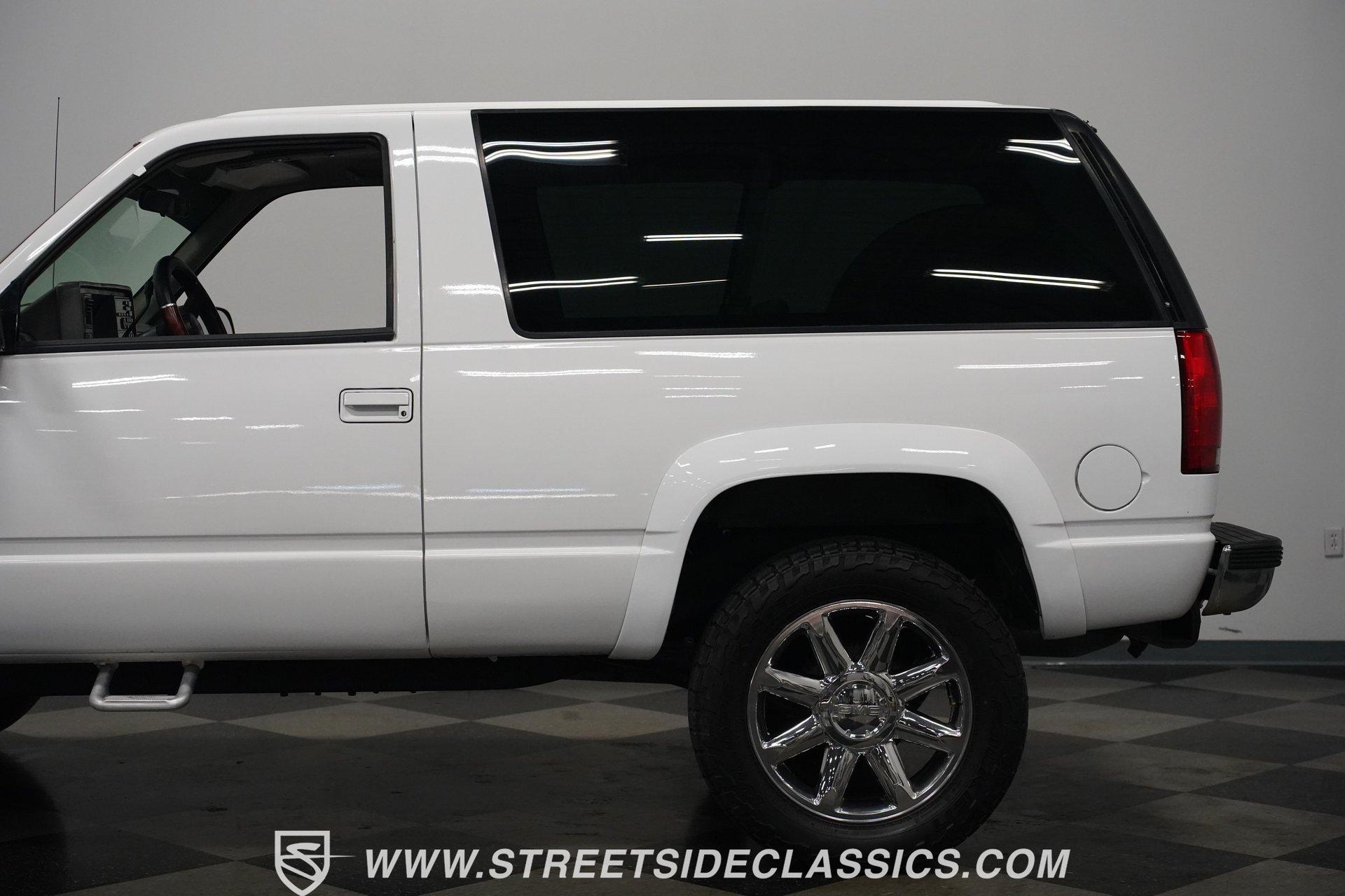 An Olympic White 1994 GMC Yukon 4X4 sits ready for action with its Rough Country lift kit elevating this off-road warrior to new heights. The pristinely applied paint highlights the bold, angular design of this two-door trail blazer, while custom painted headlight bezels and bright new lighting units modernize its front fascia. Gleaming chrome accents on the bumpers and steps create striking contrast against the snow-white exterior, and massive 20" GMC chrome wheels wrapped in aggressive LT305/55R20 tires establish an unmistakable presence. Dark tinted windows complete the look of this backcountry explorer, built for venturing where ordinary vehicles fear to tread. The light gray cloth interior welcomes adventurers with supportive bucket seats designed for comfort during extended expeditions. Time has been kind to the dash and door panels, which remain free of unsightly cracks despite countless outdoor excursions. The upgraded aftermarket sound system provides modern connectivity through AUX, USB, and SD card inputs - perfect for curating the soundtrack to your wilderness journeys. The uncluttered cabin layout features a practical column shifter maintaining classic GMC functionality, while power seats and mirrors allow for quick adjustments when switching drivers mid-adventure. The muscular 5.7 Liter V8 engine pairs flawlessly with a 4L60E 4-speed automatic transmission for conquering diverse terrains. This Yukon's advanced suspension system includes specialized Rough Country shocks working in concert with reinforced upper A-arms to absorb punishment from rugged landscapes. A 3.73 Positraction rear end optimizes traction distribution when traversing challenging surfaces, ensuring all four wheels maintain maximum grip. Power disc brakes provide exceptional control, while the dual exhaust system lets the capable V8 announce its presence with authority during spirited driving sessions. HIGHLIGHTS: 5.7 Liter V8 Engine 4 Speed Automatic Transmission (4L60E) Electronic Fuel Injection 3.73 Positraction Rear End 4X4 Drivetrain Rough Country Lift Kit Upgraded Upper A-Arms Power Disc Brakes Dual Exhaust Olympic White Paint 20" GMC Chrome Wheels in LT305/55R20 Tires Chrome Bumpers and Steps Painted Headlight Bezels Newer Headlights Tinted Windows 2-Door Body Style Light Gray Cloth Interior with Bucket Seats Power Seats Power Mirrors Aftermarket Stereo (AUX, USB, SD Card) Power Steering Column Shifter Owner's Manual Fusing genuine off-road capability with everyday drivability, this 1994 GMC Yukon 4X4 delivers V8 power, exceptional ground clearance, and driver-friendly features in one complete package. From weekend trail adventures to daily commutes, this lifted Yukon stands ready for your next expedition. Call today!