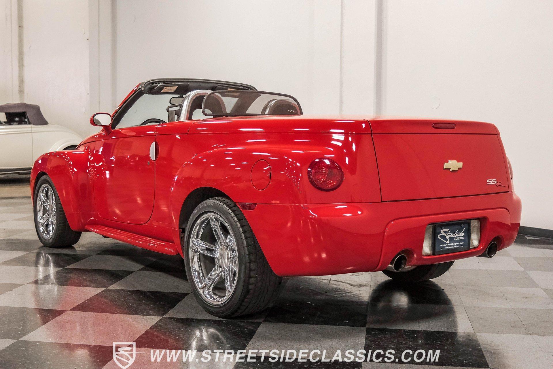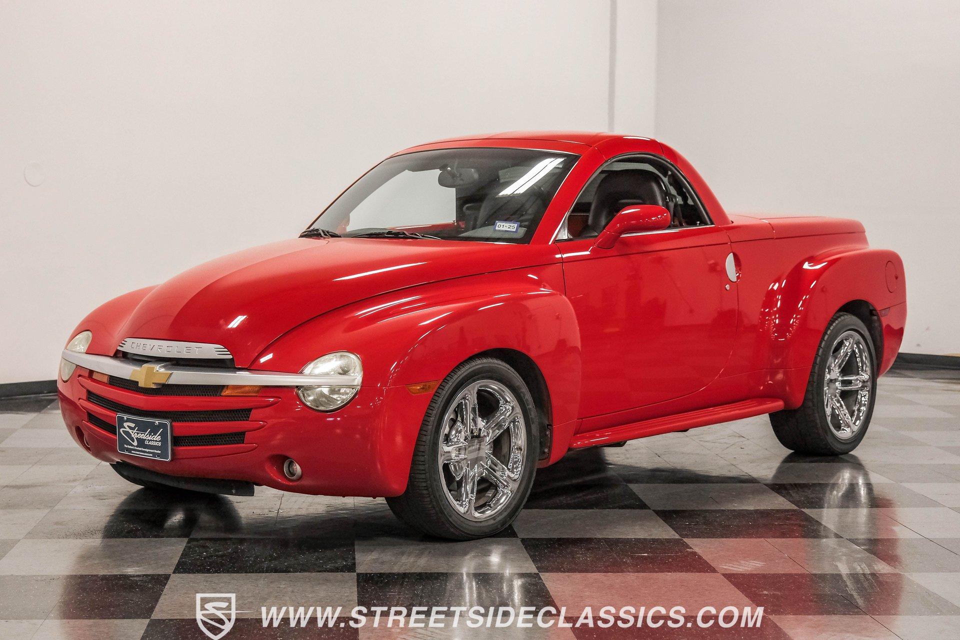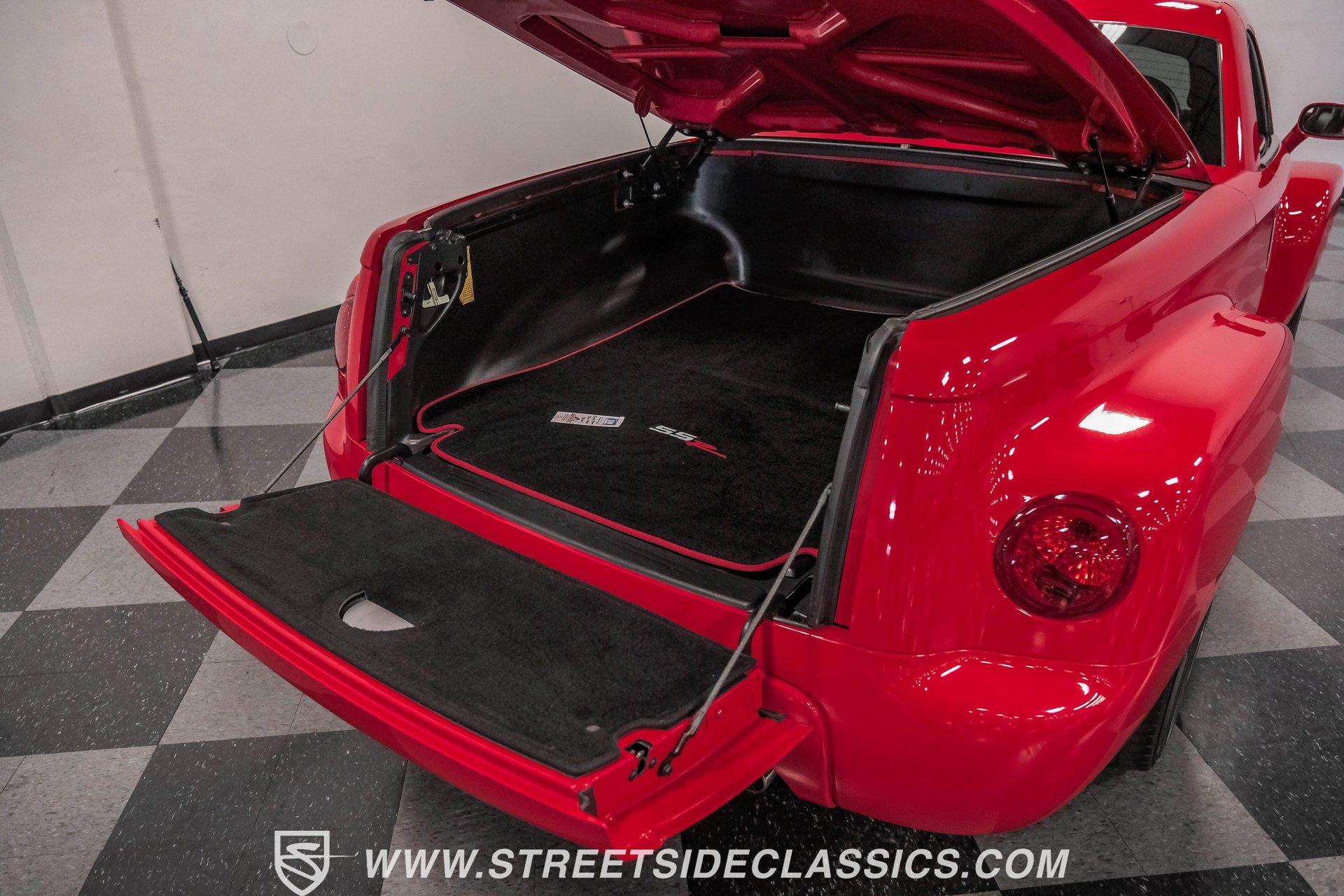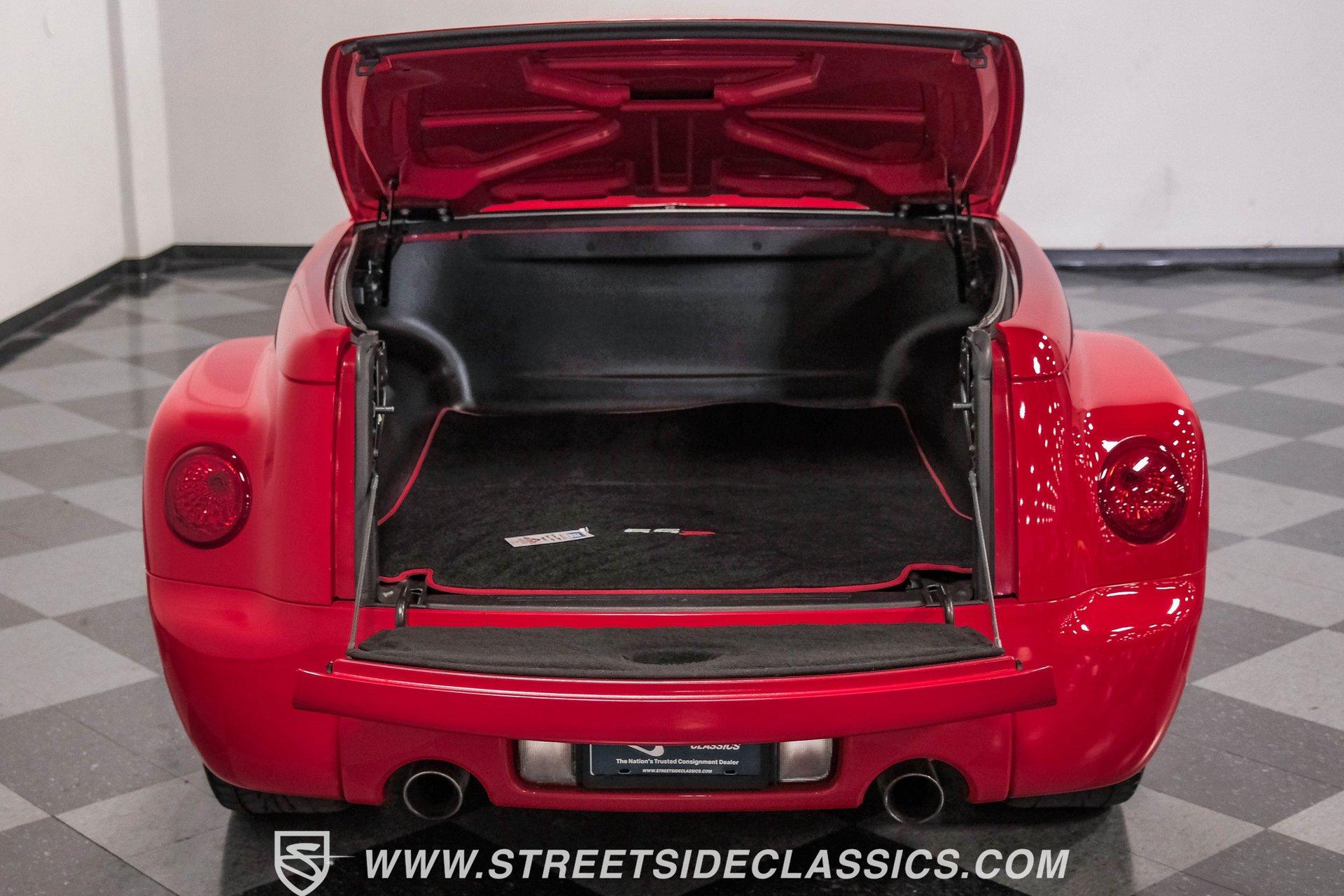 Muscular street machine with convertible tricks, this 2003 Chevrolet SSR Supercharged wears Torch Red paint that amplifies its bold presence. Factory staggered wheel setup features 19-inch chrome wheels up front and 20-inch chrome wheels in the rear for a perfect rake. Power-operated retractable hardtop folds away completely for open-air enjoyment at the push of a button. Clean running boards follow the lines while maintaining access. Dark tinted glass adds mystery as 255/45R19 front and 295/40R20 rear tires complete this truck's aggressive stance. Black leather lines this vehicle's performance-oriented interior, covering the dual power heated bucket seats with memory settings and extending to the door panels. Leather-wrapped steering wheel includes audio controls for the Bose premium sound system with CD changer capabilities. Floor shifter rises from the center console alongside power windows, locks, and heated mirror controls. Air conditioning, cruise control, tilt steering column, and rear window defogger add daily usability to this performance machine while factory gauges monitor all systems. Forced induction comes via a Magnacharger supercharger mounted to this vehicle's 5.3L V8, enhanced by a custom Comp Cams camshaft installed at 65,600 miles. 4L60E 4-speed automatic transmission with stage 2 stall converter delivers power on demand. Kooks long-tube headers connect to a catted Y-pipe and aftermarket dual exhaust for a powerful sound. Four-wheel disc brakes, limited-slip differential with 3.73 gears, and K&N cold air intake system round out this vehicle's $15,000 worth of performance modifications. Traction control keeps everything manageable in varied conditions. HIGHLIGHTS: 5.3L V8 Engine with Magnacharger Supercharger Custom Comp Cams Camshaft 4-Speed Automatic Transmission (4L60E) Stage 2 Stall Converter 3.73 Rear Axle Ratio w/ Limited Slip Power 4-Wheel Disc Brakes Power Steering Aftermarket Dual Exhaust w/ Kooks Long Tube Headers & Catted Y-Pipe K&N Cold Air Intake Torch Red Paint Retractable Hardtop 19" Front, 20" Rear Chrome Wheels 255/45R19 Front, 295/40R20 Rear Tires Black Leather Bucket Seats with Memory Power Heated Seats Air Conditioning Power Windows Power Heated Mirrors Leather-Wrapped Steering Wheel with Audio Controls Cruise Control Tilt Steering Column Bose Premium Sound System with CD Changer Rear Window Defogger Owner's Manuals Over $15,000 in Performance Upgrades Ready to rumble with $15,000 in performance upgrades, this 2003 Chevrolet SSR Supercharged brings muscle car power in a convertible pickup package. The Magnacharger and custom cam give this Torch Red machine serious speed to match its distinctive style. Call today!