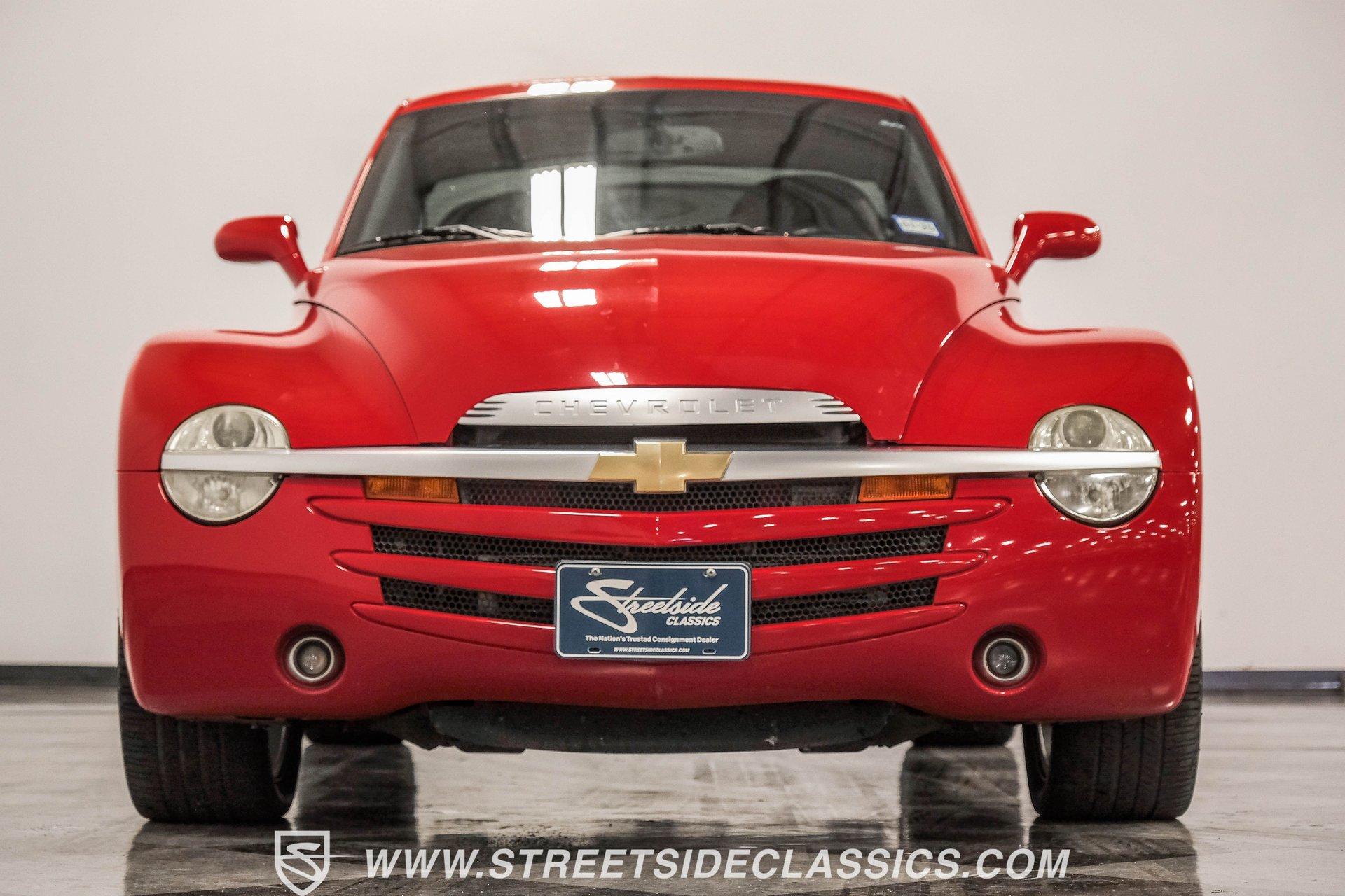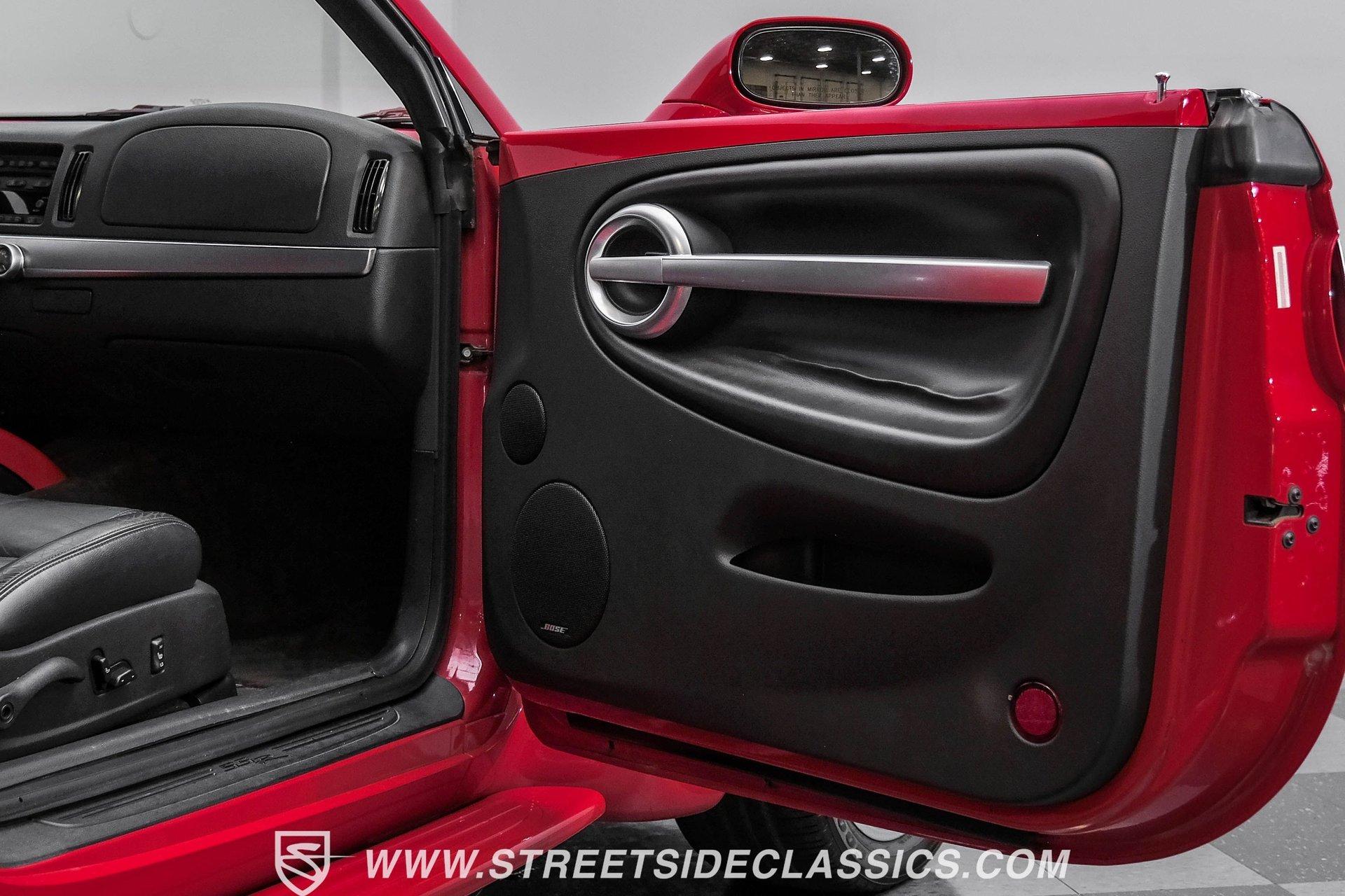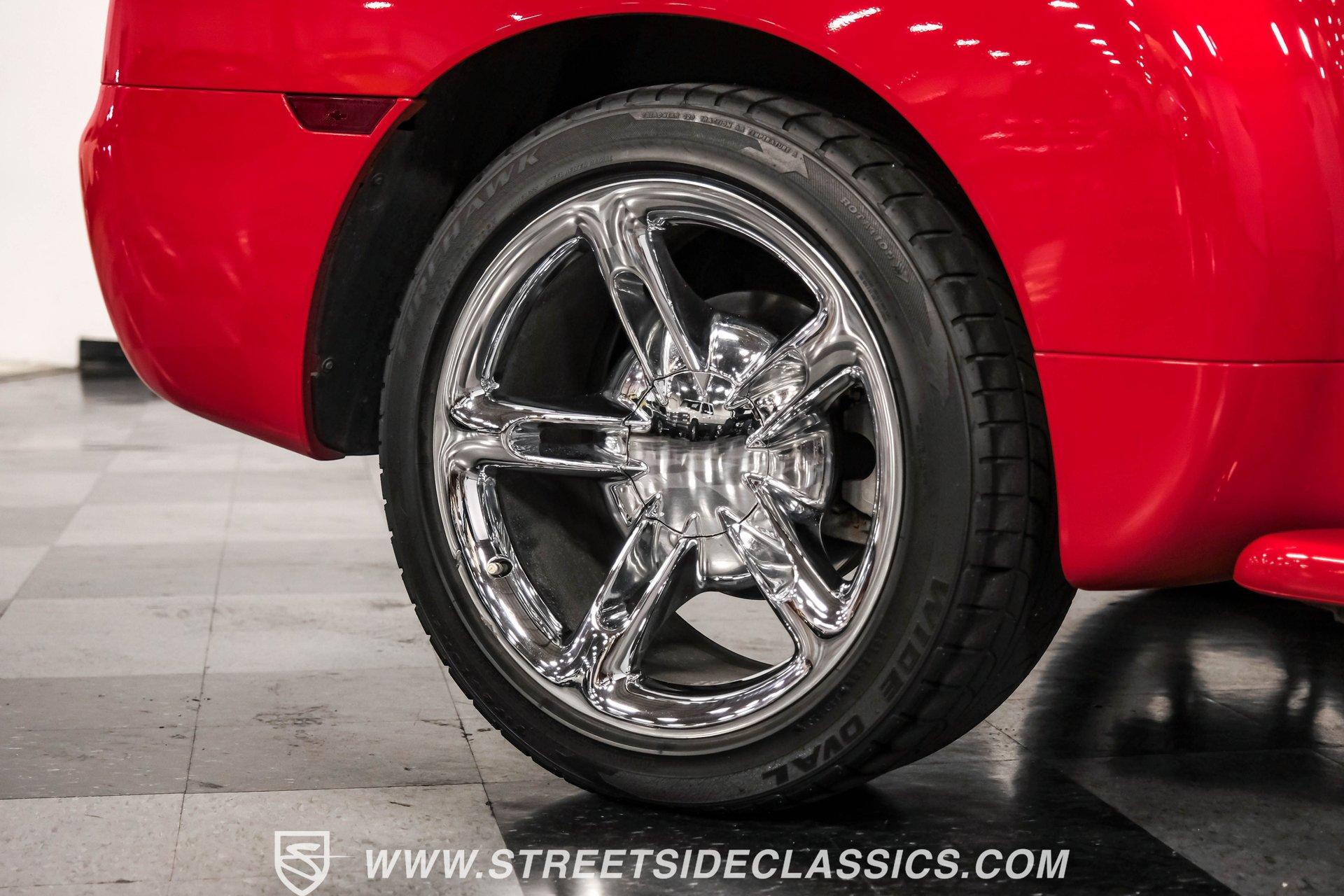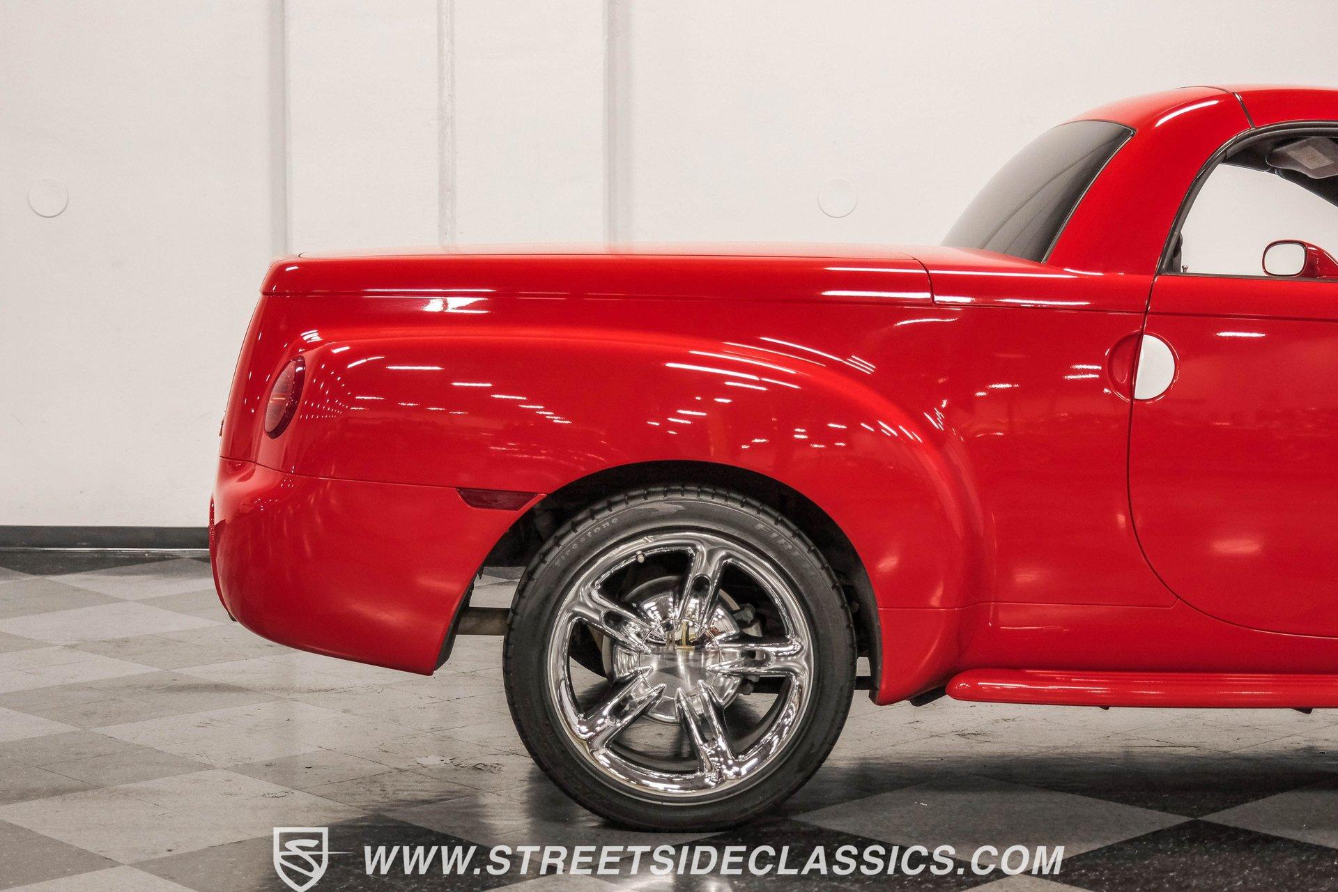 Muscular street machine with convertible tricks, this 2003 Chevrolet SSR Supercharged wears Torch Red paint that amplifies its bold presence. Factory staggered wheel setup features 19-inch chrome wheels up front and 20-inch chrome wheels in the rear for a perfect rake. Power-operated retractable hardtop folds away completely for open-air enjoyment at the push of a button. Clean running boards follow the lines while maintaining access. Dark tinted glass adds mystery as 255/45R19 front and 295/40R20 rear tires complete this truck's aggressive stance. Black leather lines this vehicle's performance-oriented interior, covering the dual power heated bucket seats with memory settings and extending to the door panels. Leather-wrapped steering wheel includes audio controls for the Bose premium sound system with CD changer capabilities. Floor shifter rises from the center console alongside power windows, locks, and heated mirror controls. Air conditioning, cruise control, tilt steering column, and rear window defogger add daily usability to this performance machine while factory gauges monitor all systems. Forced induction comes via a Magnacharger supercharger mounted to this vehicle's 5.3L V8, enhanced by a custom Comp Cams camshaft installed at 65,600 miles. 4L60E 4-speed automatic transmission with stage 2 stall converter delivers power on demand. Kooks long-tube headers connect to a catted Y-pipe and aftermarket dual exhaust for a powerful sound. Four-wheel disc brakes, limited-slip differential with 3.73 gears, and K&N cold air intake system round out this vehicle's $15,000 worth of performance modifications. Traction control keeps everything manageable in varied conditions. HIGHLIGHTS: 5.3L V8 Engine with Magnacharger Supercharger Custom Comp Cams Camshaft 4-Speed Automatic Transmission (4L60E) Stage 2 Stall Converter 3.73 Rear Axle Ratio w/ Limited Slip Power 4-Wheel Disc Brakes Power Steering Aftermarket Dual Exhaust w/ Kooks Long Tube Headers & Catted Y-Pipe K&N Cold Air Intake Torch Red Paint Retractable Hardtop 19" Front, 20" Rear Chrome Wheels 255/45R19 Front, 295/40R20 Rear Tires Black Leather Bucket Seats with Memory Power Heated Seats Air Conditioning Power Windows Power Heated Mirrors Leather-Wrapped Steering Wheel with Audio Controls Cruise Control Tilt Steering Column Bose Premium Sound System with CD Changer Rear Window Defogger Owner's Manuals Over $15,000 in Performance Upgrades Ready to rumble with $15,000 in performance upgrades, this 2003 Chevrolet SSR Supercharged brings muscle car power in a convertible pickup package. The Magnacharger and custom cam give this Torch Red machine serious speed to match its distinctive style. Call today!
