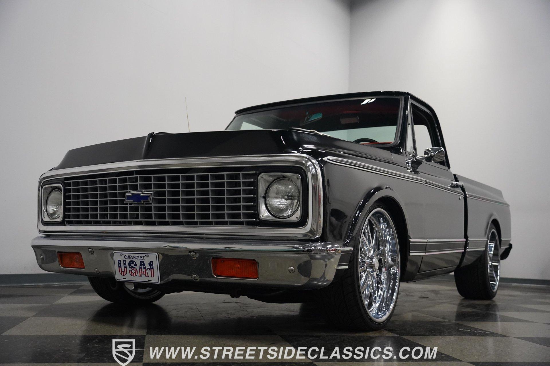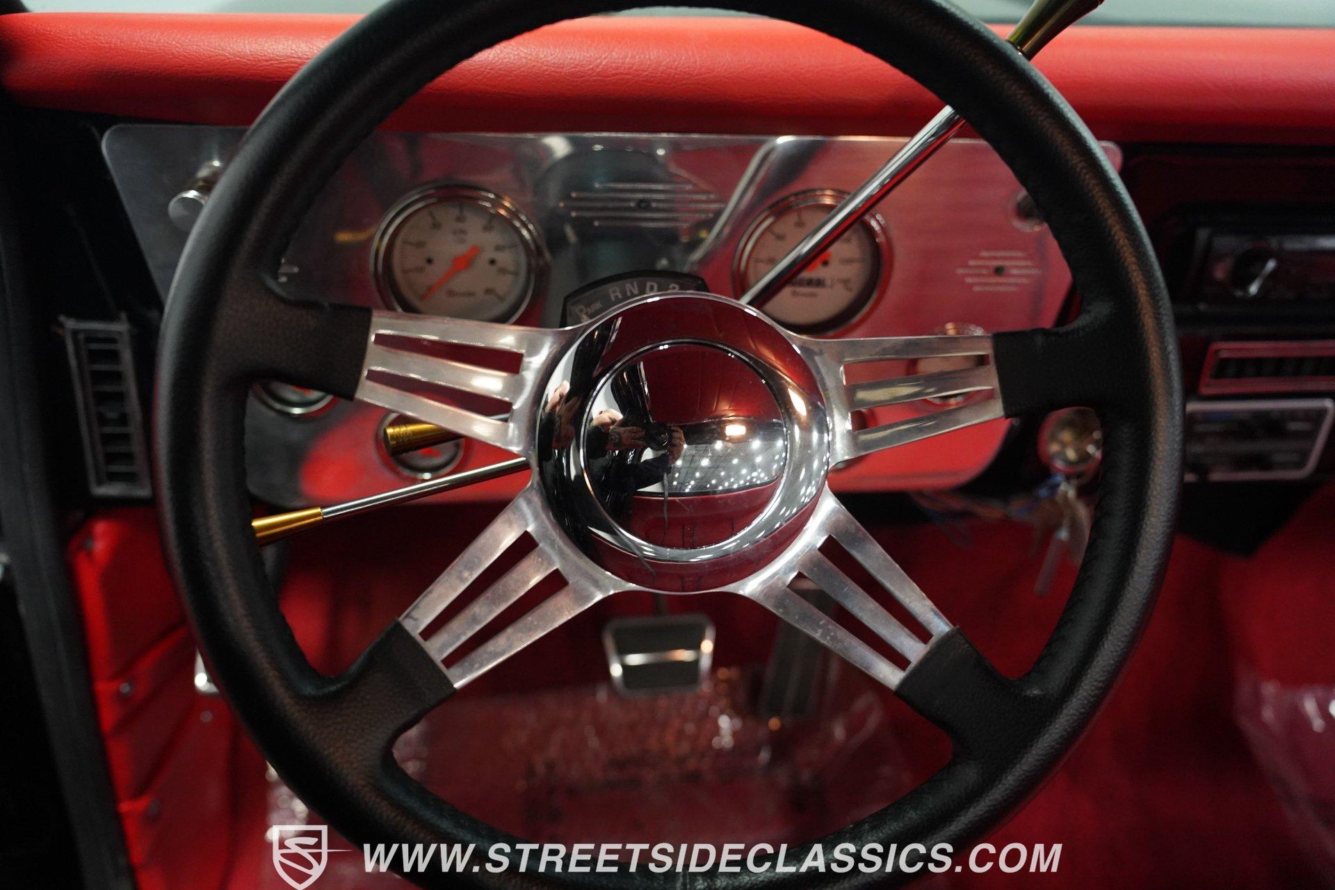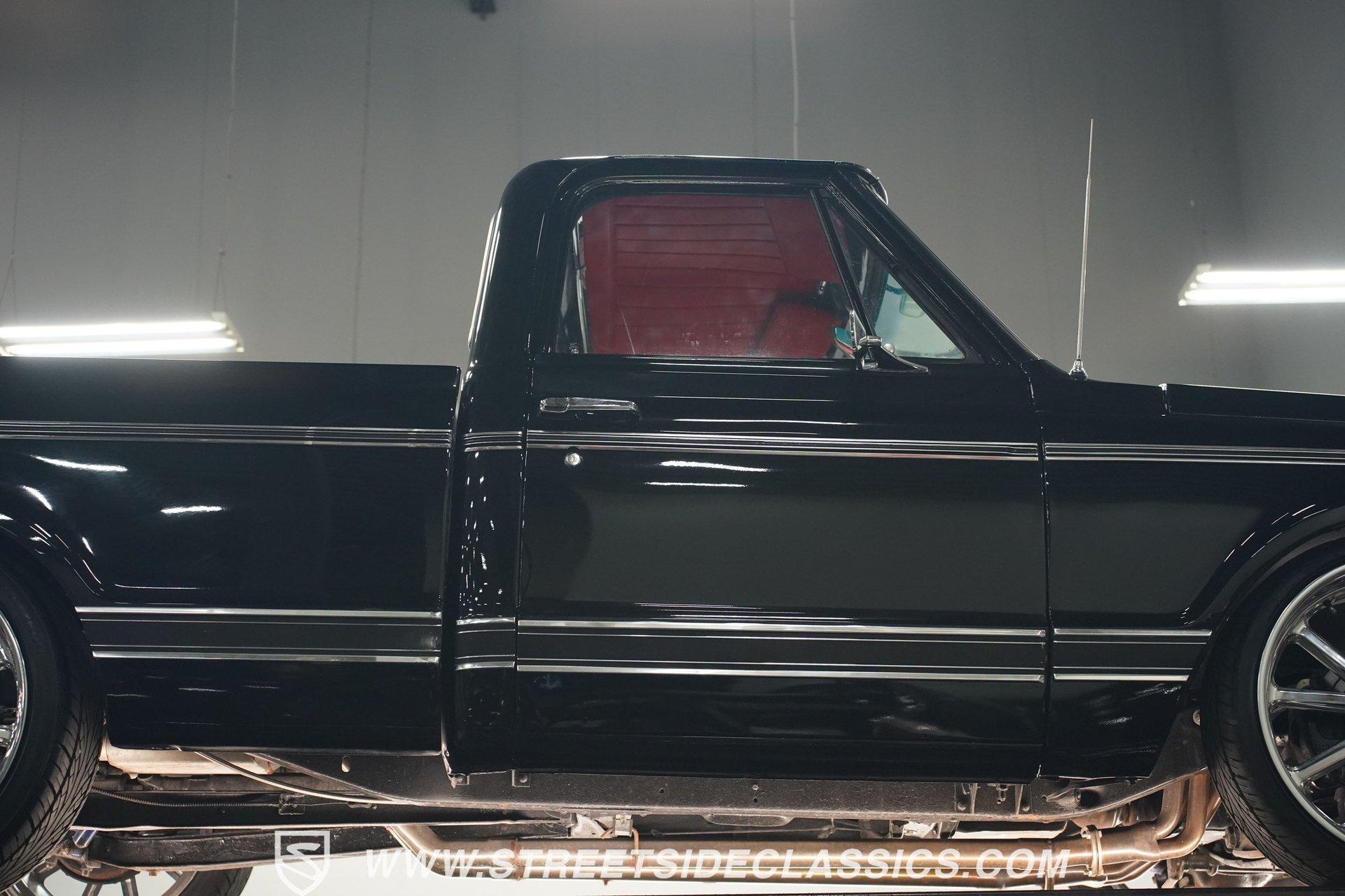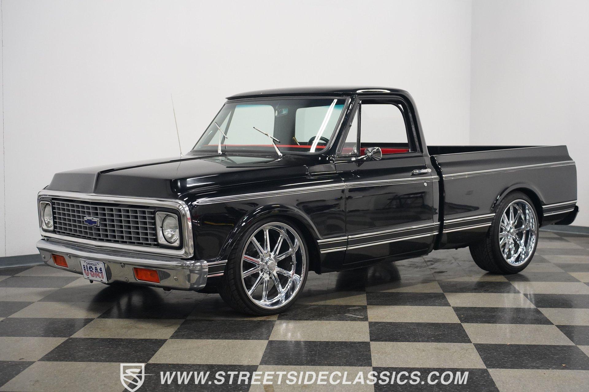 Murdered-out and ready to rumble, this 1972 Chevrolet C10 wears its black paint job like a boxer wears his gloves - with purpose and attitude. Freshly resprayed for maximum impact, the sleek bodywork features a custom-smoothed tailgate and strategically relocated fuel tank underneath the bed for cleaner lines. Chrome bumpers and crisp belt line trim cut through the darkness, providing perfect visual counterpoints against the midnight canvas. Slammed to the pavement through custom suspension work, this muscle truck hunkers down over massive 22" US Mag wheels, with 255/30ZR22 front and 285/35R22 rear rubber that plant it firmly on the street with undeniable presence. Red-hot and ready for action, the cabin of this C10 grabs your attention with vibrant red vinyl bench seating that pops against the exterior's dark demeanor. Custom door panels match the seating surfaces for a cohesive, deliberate design statement. The dashboard houses clear aftermarket gauges in a purpose-built binnacle, giving you instant access to vital engine information. Entertainment comes courtesy of a Pioneer AM/FM/AUX stereo that provides the soundtrack for your cruising adventures. A sporty aftermarket steering wheel feels solid in your hands, with the column shifter positioned perfectly for quick gear selection when it's time to move. Muscle comes standard with the 305 V8 (5.0L) powerplant that gives this truck its bark and bite, mated to a bulletproof TH350 three-speed automatic transmission. Fuel flows through a Holly-style Brawler 4-barrel carburetor, optimized for street performance and throttle response. The engine bay shines with its chrome dress-up kit, making this truck as impressive with the hood up as down. Long tube headers feed into a rumbling dual exhaust system that announces your arrival with authority. Power steering and power disc brakes make this beast easy to handle despite its aggressive stance, while the custom-lowered suspension with drop spindles puts it right in the weeds where a street truck belongs. HIGHLIGHTS: 305 V8 (5.0L) Engine TH350 3-Speed Automatic Transmission Holly-style Brawler 4-Barrel Carburetor Long Tube Headers Dual Exhaust System Power Disc Brakes Lowered Suspension with Drop Spindles Chrome Engine Dress-up Kit Black Paint Smoothed Tailgate Relocated Fuel Tank (Under Bed) Chrome Bumpers Belt Line Trim 22" US Mag Wheels 255/30ZR22 Front, 285/35R22 Rear Tires Red Interior with Bench Seat Custom Door Panels Aftermarket Gauges and Binnacle Pioneer AM/FM/AUX Stereo Aftermarket Steering Wheel Column Shifter Power Steering Clean Carpet Blacked-out, lowered, and loaded with attitude, this 1972 Chevrolet C10 delivers everything a street truck enthusiast could want - killer stance, powerful V8, custom touches inside and out, and undeniable street presence that makes an impression without saying a word. Call today!