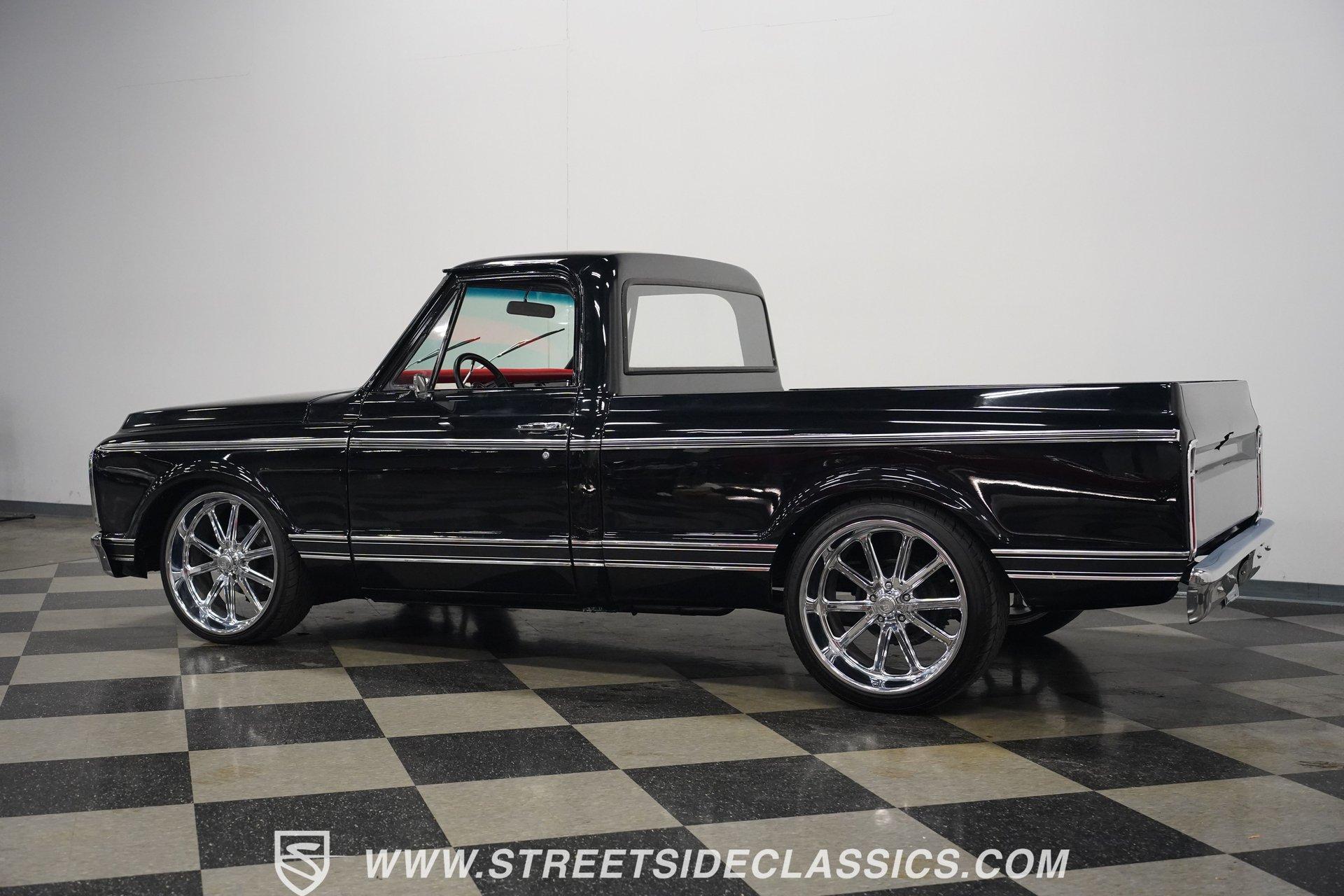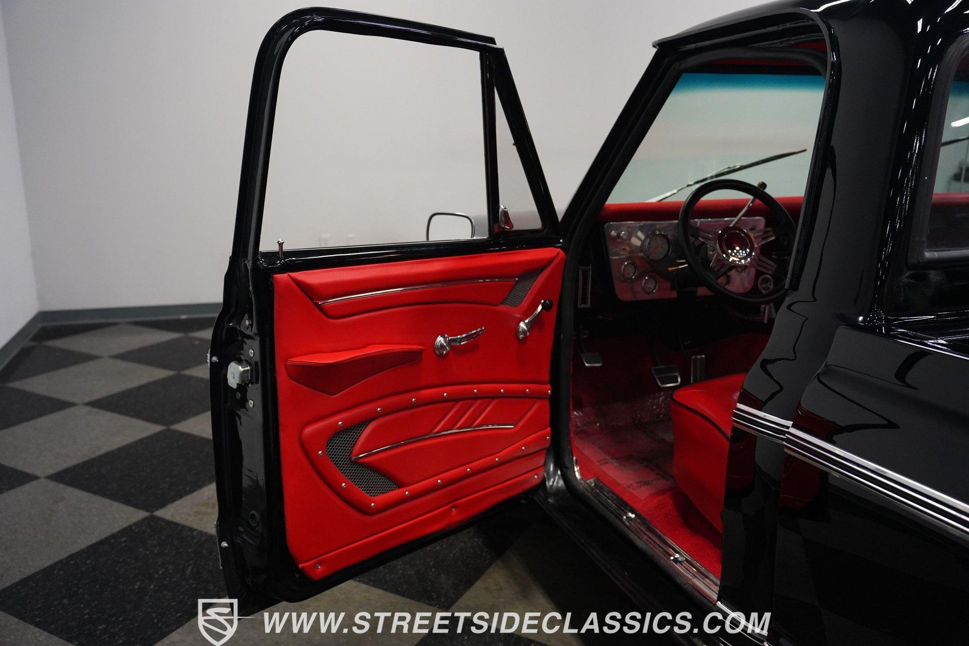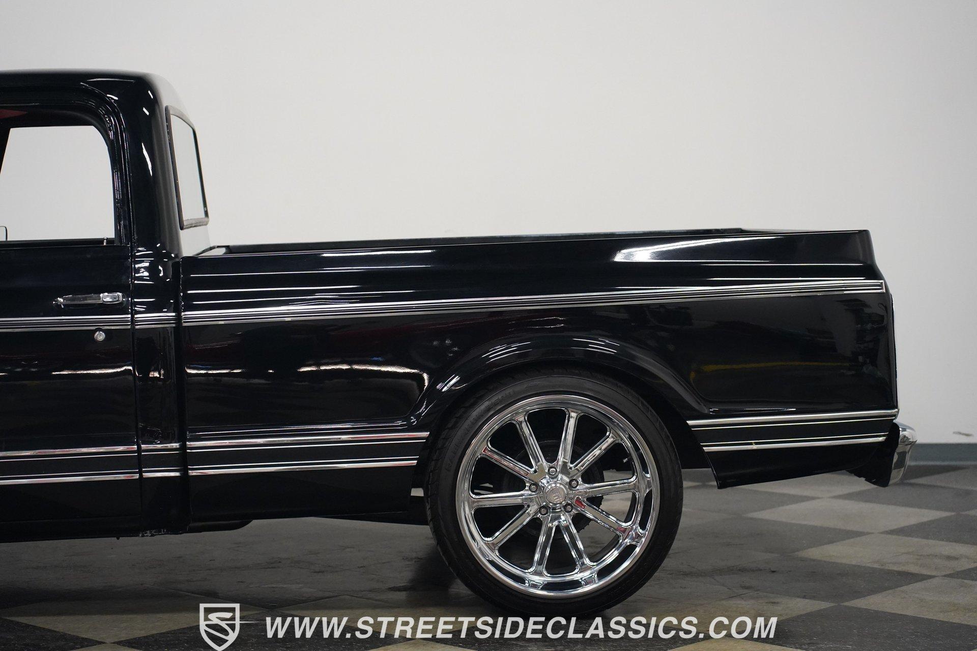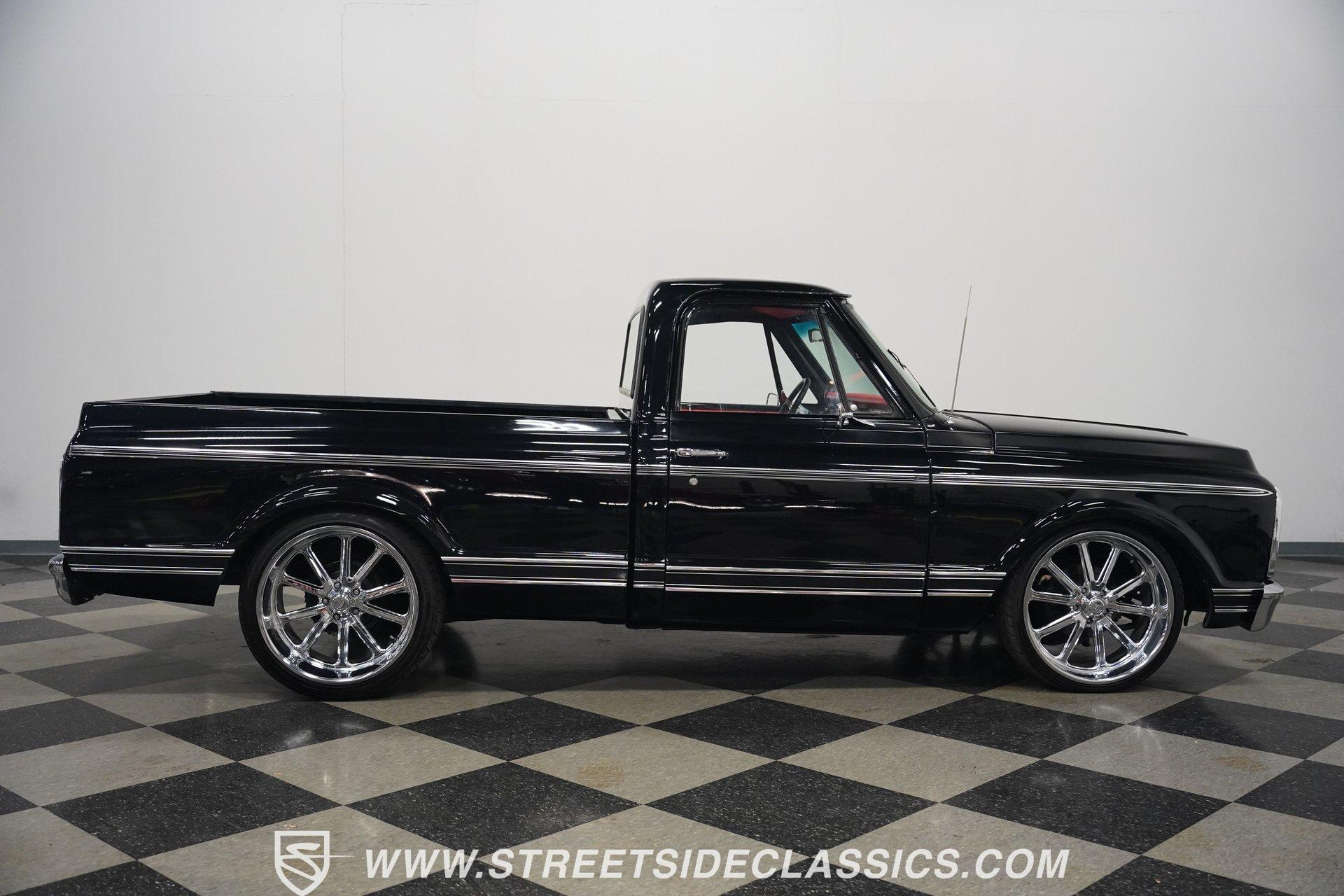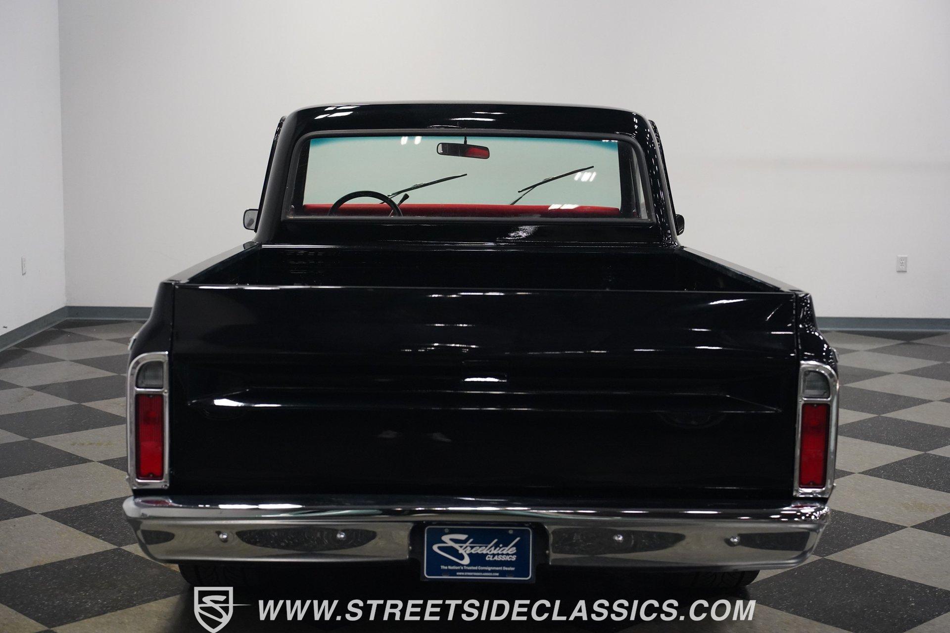 Murdered-out and ready to rumble, this 1972 Chevrolet C10 wears its black paint job like a boxer wears his gloves - with purpose and attitude. Freshly resprayed for maximum impact, the sleek bodywork features a custom-smoothed tailgate and strategically relocated fuel tank underneath the bed for cleaner lines. Chrome bumpers and crisp belt line trim cut through the darkness, providing perfect visual counterpoints against the midnight canvas. Slammed to the pavement through custom suspension work, this muscle truck hunkers down over massive 22" US Mag wheels, with 255/30ZR22 front and 285/35R22 rear rubber that plant it firmly on the street with undeniable presence. Red-hot and ready for action, the cabin of this C10 grabs your attention with vibrant red vinyl bench seating that pops against the exterior's dark demeanor. Custom door panels match the seating surfaces for a cohesive, deliberate design statement. The dashboard houses clear aftermarket gauges in a purpose-built binnacle, giving you instant access to vital engine information. Entertainment comes courtesy of a Pioneer AM/FM/AUX stereo that provides the soundtrack for your cruising adventures. A sporty aftermarket steering wheel feels solid in your hands, with the column shifter positioned perfectly for quick gear selection when it's time to move. Muscle comes standard with the 305 V8 (5.0L) powerplant that gives this truck its bark and bite, mated to a bulletproof TH350 three-speed automatic transmission. Fuel flows through a Holly-style Brawler 4-barrel carburetor, optimized for street performance and throttle response. The engine bay shines with its chrome dress-up kit, making this truck as impressive with the hood up as down. Long tube headers feed into a rumbling dual exhaust system that announces your arrival with authority. Power steering and power disc brakes make this beast easy to handle despite its aggressive stance, while the custom-lowered suspension with drop spindles puts it right in the weeds where a street truck belongs. HIGHLIGHTS: 305 V8 (5.0L) Engine TH350 3-Speed Automatic Transmission Holly-style Brawler 4-Barrel Carburetor Long Tube Headers Dual Exhaust System Power Disc Brakes Lowered Suspension with Drop Spindles Chrome Engine Dress-up Kit Black Paint Smoothed Tailgate Relocated Fuel Tank (Under Bed) Chrome Bumpers Belt Line Trim 22" US Mag Wheels 255/30ZR22 Front, 285/35R22 Rear Tires Red Interior with Bench Seat Custom Door Panels Aftermarket Gauges and Binnacle Pioneer AM/FM/AUX Stereo Aftermarket Steering Wheel Column Shifter Power Steering Clean Carpet Blacked-out, lowered, and loaded with attitude, this 1972 Chevrolet C10 delivers everything a street truck enthusiast could want - killer stance, powerful V8, custom touches inside and out, and undeniable street presence that makes an impression without saying a word. Call today!