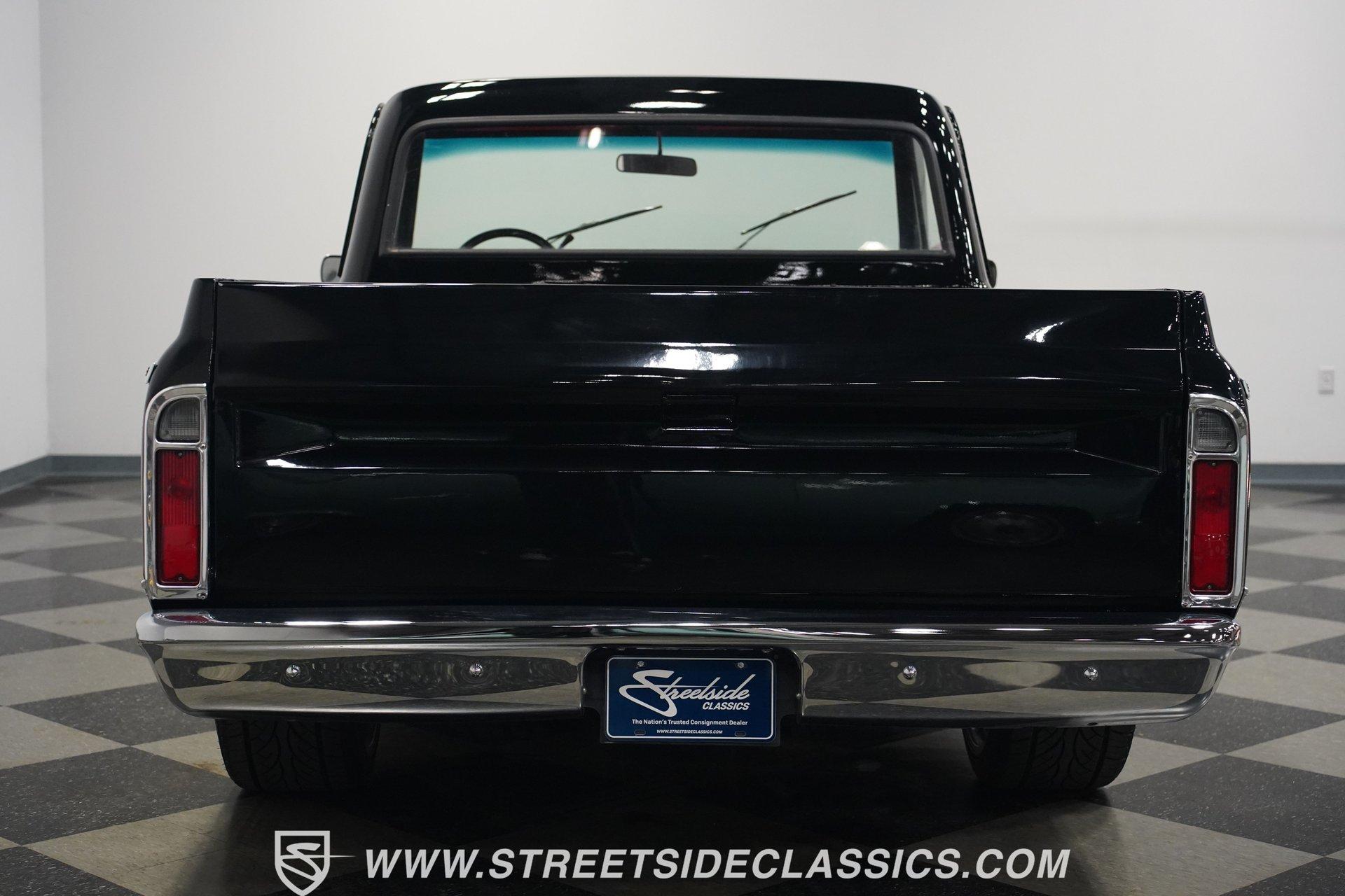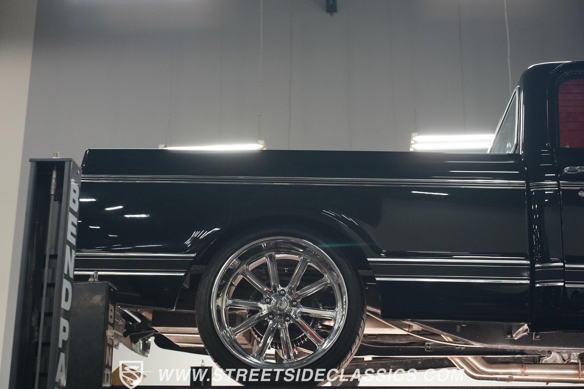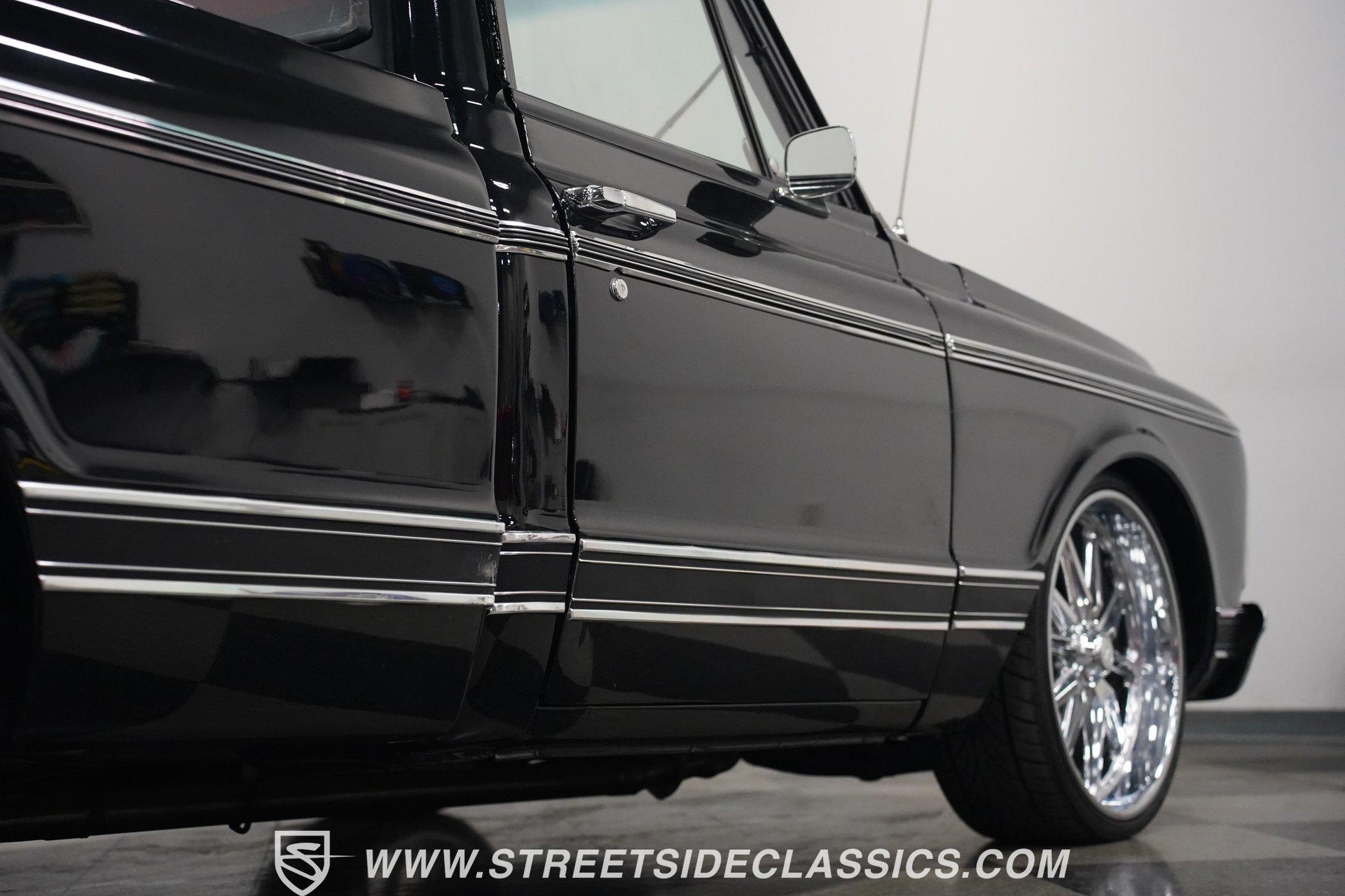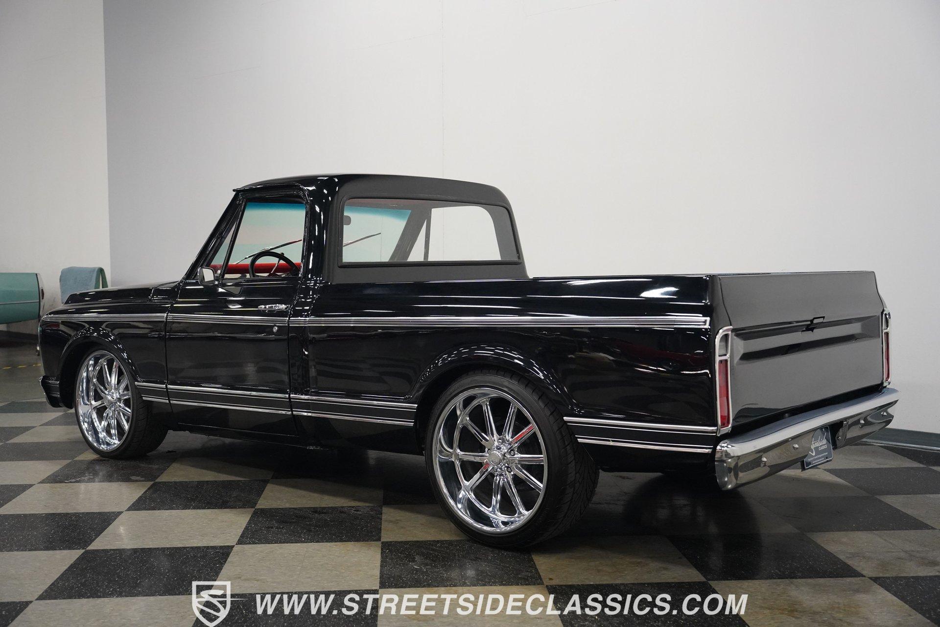 Murdered-out and ready to rumble, this 1972 Chevrolet C10 wears its black paint job like a boxer wears his gloves - with purpose and attitude. Freshly resprayed for maximum impact, the sleek bodywork features a custom-smoothed tailgate and strategically relocated fuel tank underneath the bed for cleaner lines. Chrome bumpers and crisp belt line trim cut through the darkness, providing perfect visual counterpoints against the midnight canvas. Slammed to the pavement through custom suspension work, this muscle truck hunkers down over massive 22" US Mag wheels, with 255/30ZR22 front and 285/35R22 rear rubber that plant it firmly on the street with undeniable presence. Red-hot and ready for action, the cabin of this C10 grabs your attention with vibrant red vinyl bench seating that pops against the exterior's dark demeanor. Custom door panels match the seating surfaces for a cohesive, deliberate design statement. The dashboard houses clear aftermarket gauges in a purpose-built binnacle, giving you instant access to vital engine information. Entertainment comes courtesy of a Pioneer AM/FM/AUX stereo that provides the soundtrack for your cruising adventures. A sporty aftermarket steering wheel feels solid in your hands, with the column shifter positioned perfectly for quick gear selection when it's time to move. Muscle comes standard with the 305 V8 (5.0L) powerplant that gives this truck its bark and bite, mated to a bulletproof TH350 three-speed automatic transmission. Fuel flows through a Holly-style Brawler 4-barrel carburetor, optimized for street performance and throttle response. The engine bay shines with its chrome dress-up kit, making this truck as impressive with the hood up as down. Long tube headers feed into a rumbling dual exhaust system that announces your arrival with authority. Power steering and power disc brakes make this beast easy to handle despite its aggressive stance, while the custom-lowered suspension with drop spindles puts it right in the weeds where a street truck belongs. HIGHLIGHTS: 305 V8 (5.0L) Engine TH350 3-Speed Automatic Transmission Holly-style Brawler 4-Barrel Carburetor Long Tube Headers Dual Exhaust System Power Disc Brakes Lowered Suspension with Drop Spindles Chrome Engine Dress-up Kit Black Paint Smoothed Tailgate Relocated Fuel Tank (Under Bed) Chrome Bumpers Belt Line Trim 22" US Mag Wheels 255/30ZR22 Front, 285/35R22 Rear Tires Red Interior with Bench Seat Custom Door Panels Aftermarket Gauges and Binnacle Pioneer AM/FM/AUX Stereo Aftermarket Steering Wheel Column Shifter Power Steering Clean Carpet Blacked-out, lowered, and loaded with attitude, this 1972 Chevrolet C10 delivers everything a street truck enthusiast could want - killer stance, powerful V8, custom touches inside and out, and undeniable street presence that makes an impression without saying a word. Call today!