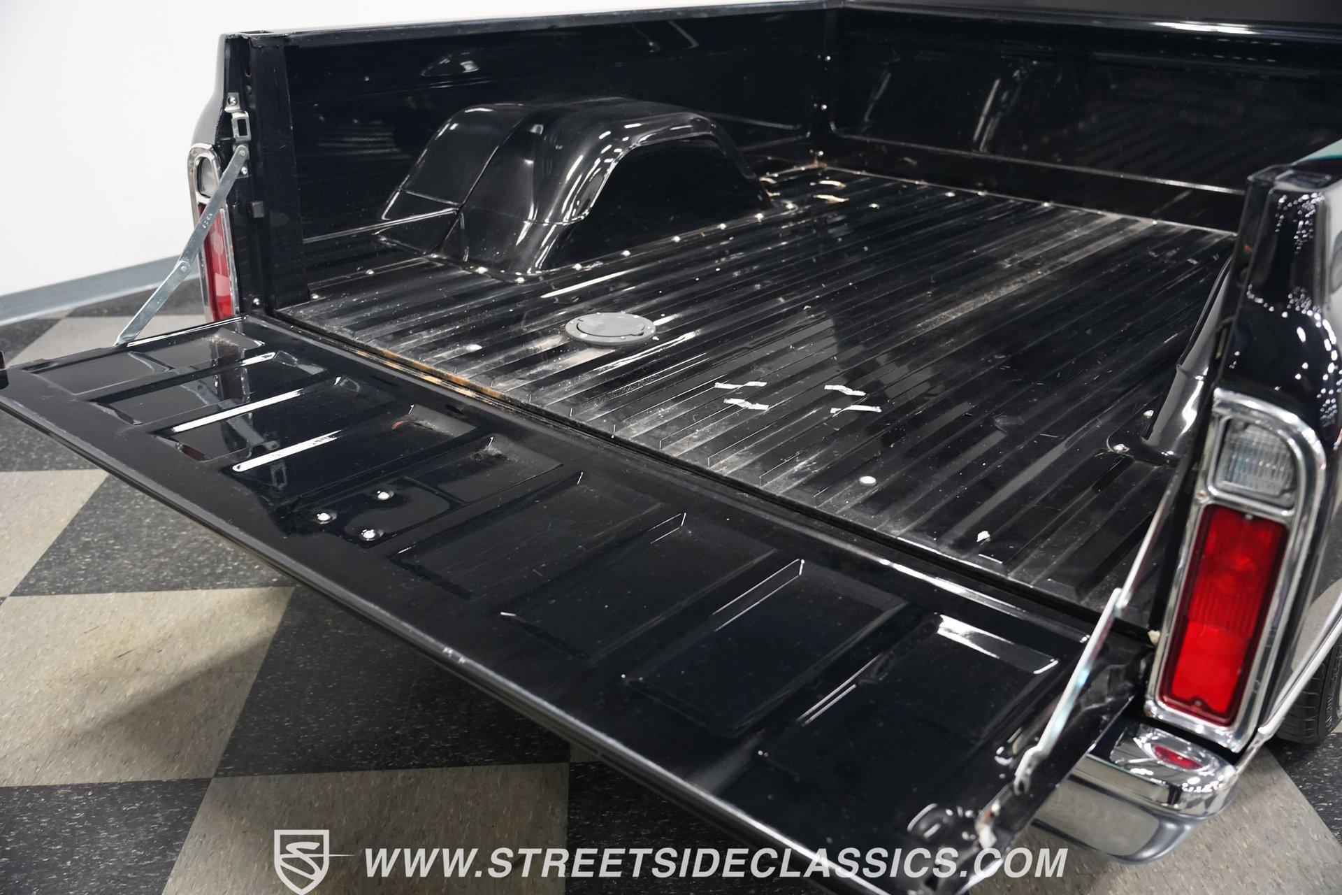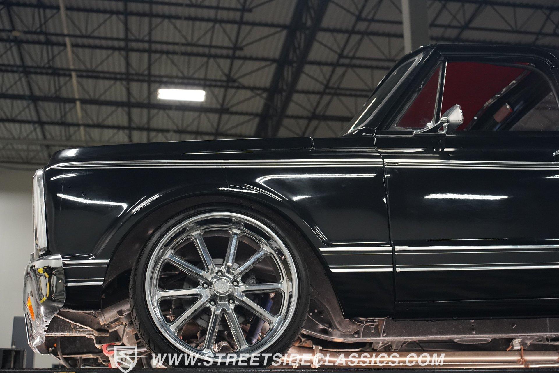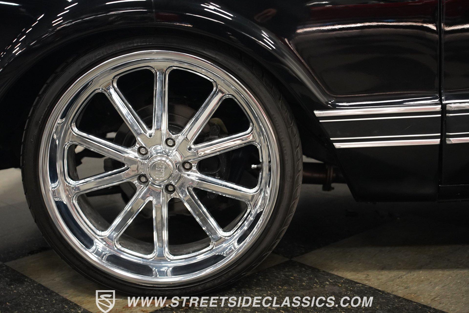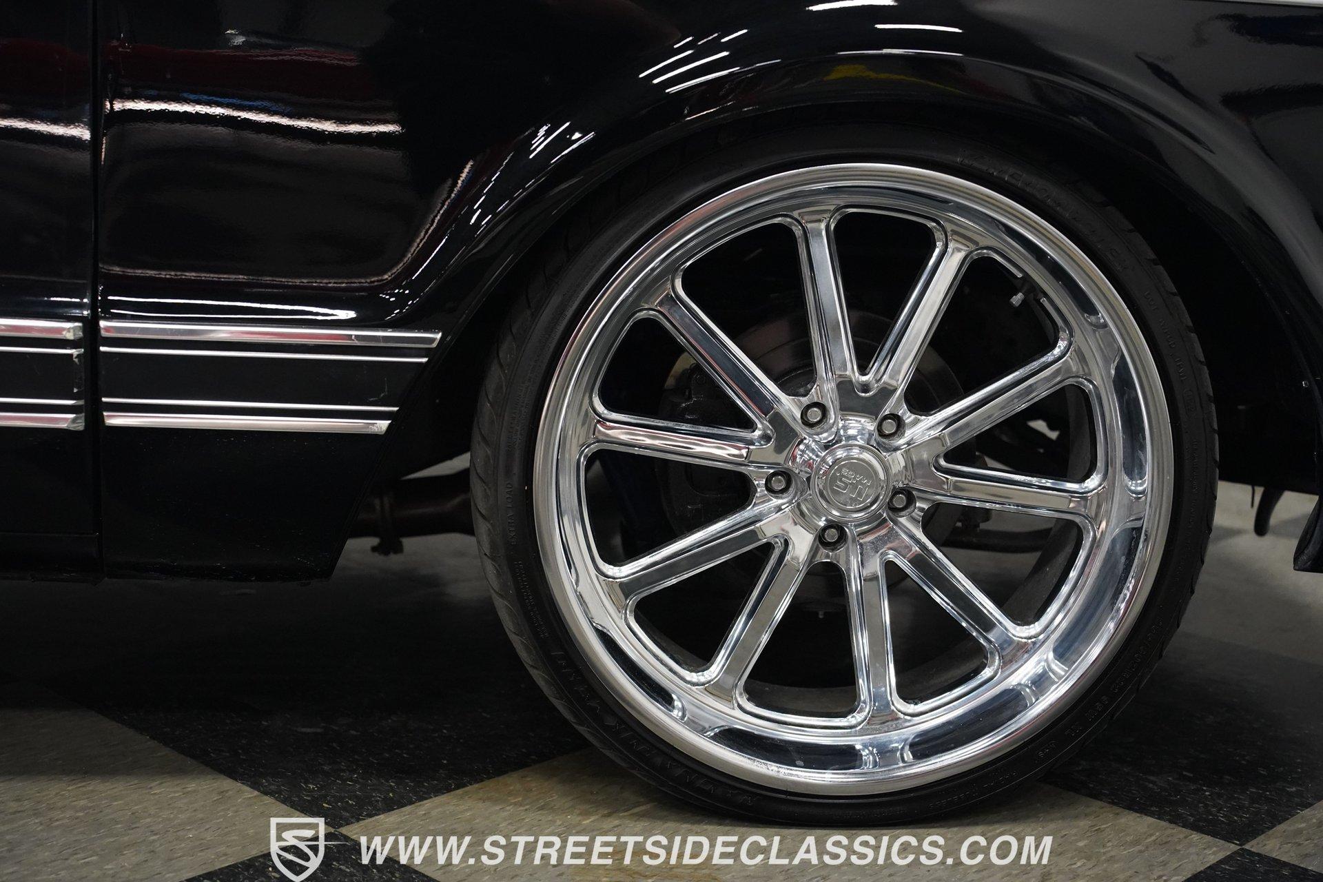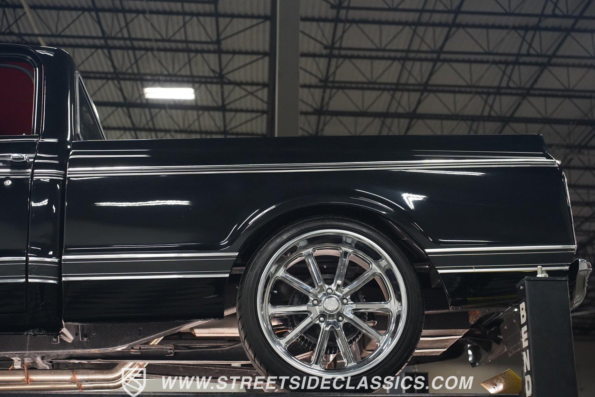 Murdered-out and ready to rumble, this 1972 Chevrolet C10 wears its black paint job like a boxer wears his gloves - with purpose and attitude. Freshly resprayed for maximum impact, the sleek bodywork features a custom-smoothed tailgate and strategically relocated fuel tank underneath the bed for cleaner lines. Chrome bumpers and crisp belt line trim cut through the darkness, providing perfect visual counterpoints against the midnight canvas. Slammed to the pavement through custom suspension work, this muscle truck hunkers down over massive 22" US Mag wheels, with 255/30ZR22 front and 285/35R22 rear rubber that plant it firmly on the street with undeniable presence. Red-hot and ready for action, the cabin of this C10 grabs your attention with vibrant red vinyl bench seating that pops against the exterior's dark demeanor. Custom door panels match the seating surfaces for a cohesive, deliberate design statement. The dashboard houses clear aftermarket gauges in a purpose-built binnacle, giving you instant access to vital engine information. Entertainment comes courtesy of a Pioneer AM/FM/AUX stereo that provides the soundtrack for your cruising adventures. A sporty aftermarket steering wheel feels solid in your hands, with the column shifter positioned perfectly for quick gear selection when it's time to move. Muscle comes standard with the 305 V8 (5.0L) powerplant that gives this truck its bark and bite, mated to a bulletproof TH350 three-speed automatic transmission. Fuel flows through a Holly-style Brawler 4-barrel carburetor, optimized for street performance and throttle response. The engine bay shines with its chrome dress-up kit, making this truck as impressive with the hood up as down. Long tube headers feed into a rumbling dual exhaust system that announces your arrival with authority. Power steering and power disc brakes make this beast easy to handle despite its aggressive stance, while the custom-lowered suspension with drop spindles puts it right in the weeds where a street truck belongs. HIGHLIGHTS: 305 V8 (5.0L) Engine TH350 3-Speed Automatic Transmission Holly-style Brawler 4-Barrel Carburetor Long Tube Headers Dual Exhaust System Power Disc Brakes Lowered Suspension with Drop Spindles Chrome Engine Dress-up Kit Black Paint Smoothed Tailgate Relocated Fuel Tank (Under Bed) Chrome Bumpers Belt Line Trim 22" US Mag Wheels 255/30ZR22 Front, 285/35R22 Rear Tires Red Interior with Bench Seat Custom Door Panels Aftermarket Gauges and Binnacle Pioneer AM/FM/AUX Stereo Aftermarket Steering Wheel Column Shifter Power Steering Clean Carpet Blacked-out, lowered, and loaded with attitude, this 1972 Chevrolet C10 delivers everything a street truck enthusiast could want - killer stance, powerful V8, custom touches inside and out, and undeniable street presence that makes an impression without saying a word. Call today!