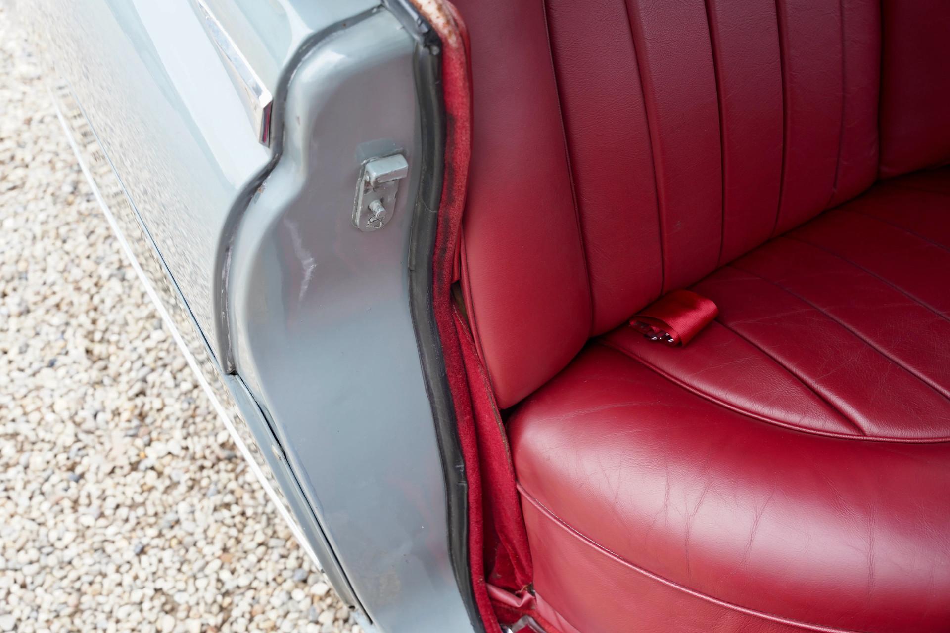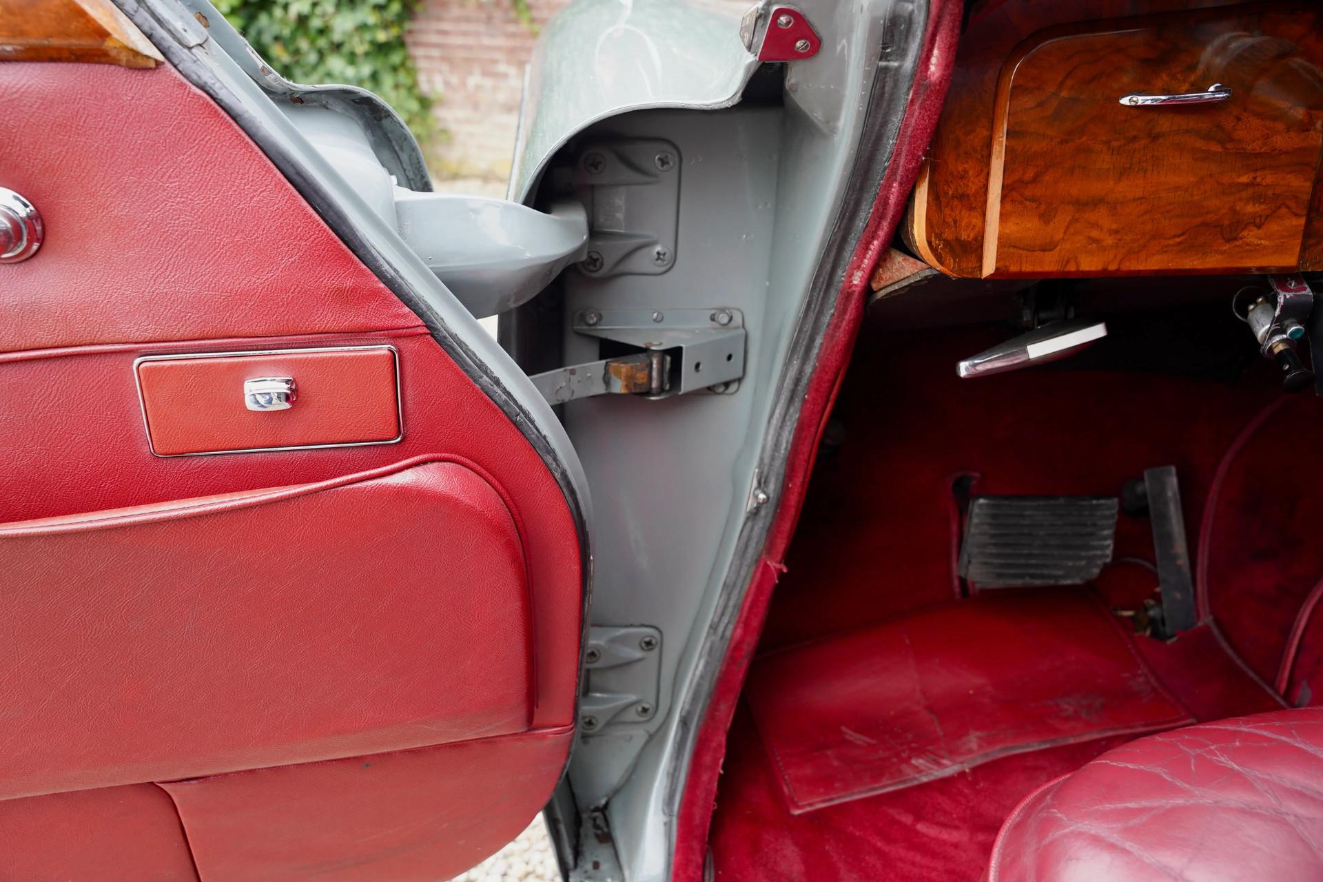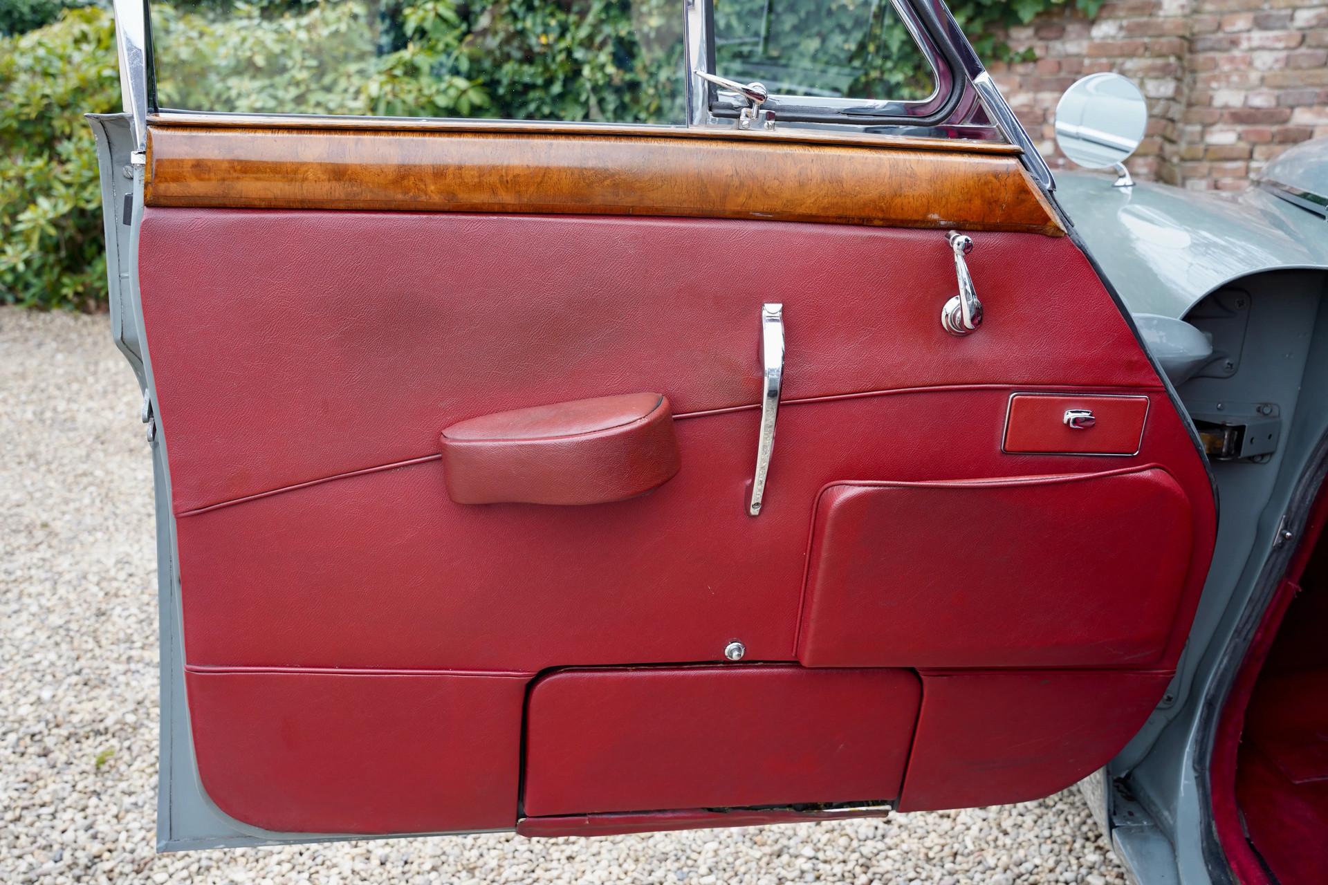 This particular MK IX is finished in Cornish Grey, a sophisticated shade that contrasts beautifully with its red leather interior. It's a color combination that captures the charm of the 1950s perfectly. Step inside and you're welcomed by a beautifully maintained cabin, rich in the unmistakable atmosphere of a classic Jaguar: wood, leather, space, and serenity.