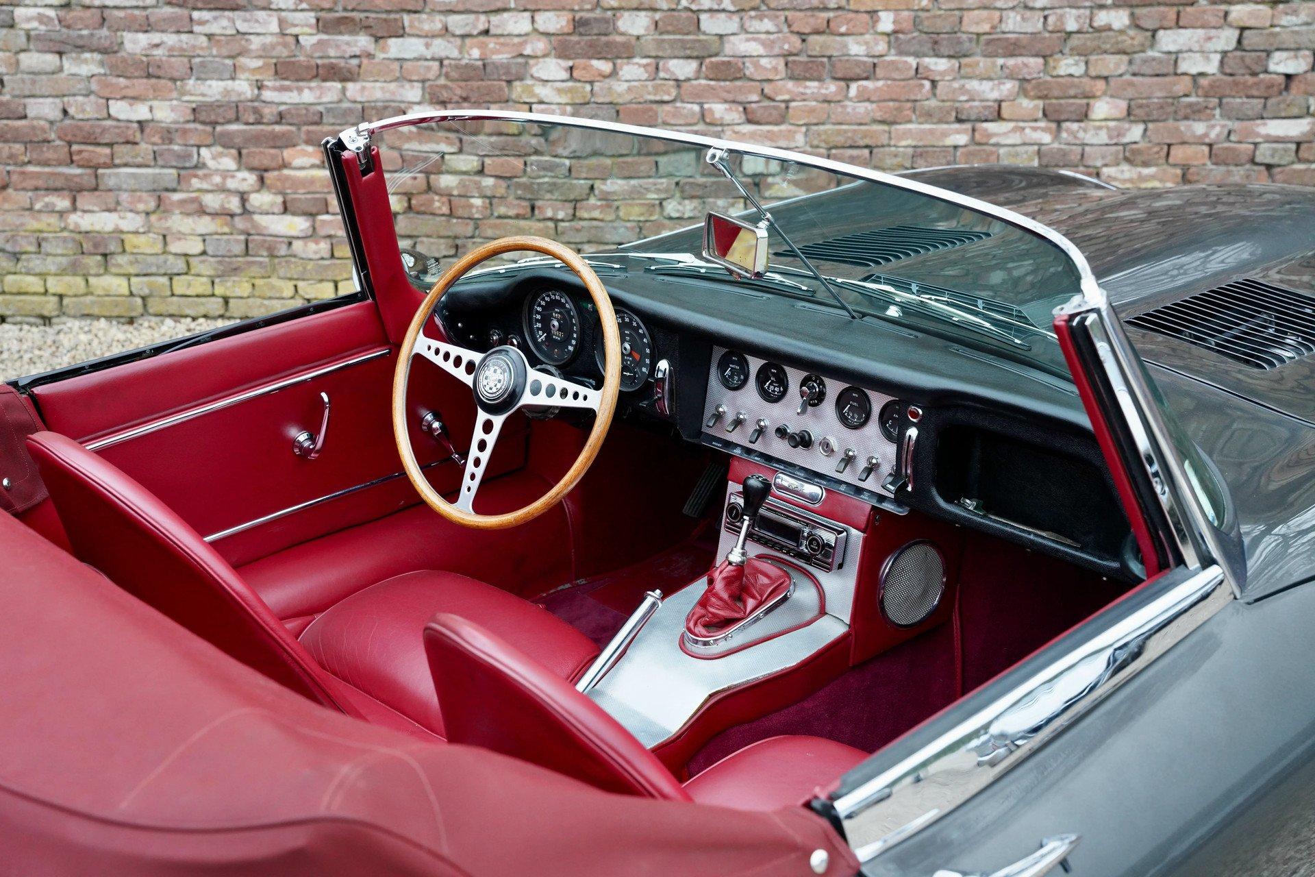 And there's more. This particular example features the flat floor. A detail that thrills many E-Type enthusiasts. These early flat-floor models were soon replaced in favor of added comfort, but purists will tell you that something was lost in that trade. This is as authentic as it gets. This Jaguar E-Type has undergone restoration work in the past. The paintwork is in fair condition, so you shouldn't expect a concours-level car. However, the mechanics have been completely overhauled recently, making this a true driver's car that's ready to hit the road.