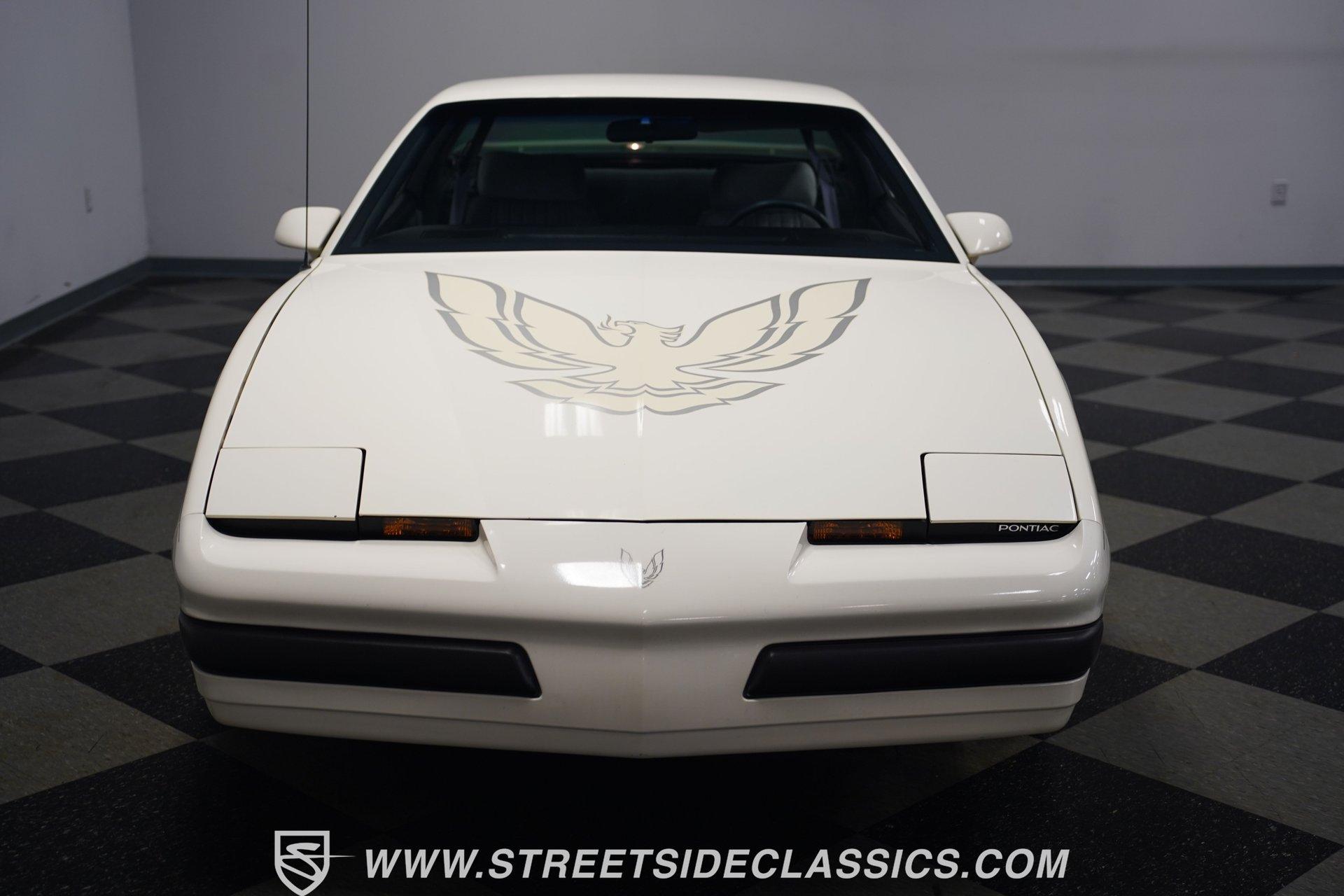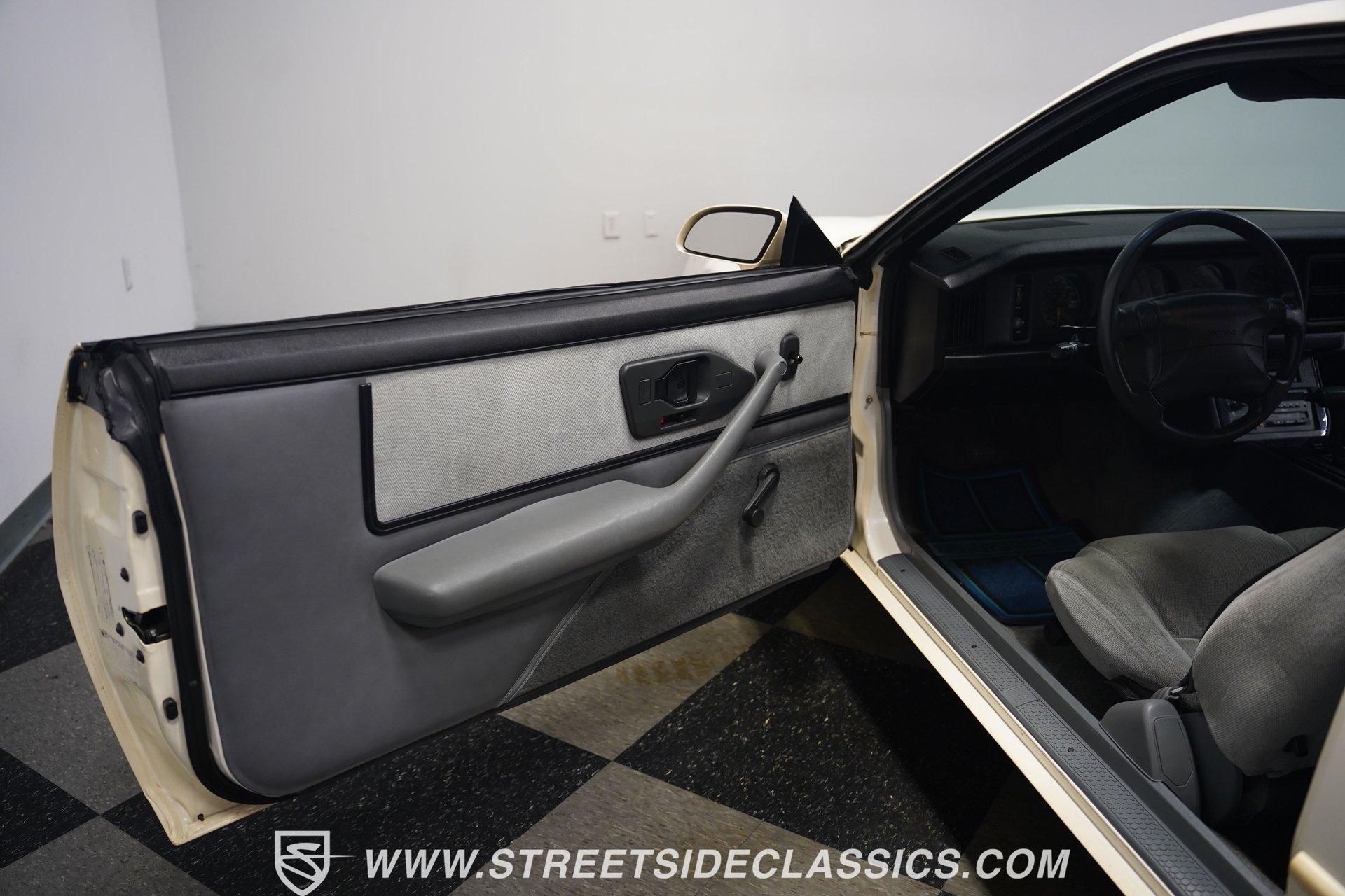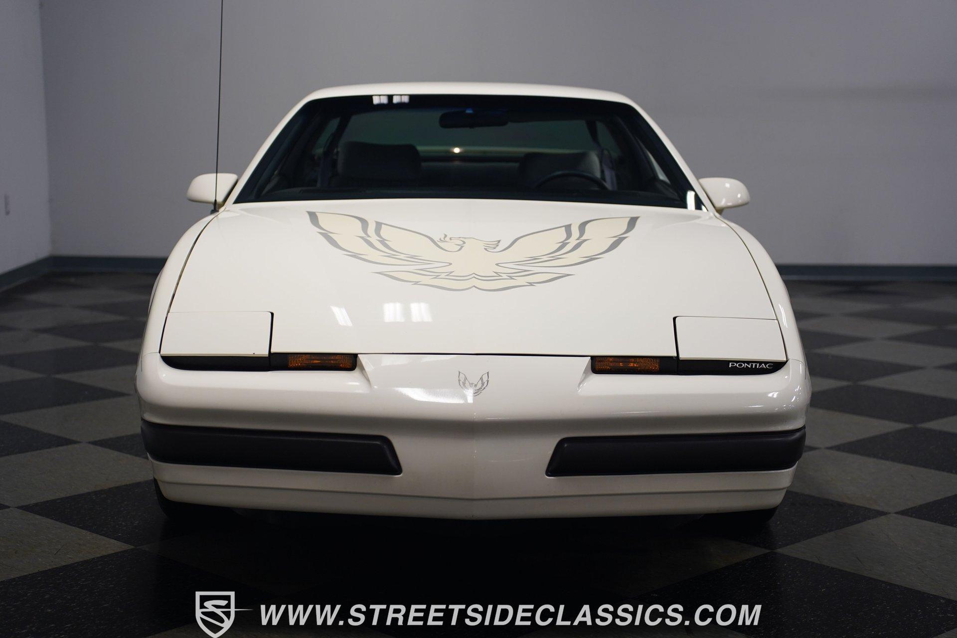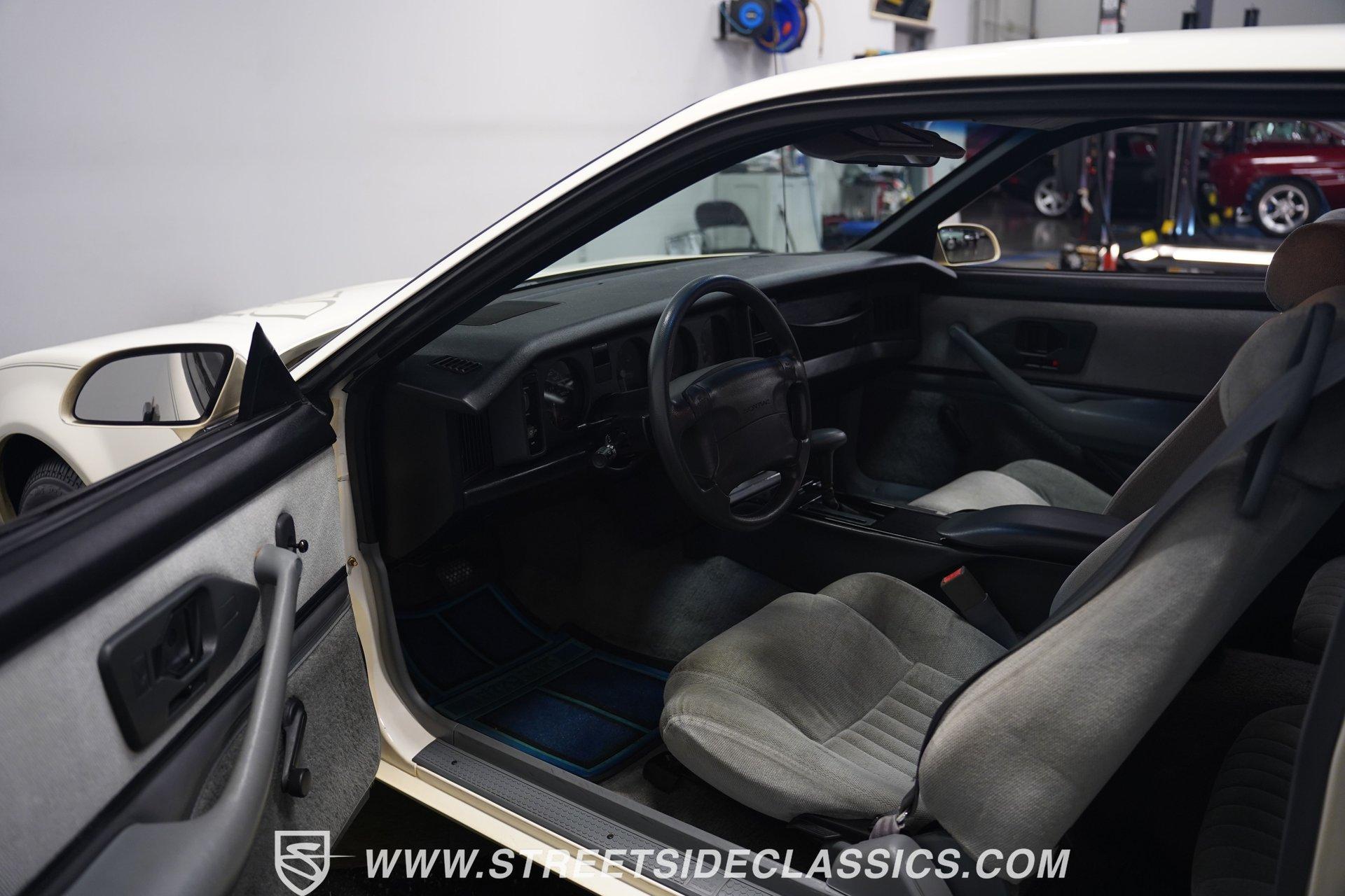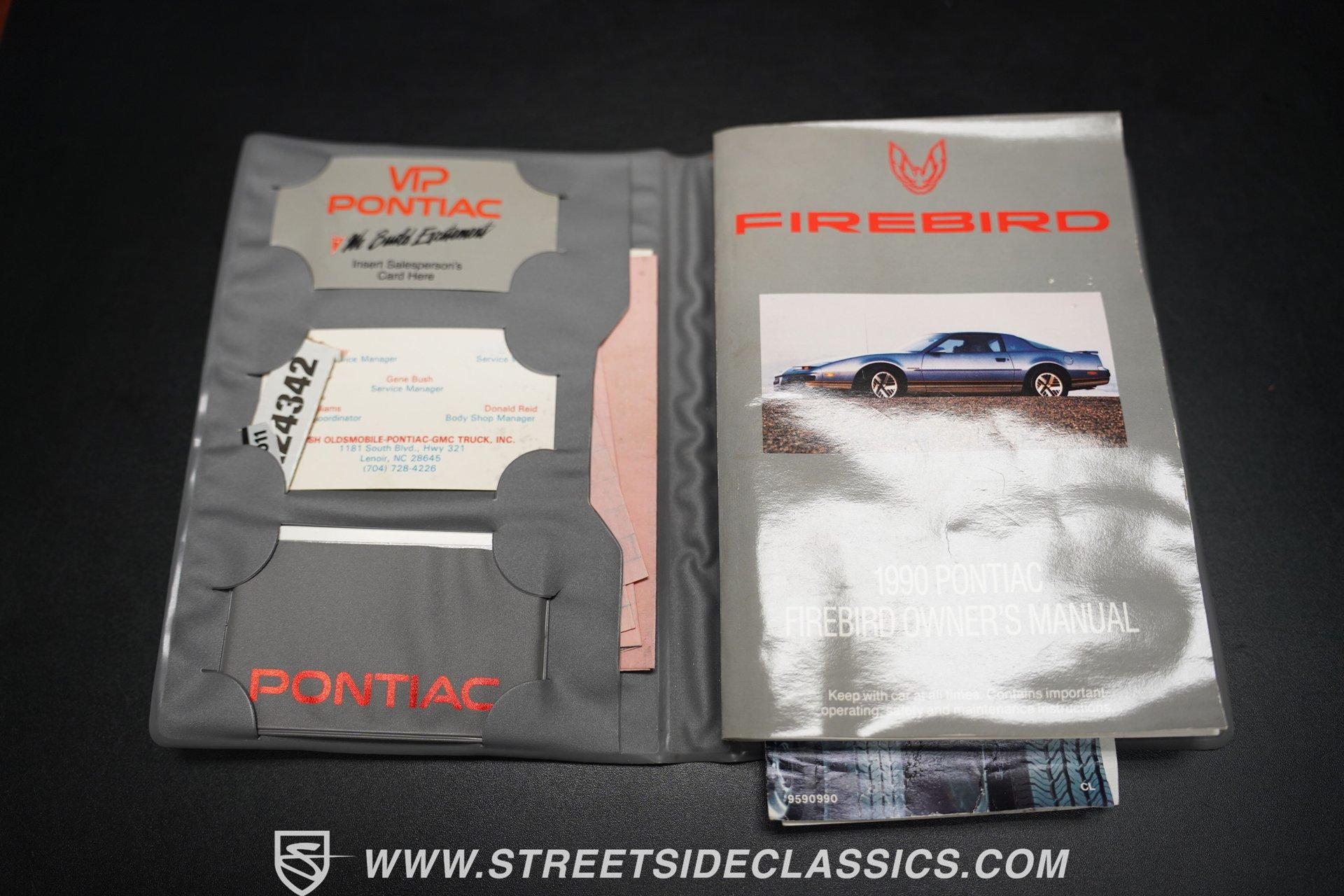 Unmistakable American muscle defines this 1990 Pontiac Firebird, dressed in factory white paint with silver decals that accentuate its aerodynamic profile. The clean body lines maintain their original showroom appeal with proper panel gaps and those signature heavy doors that close with authority. Original factory-correct 15-inch wheels wrapped in 235/60R15 tires sit perfectly in the wheel wells, giving this Firebird a planted stance. The classic silhouette with its long hood and short deck creates a balanced proportion that made these third-generation F-bodies an automotive icon of the era. The medium dark gray cloth interior remains remarkably intact with minimal signs of age. The front bucket seats show well, while the rear seats appear almost unused. Factory gauges display clearly against the uncracked dash surface. Gray door panels coordinate seamlessly with the seats and carpet, creating a cohesive cabin aesthetic. The factory floor shifter and center console add a sporty feel to the driving position. The AM/FM cassette player stands ready to play your favorite 90s tracks while the air conditioning and power steering ensure driving comfort. The 3.1L V6 engine pairs with a 700R4 4-speed automatic transmission to deliver smooth acceleration and highway cruising ability. The engine bay maintains a clean factory appearance with all components properly placed. A single-to-dual exhaust system with quiet flow mufflers provides just the right sound without being excessive. Power disc brakes up front offer solid stopping capability. The updated AC system has been converted to modern R134a refrigerant. Coil spring suspension front and rear delivers a balanced ride quality that feels solid on the road. HIGHLIGHTS: 3.1L V6 Engine 700R4 4-Speed Automatic Transmission Fuel Injection Power Front Disc Brakes Coil Spring Suspension Single to Dual Exhaust Quiet Flow Mufflers R134a AC Conversion White Paint with Silver Decals 15" Wheels with 235/60R15 Tires Medium Dark Gray Interior with Bucket Seats Floor Shift Center Console Power Steering Air Conditioning AM/FM Cassette Player 5-Digit Odometer Dealer Invoice Warranty Card This 1990 Pontiac Firebird represents pure 90s American performance with its clean original condition, V6 power, and unmolested appearance. A true survivor that gives you authentic third-generation F-body experience without modern modifications or alterations. Call today!