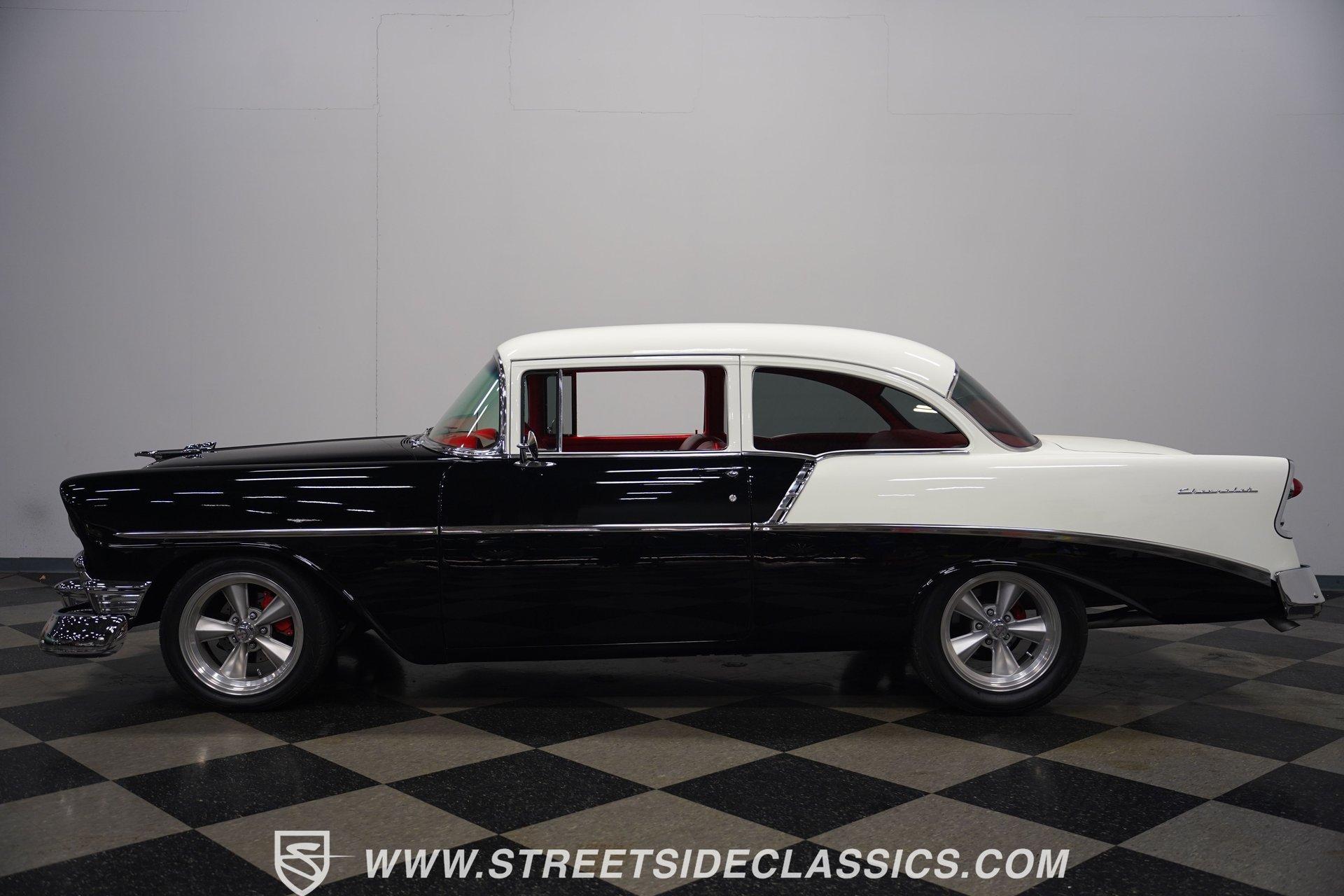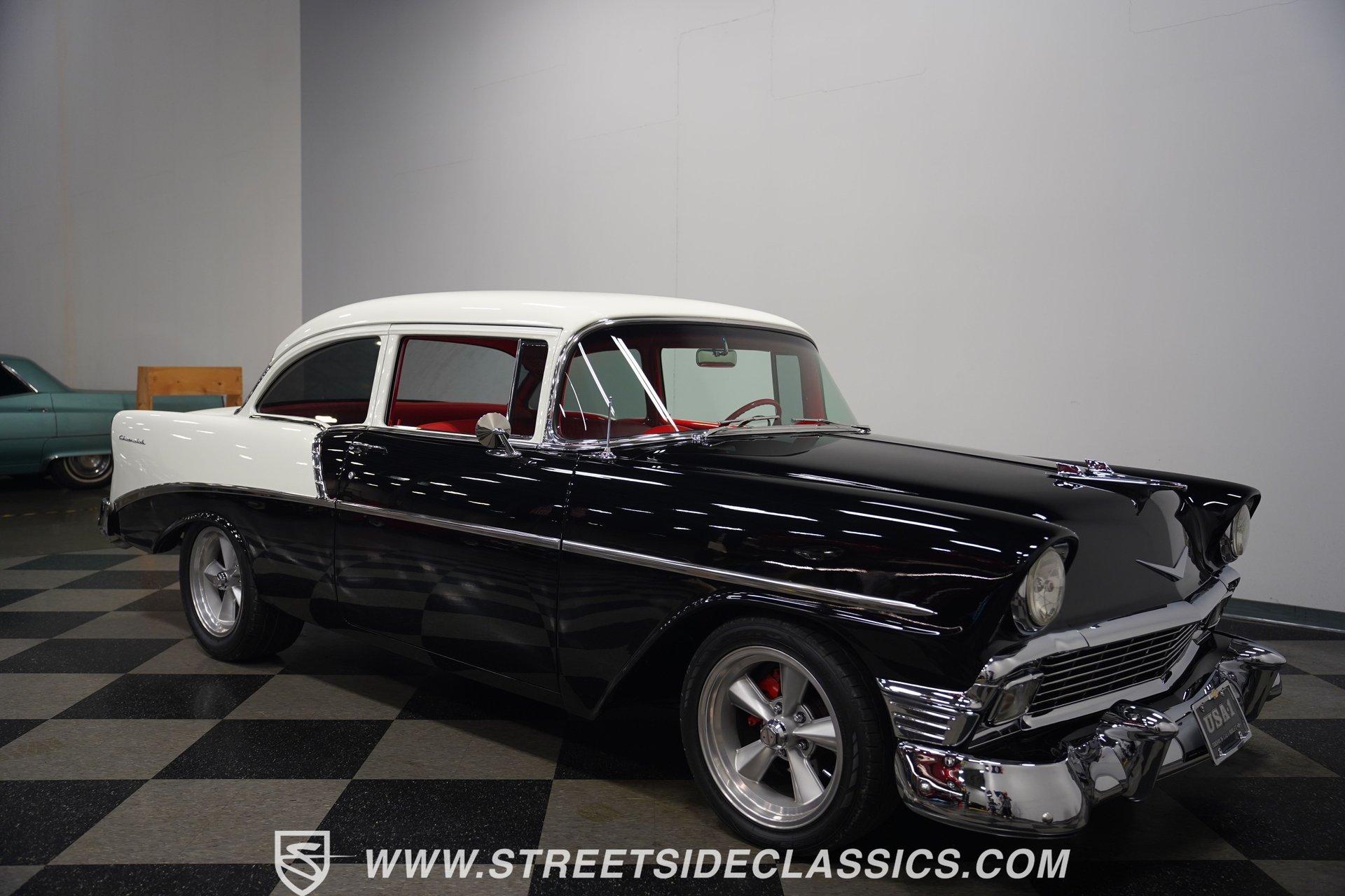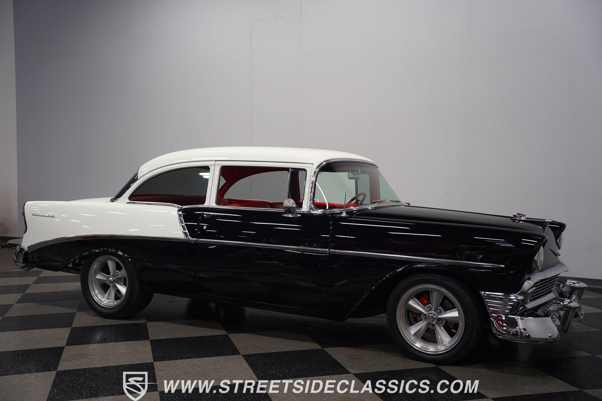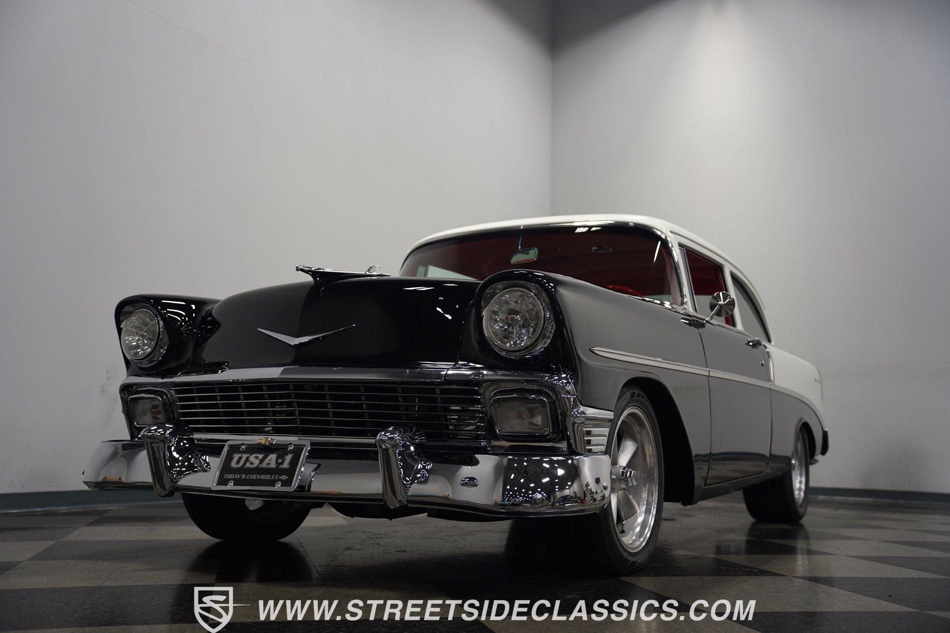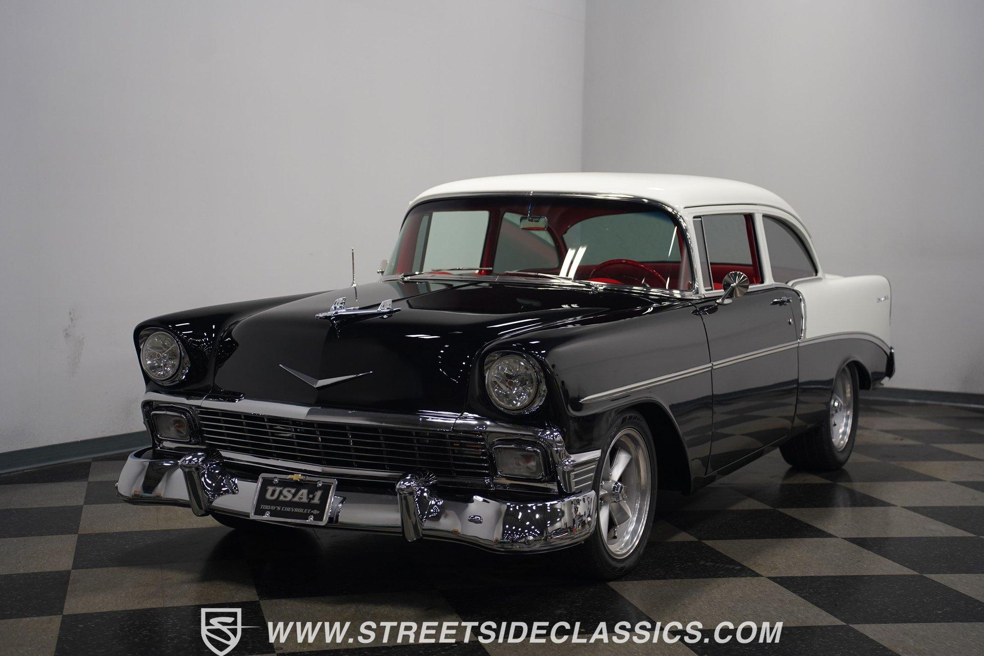 Frame-off built from the ground up, this 1956 Chevrolet 210 wears a bold two-tone finish with black covering the lower section and white across the roof. The 17-inch American Racing wheels fill the wheel wells perfectly, wrapped in 235/45ZR17 front and 275/50ZR17 rear tires for an aggressive road stance. Upgraded tri-bar headlights add modern illumination while maintaining the classic look. The brightwork gleams flawlessly against the contrasting paint while dual exhaust with an X-pipe exits the rear, giving onlookers something to admire from every angle. Red dominates the cabin with two-tone red and gray vinyl bench seats that add visual flair and comfort. Dakota Digital gauges offer clear readouts of vital stats while maintaining a period-correct appearance. The floor-mounted Hurst shifter controls the Muncie M20 four-speed manual with precision. A smaller radius steering wheel mounted on a tilt column improves control during maneuvers. The retro-style AM/FM/AUX stereo with Bluetooth plays your favorite tunes while Vintage Air vents mounted under the dash keep you cool during summer cruises. A 1967 Chevrolet 327 V8 with aluminum AFR heads pushes an estimated 275 horsepower through a Holley double pumper carburetor with electric choke. An Edelbrock intake manifold handles air distribution while ceramic-coated long-tube headers connect to an Xlerator dual exhaust system with X-pipe. The billet serpentine belt system looks sharp against the GM orange paint on the block. A Ford 8.8 rear end with 3.88 gear ratio puts power to the pavement. Four-wheel power disc brakes with drilled and slotted rotors bring everything to a stop quickly and effectively. HIGHLIGHTS: 327 V8 Engine 275hp with Aluminum AFR Heads 4 Speed Muncie M20 Manual Transmission Holley Double Pumper Carburetor with Electric Choke Edelbrock Intake Manifold Ceramic Coated Long Tube Headers Dual Exhaust with X-Pipe and Xlerator Mufflers Billet Serpentine Belt System Ford 8.8 Rear End with 3.88 Gear Ratio Four-Wheel Power Disc Brakes with Drilled and Slotted Rotors Helper Coils in Rear Suspension Aluminum Radiator with Electric Fan Power Steering Two-Tone Black and White Paint 17" American Racing Wheels in 235/45ZR17 Front, 275/50ZR17 Rear Tires Upgraded Tri-Bar Headlights Dual Exhaust Red Interior with Two-Tone Red and Gray Bench Seats Vintage Air Conditioning with Under-Dash Vents Dakota Digital Gauges Retro-Style AM/FM/AUX Stereo with Bluetooth Hurst Shifter Tilt Steering Column Smaller Radius Steering Wheel Red Carpet Frame-Off Restoration Modified and ready for action, this 1956 Chevrolet 210 combines classic Tri-Five styling with modern performance upgrades. The black and white exterior, red interior, and 327 V8 make an unbeatable combination for your next street machine. Call today!