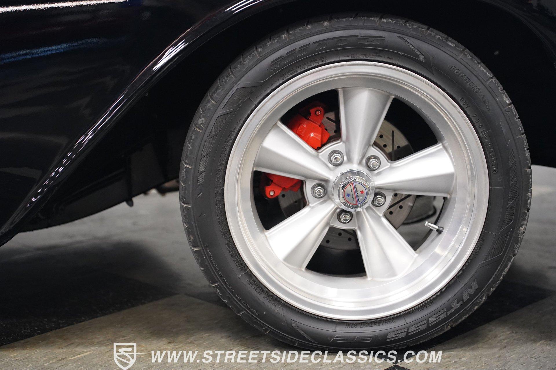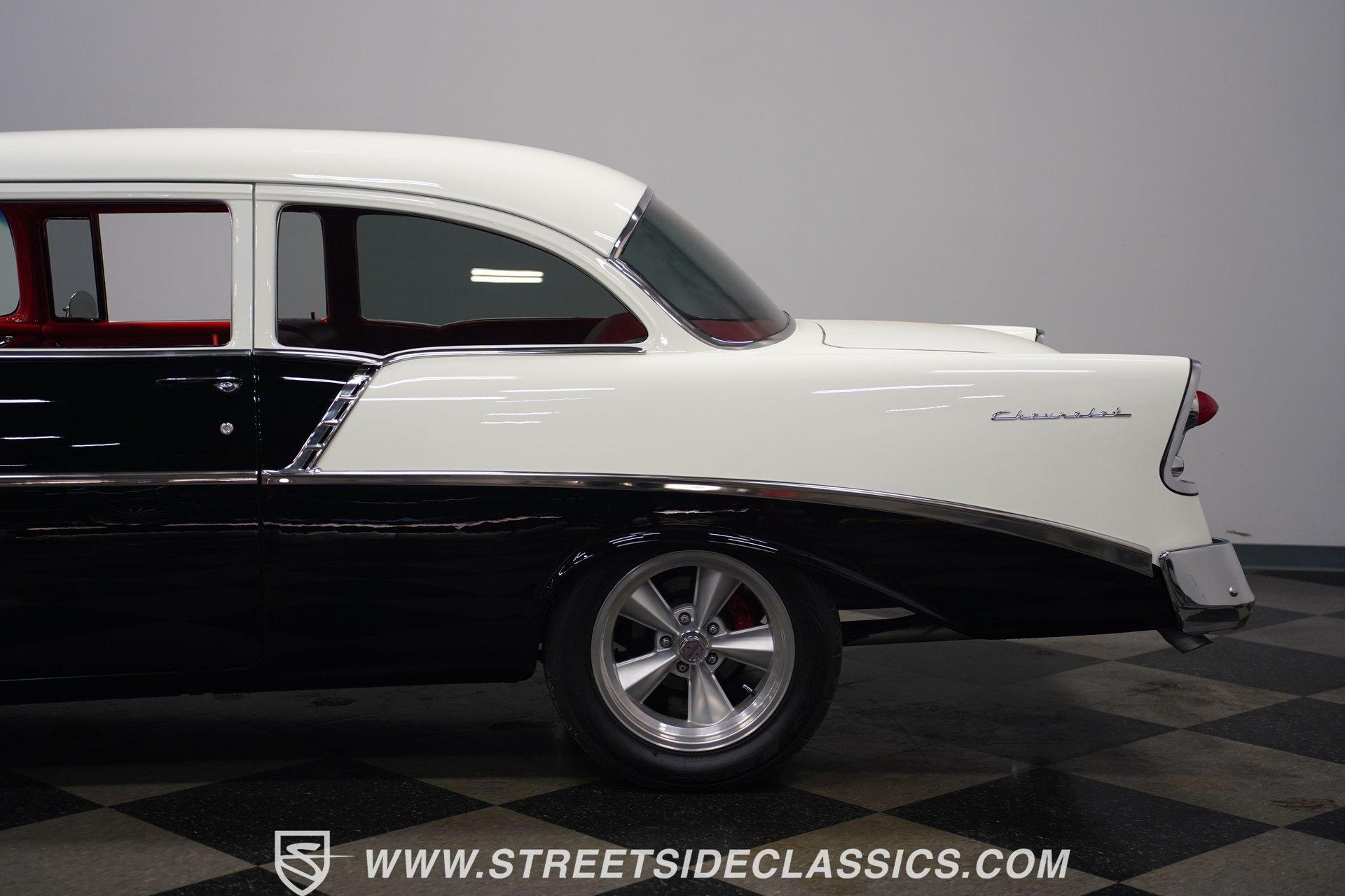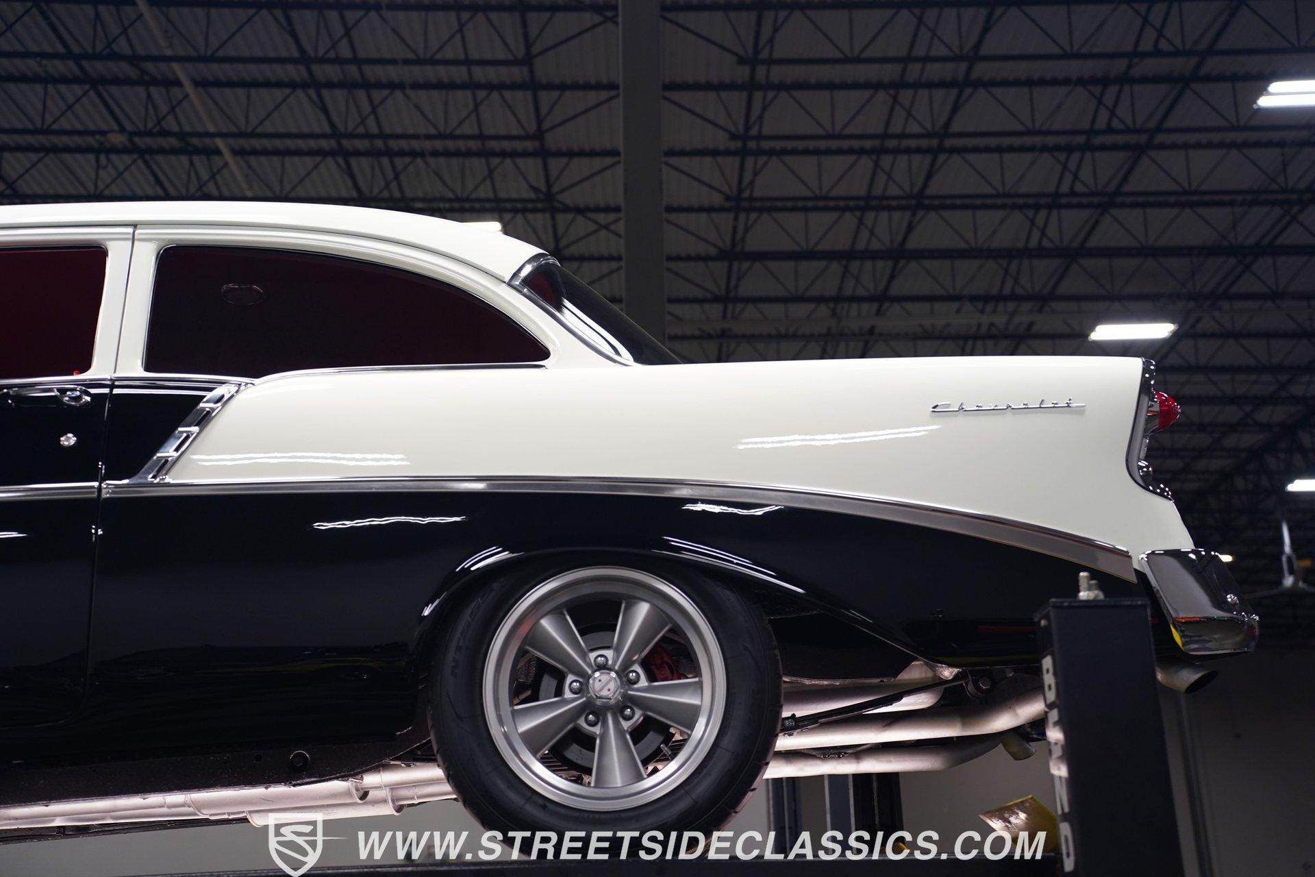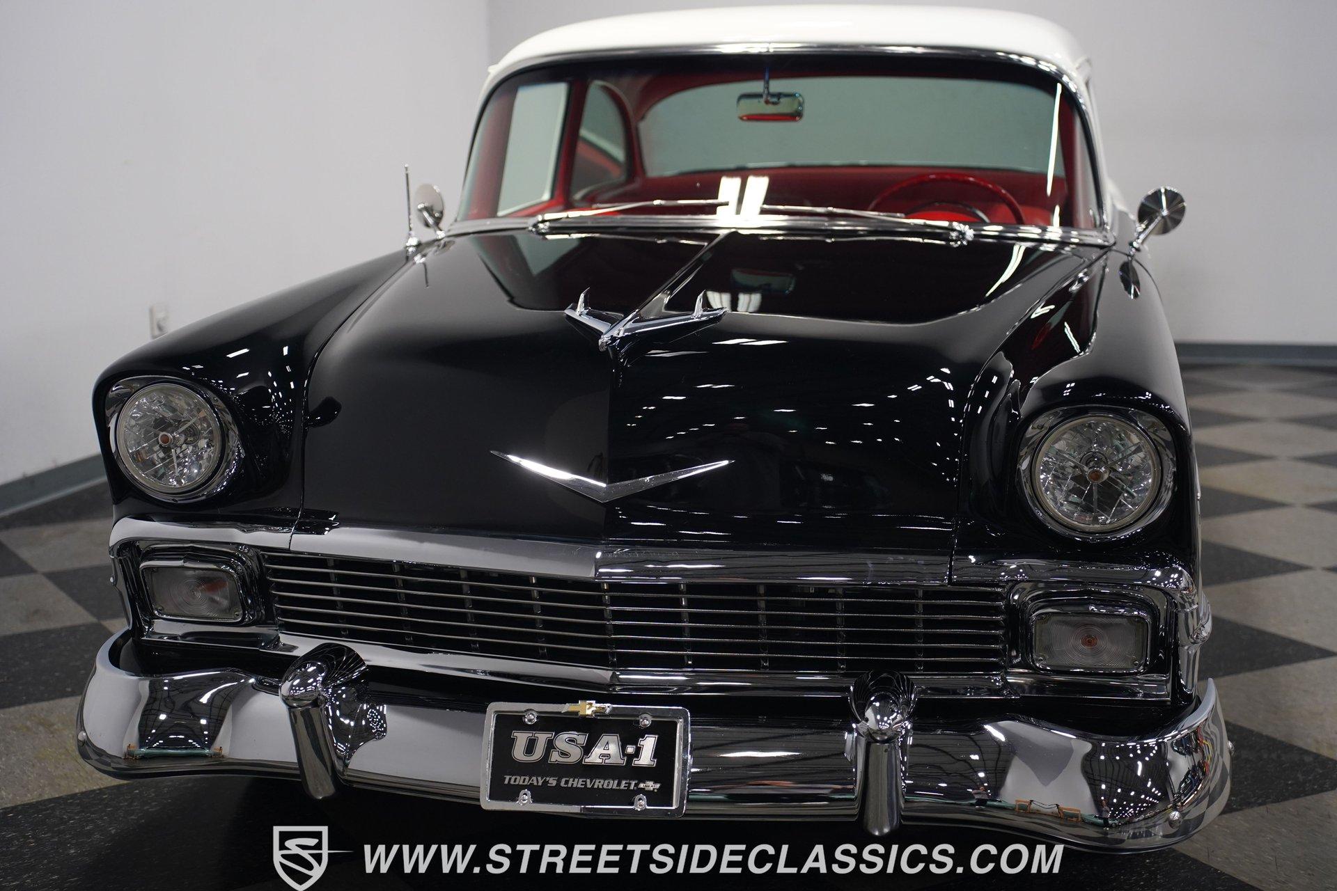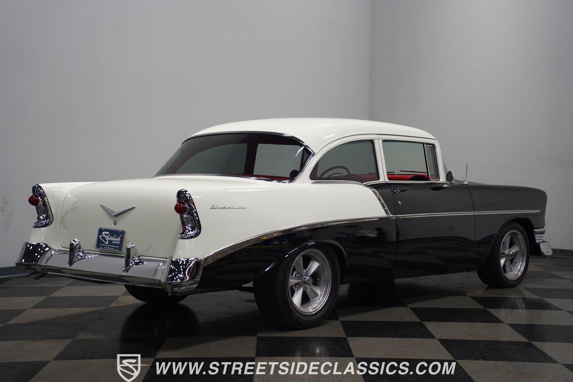 Frame-off built from the ground up, this 1956 Chevrolet 210 wears a bold two-tone finish with black covering the lower section and white across the roof. The 17-inch American Racing wheels fill the wheel wells perfectly, wrapped in 235/45ZR17 front and 275/50ZR17 rear tires for an aggressive road stance. Upgraded tri-bar headlights add modern illumination while maintaining the classic look. The brightwork gleams flawlessly against the contrasting paint while dual exhaust with an X-pipe exits the rear, giving onlookers something to admire from every angle. Red dominates the cabin with two-tone red and gray vinyl bench seats that add visual flair and comfort. Dakota Digital gauges offer clear readouts of vital stats while maintaining a period-correct appearance. The floor-mounted Hurst shifter controls the Muncie M20 four-speed manual with precision. A smaller radius steering wheel mounted on a tilt column improves control during maneuvers. The retro-style AM/FM/AUX stereo with Bluetooth plays your favorite tunes while Vintage Air vents mounted under the dash keep you cool during summer cruises. A 1967 Chevrolet 327 V8 with aluminum AFR heads pushes an estimated 275 horsepower through a Holley double pumper carburetor with electric choke. An Edelbrock intake manifold handles air distribution while ceramic-coated long-tube headers connect to an Xlerator dual exhaust system with X-pipe. The billet serpentine belt system looks sharp against the GM orange paint on the block. A Ford 8.8 rear end with 3.88 gear ratio puts power to the pavement. Four-wheel power disc brakes with drilled and slotted rotors bring everything to a stop quickly and effectively. HIGHLIGHTS: 327 V8 Engine 275hp with Aluminum AFR Heads 4 Speed Muncie M20 Manual Transmission Holley Double Pumper Carburetor with Electric Choke Edelbrock Intake Manifold Ceramic Coated Long Tube Headers Dual Exhaust with X-Pipe and Xlerator Mufflers Billet Serpentine Belt System Ford 8.8 Rear End with 3.88 Gear Ratio Four-Wheel Power Disc Brakes with Drilled and Slotted Rotors Helper Coils in Rear Suspension Aluminum Radiator with Electric Fan Power Steering Two-Tone Black and White Paint 17" American Racing Wheels in 235/45ZR17 Front, 275/50ZR17 Rear Tires Upgraded Tri-Bar Headlights Dual Exhaust Red Interior with Two-Tone Red and Gray Bench Seats Vintage Air Conditioning with Under-Dash Vents Dakota Digital Gauges Retro-Style AM/FM/AUX Stereo with Bluetooth Hurst Shifter Tilt Steering Column Smaller Radius Steering Wheel Red Carpet Frame-Off Restoration Modified and ready for action, this 1956 Chevrolet 210 combines classic Tri-Five styling with modern performance upgrades. The black and white exterior, red interior, and 327 V8 make an unbeatable combination for your next street machine. Call today!