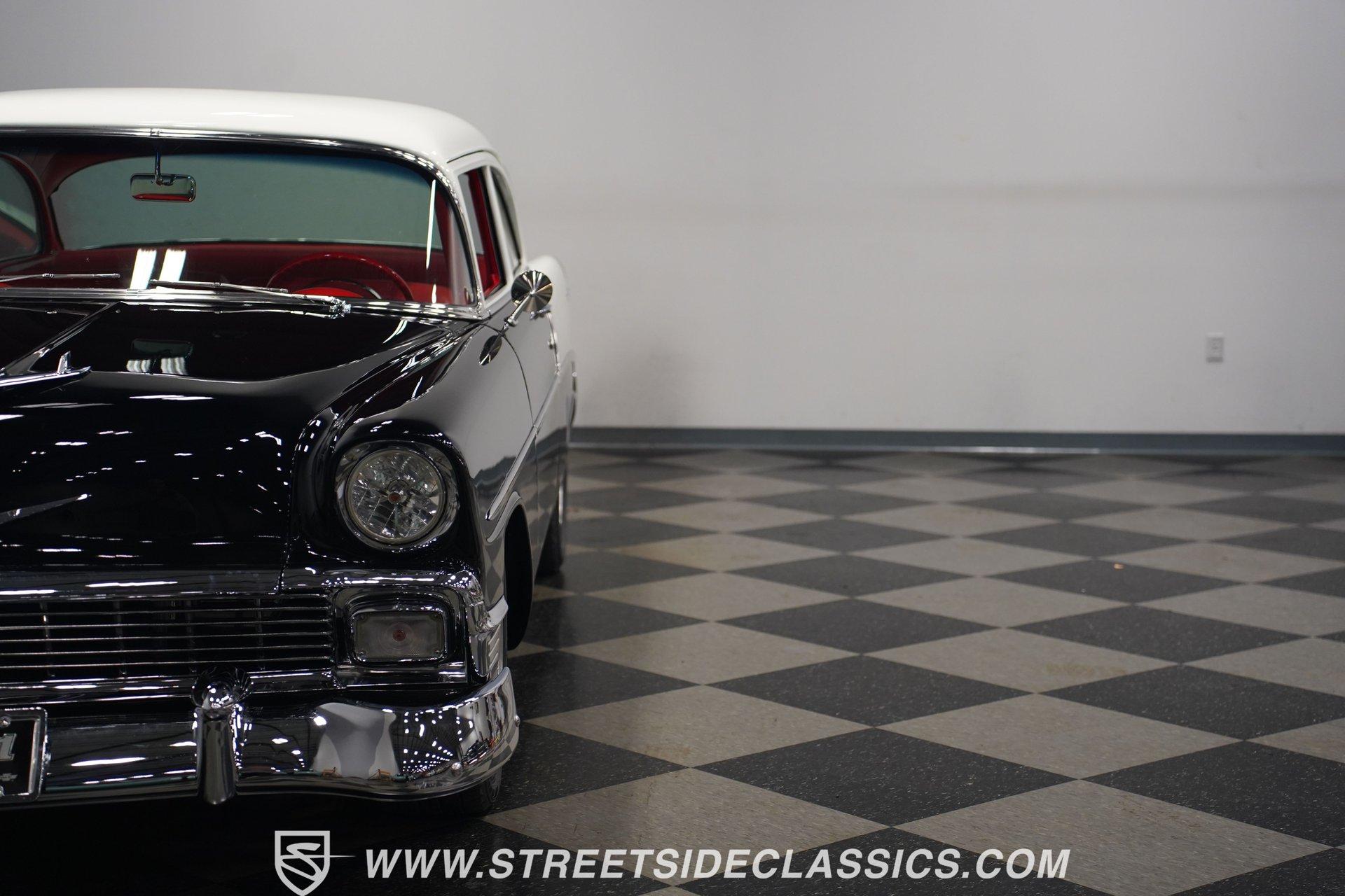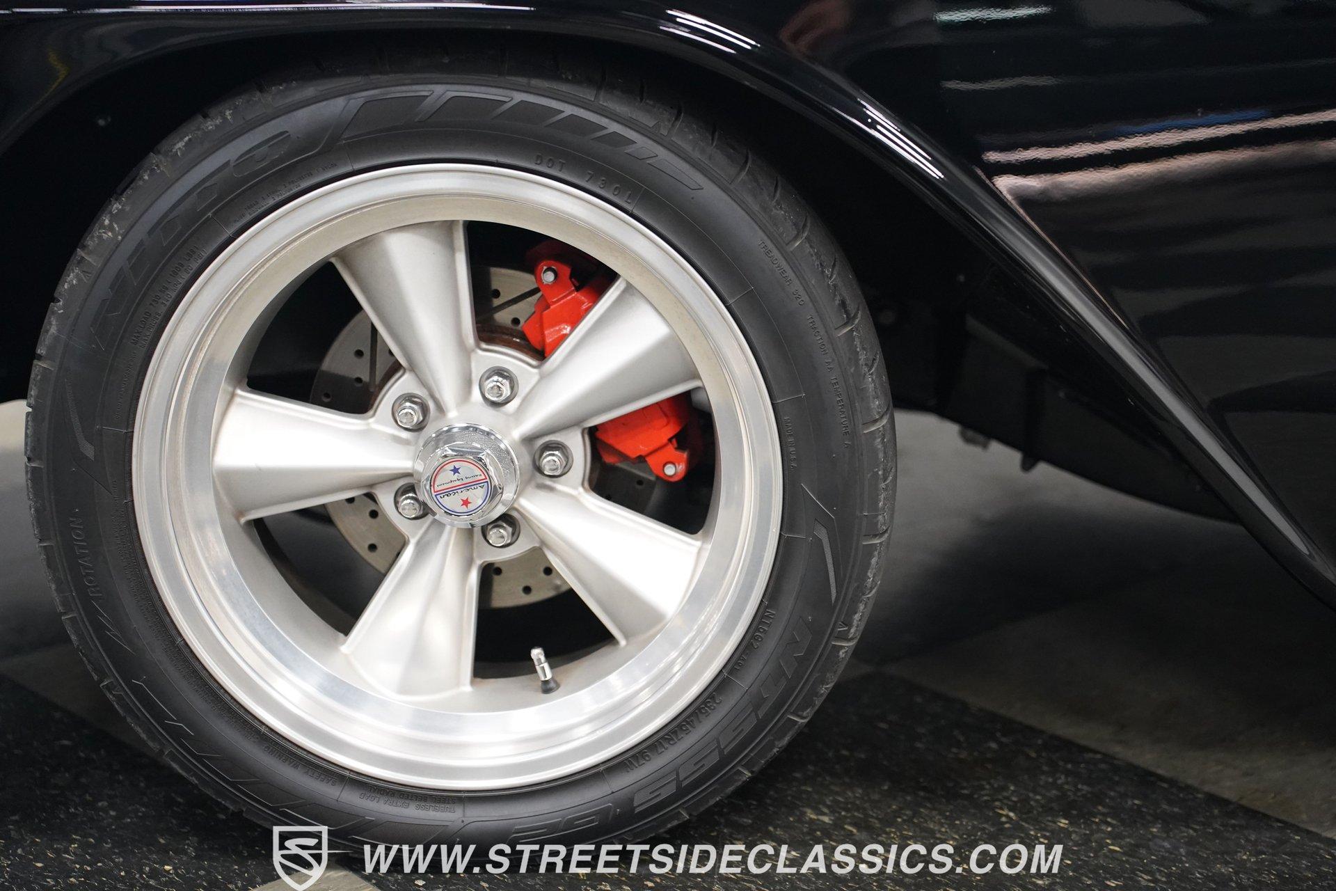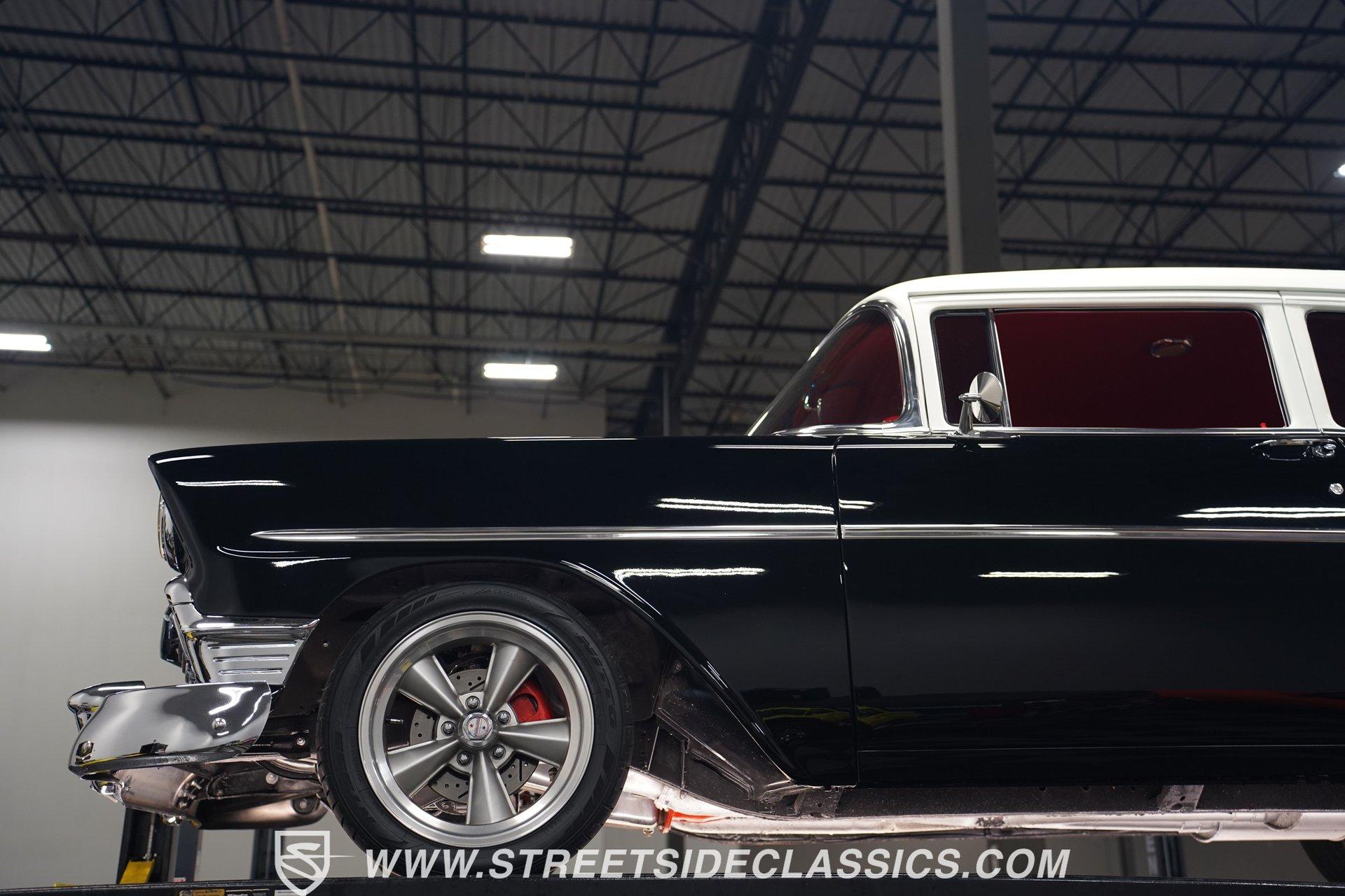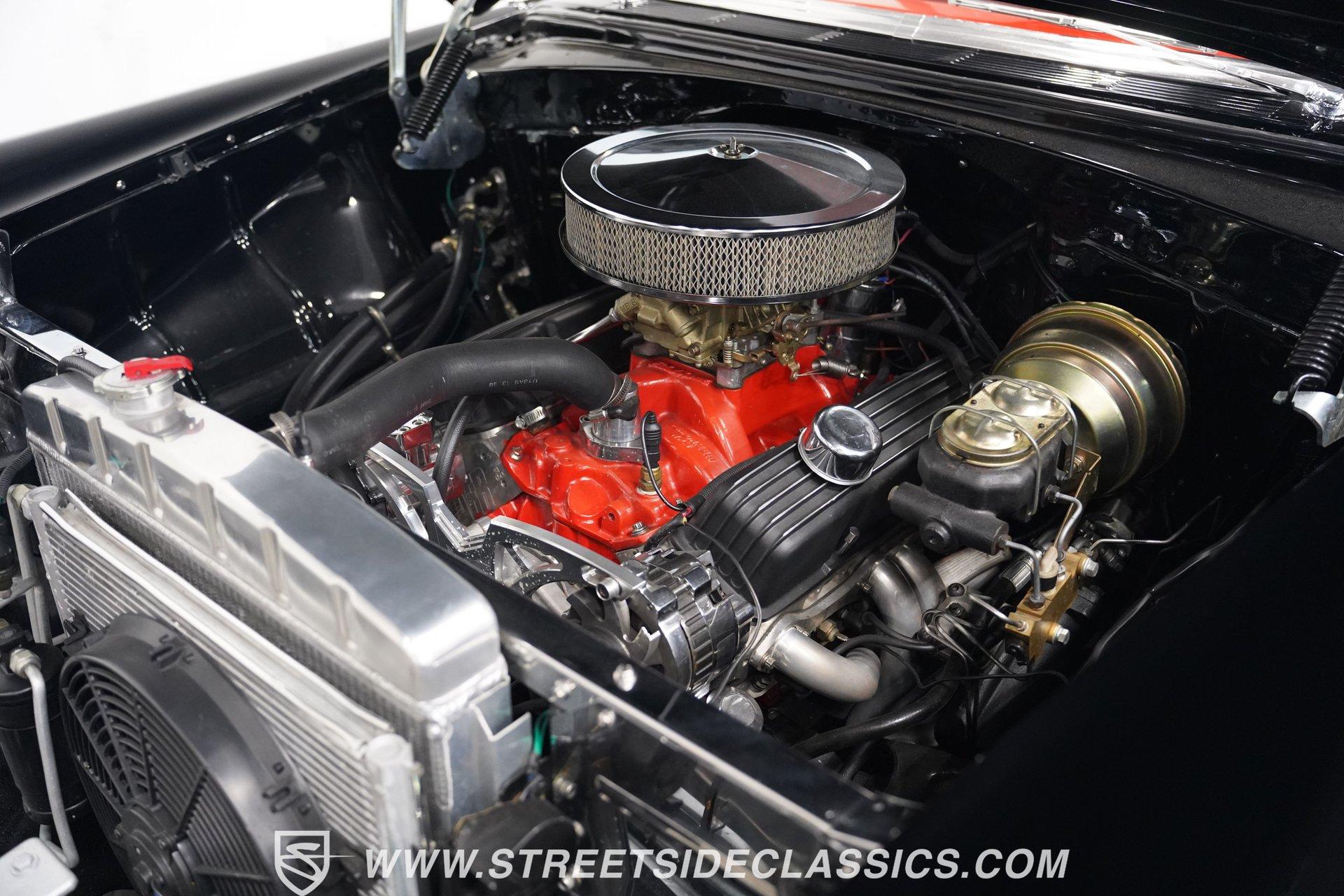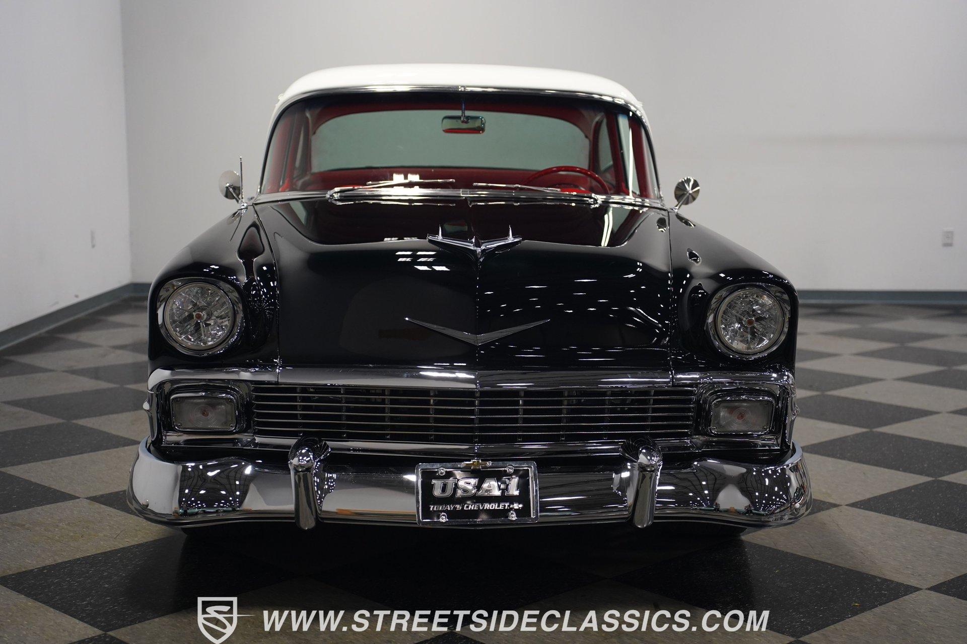 Frame-off built from the ground up, this 1956 Chevrolet 210 wears a bold two-tone finish with black covering the lower section and white across the roof. The 17-inch American Racing wheels fill the wheel wells perfectly, wrapped in 235/45ZR17 front and 275/50ZR17 rear tires for an aggressive road stance. Upgraded tri-bar headlights add modern illumination while maintaining the classic look. The brightwork gleams flawlessly against the contrasting paint while dual exhaust with an X-pipe exits the rear, giving onlookers something to admire from every angle. Red dominates the cabin with two-tone red and gray vinyl bench seats that add visual flair and comfort. Dakota Digital gauges offer clear readouts of vital stats while maintaining a period-correct appearance. The floor-mounted Hurst shifter controls the Muncie M20 four-speed manual with precision. A smaller radius steering wheel mounted on a tilt column improves control during maneuvers. The retro-style AM/FM/AUX stereo with Bluetooth plays your favorite tunes while Vintage Air vents mounted under the dash keep you cool during summer cruises. A 1967 Chevrolet 327 V8 with aluminum AFR heads pushes an estimated 275 horsepower through a Holley double pumper carburetor with electric choke. An Edelbrock intake manifold handles air distribution while ceramic-coated long-tube headers connect to an Xlerator dual exhaust system with X-pipe. The billet serpentine belt system looks sharp against the GM orange paint on the block. A Ford 8.8 rear end with 3.88 gear ratio puts power to the pavement. Four-wheel power disc brakes with drilled and slotted rotors bring everything to a stop quickly and effectively. HIGHLIGHTS: 327 V8 Engine 275hp with Aluminum AFR Heads 4 Speed Muncie M20 Manual Transmission Holley Double Pumper Carburetor with Electric Choke Edelbrock Intake Manifold Ceramic Coated Long Tube Headers Dual Exhaust with X-Pipe and Xlerator Mufflers Billet Serpentine Belt System Ford 8.8 Rear End with 3.88 Gear Ratio Four-Wheel Power Disc Brakes with Drilled and Slotted Rotors Helper Coils in Rear Suspension Aluminum Radiator with Electric Fan Power Steering Two-Tone Black and White Paint 17" American Racing Wheels in 235/45ZR17 Front, 275/50ZR17 Rear Tires Upgraded Tri-Bar Headlights Dual Exhaust Red Interior with Two-Tone Red and Gray Bench Seats Vintage Air Conditioning with Under-Dash Vents Dakota Digital Gauges Retro-Style AM/FM/AUX Stereo with Bluetooth Hurst Shifter Tilt Steering Column Smaller Radius Steering Wheel Red Carpet Frame-Off Restoration Modified and ready for action, this 1956 Chevrolet 210 combines classic Tri-Five styling with modern performance upgrades. The black and white exterior, red interior, and 327 V8 make an unbeatable combination for your next street machine. Call today!