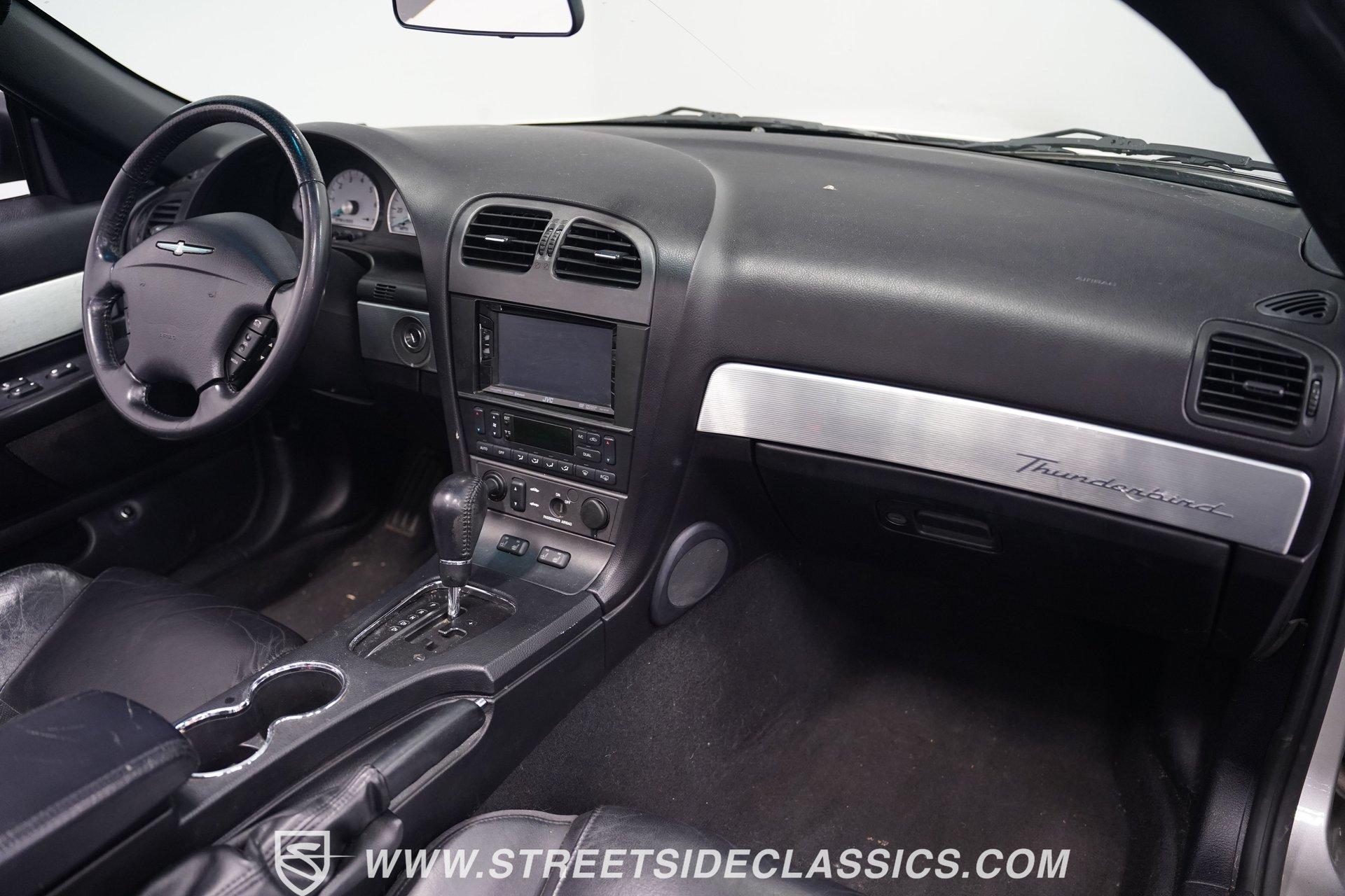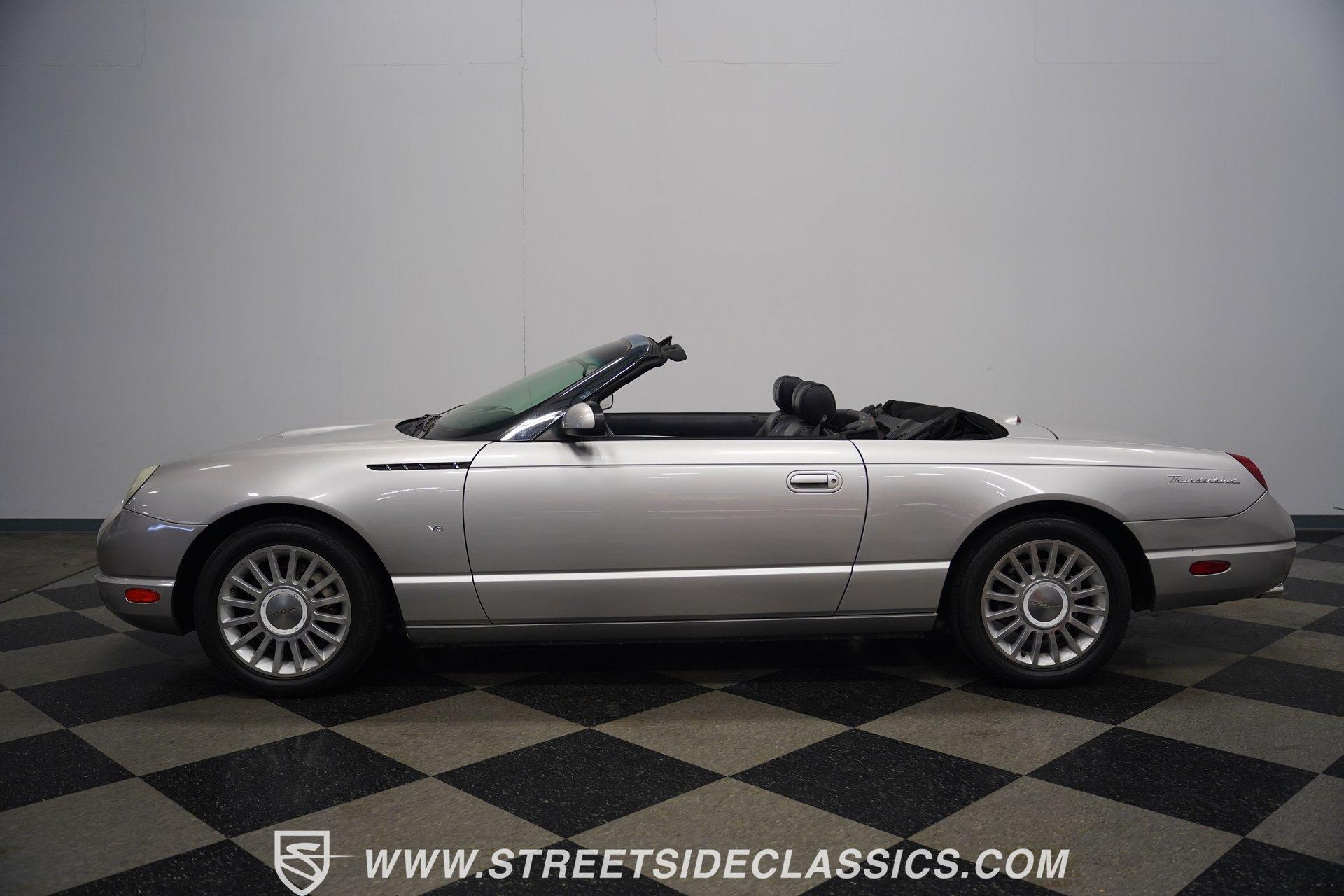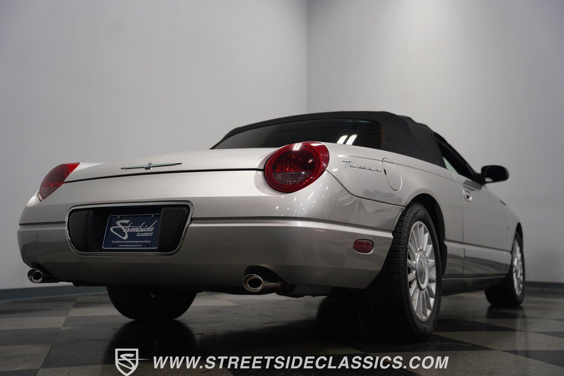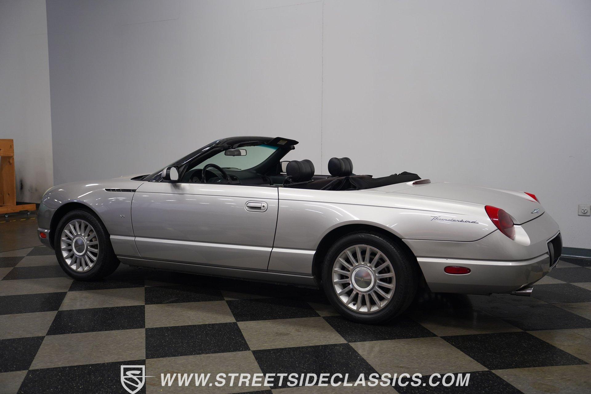Retro styling meets modern sophistication with this 2004 Ford Thunderbird painted factory-original Silver and complemented by sharp black details. Smooth, flowing curves run front to back, highlighted by the crisp black cloth convertible top featuring a glass rear window. Factory chrome grille accents, bright emblems, dual mirrors, and subtle chrome exhaust tips keep it tastefully detailed. Factory 17-inch alloy wheels with sporty 235/50ZR17 tires fill the fender wells, giving the Thunderbird its confident stance. Inside, black vinyl bucket seats provide understated comfort and a timeless feel, perfectly matched by clean, coordinated door panels. The center console features a sporty shifter that's comfortably within reach. Entertainment is added with an aftermarket JVC touchscreen AM/FM/AUX stereo unit. Easy cruising is made even better with power steering, heated seats, power mirrors, and side airbags, creating an environment that's both relaxing and functional whether running errands or taking longer weekend drives. Power arrives courtesy of the factory-installed 3.9L V8 engine, mated to a smooth-shifting 5-speed automatic transmission with select-shift capability for manual control. Factory dual exhaust pipes exit neatly out back, delivering a subtle yet refined exhaust note. Factory-equipped power steering keeps handling relaxed, while four-wheel power disc brakes provide solid stopping power. All mechanical components remain stock, providing the right mix of effortless cruising, predictable handling, and reliable V8 performance. HIGHLIGHTS: 3.9L V8 Engine 5-Speed Automatic Transmission w/ Select-Shift Electronic Fuel Injection Power Steering 4-Wheel Power Disc Brakes Dual Exhaust Factory Silver Paint Black Cloth Convertible Top w/ Glass Rear Window 17" Factory Wheels, 235/50ZR17 Tires Chrome Grille Accents Factory Thunderbird Emblems Dual Side Mirrors Factory-Tinted Glass Chrome Exhaust Tips Black Interior w/ Bucket Seats Console Shifter Aftermarket JVC AM/FM/AUX Touchscreen Stereo Power Mirrors Heated Seats Side Airbags Clean styling, comfort-focused interior features, and reliable V8 power come together naturally in the 2004 Ford Thunderbird. Ready to cruise comfortably through town or stretch out on longer drives, this Thunderbird offers the style and easygoing confidence that make it an ideal convertible to own and enjoy. Call today!