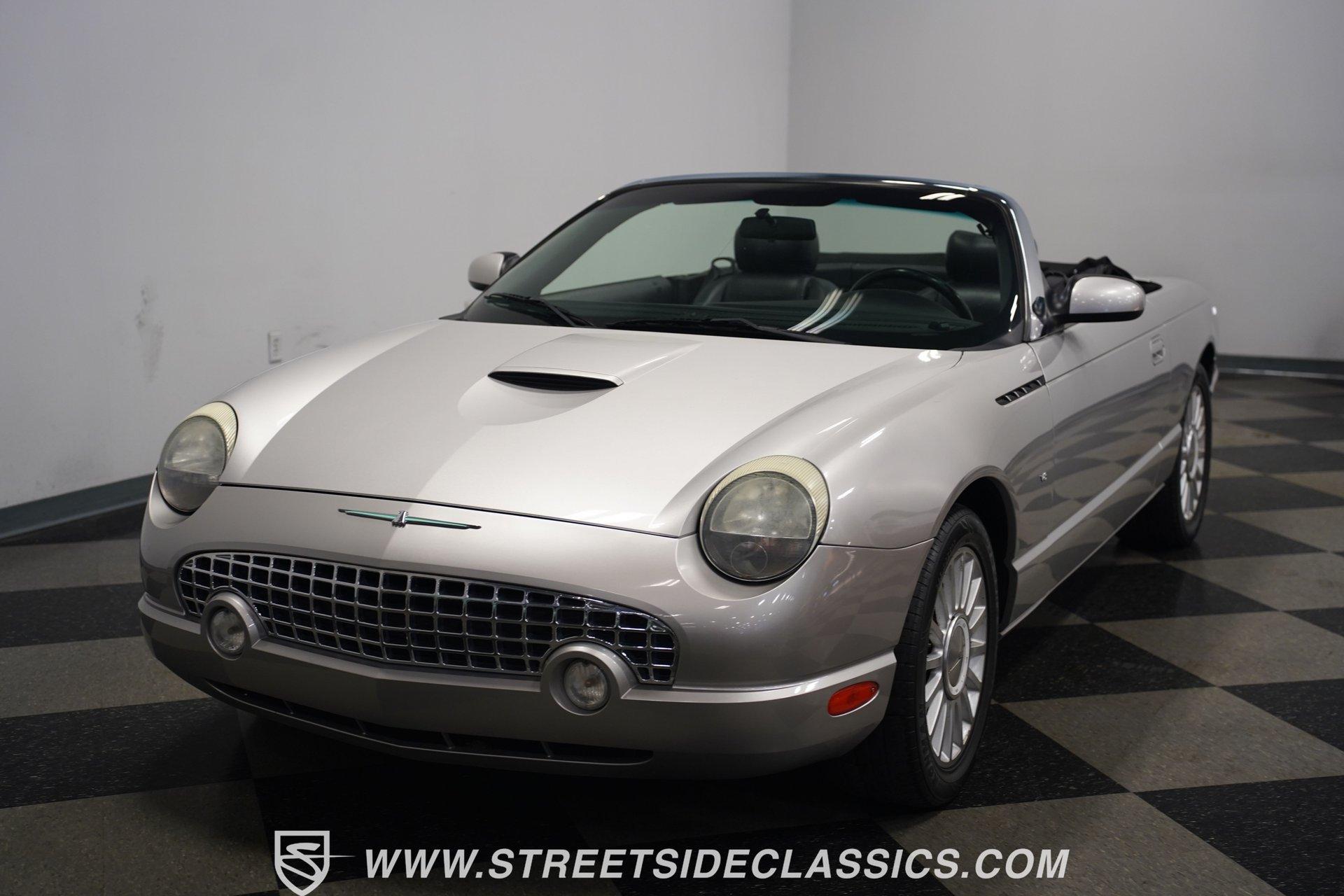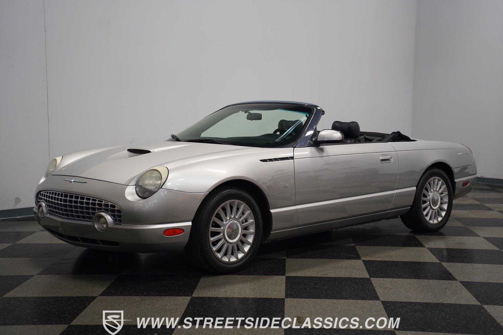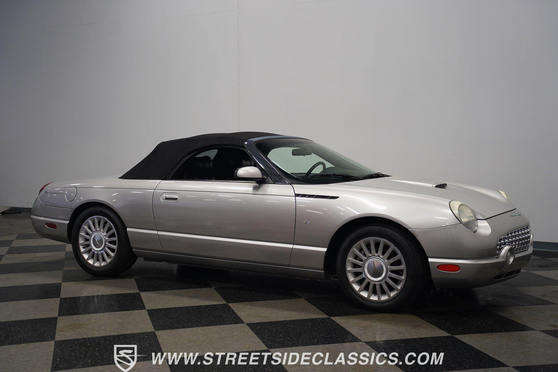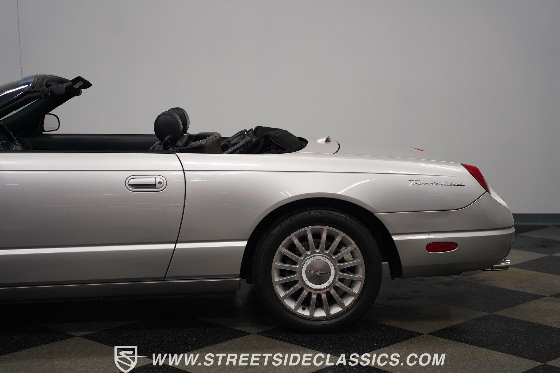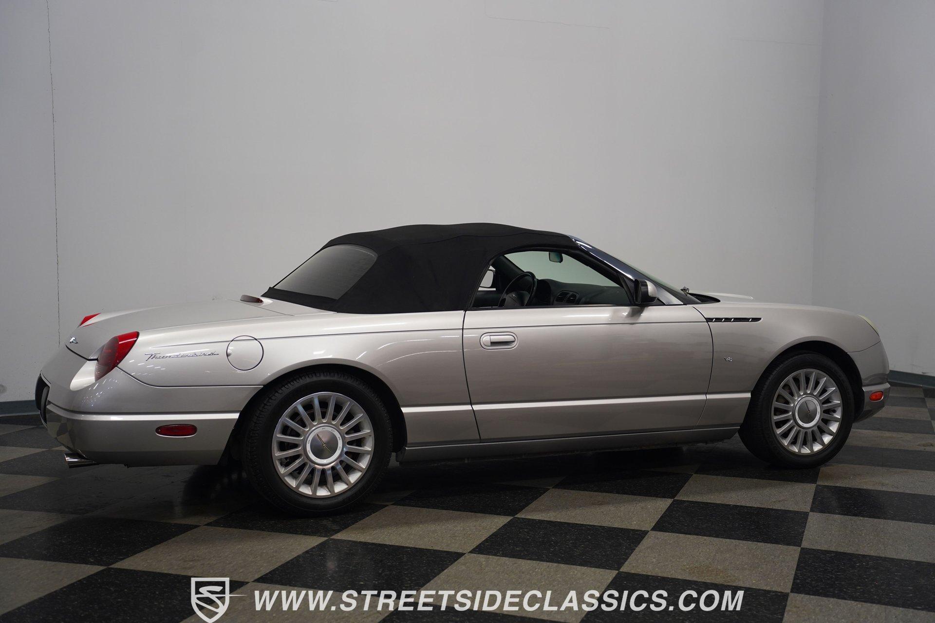 Retro styling meets modern sophistication with this 2004 Ford Thunderbird painted factory-original Silver and complemented by sharp black details. Smooth, flowing curves run front to back, highlighted by the crisp black cloth convertible top featuring a glass rear window. Factory chrome grille accents, bright emblems, dual mirrors, and subtle chrome exhaust tips keep it tastefully detailed. Factory 17-inch alloy wheels with sporty 235/50ZR17 tires fill the fender wells, giving the Thunderbird its confident stance. Inside, black vinyl bucket seats provide understated comfort and a timeless feel, perfectly matched by clean, coordinated door panels. The center console features a sporty shifter that's comfortably within reach. Entertainment is added with an aftermarket JVC touchscreen AM/FM/AUX stereo unit. Easy cruising is made even better with power steering, heated seats, power mirrors, and side airbags, creating an environment that's both relaxing and functional whether running errands or taking longer weekend drives. Power arrives courtesy of the factory-installed 3.9L V8 engine, mated to a smooth-shifting 5-speed automatic transmission with select-shift capability for manual control. Factory dual exhaust pipes exit neatly out back, delivering a subtle yet refined exhaust note. Factory-equipped power steering keeps handling relaxed, while four-wheel power disc brakes provide solid stopping power. All mechanical components remain stock, providing the right mix of effortless cruising, predictable handling, and reliable V8 performance. HIGHLIGHTS: 3.9L V8 Engine 5-Speed Automatic Transmission w/ Select-Shift Electronic Fuel Injection Power Steering 4-Wheel Power Disc Brakes Dual Exhaust Factory Silver Paint Black Cloth Convertible Top w/ Glass Rear Window 17" Factory Wheels, 235/50ZR17 Tires Chrome Grille Accents Factory Thunderbird Emblems Dual Side Mirrors Factory-Tinted Glass Chrome Exhaust Tips Black Interior w/ Bucket Seats Console Shifter Aftermarket JVC AM/FM/AUX Touchscreen Stereo Power Mirrors Heated Seats Side Airbags Clean styling, comfort-focused interior features, and reliable V8 power come together naturally in the 2004 Ford Thunderbird. Ready to cruise comfortably through town or stretch out on longer drives, this Thunderbird offers the style and easygoing confidence that make it an ideal convertible to own and enjoy. Call today!