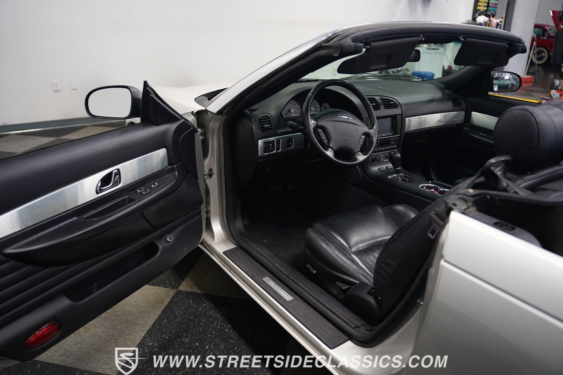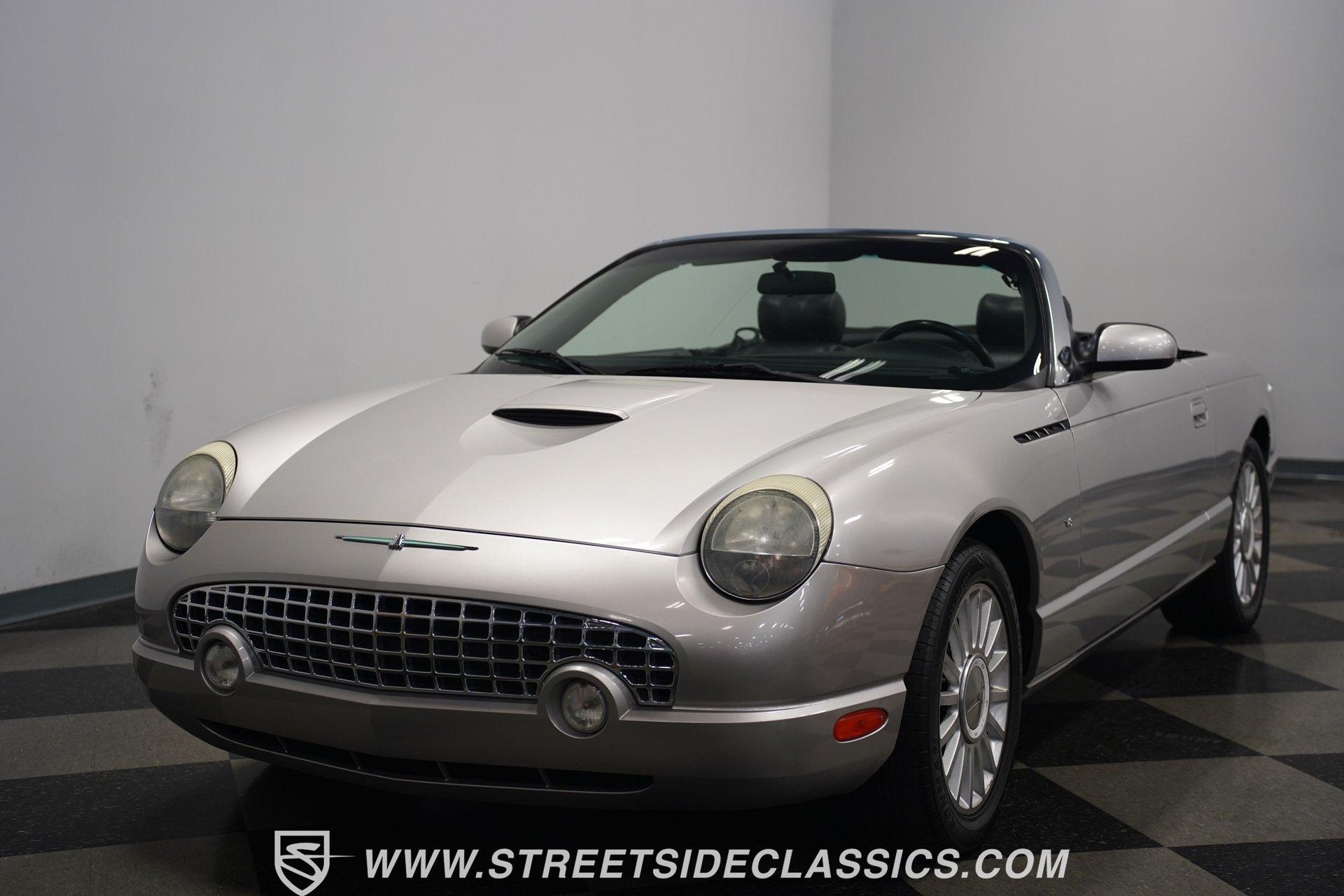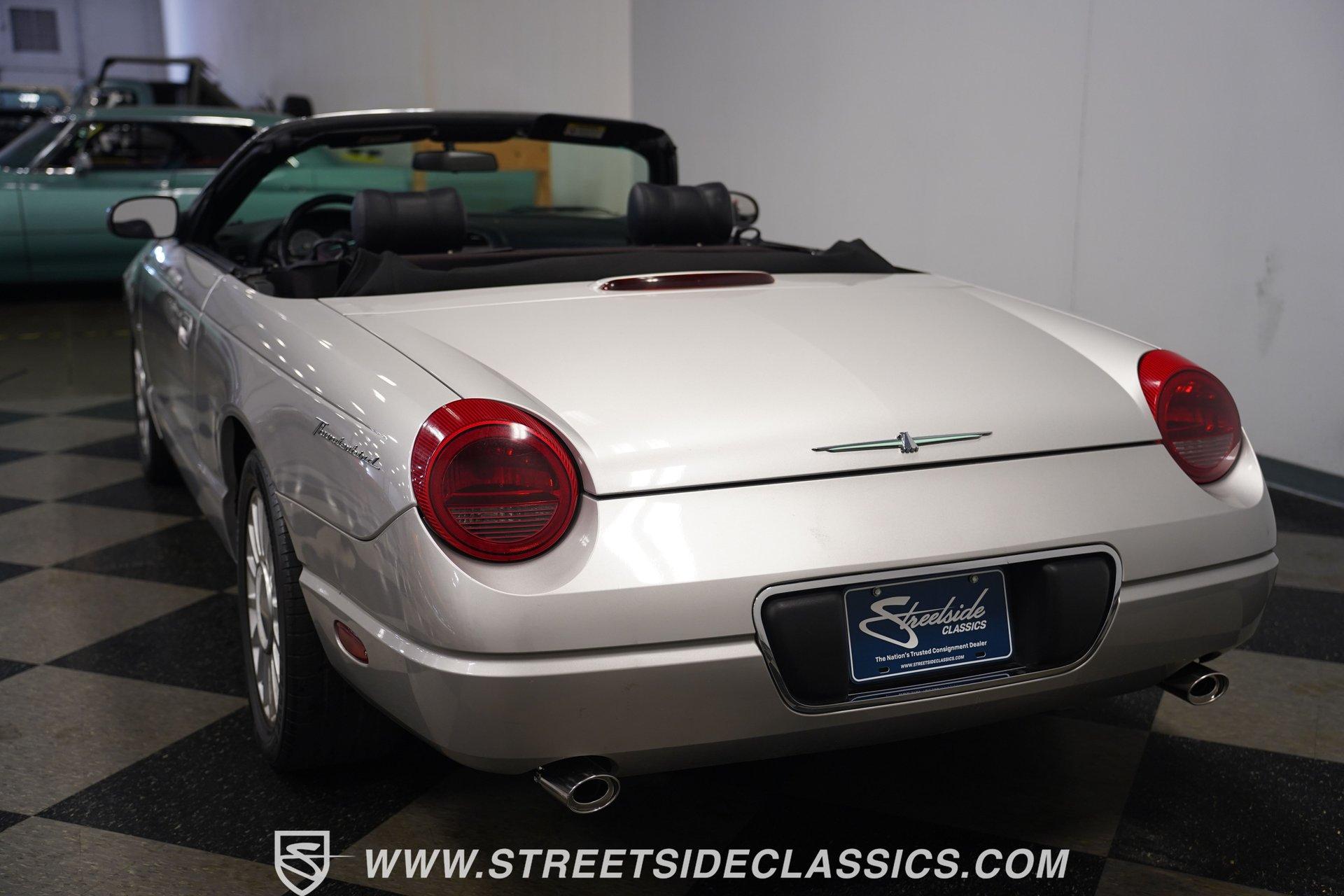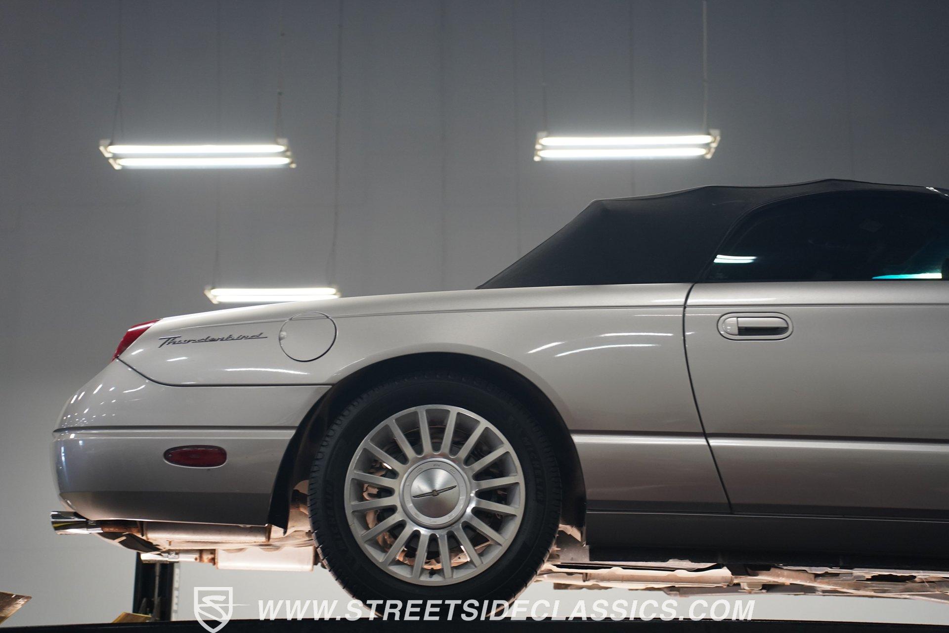 Retro styling meets modern sophistication with this 2004 Ford Thunderbird painted factory-original Silver and complemented by sharp black details. Smooth, flowing curves run front to back, highlighted by the crisp black cloth convertible top featuring a glass rear window. Factory chrome grille accents, bright emblems, dual mirrors, and subtle chrome exhaust tips keep it tastefully detailed. Factory 17-inch alloy wheels with sporty 235/50ZR17 tires fill the fender wells, giving the Thunderbird its confident stance. Inside, black vinyl bucket seats provide understated comfort and a timeless feel, perfectly matched by clean, coordinated door panels. The center console features a sporty shifter that's comfortably within reach. Entertainment is added with an aftermarket JVC touchscreen AM/FM/AUX stereo unit. Easy cruising is made even better with power steering, heated seats, power mirrors, and side airbags, creating an environment that's both relaxing and functional whether running errands or taking longer weekend drives. Power arrives courtesy of the factory-installed 3.9L V8 engine, mated to a smooth-shifting 5-speed automatic transmission with select-shift capability for manual control. Factory dual exhaust pipes exit neatly out back, delivering a subtle yet refined exhaust note. Factory-equipped power steering keeps handling relaxed, while four-wheel power disc brakes provide solid stopping power. All mechanical components remain stock, providing the right mix of effortless cruising, predictable handling, and reliable V8 performance. HIGHLIGHTS: 3.9L V8 Engine 5-Speed Automatic Transmission w/ Select-Shift Electronic Fuel Injection Power Steering 4-Wheel Power Disc Brakes Dual Exhaust Factory Silver Paint Black Cloth Convertible Top w/ Glass Rear Window 17" Factory Wheels, 235/50ZR17 Tires Chrome Grille Accents Factory Thunderbird Emblems Dual Side Mirrors Factory-Tinted Glass Chrome Exhaust Tips Black Interior w/ Bucket Seats Console Shifter Aftermarket JVC AM/FM/AUX Touchscreen Stereo Power Mirrors Heated Seats Side Airbags Clean styling, comfort-focused interior features, and reliable V8 power come together naturally in the 2004 Ford Thunderbird. Ready to cruise comfortably through town or stretch out on longer drives, this Thunderbird offers the style and easygoing confidence that make it an ideal convertible to own and enjoy. Call today!