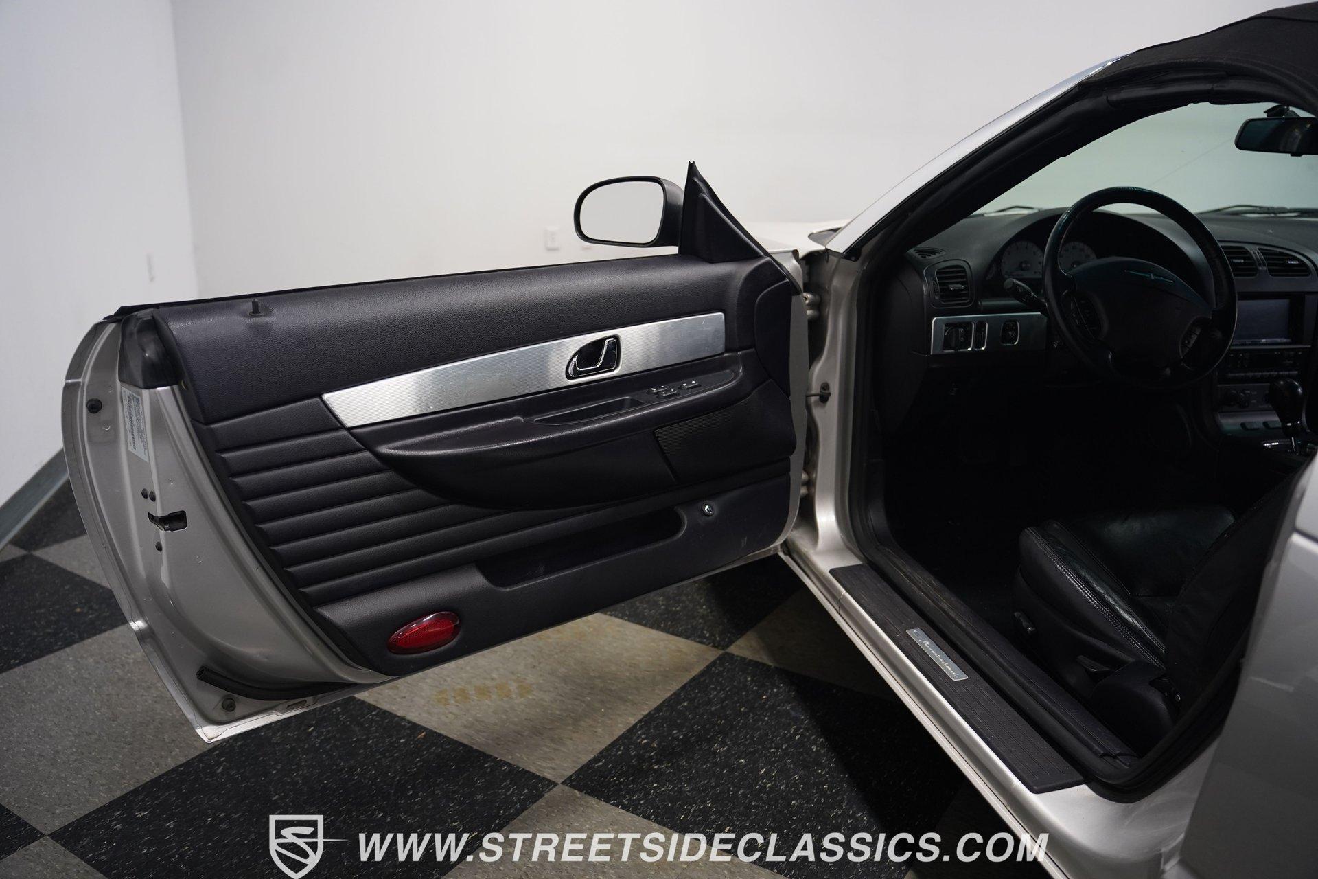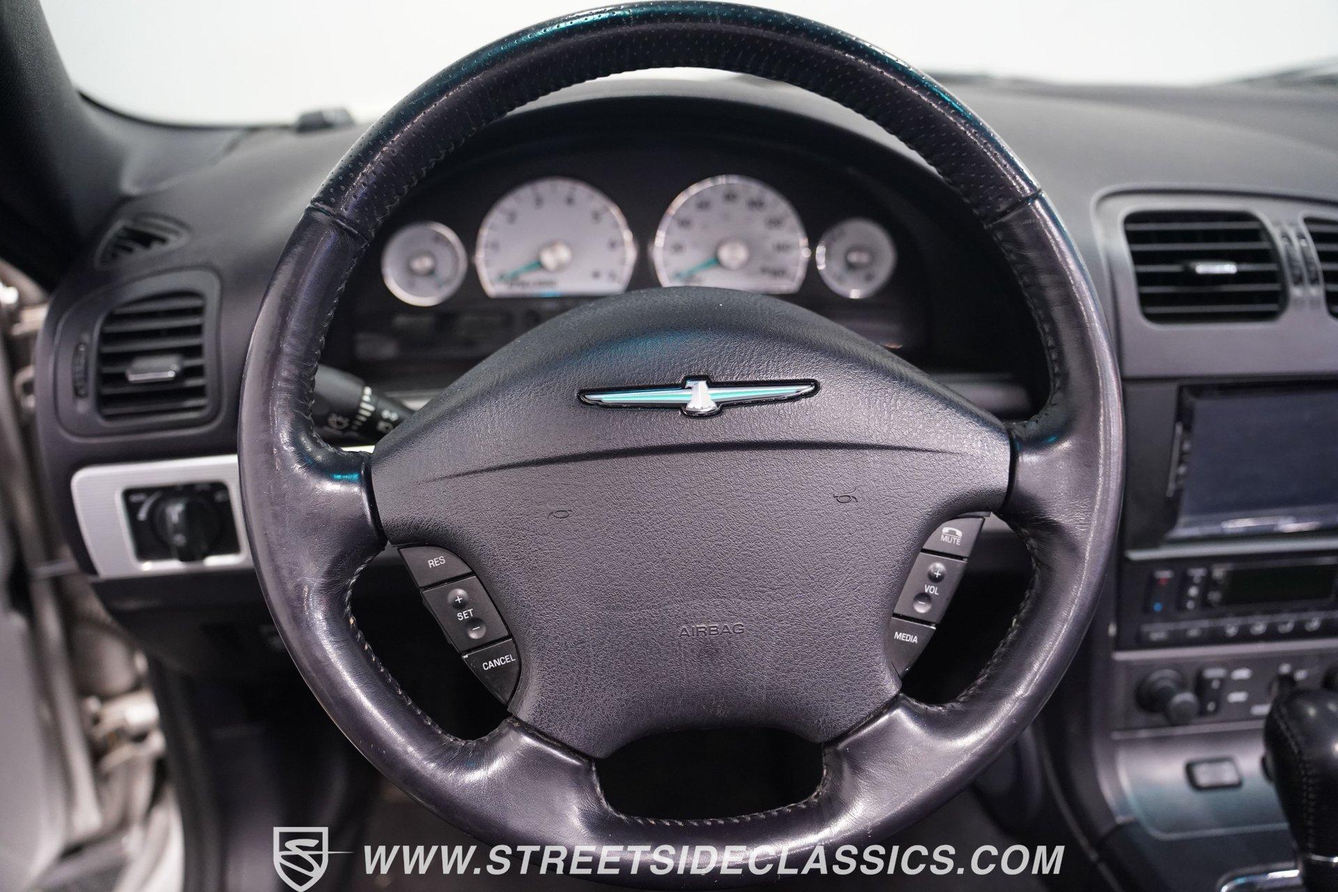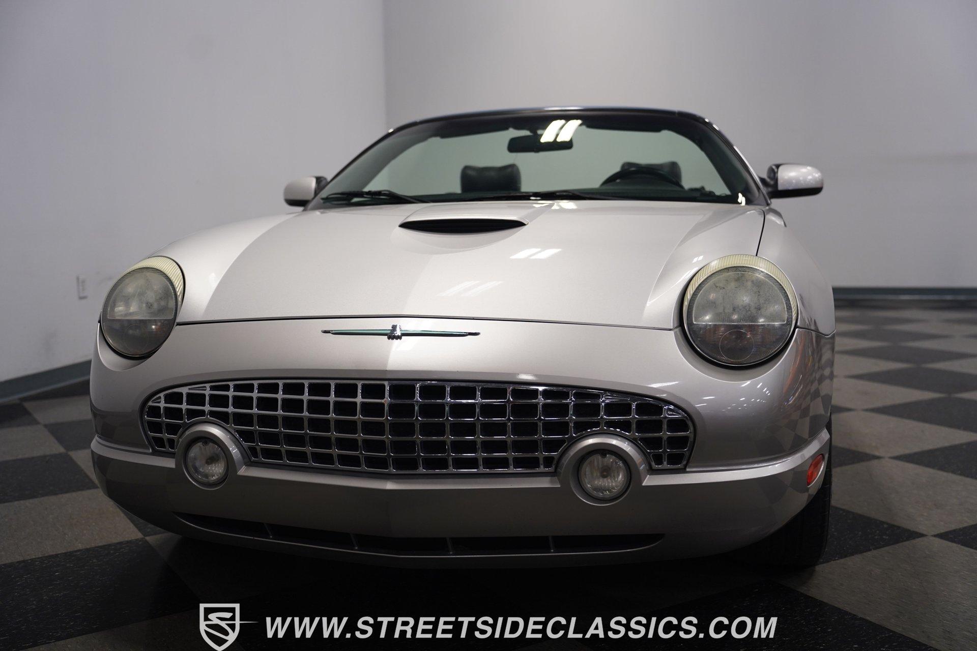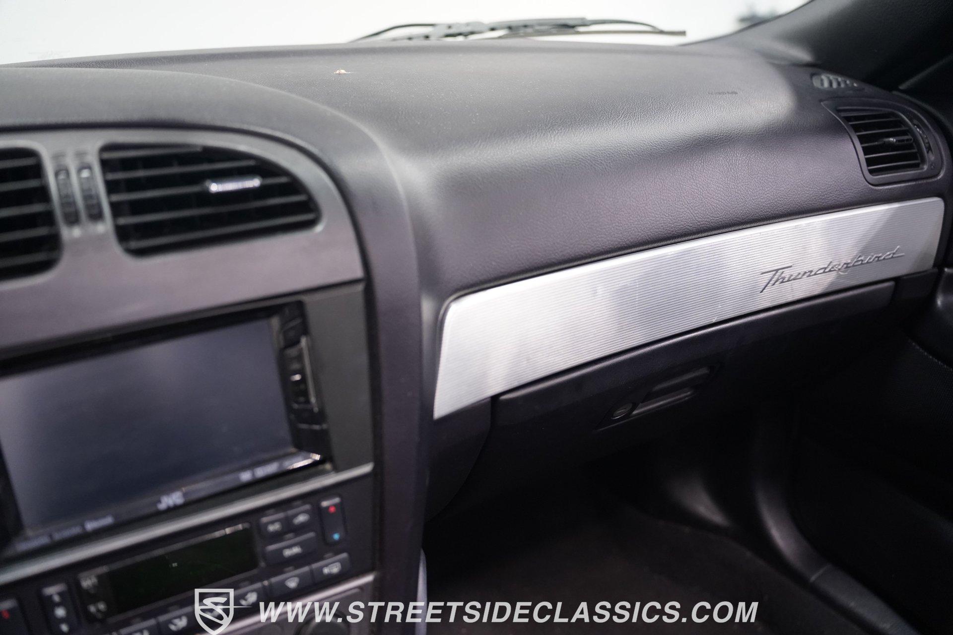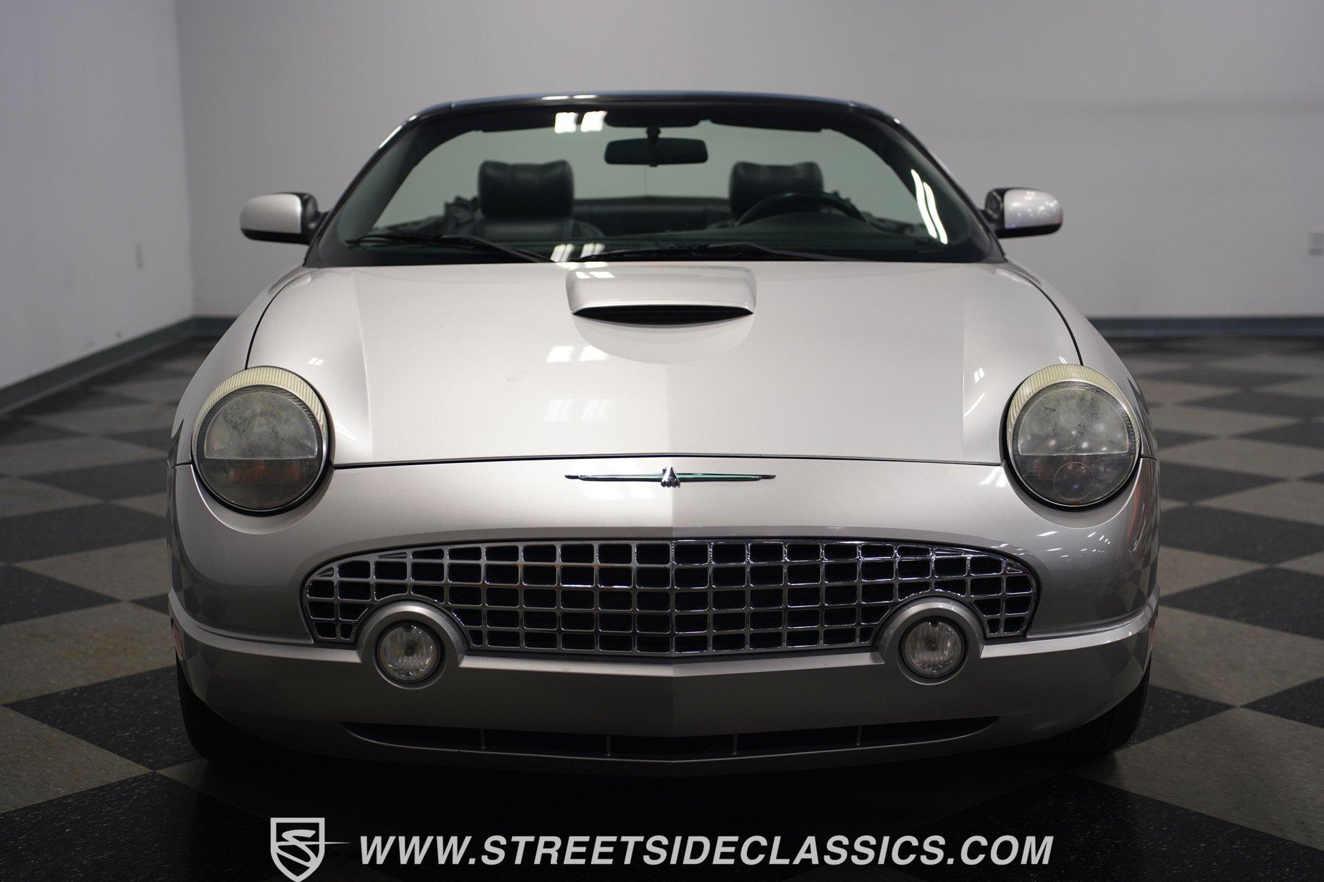 Retro styling meets modern sophistication with this 2004 Ford Thunderbird painted factory-original Silver and complemented by sharp black details. Smooth, flowing curves run front to back, highlighted by the crisp black cloth convertible top featuring a glass rear window. Factory chrome grille accents, bright emblems, dual mirrors, and subtle chrome exhaust tips keep it tastefully detailed. Factory 17-inch alloy wheels with sporty 235/50ZR17 tires fill the fender wells, giving the Thunderbird its confident stance. Inside, black vinyl bucket seats provide understated comfort and a timeless feel, perfectly matched by clean, coordinated door panels. The center console features a sporty shifter that's comfortably within reach. Entertainment is added with an aftermarket JVC touchscreen AM/FM/AUX stereo unit. Easy cruising is made even better with power steering, heated seats, power mirrors, and side airbags, creating an environment that's both relaxing and functional whether running errands or taking longer weekend drives. Power arrives courtesy of the factory-installed 3.9L V8 engine, mated to a smooth-shifting 5-speed automatic transmission with select-shift capability for manual control. Factory dual exhaust pipes exit neatly out back, delivering a subtle yet refined exhaust note. Factory-equipped power steering keeps handling relaxed, while four-wheel power disc brakes provide solid stopping power. All mechanical components remain stock, providing the right mix of effortless cruising, predictable handling, and reliable V8 performance. HIGHLIGHTS: 3.9L V8 Engine 5-Speed Automatic Transmission w/ Select-Shift Electronic Fuel Injection Power Steering 4-Wheel Power Disc Brakes Dual Exhaust Factory Silver Paint Black Cloth Convertible Top w/ Glass Rear Window 17" Factory Wheels, 235/50ZR17 Tires Chrome Grille Accents Factory Thunderbird Emblems Dual Side Mirrors Factory-Tinted Glass Chrome Exhaust Tips Black Interior w/ Bucket Seats Console Shifter Aftermarket JVC AM/FM/AUX Touchscreen Stereo Power Mirrors Heated Seats Side Airbags Clean styling, comfort-focused interior features, and reliable V8 power come together naturally in the 2004 Ford Thunderbird. Ready to cruise comfortably through town or stretch out on longer drives, this Thunderbird offers the style and easygoing confidence that make it an ideal convertible to own and enjoy. Call today!