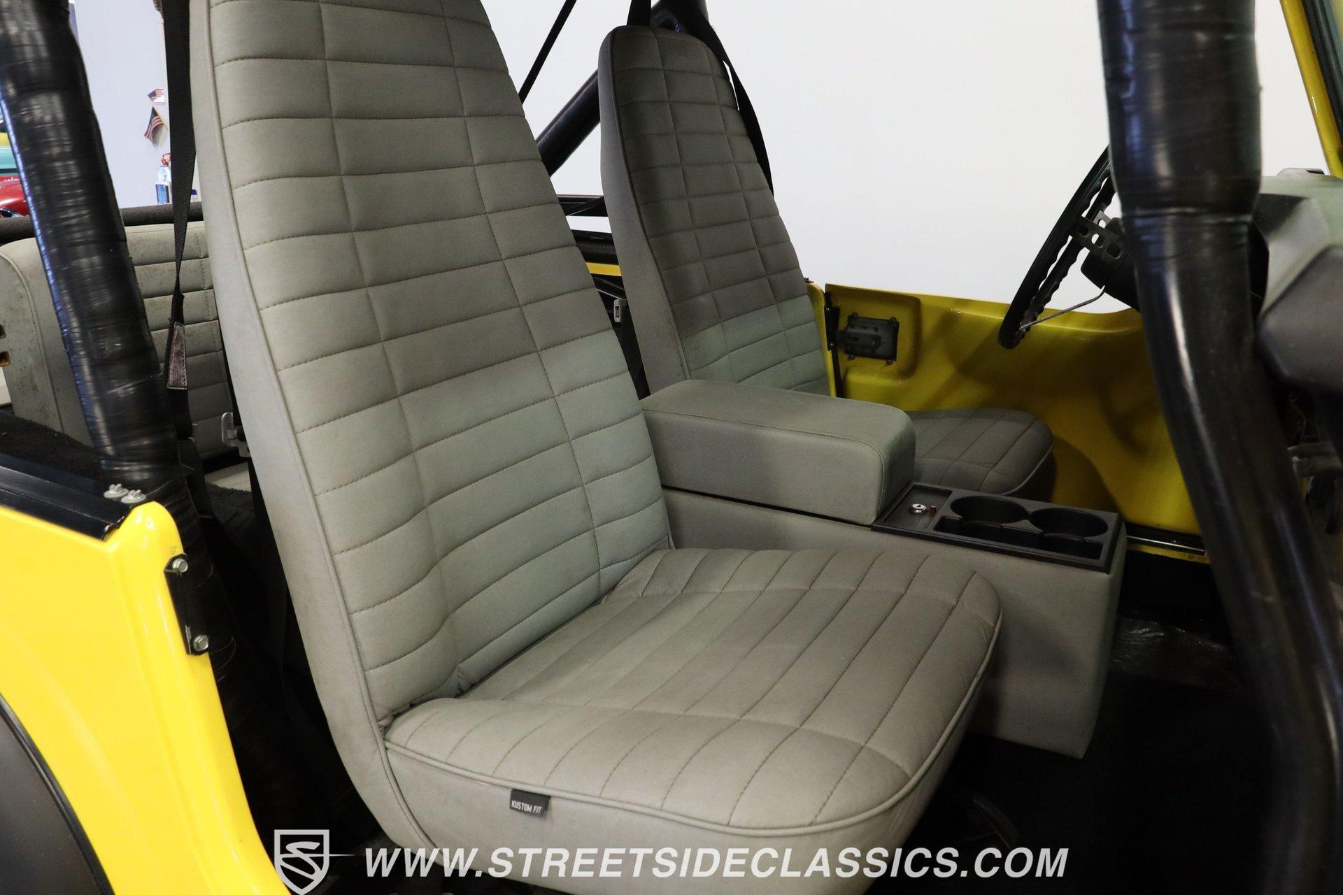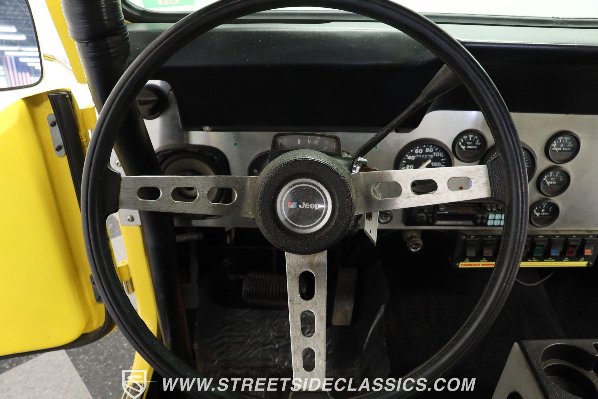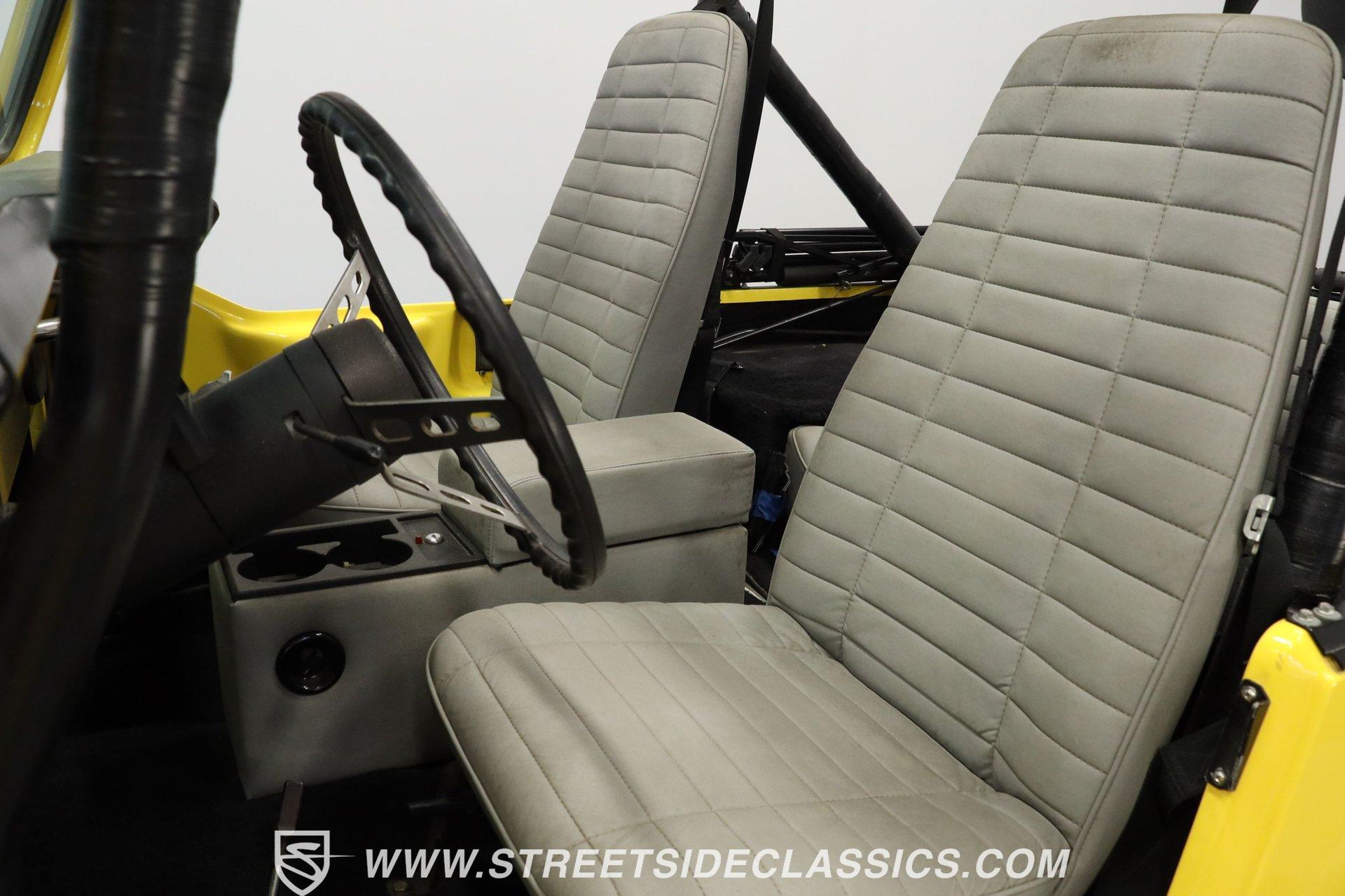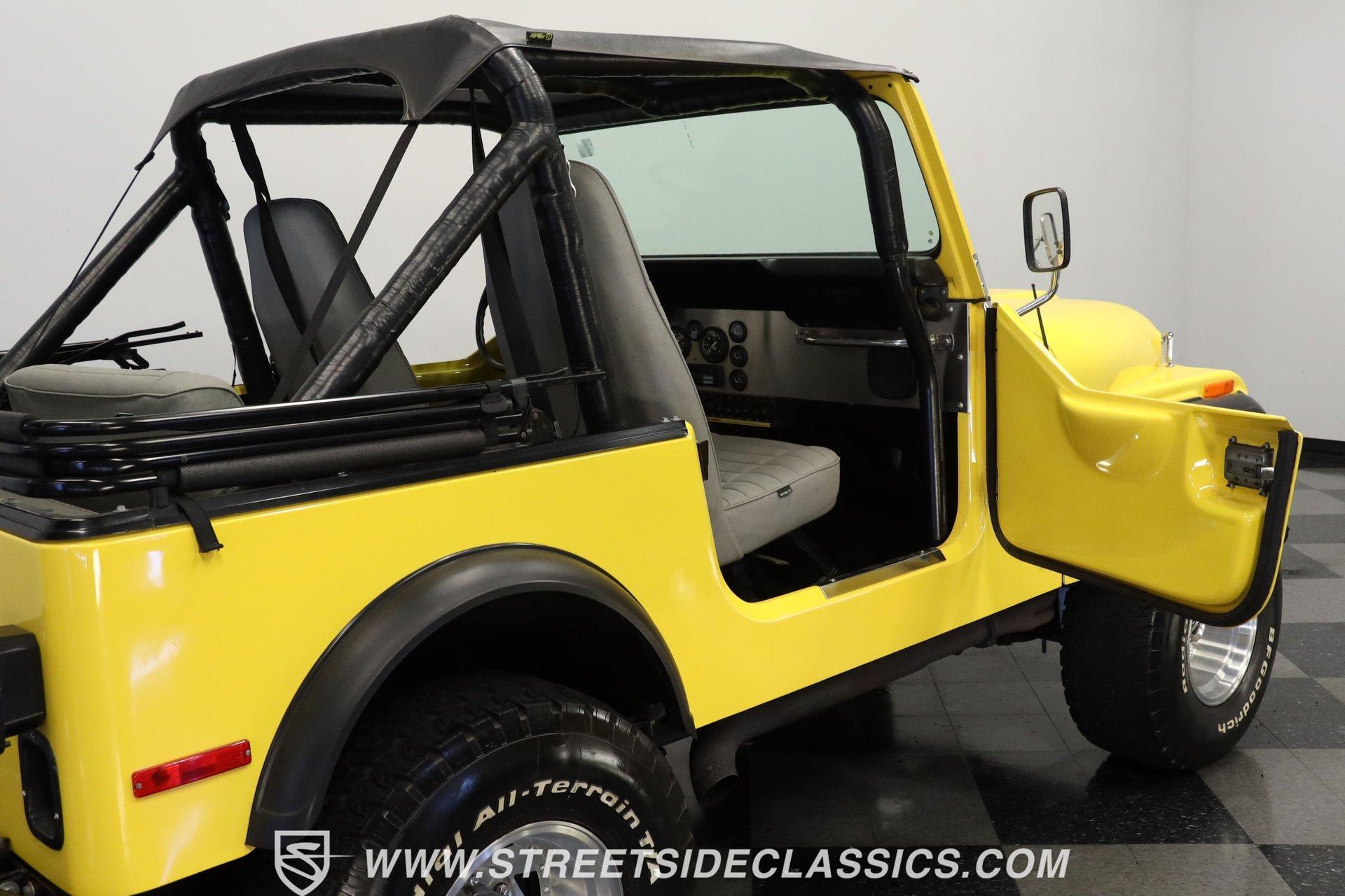 5084-TPA 1976 JEEP CJ7 Rugged yellow fiberglass panels showcase American exploration at its finest on this 1976 Jeep CJ7, built for conquering wilderness trails and mountain passes. The vibrant yellow exterior captures the adventurous spirit of backcountry exploration while black plastic fender flares frame massive 33x12.50R15LT tires mounted on 15" ARE slotted alloy wheels. Off-road capability extends with heavy-duty bumpers while a black soft top adds all-weather versatility. The tilt-back hood provides easy access while the entire fiberglass body construction offers lightweight durability for tackling rough terrain. Gray all-weather seat fabric adorns the interior, creating a functional space for outdoor adventures. The dash features a clean pad with upgraded gauges and switches for monitoring trail conditions, while the small dash speakers connect to the cassette receiver for wilderness soundtrack options. A matching padded center console complements the black carpet that maintains its deep color despite outdoor use. The full roll bar with padding provides crucial protection during difficult trails, while front seatbelts secure passengers during steep ascents and descents. Powering through mountain trails comes courtesy of a 360 V8 engine paired with a TH400 3-speed automatic transmission for effortless crawling over obstacles. The engine bay presents cleanly with aluminum intake and heads, QFT 4-barrel carburetor, and MSD ignition for reliable starting at any elevation. Power steering and brakes with front discs provide confident control when navigating difficult terrain. Headers connect to dual side pipes, producing an exhaust note that echoes through canyons and valleys as this CJ7 conquers the wilderness. HIGHLIGHTS: 360 V8 Engine TH400 3-Speed Automatic Transmission QFT 4-Barrel Carburetor Aluminum Intake & Heads MSD Ignition Headers with Dual Side Pipes Power Steering Power Front Disc Brakes 4X4 Drivetrain Yellow Fiberglass Body Black Soft Top Heavy-Duty Bumpers Black Plastic Fender Flares 15" ARE Slotted Alloy Wheels with 33x12.50R15LT Tires Tilt-Back Hood Gray All-Weather Seat Fabric Black Carpet Padded Center Console Upgraded Gauges & Switches Cassette Receiver with Dash Speakers Full Roll Bar (Padded) Whether conquering dusty desert trails or fording mountain streams, this 1976 Jeep CJ7 delivers classic American 4x4 capability with V8 power and automatic convenience. The iconic CJ7 design combines with thoughtful upgrades like aluminum heads and fiberglass construction to create a genuine off-road vehicle ready for your next wilderness expedition. Call today! We can assist you with getting an Extended Vehicle Service Plan from Freedom Warranty, which provides comprehensive coverage that can save thousands of dollars on unexpected repairs. Inquire for more details and pricing!