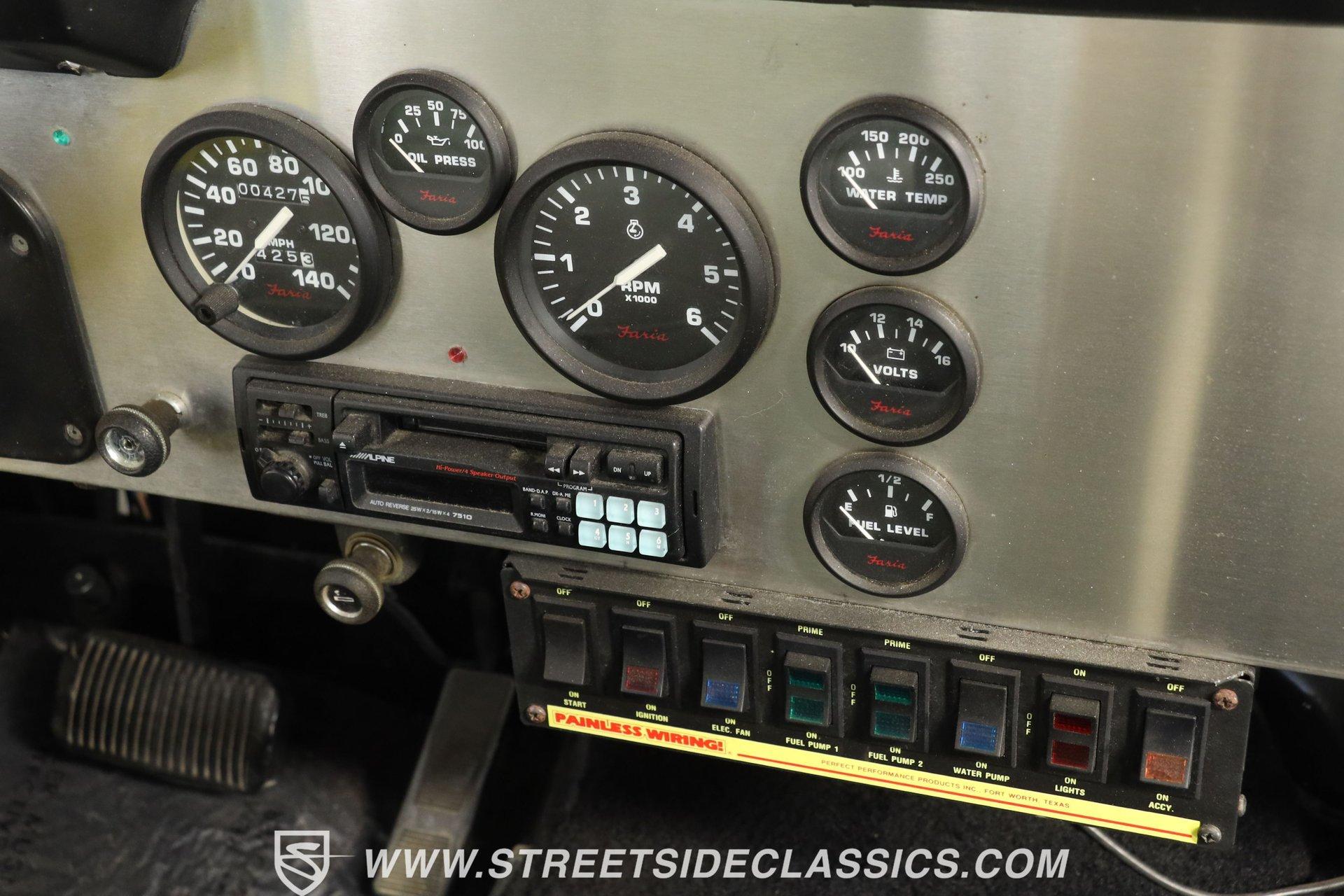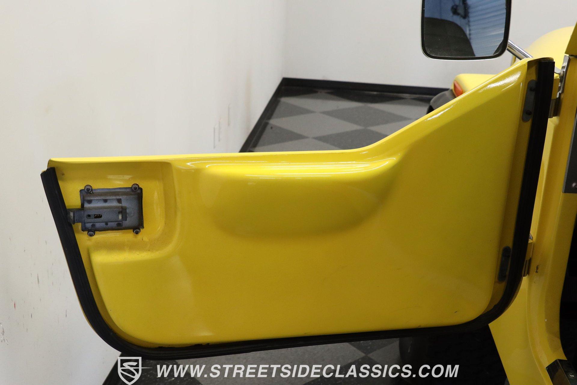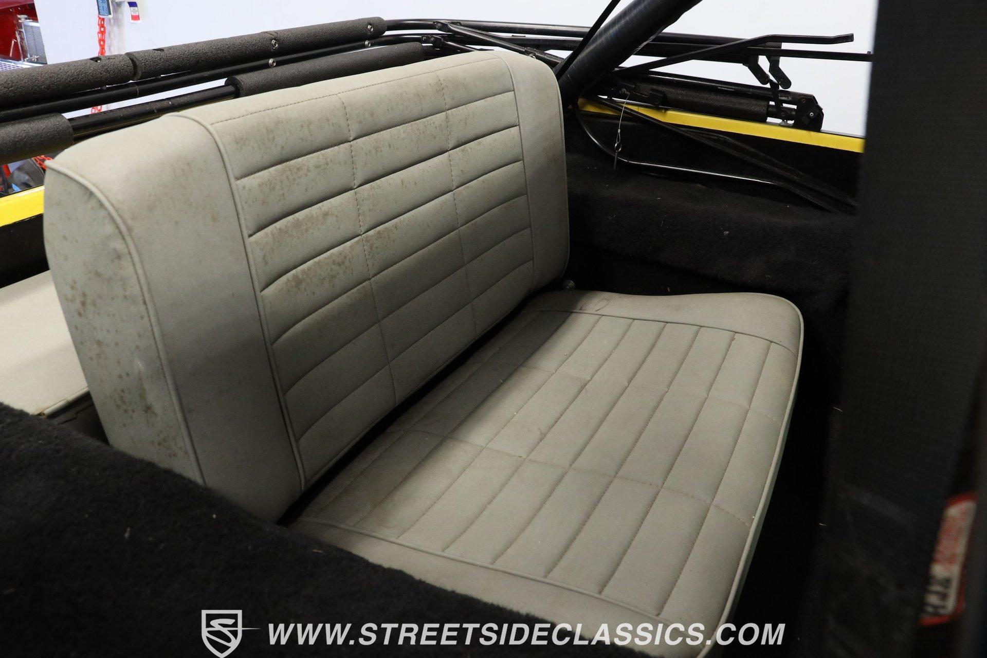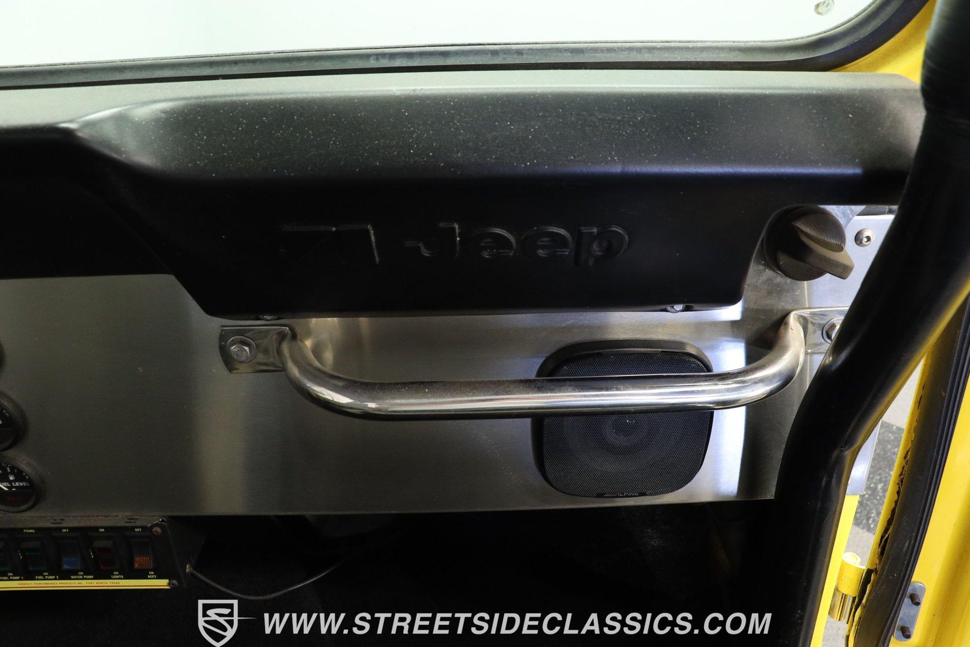 5084-TPA 1976 JEEP CJ7 Rugged yellow fiberglass panels showcase American exploration at its finest on this 1976 Jeep CJ7, built for conquering wilderness trails and mountain passes. The vibrant yellow exterior captures the adventurous spirit of backcountry exploration while black plastic fender flares frame massive 33x12.50R15LT tires mounted on 15" ARE slotted alloy wheels. Off-road capability extends with heavy-duty bumpers while a black soft top adds all-weather versatility. The tilt-back hood provides easy access while the entire fiberglass body construction offers lightweight durability for tackling rough terrain. Gray all-weather seat fabric adorns the interior, creating a functional space for outdoor adventures. The dash features a clean pad with upgraded gauges and switches for monitoring trail conditions, while the small dash speakers connect to the cassette receiver for wilderness soundtrack options. A matching padded center console complements the black carpet that maintains its deep color despite outdoor use. The full roll bar with padding provides crucial protection during difficult trails, while front seatbelts secure passengers during steep ascents and descents. Powering through mountain trails comes courtesy of a 360 V8 engine paired with a TH400 3-speed automatic transmission for effortless crawling over obstacles. The engine bay presents cleanly with aluminum intake and heads, QFT 4-barrel carburetor, and MSD ignition for reliable starting at any elevation. Power steering and brakes with front discs provide confident control when navigating difficult terrain. Headers connect to dual side pipes, producing an exhaust note that echoes through canyons and valleys as this CJ7 conquers the wilderness. HIGHLIGHTS: 360 V8 Engine TH400 3-Speed Automatic Transmission QFT 4-Barrel Carburetor Aluminum Intake & Heads MSD Ignition Headers with Dual Side Pipes Power Steering Power Front Disc Brakes 4X4 Drivetrain Yellow Fiberglass Body Black Soft Top Heavy-Duty Bumpers Black Plastic Fender Flares 15" ARE Slotted Alloy Wheels with 33x12.50R15LT Tires Tilt-Back Hood Gray All-Weather Seat Fabric Black Carpet Padded Center Console Upgraded Gauges & Switches Cassette Receiver with Dash Speakers Full Roll Bar (Padded) Whether conquering dusty desert trails or fording mountain streams, this 1976 Jeep CJ7 delivers classic American 4x4 capability with V8 power and automatic convenience. The iconic CJ7 design combines with thoughtful upgrades like aluminum heads and fiberglass construction to create a genuine off-road vehicle ready for your next wilderness expedition. Call today! We can assist you with getting an Extended Vehicle Service Plan from Freedom Warranty, which provides comprehensive coverage that can save thousands of dollars on unexpected repairs. Inquire for more details and pricing!