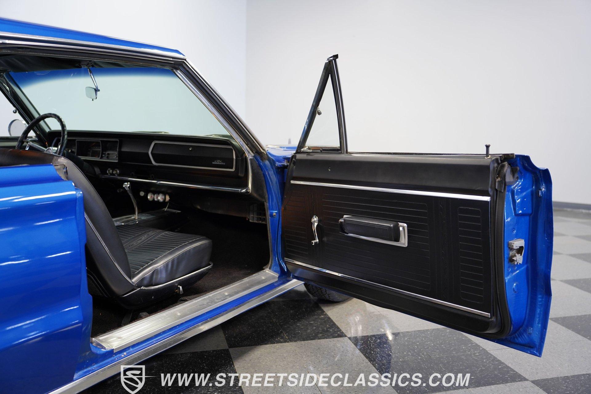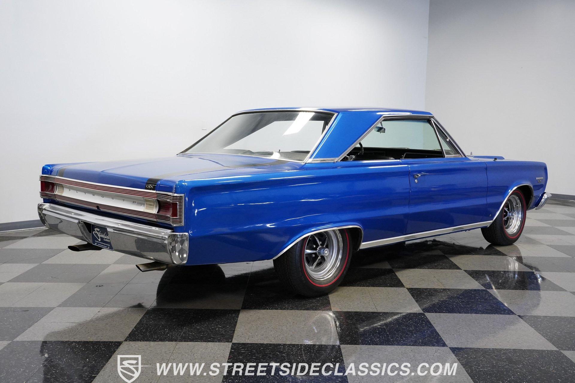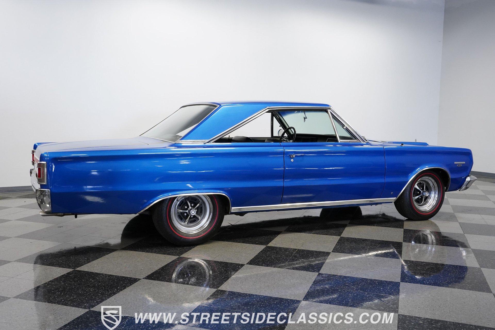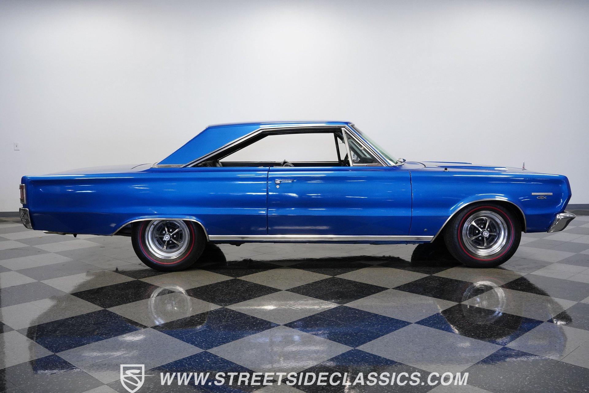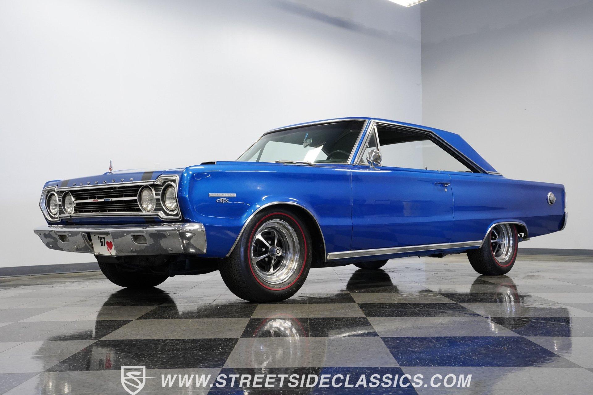 Born in 1967 as the inaugural year of Plymouth's performance flagship, this GTX shows off its blue finish with authority. The two-door design features clean, uncluttered lines that allow the color to make its statement without unnecessary distractions. Chrome accents around the windows and bumpers provide perfect contrast against the blue background. The factory-styled 15-inch wheels wear 225/70R15 tires and give this muscle machine its planted stance. GTX badging on the sides and rear announce what you're looking at - pure American muscle from Plymouth's golden age. Black leather creates a bold contrast inside this GTX. The bucket seats offer lateral support during quick cornering while the console-mounted shifter falls naturally to hand. The dash presents information clearly through the gauge cluster with its 5-digit odometer. Door panels display a distinctive floral pattern that adds visual interest without being flashy. The center console adds both function and style to the cabin layout. Black carpeting covers the floor area while the headliner remains properly attached above. Every detail works together in a unified black color scheme that lets you focus on the driving. A massive 440 cubic inch V8 gives this GTX its go-fast credentials. Cast on October 25, 1966, this period-correct big block breathes through a single four-barrel carburetor mounted on an Edelbrock Performer intake manifold. The engine bay shows off polished valve covers and a 440 Super Commando air cleaner for improved airflow. An A727 TorqueFlite 3-speed automatic transmission handles the power without fuss. Dual exhaust with aftermarket mufflers produces the appropriate V8 sound. Power steering combines with power brakes for easy control, while torsion bars with a sway bar manage the handling dynamics. HIGHLIGHTS: 440 V8 Engine A727 TorqueFlite 3-Speed Automatic Transmission Single 4-Barrel Carburetor Edelbrock Performer Intake Manifold 440 Super Commander Air Cleaner Dual Exhaust with Aftermarket Mufflers Power Drum Brakes 8 3/4 Rear Axle Torque-arm Front Suspension Torsion Bar Rear Suspension with Sway Bar Blue Exterior 15" Wheels in 225/70R15 Tires Black Leather Bucket Seats with Console Power Steering 5-Digit Odometer Factory Radio in Trunk Floral Pattern Door Panels Extra Wiper Motor This 1967 Plymouth GTX offers exactly what muscle car fans want - a mighty 440 V8, easy-shifting automatic, and comfort options in a great-looking package. One drive in this blue bruiser with its black leather interior will make you understand why GTX became legendary. Call today!