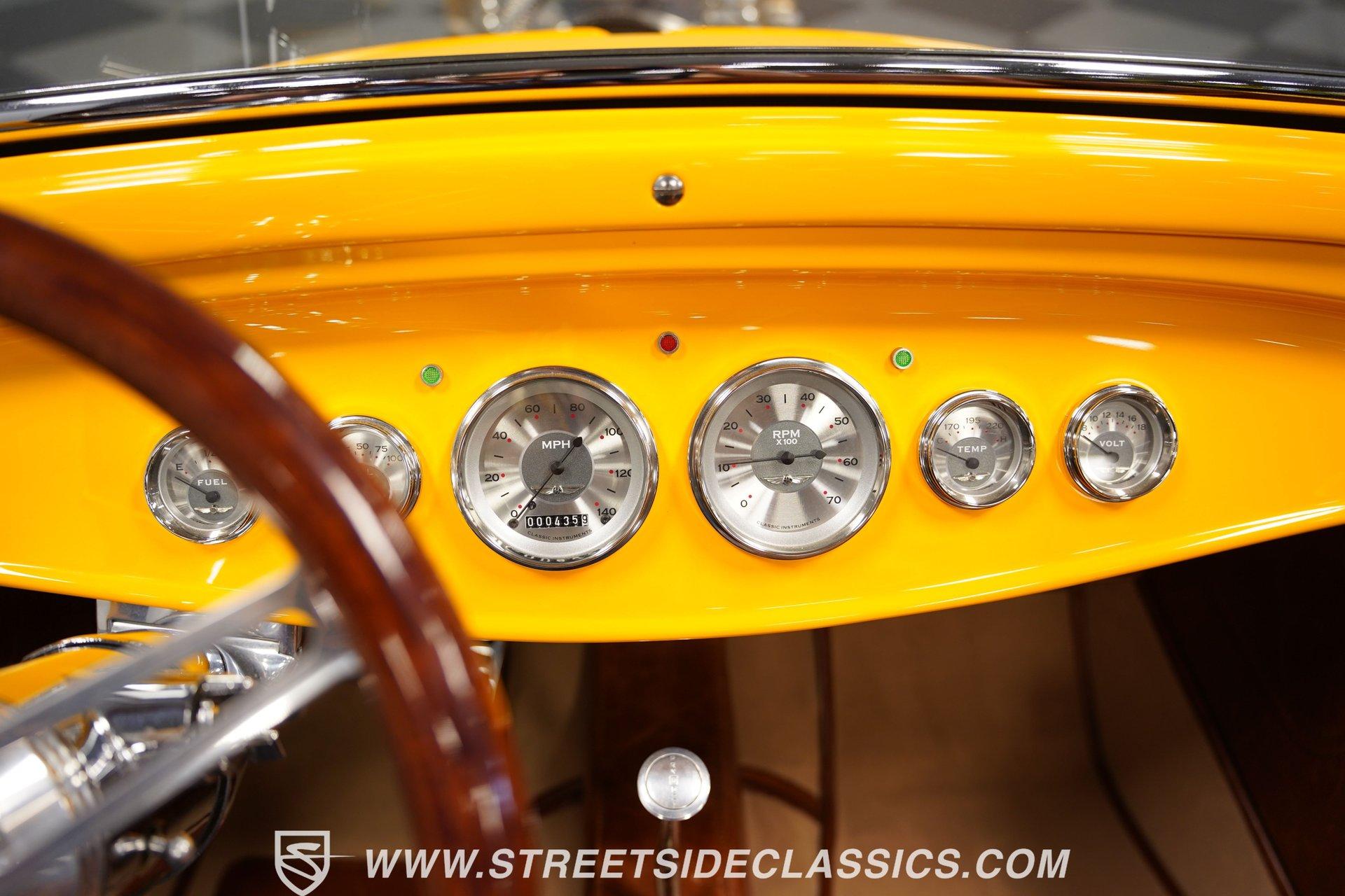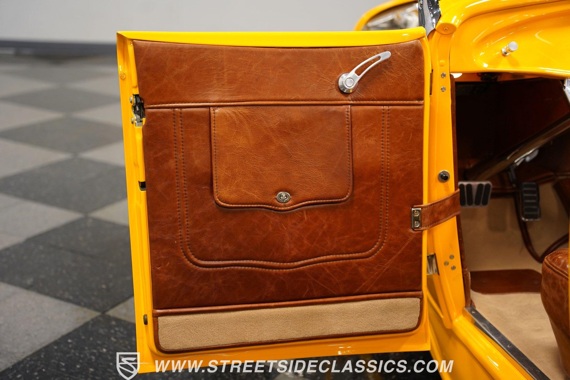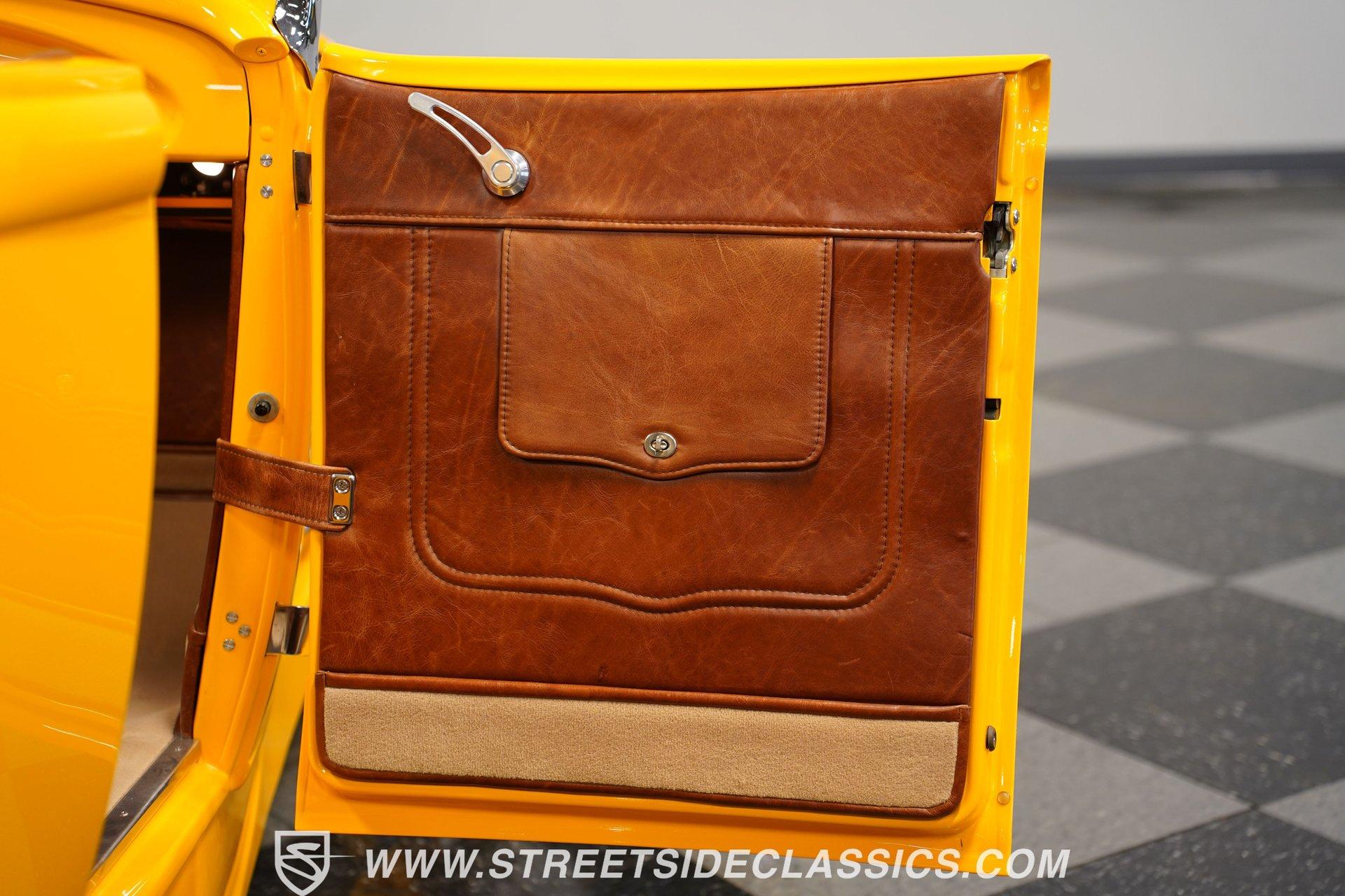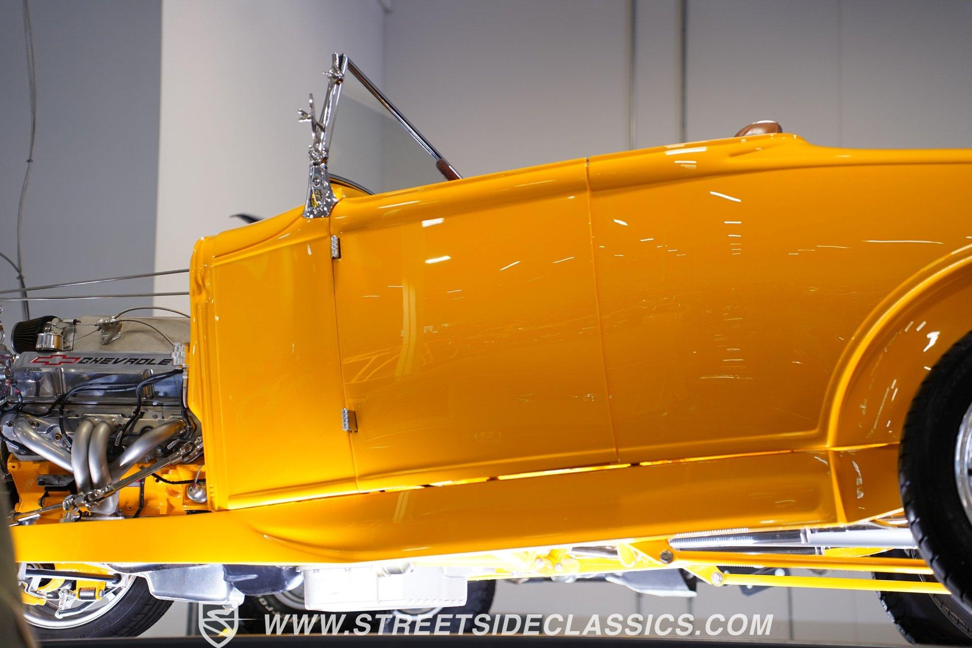 Yellow and wicked, with only 434 miles on the clock since its build, this 1930 Ford Model A Roadster fuses old-school style with modern muscle. The steel body sports a bright yellow finish that pops against the blacktop. From the custom flush-mounted gas cap to its low-slung stance, this roadster means action. The combination of 17" American Racing wheels with 205/45ZR17 front and 285/40ZR17 rear tires gives this street machine both visual punch and road-hugging grip. Saddle brown leather wraps the interior in rich luxury. The bucket seats and floor shifter create a driver-focused layout that's both comfortable and functional. Thoughtful design includes storage pockets behind the seats and in the door panels. The color-matched dash houses Classic Instrument gauges, while the chrome steering column adds flash. Quality carpets and floor mats complete the cabin. The trunk continues the same level of craftsmanship, featuring automatic lighting when opened. The powerhouse consists of a 355 V8 engine (a 350 bored .030 over) with aluminum heads and Holley EFI Stealth Ram Injection. For exhaust, blockhugger shorty headers feed into a full stainless system with MagnaFlow mufflers that produce a deep, satisfying rumble. A Monster Transmission 200R4 4-speed automatic handles gear changes while power goes to the ground through a Ford 9" rear. The suspension setup includes independent front with coilovers and a solid axle rear with 4-link and Viking double adjustable shocks. Wilwood front and rear power disc brakes provide strong stopping ability. HIGHLIGHTS: 355 V8 Engine (350 Bored .030 Over) 4-Speed Automatic Monster Transmission (200R4) Holley EFI Stealth Ram Injection Aluminum Heads Blockhugger Shorty Headers MagnaFlow Mufflers Full Stainless Exhaust Ford 9" Rear End Wilwood Power Disc Brakes Independent Front Suspension w/ Coilovers Solid Axle Rear with 4-Link and Coilovers Viking Double Adjustable Shocks Gloss Yellow Paint 17" American Racing Wheels 205/45ZR17 Front, 285/40ZR17 Rear Tires Flush Mounted Gas Cap Saddle Brown Interior with Leather Bucket Seats Floor Shifter Color-Matched Dash Classic Instrument Gauges Chrome Steering Column Door Panels with Storage Pockets Quality Carpeting and Floor Mats Finished Trunk with Automatic Lighting Car Cover Included Only 434 Miles Since Built Fast, loud, and yellow - this 1930 Ford Model A Roadster brings street-legal speed with its 355 V8 power, upgraded suspension, and Wilwood brakes. A modern hot rod with classic style that's ready for your garage and the open road. Call today!