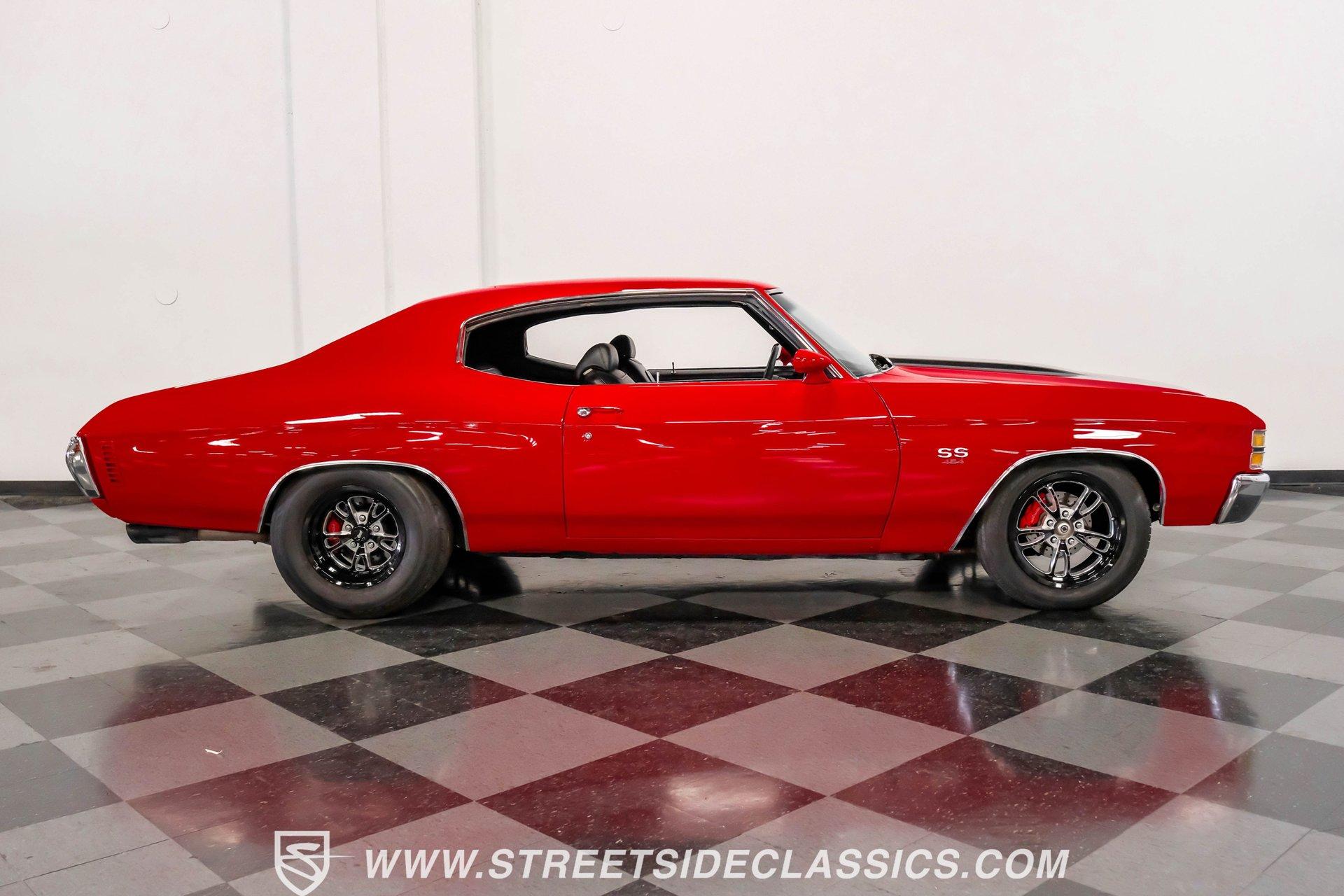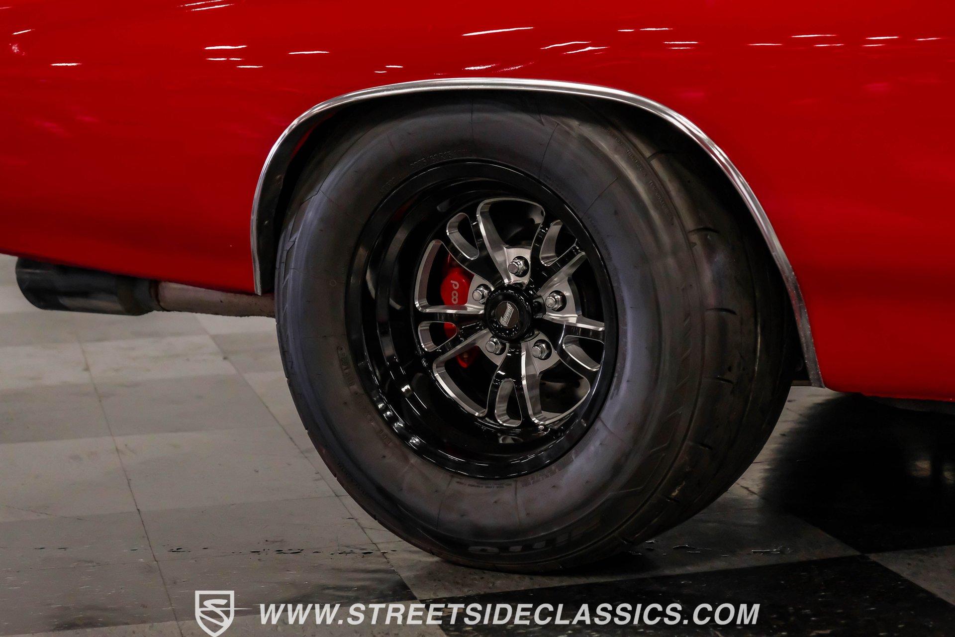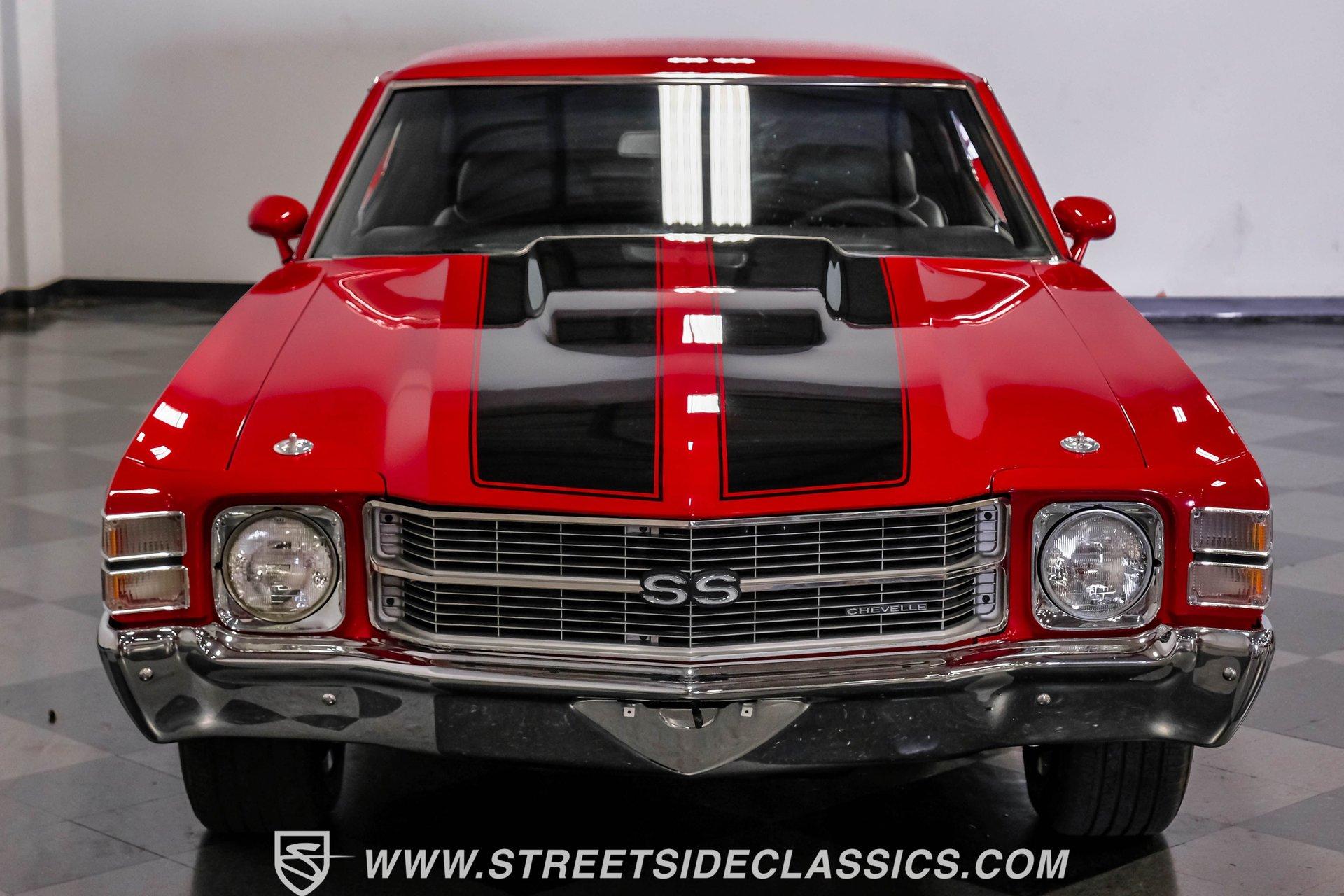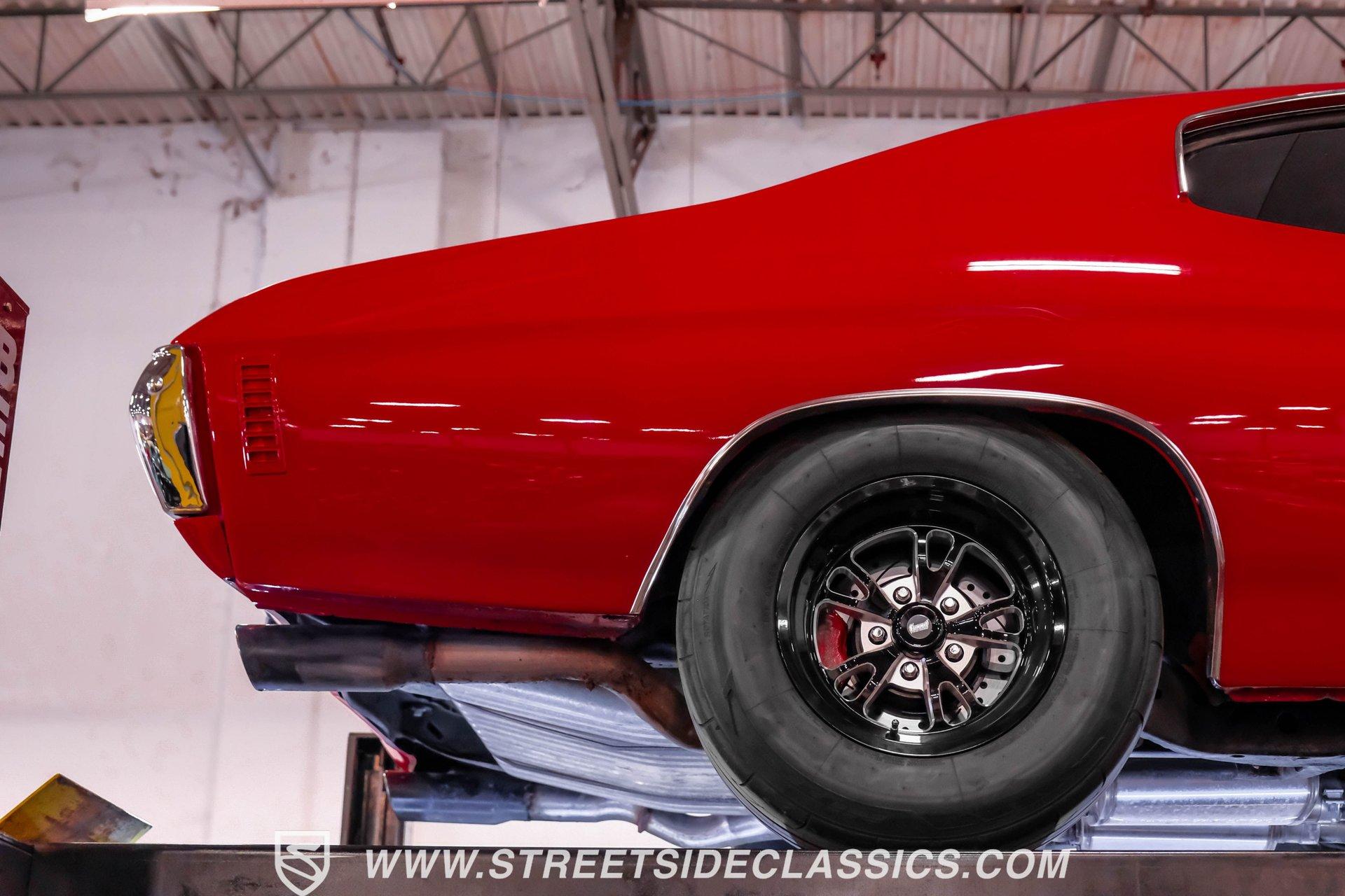 Finished in a Cranberry Red that makes every angle of this 1971 Chevrolet Chevelle SS 454 Tribute look sharp, the muscular body lines have been elevated by aggressive painted black stripes. The color combination works perfectly against the bright chrome trim and grille. A lowered stance gives this Chevelle serious muscle car credibility, sitting on a mix of 17" front and 15" rear Summit Racing wheels wrapped in 225/60R17 Roadone tires up front and 275/60R15 Nitto drag radials in the back. Tinted windows add a dark contrast against the vibrant red exterior, while hood pins complete the track-ready look. Black vinyl interior gives this Chevelle a factory-correct appearance while offering modern upgrades. The restuffed bucket seats with console maintain the period-correct muscle car feel. An upgraded JVC AM/FM/AUX/CD/MP3 unit handles the audio duties while custom Omega Kustom Instruments gauges provide clear readouts of vital engine data. The Holley Sniper EFI monitor gives the driver full control over fuel mapping. Vintage Air conditioning and heat keep the cabin comfortable, while the black carpet and headliner complete the factory appearance. The big-block 454 cubic inch V8 provides tremendous power through electronic fuel injection via a Holley Sniper system mounted on an Edelbrock aluminum intake. Aluminum Edelbrock heads with a performance camshaft maximize performance, while the engine breathes through long-tube headers connected to a dual exhaust system with an X-pipe and FlowFX mufflers for that perfect muscle car sound. A TH350 3-speed automatic transmission handles the power delivery to the 12-bolt rear end. The handling is dramatically improved with QA1 tubular A-arms, adjustable coil-overs, and sway bars front and rear. Stopping power comes from Wilwood 4-wheel disc brakes with drilled and slotted rotors. HIGHLIGHTS: 454 V8 Engine TH350 3-Speed Automatic Transmission Holley Sniper Electronic Fuel Injection Edelbrock Aluminum Heads and Intake 12-Bolt Rear End Long-Tube Headers Dual Exhaust with X-Pipe FlowFX Mufflers Wilwood 4-Wheel Disc Brakes with Drilled/Slotted Rotors QA1 Tubular A-Arms QA1 Adjustable Coil-Overs Serpentine Belt System Modern Radiator with Dual Electric Fans Cranberry Red Paint with Black Stripes 17" Front, 15" Rear Summit Racing Wheels 225/60R17 Roadone Front, 275/60R15 Nitto Rear Tires Black Interior with Bucket Seats and Console Omega Kustom Instruments Gauges JVC AM/FM/AUX/CD/MP3 Head Unit Vintage Air Conditioning and Heat Power Steering A big-block powered 1971 Chevrolet Chevelle SS 454 Tribute with modern handling and braking upgrades makes for an unbeatable combination of classic muscle car style and updated performance. The Cranberry Red paint, black stripes, and aggressive stance draw admirers while the 454 V8 produces the power to back up those looks. Call today!