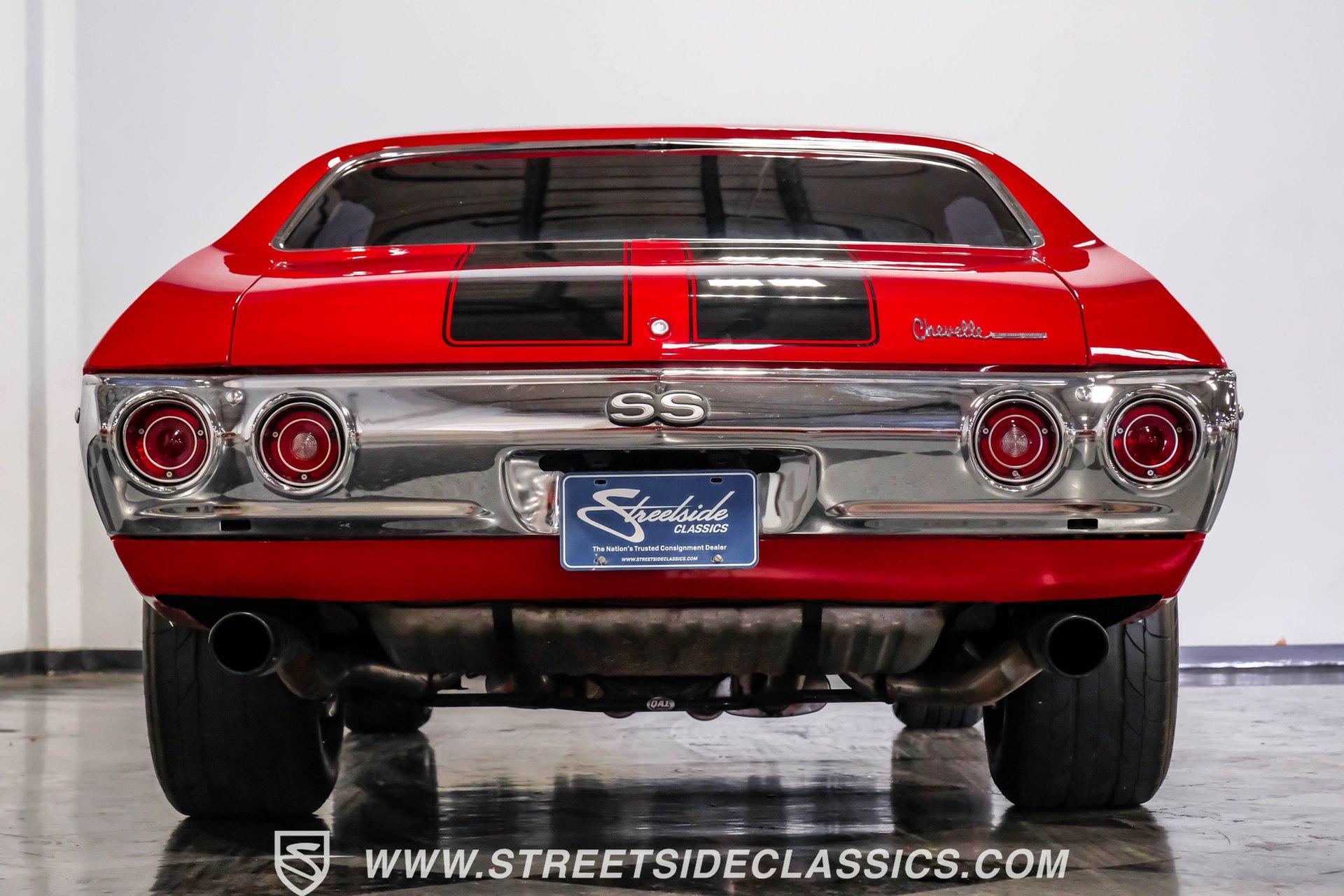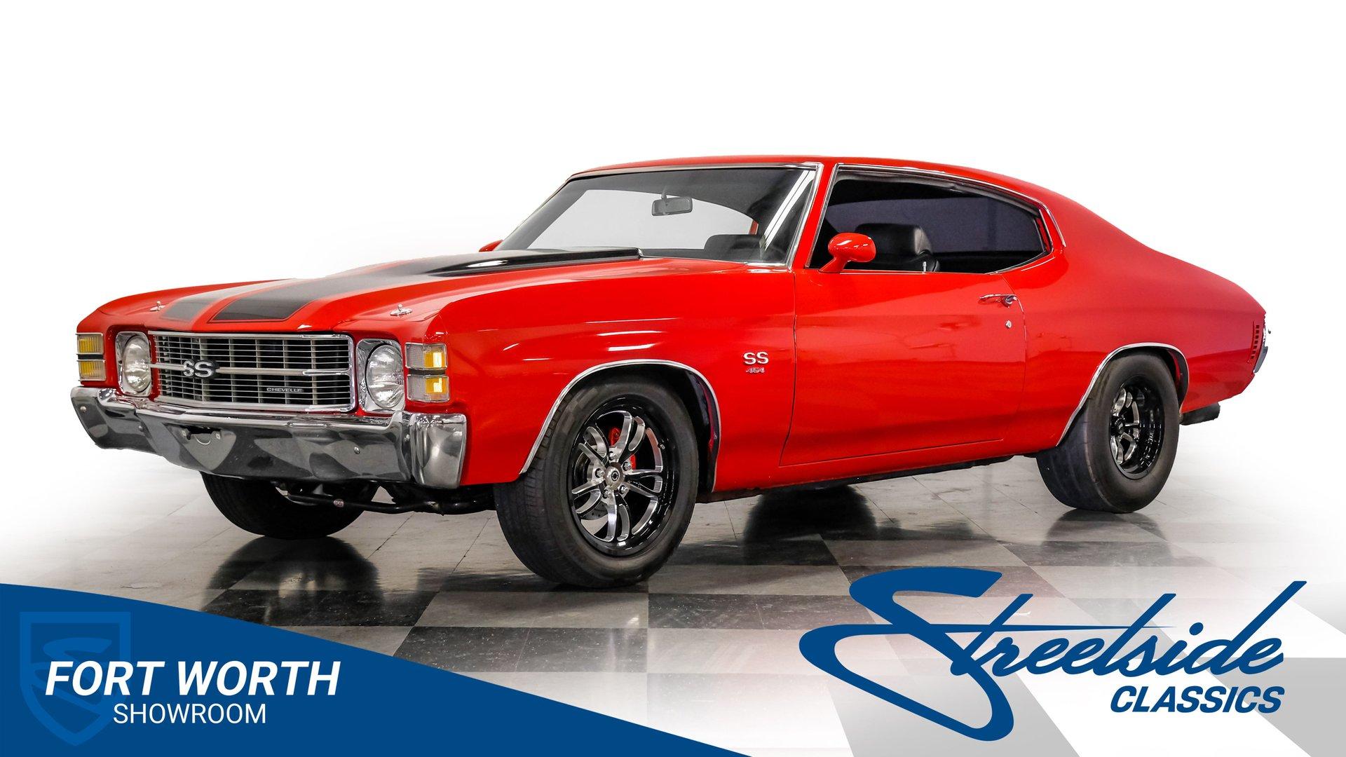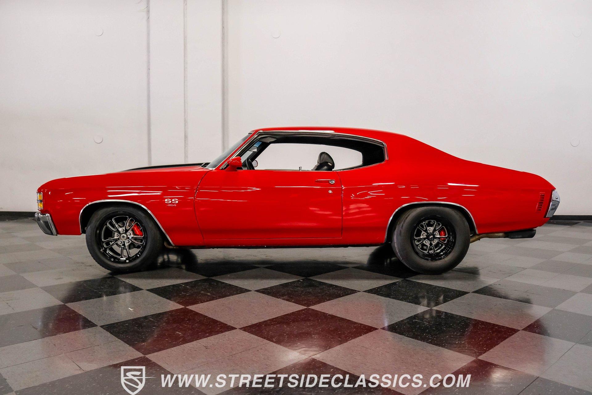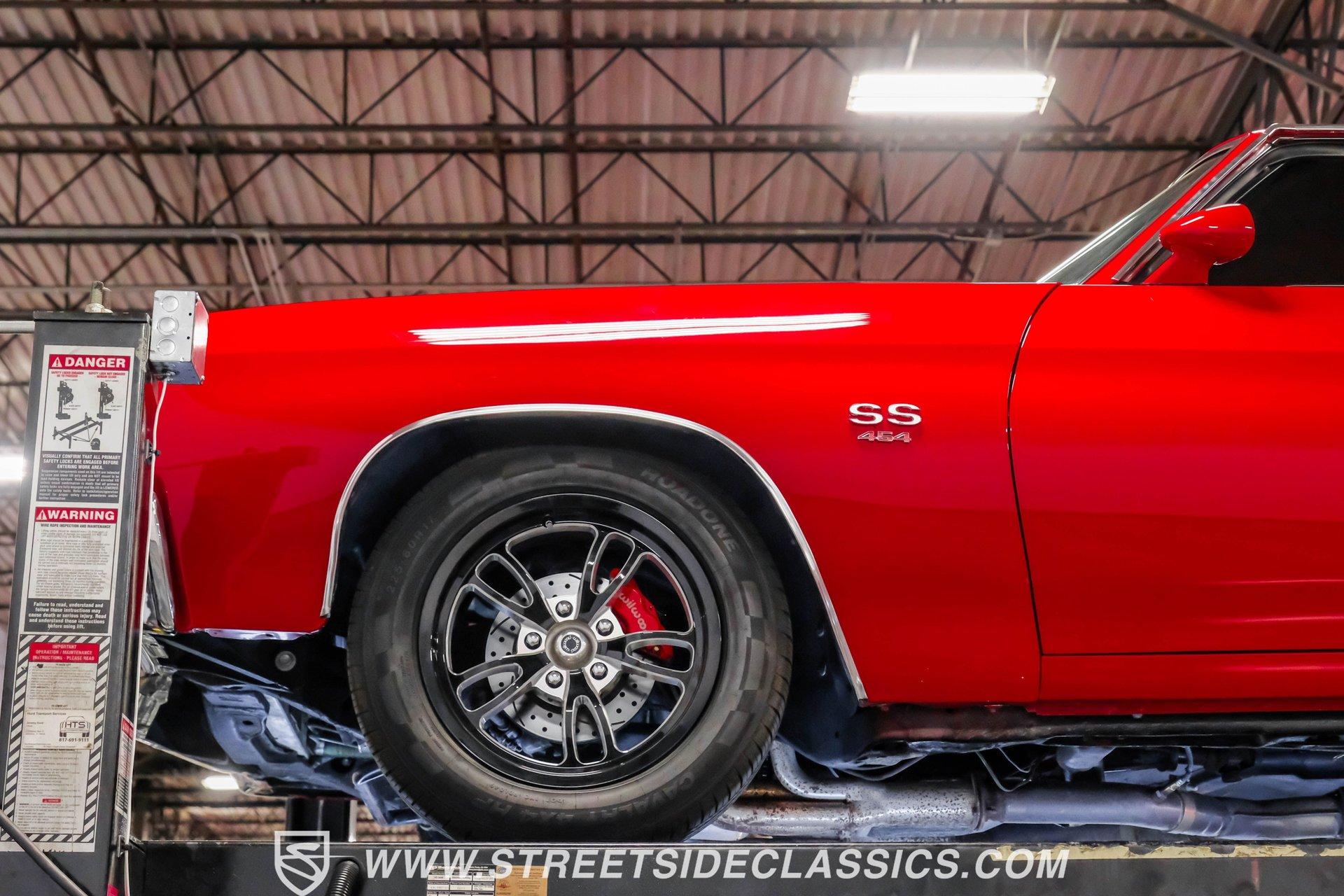Finished in a Cranberry Red that makes every angle of this 1971 Chevrolet Chevelle SS 454 Tribute look sharp, the muscular body lines have been elevated by aggressive painted black stripes. The color combination works perfectly against the bright chrome trim and grille. A lowered stance gives this Chevelle serious muscle car credibility, sitting on a mix of 17" front and 15" rear Summit Racing wheels wrapped in 225/60R17 Roadone tires up front and 275/60R15 Nitto drag radials in the back. Tinted windows add a dark contrast against the vibrant red exterior, while hood pins complete the track-ready look. Black vinyl interior gives this Chevelle a factory-correct appearance while offering modern upgrades. The restuffed bucket seats with console maintain the period-correct muscle car feel. An upgraded JVC AM/FM/AUX/CD/MP3 unit handles the audio duties while custom Omega Kustom Instruments gauges provide clear readouts of vital engine data. The Holley Sniper EFI monitor gives the driver full control over fuel mapping. Vintage Air conditioning and heat keep the cabin comfortable, while the black carpet and headliner complete the factory appearance. The big-block 454 cubic inch V8 provides tremendous power through electronic fuel injection via a Holley Sniper system mounted on an Edelbrock aluminum intake. Aluminum Edelbrock heads with a performance camshaft maximize performance, while the engine breathes through long-tube headers connected to a dual exhaust system with an X-pipe and FlowFX mufflers for that perfect muscle car sound. A TH350 3-speed automatic transmission handles the power delivery to the 12-bolt rear end. The handling is dramatically improved with QA1 tubular A-arms, adjustable coil-overs, and sway bars front and rear. Stopping power comes from Wilwood 4-wheel disc brakes with drilled and slotted rotors. HIGHLIGHTS: 454 V8 Engine TH350 3-Speed Automatic Transmission Holley Sniper Electronic Fuel Injection Edelbrock Aluminum Heads and Intake 12-Bolt Rear End Long-Tube Headers Dual Exhaust with X-Pipe FlowFX Mufflers Wilwood 4-Wheel Disc Brakes with Drilled/Slotted Rotors QA1 Tubular A-Arms QA1 Adjustable Coil-Overs Serpentine Belt System Modern Radiator with Dual Electric Fans Cranberry Red Paint with Black Stripes 17" Front, 15" Rear Summit Racing Wheels 225/60R17 Roadone Front, 275/60R15 Nitto Rear Tires Black Interior with Bucket Seats and Console Omega Kustom Instruments Gauges JVC AM/FM/AUX/CD/MP3 Head Unit Vintage Air Conditioning and Heat Power Steering A big-block powered 1971 Chevrolet Chevelle SS 454 Tribute with modern handling and braking upgrades makes for an unbeatable combination of classic muscle car style and updated performance. The Cranberry Red paint, black stripes, and aggressive stance draw admirers while the 454 V8 produces the power to back up those looks. Call today!
