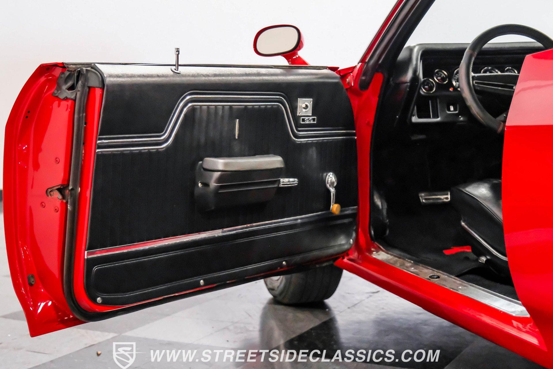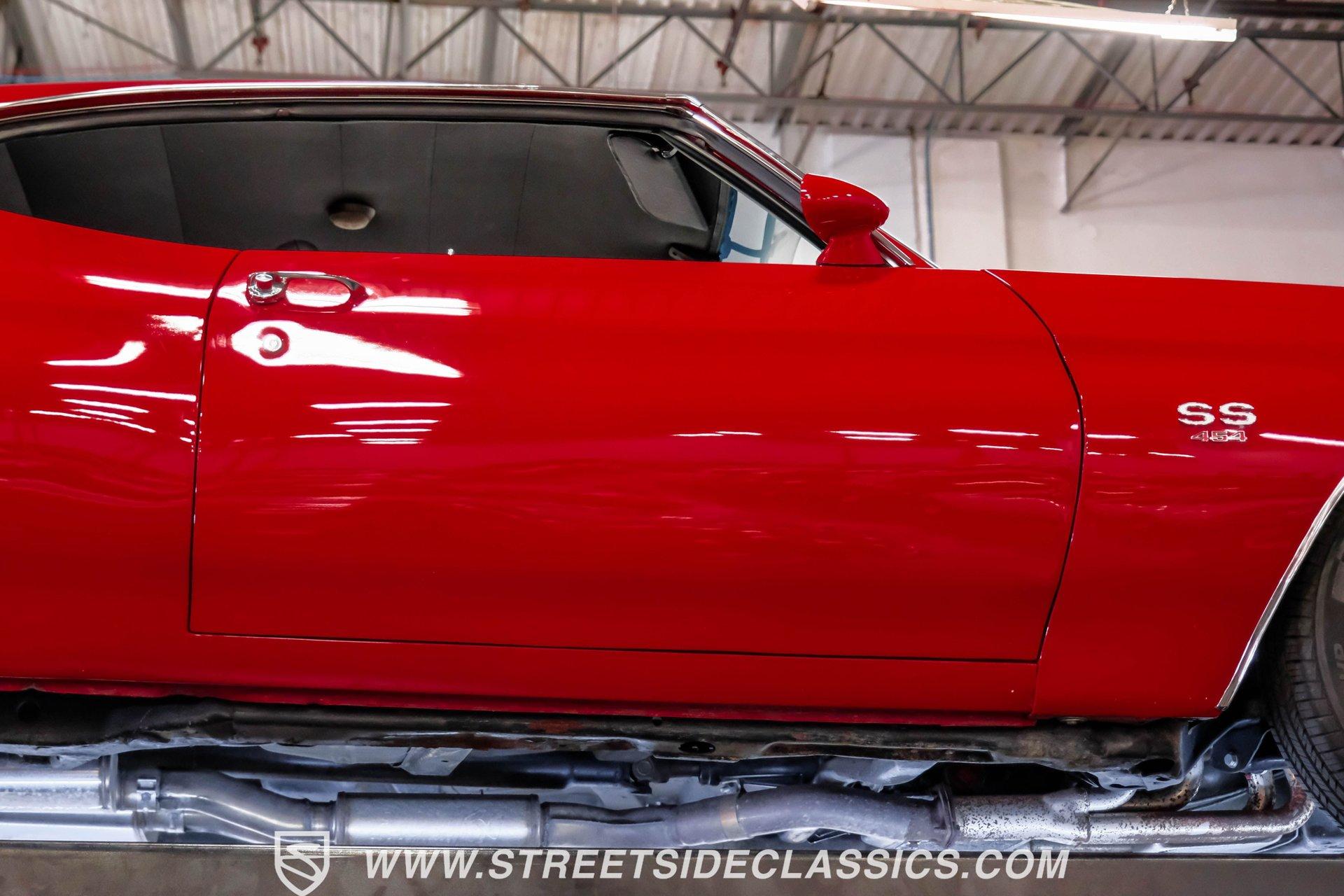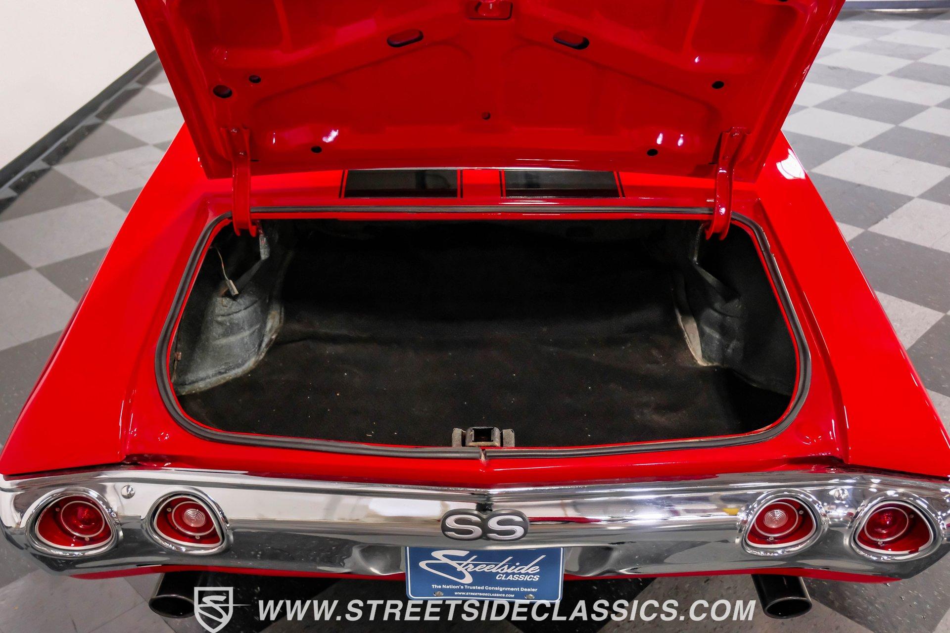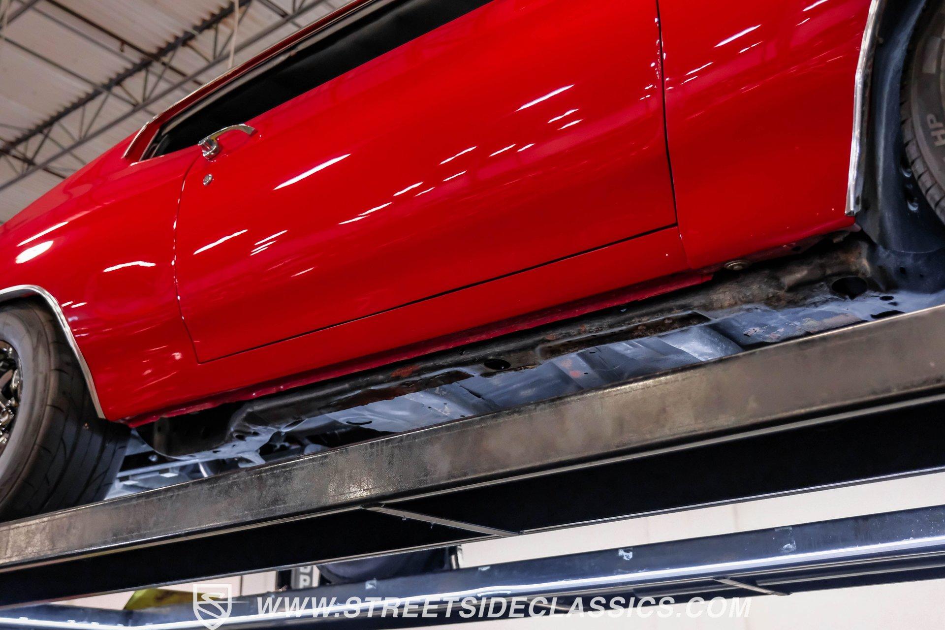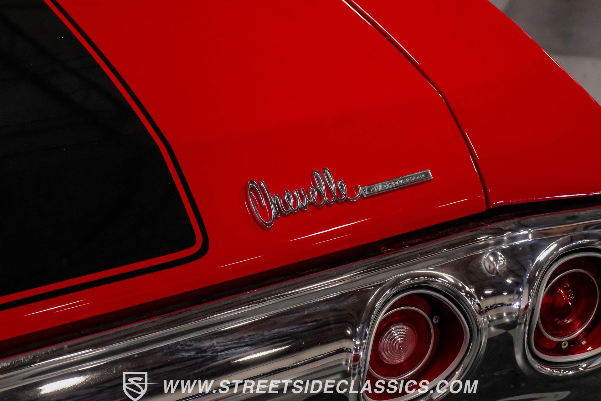 Finished in a Cranberry Red that makes every angle of this 1971 Chevrolet Chevelle SS 454 Tribute look sharp, the muscular body lines have been elevated by aggressive painted black stripes. The color combination works perfectly against the bright chrome trim and grille. A lowered stance gives this Chevelle serious muscle car credibility, sitting on a mix of 17" front and 15" rear Summit Racing wheels wrapped in 225/60R17 Roadone tires up front and 275/60R15 Nitto drag radials in the back. Tinted windows add a dark contrast against the vibrant red exterior, while hood pins complete the track-ready look. Black vinyl interior gives this Chevelle a factory-correct appearance while offering modern upgrades. The restuffed bucket seats with console maintain the period-correct muscle car feel. An upgraded JVC AM/FM/AUX/CD/MP3 unit handles the audio duties while custom Omega Kustom Instruments gauges provide clear readouts of vital engine data. The Holley Sniper EFI monitor gives the driver full control over fuel mapping. Vintage Air conditioning and heat keep the cabin comfortable, while the black carpet and headliner complete the factory appearance. The big-block 454 cubic inch V8 provides tremendous power through electronic fuel injection via a Holley Sniper system mounted on an Edelbrock aluminum intake. Aluminum Edelbrock heads with a performance camshaft maximize performance, while the engine breathes through long-tube headers connected to a dual exhaust system with an X-pipe and FlowFX mufflers for that perfect muscle car sound. A TH350 3-speed automatic transmission handles the power delivery to the 12-bolt rear end. The handling is dramatically improved with QA1 tubular A-arms, adjustable coil-overs, and sway bars front and rear. Stopping power comes from Wilwood 4-wheel disc brakes with drilled and slotted rotors. HIGHLIGHTS: 454 V8 Engine TH350 3-Speed Automatic Transmission Holley Sniper Electronic Fuel Injection Edelbrock Aluminum Heads and Intake 12-Bolt Rear End Long-Tube Headers Dual Exhaust with X-Pipe FlowFX Mufflers Wilwood 4-Wheel Disc Brakes with Drilled/Slotted Rotors QA1 Tubular A-Arms QA1 Adjustable Coil-Overs Serpentine Belt System Modern Radiator with Dual Electric Fans Cranberry Red Paint with Black Stripes 17" Front, 15" Rear Summit Racing Wheels 225/60R17 Roadone Front, 275/60R15 Nitto Rear Tires Black Interior with Bucket Seats and Console Omega Kustom Instruments Gauges JVC AM/FM/AUX/CD/MP3 Head Unit Vintage Air Conditioning and Heat Power Steering A big-block powered 1971 Chevrolet Chevelle SS 454 Tribute with modern handling and braking upgrades makes for an unbeatable combination of classic muscle car style and updated performance. The Cranberry Red paint, black stripes, and aggressive stance draw admirers while the 454 V8 produces the power to back up those looks. Call today!