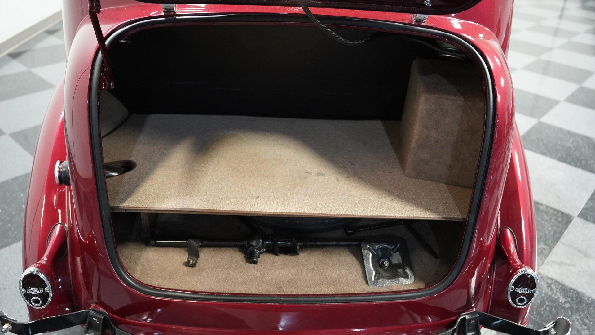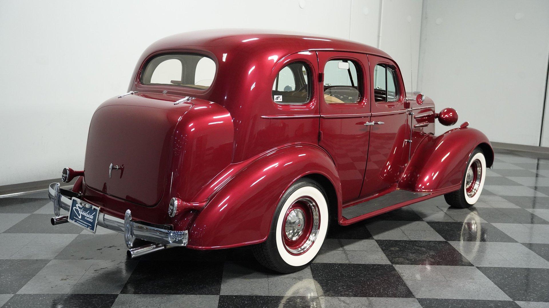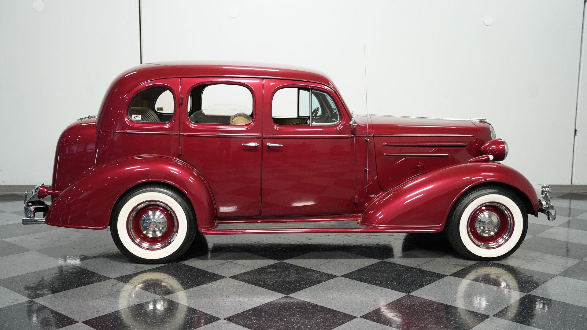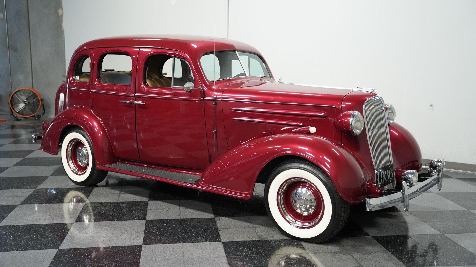 Sporting an all-steel body coated in rich burgundy paint accented by clean white pinstripes, this 1936 Chevrolet Standard Sedan carries a modified aesthetic that collectors appreciate. The Mustang-inspired front end geometry adds a unique flair to this four-door classic. Bright chrome trim runs throughout the exterior, outlining the body panels and window frames with period-correct detail. Those 15-inch wheels and 215/75R15 tires complete the look while maintaining the Chevy's stately proportions and authentic appeal. The tan leather interior creates an inviting atmosphere that complements the burgundy exterior. Bucket seats offer the ideal position for long drives, with quality upholstery showing excellent condition throughout. Dolphin gauges provide clear readouts while adding a custom touch to the dash. The column shifter falls naturally to hand for easy gear selection. Quality materials extend throughout from the clean carpet to the taut headliner, with the AM/FM single CD player adding modern audio capabilities to this classic cabin. A 350 V8 engine gives this Chevrolet plenty of motivation, working alongside a three-speed TH400 automatic transmission. An Edelbrock four-barrel carburetor sits atop an aluminum intake manifold for improved fuel delivery. Dual exhaust with glasspack-style mufflers produces a satisfying tone when accelerating. Power steering makes maneuvering effortless, while the power disc brakes provide excellent control. The independent front suspension and rear leaf springs with shocks absorb road imperfections for a solid driving feel. HIGHLIGHTS: 350 V8 Engine 3-Speed TH400 Automatic Transmission Single 4-Barrel Edelbrock Carburetor Aluminum Intake Manifold Power Front Disc Brakes Mustang-Inspired Front End Independent Front Suspension Leaf Spring Rear Suspension with Shocks Dual Exhaust with Glasspack Style Mufflers 10-Bolt Rear Axle Burgundy Paint with White Pinstripes 15" Wheels 215/75R15 Tires All Steel Body Tan Leather Bucket Seats Dolphin Gauges Power Steering Column Shifter AM/FM Single CD Player 12V Electrical System with Battery in Trunk Classic proportions with modern upgrades make this 1936 Chevrolet Standard Sedan a worthwhile addition to any collection. The burgundy and white exterior, comfortable leather interior, and strong V8 powerplant combine to create a vehicle that's equally at home at local shows or weekend cruises. Call today!