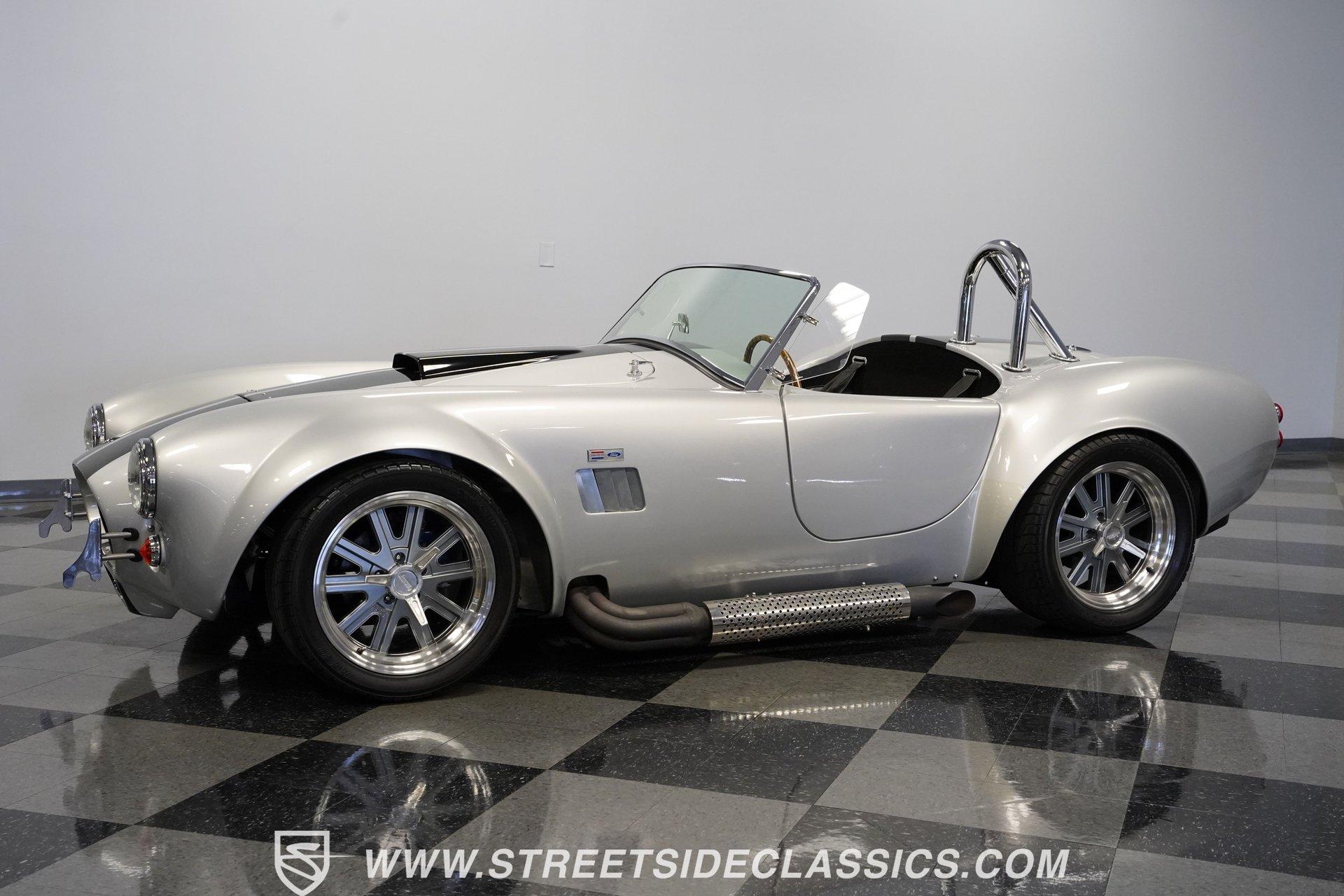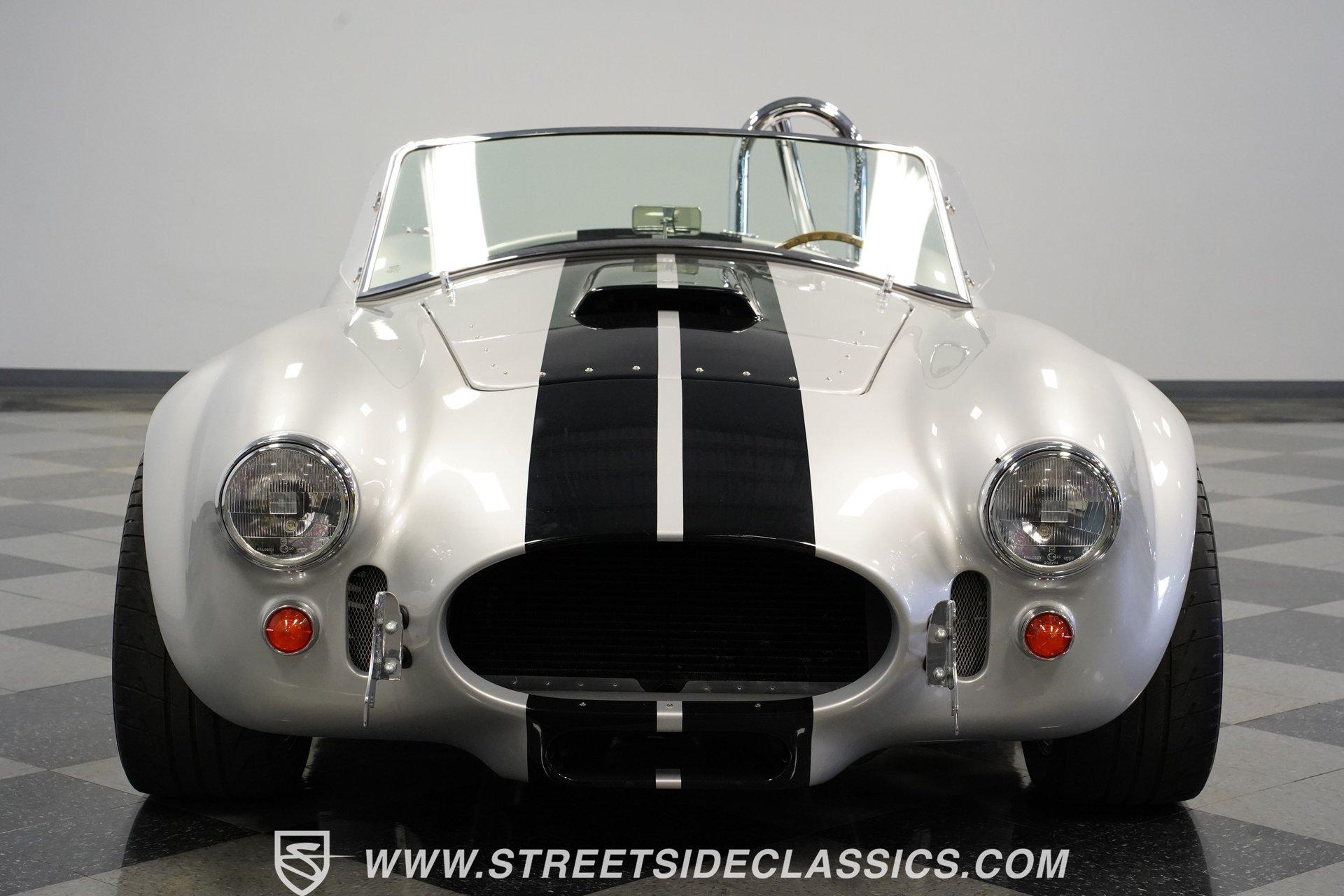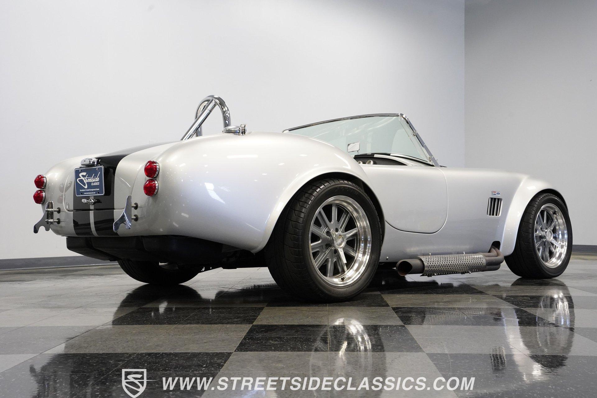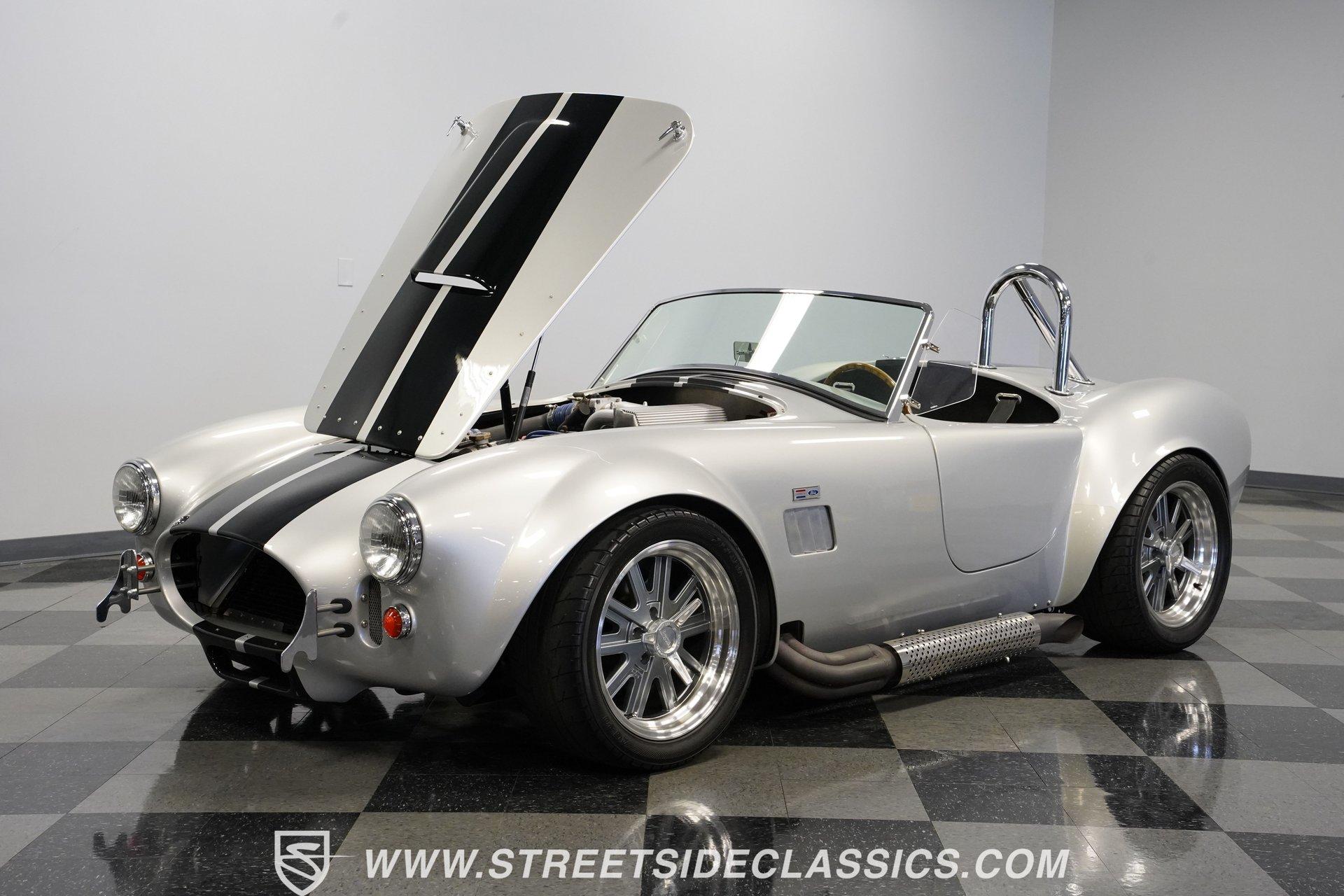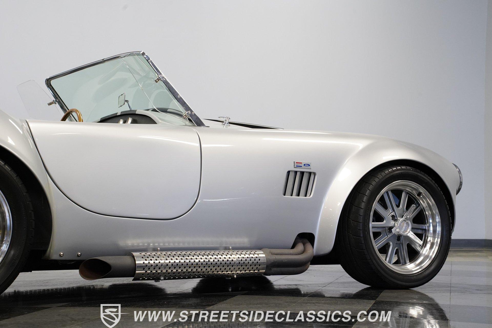 Legendary speed and style define the Shelby Cobra Factory Five, finished in a stunning Silver Metallic paint job with classic black racing stripes running along its body. The low-slung body sits perfectly on 17" American Racing wheels that fill out the wheel wells completely. A functional hood scoop adds motorsport flair to the front end while the side pipes add visual muscle to the overall appearance. The single chrome rollover bar behind the seats adds both safety and style. Yokohama tires (225/40ZR17 front, 285/40ZR17 rear) provide excellent grip. Minimalist racing inspiration shows throughout the black interior. The black vinyl bucket seats offer excellent lateral support during fast cornering. A wooden steering wheel gives a classic feel while modern Autometer gauges display vital information across the clean dash. Racing harnesses keep occupants firmly secured. The floor features clean carpet with minimal wear. For added safety, a battery cutoff switch is located conveniently behind the driver's seat. Generating massive power is a supercharged 5.0L V8 engine connected to a Borg Warner T5 5-speed manual transmission. Performance modifications include a BBK Power Plus 70mm supercharger, MSD ignition, BBK throttle body, aftermarket intake, aluminum intake manifold, and BBK shorty headers. An aluminum radiator with electric fan keeps temperatures controlled. The suspension consists of independent double wishbones up front and a coilover/trailing arm setup in back. Four-wheel disc brakes bring everything to a stop. HIGHLIGHTS: Supercharged 5.0L V8 Engine Borg Warner T5 5-Speed Manual Transmission Electronic Fuel Injection BBK Power Plus 70mm Supercharger MSD Ignition System Aftermarket Intake Aluminum Intake Manifold BBK Shorty Headers Aluminum Radiator with Electric Fan Independent Front Suspension Coilover/Trailing Arm Rear Suspension 4-Wheel Disc Brakes Silver Metallic Paint with Black Racing Stripes Side Pipe Exhaust Functional Hood Scoop Single Chrome Rollover Bar 17" American Racing Wheels 225/40ZR17 Front, 285/40ZR17 Rear Yokohama Tires Black Interior with Bucket Seats Racing Harnesses Wooden Steering Wheel Autometer Gauges Battery Cutoff Switch Combining classic styling with modern performance upgrades makes this 1965 Shelby Cobra Factory Five an incredible machine. The supercharged V8 and lightweight construction give amazing acceleration while the upgraded suspension keeps it planted in the curves. Call today!