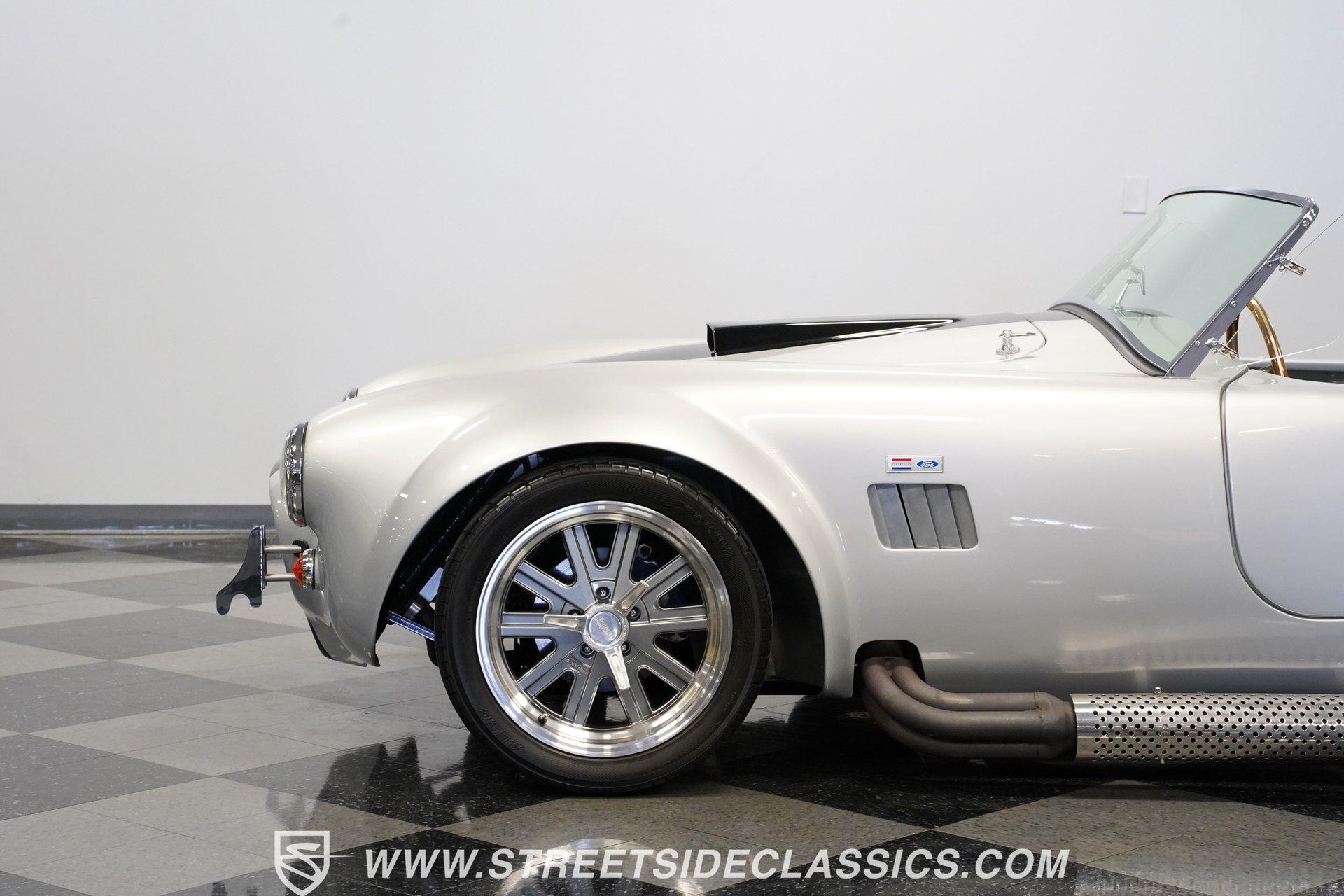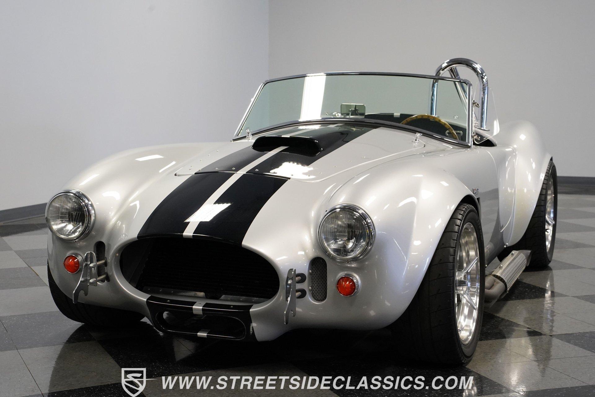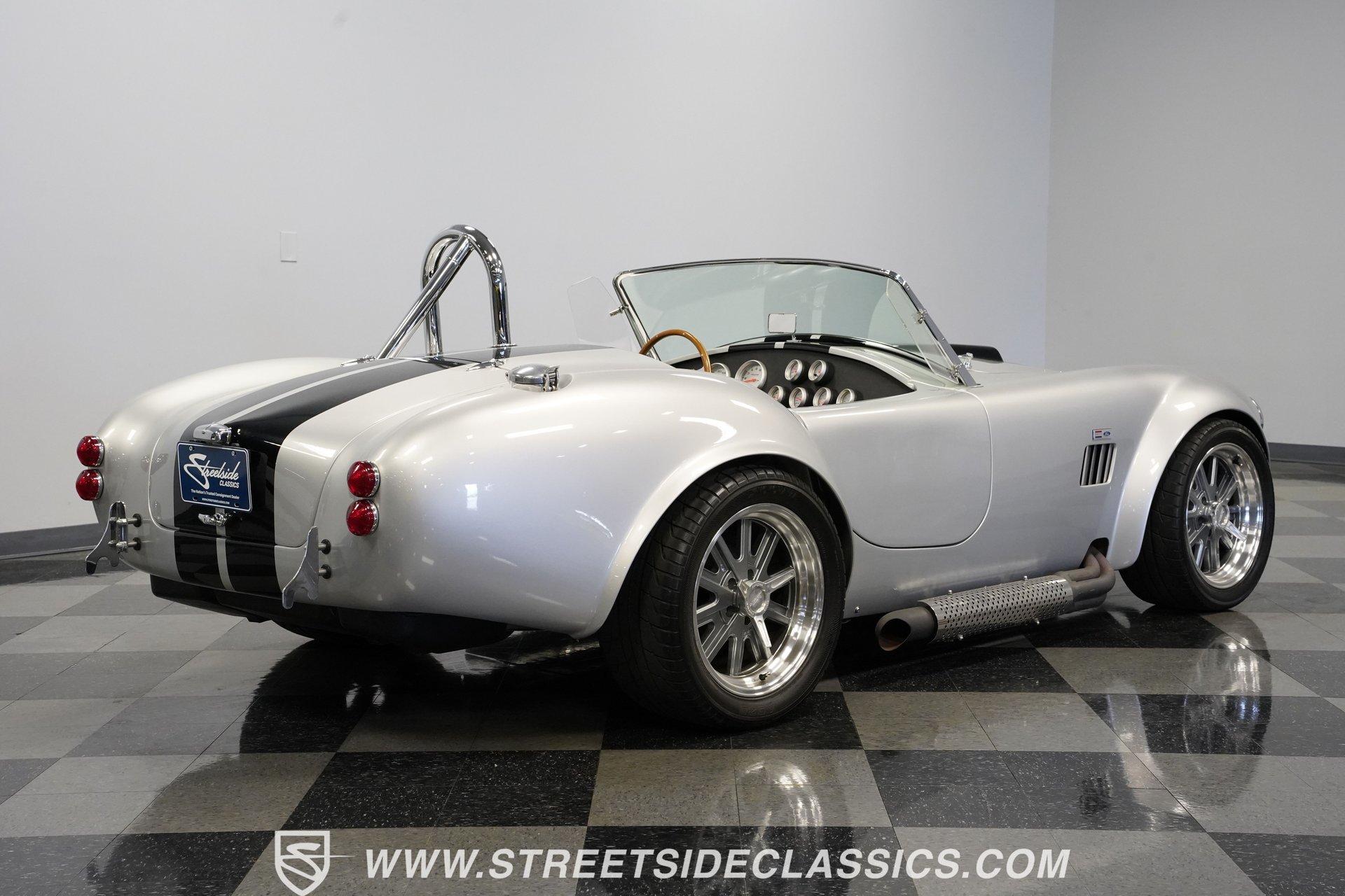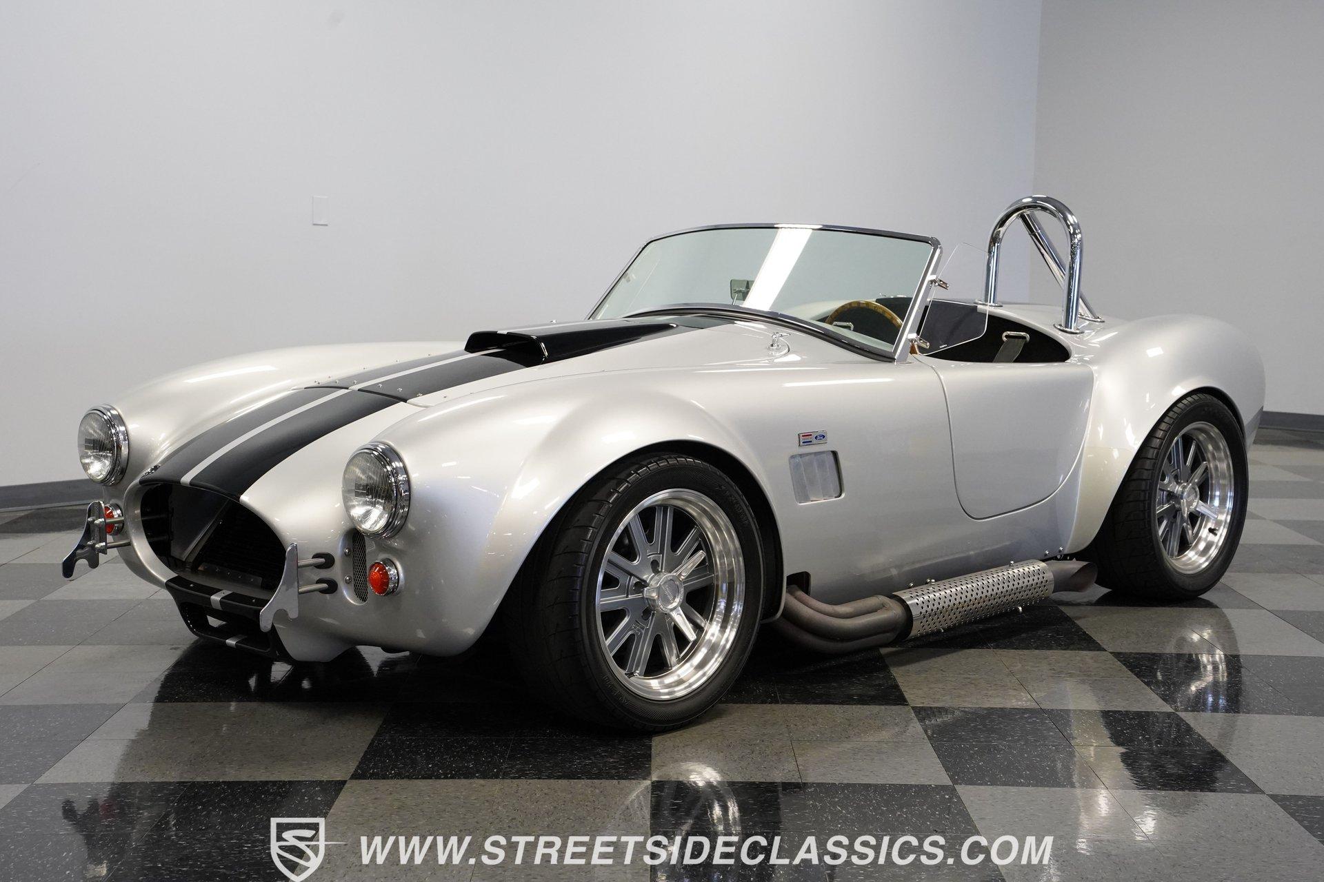 Legendary speed and style define the Shelby Cobra Factory Five, finished in a stunning Silver Metallic paint job with classic black racing stripes running along its body. The low-slung body sits perfectly on 17" American Racing wheels that fill out the wheel wells completely. A functional hood scoop adds motorsport flair to the front end while the side pipes add visual muscle to the overall appearance. The single chrome rollover bar behind the seats adds both safety and style. Yokohama tires (225/40ZR17 front, 285/40ZR17 rear) provide excellent grip. Minimalist racing inspiration shows throughout the black interior. The black vinyl bucket seats offer excellent lateral support during fast cornering. A wooden steering wheel gives a classic feel while modern Autometer gauges display vital information across the clean dash. Racing harnesses keep occupants firmly secured. The floor features clean carpet with minimal wear. For added safety, a battery cutoff switch is located conveniently behind the driver's seat. Generating massive power is a supercharged 5.0L V8 engine connected to a Borg Warner T5 5-speed manual transmission. Performance modifications include a BBK Power Plus 70mm supercharger, MSD ignition, BBK throttle body, aftermarket intake, aluminum intake manifold, and BBK shorty headers. An aluminum radiator with electric fan keeps temperatures controlled. The suspension consists of independent double wishbones up front and a coilover/trailing arm setup in back. Four-wheel disc brakes bring everything to a stop. HIGHLIGHTS: Supercharged 5.0L V8 Engine Borg Warner T5 5-Speed Manual Transmission Electronic Fuel Injection BBK Power Plus 70mm Supercharger MSD Ignition System Aftermarket Intake Aluminum Intake Manifold BBK Shorty Headers Aluminum Radiator with Electric Fan Independent Front Suspension Coilover/Trailing Arm Rear Suspension 4-Wheel Disc Brakes Silver Metallic Paint with Black Racing Stripes Side Pipe Exhaust Functional Hood Scoop Single Chrome Rollover Bar 17" American Racing Wheels 225/40ZR17 Front, 285/40ZR17 Rear Yokohama Tires Black Interior with Bucket Seats Racing Harnesses Wooden Steering Wheel Autometer Gauges Battery Cutoff Switch Combining classic styling with modern performance upgrades makes this 1965 Shelby Cobra Factory Five an incredible machine. The supercharged V8 and lightweight construction give amazing acceleration while the upgraded suspension keeps it planted in the curves. Call today!