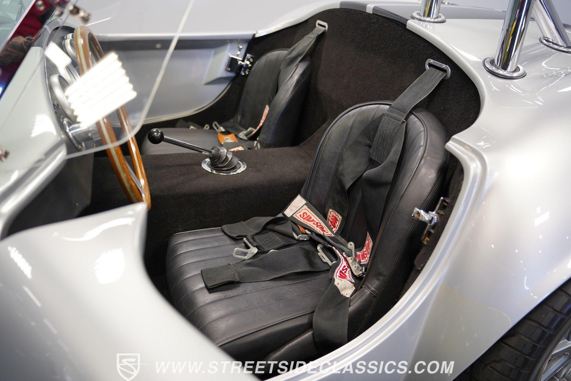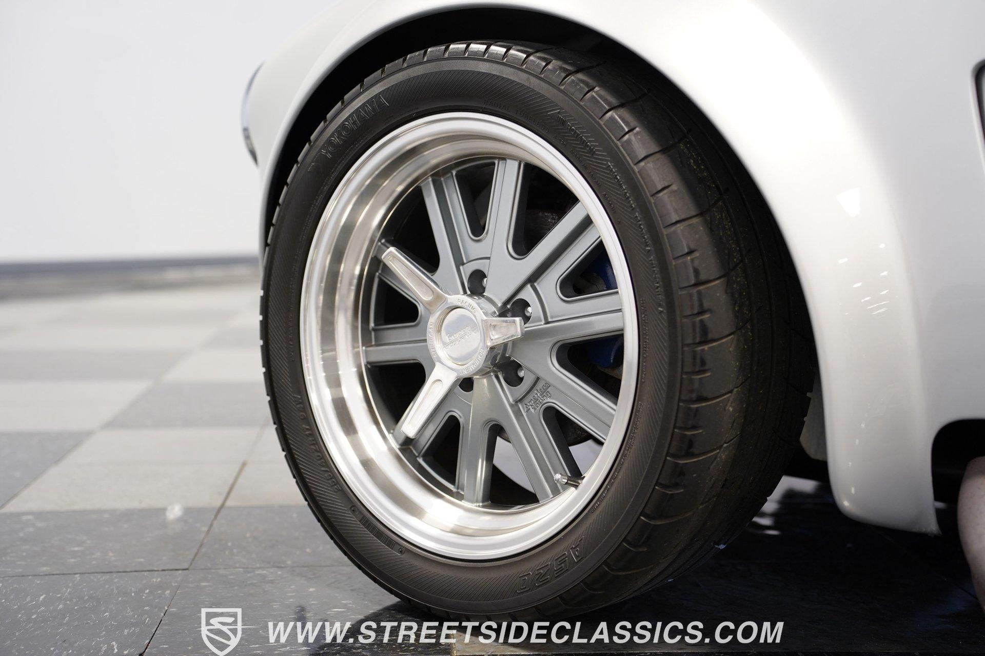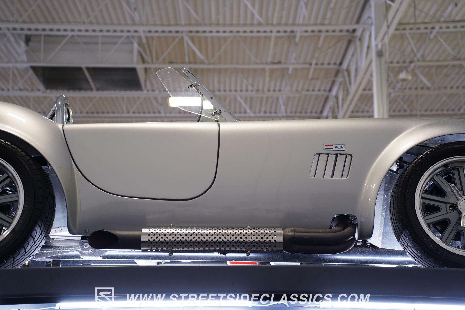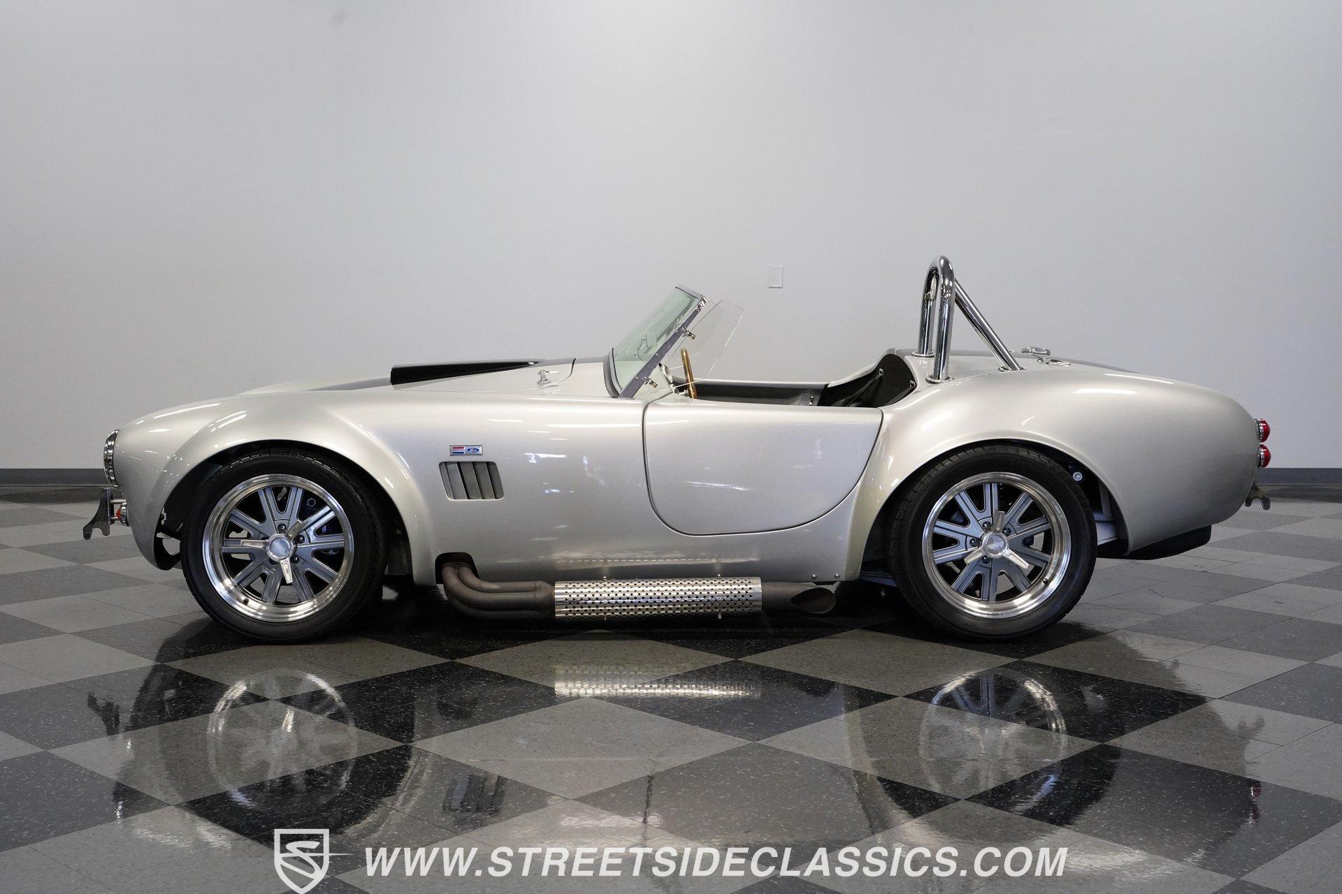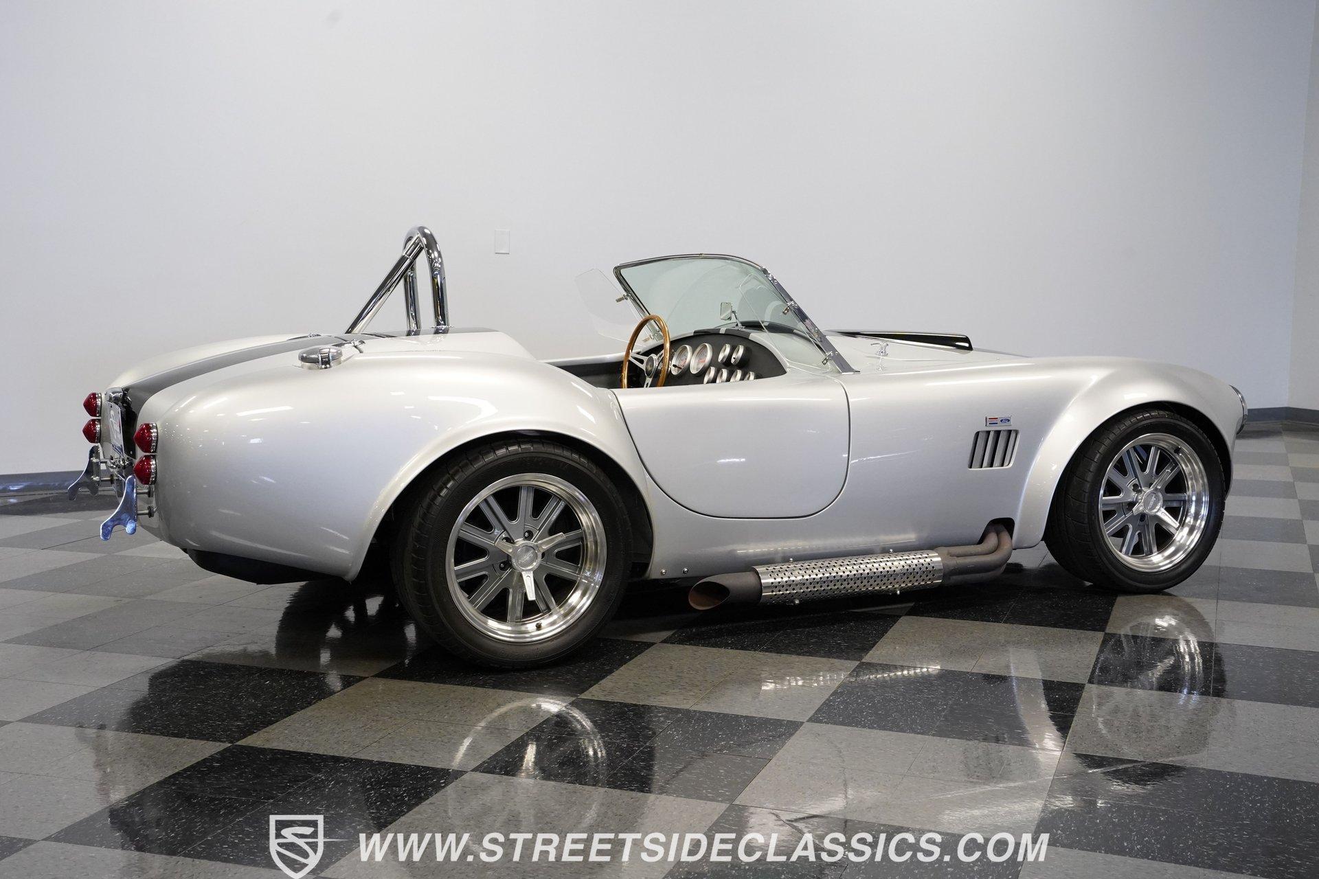 Legendary speed and style define the Shelby Cobra Factory Five, finished in a stunning Silver Metallic paint job with classic black racing stripes running along its body. The low-slung body sits perfectly on 17" American Racing wheels that fill out the wheel wells completely. A functional hood scoop adds motorsport flair to the front end while the side pipes add visual muscle to the overall appearance. The single chrome rollover bar behind the seats adds both safety and style. Yokohama tires (225/40ZR17 front, 285/40ZR17 rear) provide excellent grip. Minimalist racing inspiration shows throughout the black interior. The black vinyl bucket seats offer excellent lateral support during fast cornering. A wooden steering wheel gives a classic feel while modern Autometer gauges display vital information across the clean dash. Racing harnesses keep occupants firmly secured. The floor features clean carpet with minimal wear. For added safety, a battery cutoff switch is located conveniently behind the driver's seat. Generating massive power is a supercharged 5.0L V8 engine connected to a Borg Warner T5 5-speed manual transmission. Performance modifications include a BBK Power Plus 70mm supercharger, MSD ignition, BBK throttle body, aftermarket intake, aluminum intake manifold, and BBK shorty headers. An aluminum radiator with electric fan keeps temperatures controlled. The suspension consists of independent double wishbones up front and a coilover/trailing arm setup in back. Four-wheel disc brakes bring everything to a stop. HIGHLIGHTS: Supercharged 5.0L V8 Engine Borg Warner T5 5-Speed Manual Transmission Electronic Fuel Injection BBK Power Plus 70mm Supercharger MSD Ignition System Aftermarket Intake Aluminum Intake Manifold BBK Shorty Headers Aluminum Radiator with Electric Fan Independent Front Suspension Coilover/Trailing Arm Rear Suspension 4-Wheel Disc Brakes Silver Metallic Paint with Black Racing Stripes Side Pipe Exhaust Functional Hood Scoop Single Chrome Rollover Bar 17" American Racing Wheels 225/40ZR17 Front, 285/40ZR17 Rear Yokohama Tires Black Interior with Bucket Seats Racing Harnesses Wooden Steering Wheel Autometer Gauges Battery Cutoff Switch Combining classic styling with modern performance upgrades makes this 1965 Shelby Cobra Factory Five an incredible machine. The supercharged V8 and lightweight construction give amazing acceleration while the upgraded suspension keeps it planted in the curves. Call today!