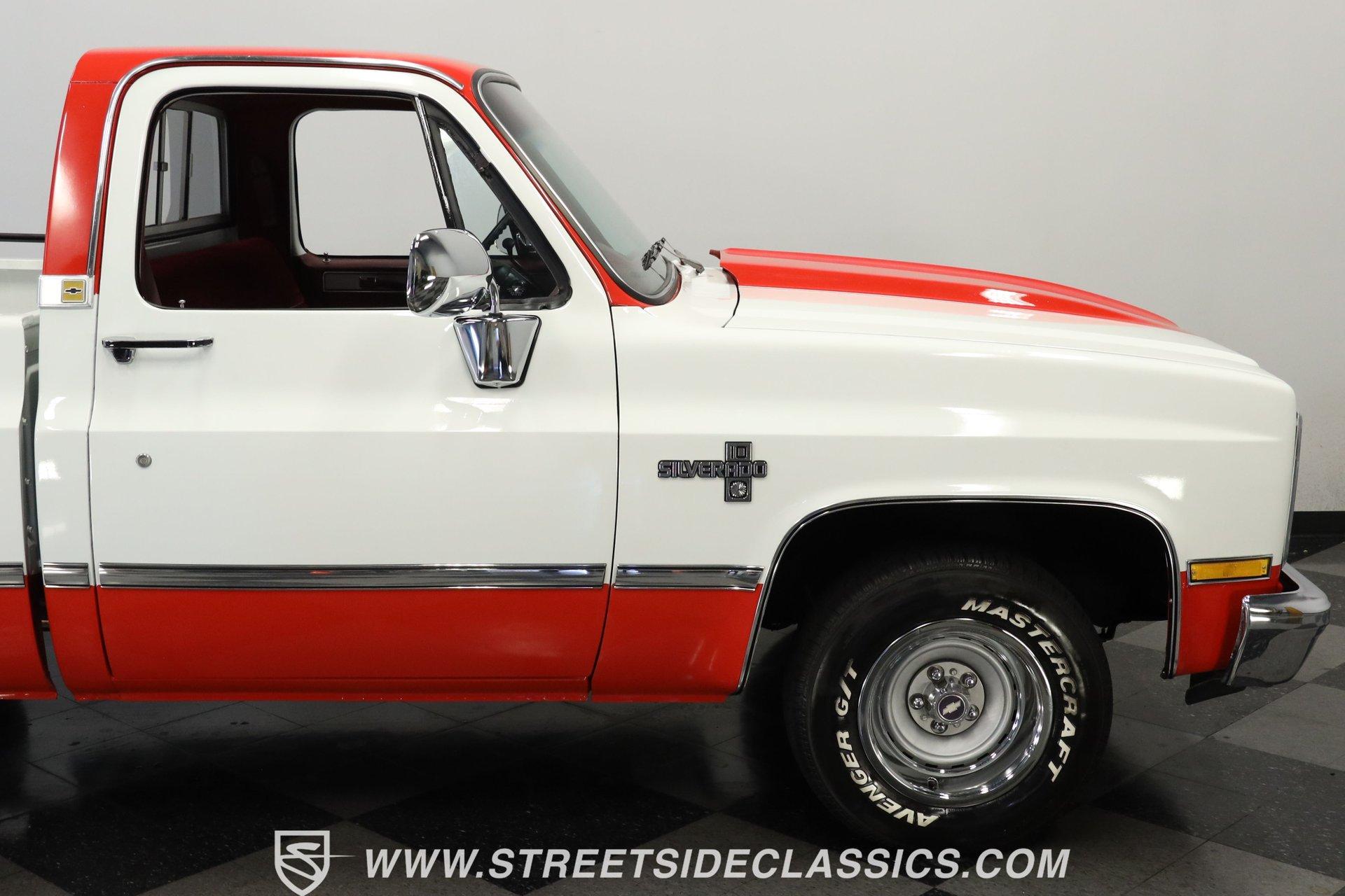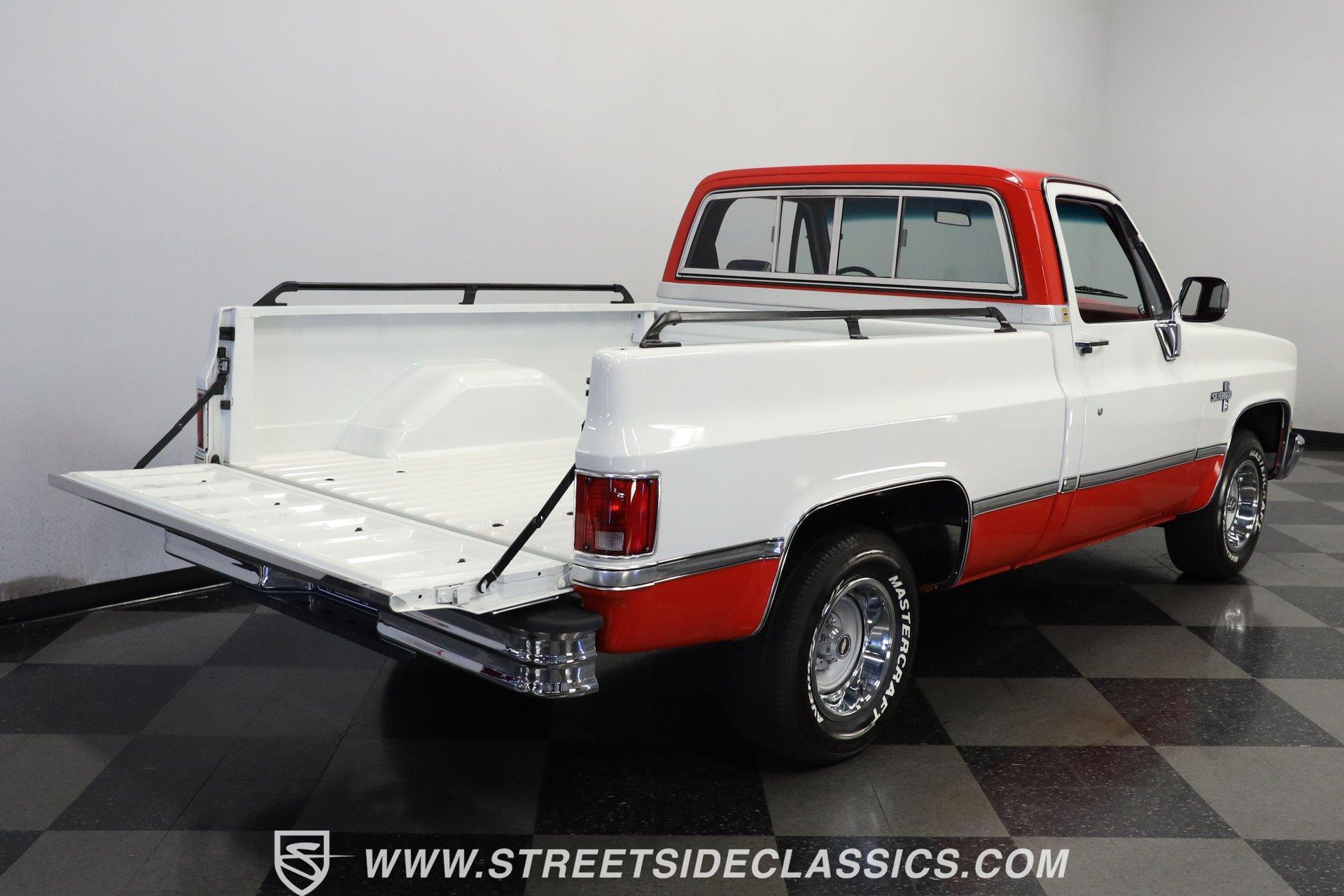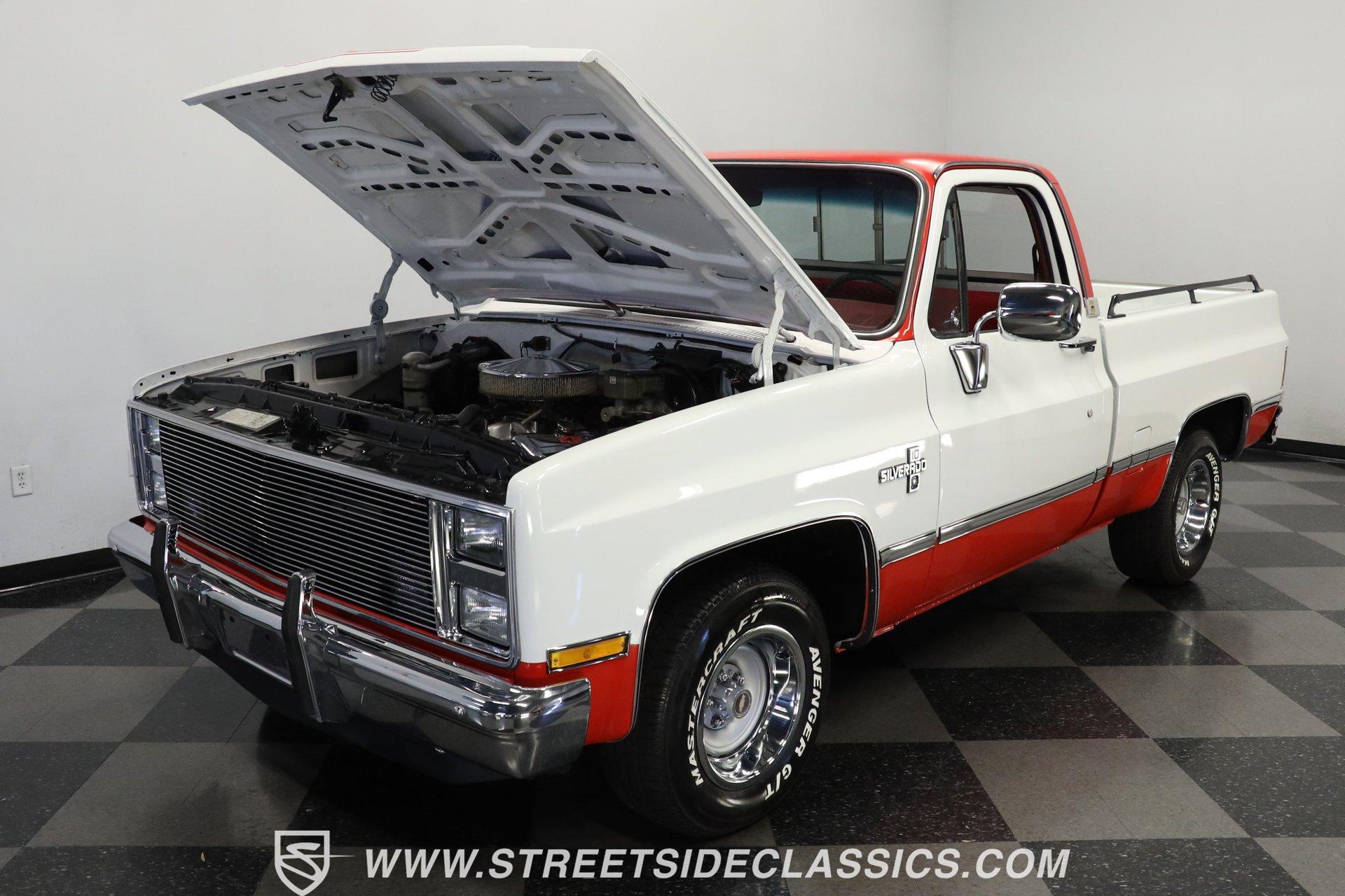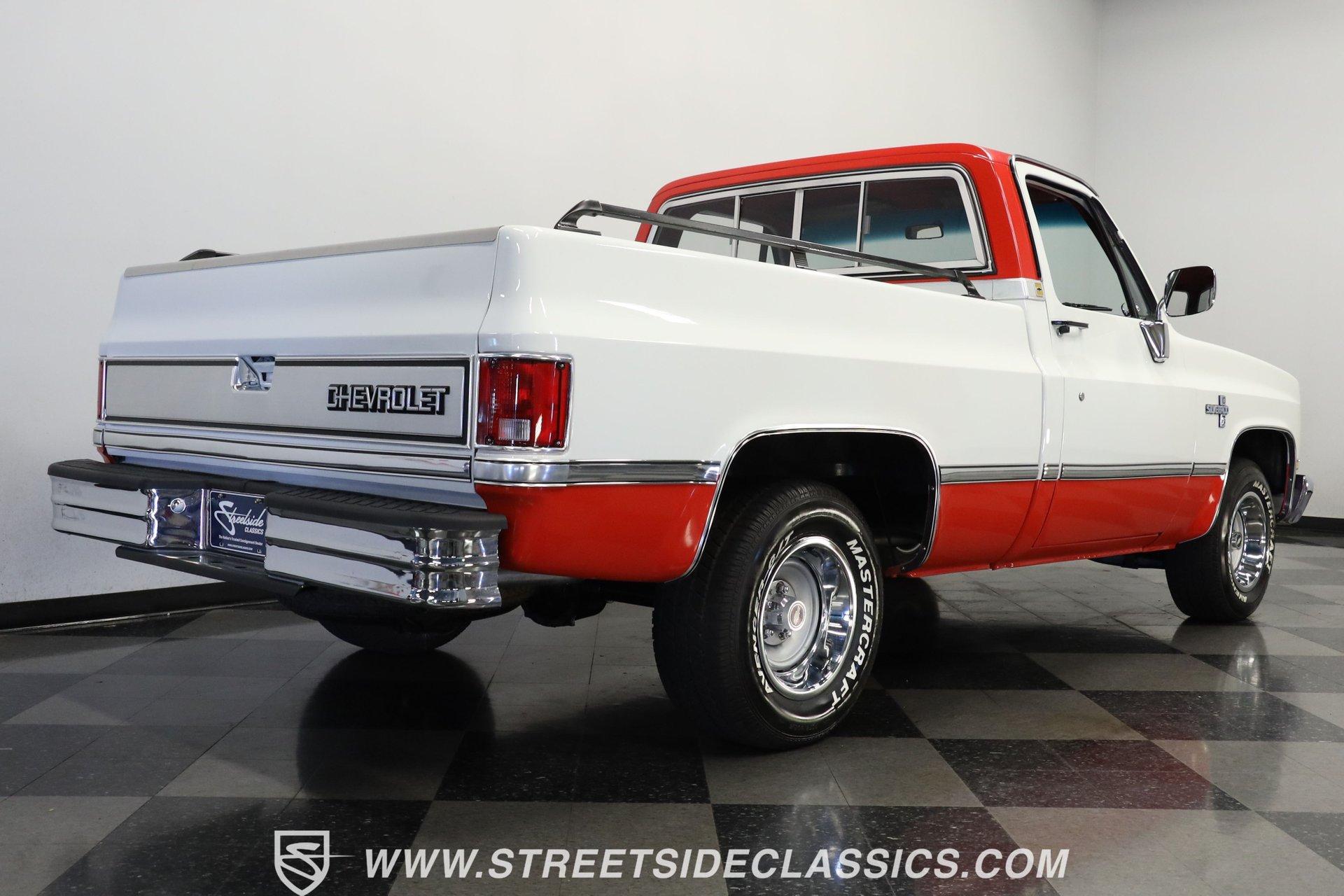 Chevy trucks from this era are arguably some of the best-looking trucks ever made, and this 1984 Chevrolet C10 Silverado Short Bed is an excellent example of why. This top-of-line Silverado has been resprayed in gloss white and red paint finish accented with chrome and moldings. Looking closely at the bed reveals that this truck has never seen use as work truck and has been exceptionally well cared for. The wide Chevrolet truck rally wheels have super-clean paint, center caps and trim rings, and are wrapped with Mastercraft Avenger G/T raised white lettered tires staggered 235/70R15 front and 275/60R15 rear for a confidant stance. The addition of a cowl hood, bed rails, front bumper guards, chrome rear step bumper and custom grill add to this truck handsome good looks. HIGHLIGHTS: 454 Big Block V8 Automatic Transmission Beautifully Restored Truck Chevrolet Truck Rally Wheels Cowl Hood Custom Grill Power Windows Power Door Locks Chrome Rear Step Bumper Front Bumper Guards Factory AM/FM Radio Upgraded Serpentine Belt System Aluminum Radiator Aluminum High-Rise Intake Edelbrock Carburetor Documentation showing 1 family owned! The luxurious Silverado red interior is clean with beautiful crack-free dash and plastic trim throughout. The seats, headliner and carpets are in excellent condition as well. This truck is highly optioned with power windows, power locks, air conditioning (not currently operational), tilt steering column, gauge package, cruise control and a rarely seen today factory AM/FM radio still in the dash. Under the hood is as clean as the rest of the truck, featuring a smooth-running 454 Big Block engine V8 mated to a TH350 automatic transmission. The engine features an aluminum high rise intake manifold, single Edelbrock 4-barrel carburetor, chrome Chevrolet logo valve covers, chrome Chevrolet logo open-element air cleaner, upgraded serpentine belt system, and an aluminum radiator with dual electric fans. This 1984 Chevrolet C10 Silverado it runs and drives nicely. It is rare to find a fully loaded Silverado Short Bed, especially one that has remained in the same family since new! Call today! We can assist you with getting an Extended Vehicle Service Plan from Freedom Warranty, which provides comprehensive coverage that can save thousands of dollars on unexpected repairs. Inquire for more details and pricing!