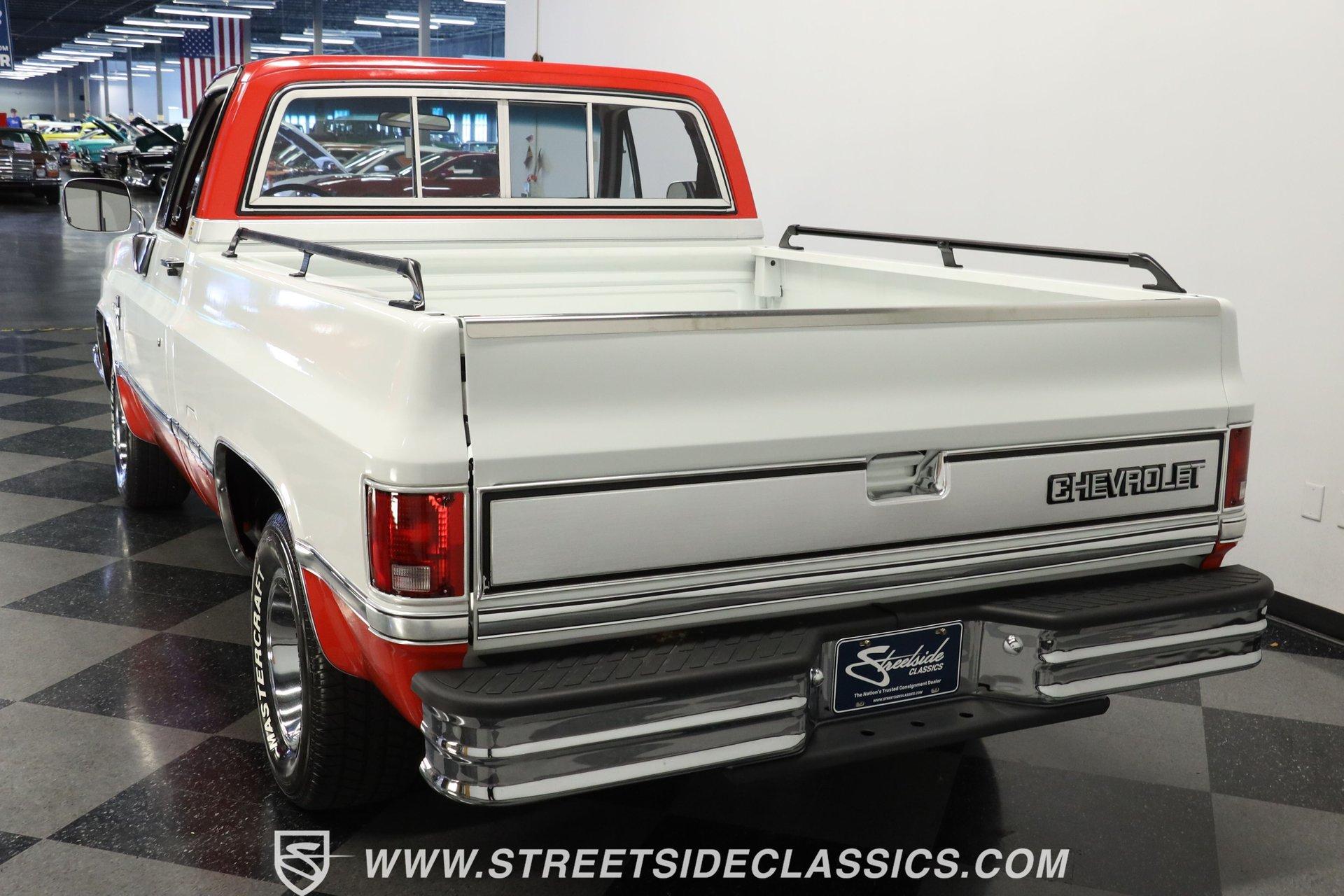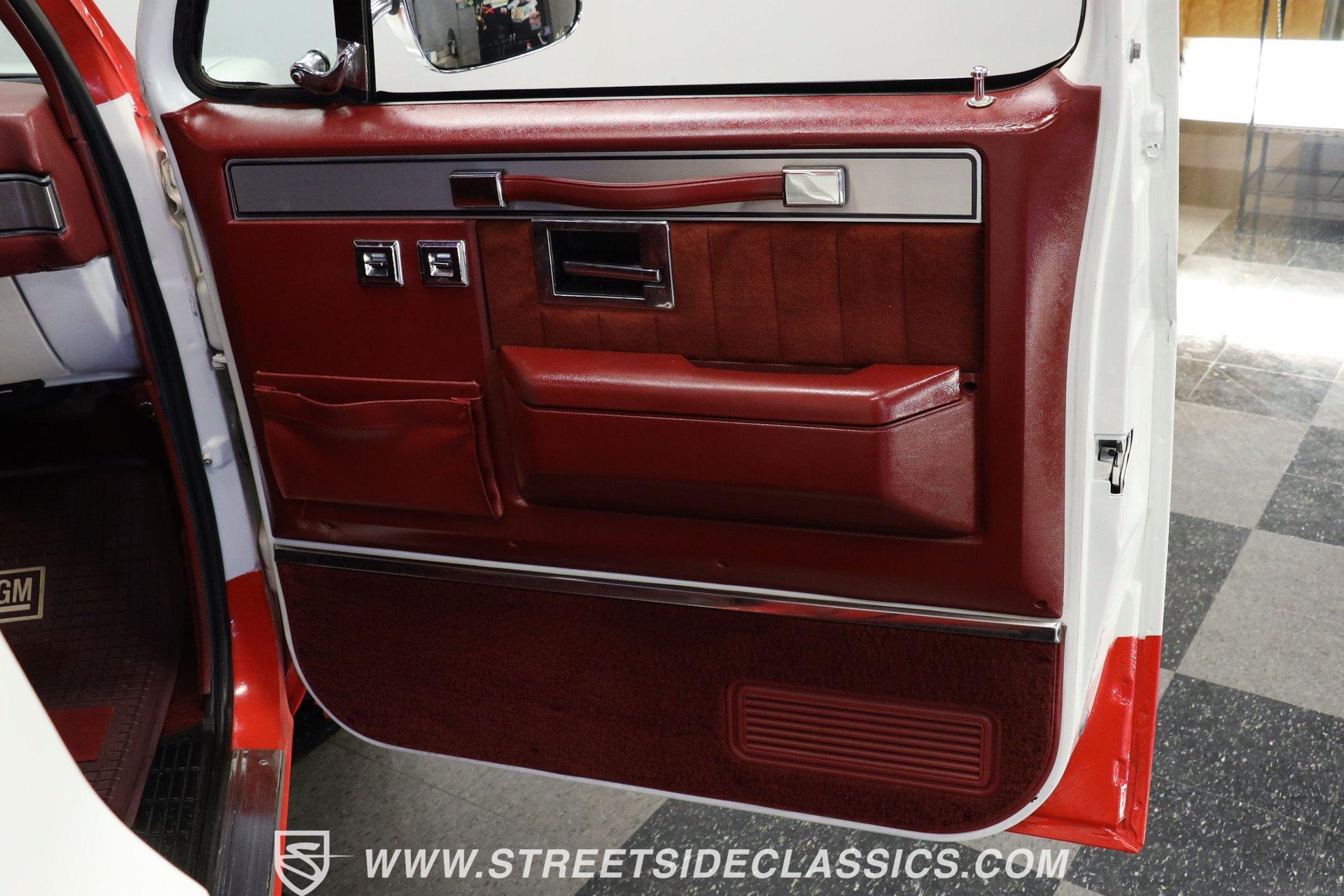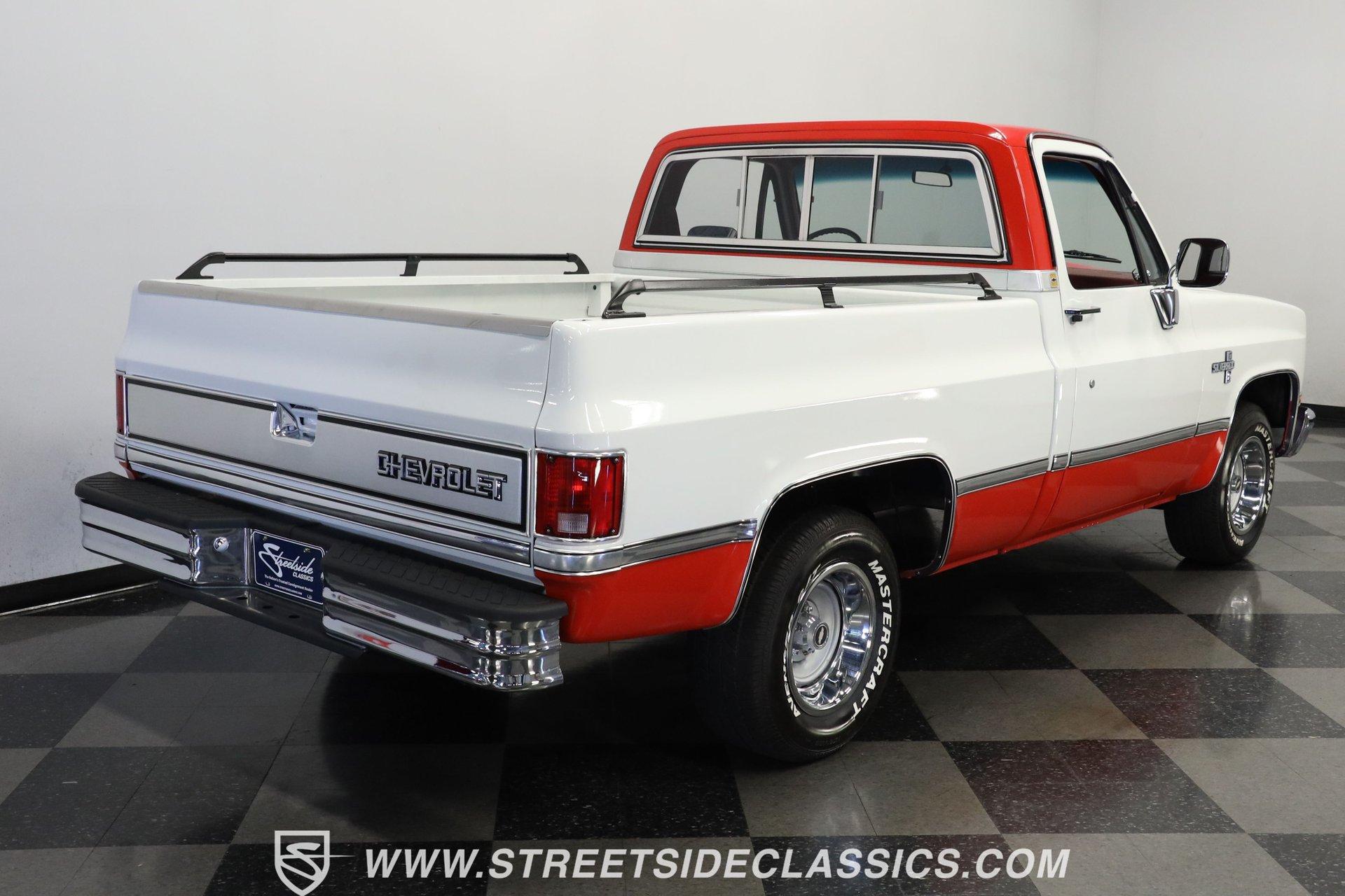 Chevy trucks from this era are arguably some of the best-looking trucks ever made, and this 1984 Chevrolet C10 Silverado Short Bed is an excellent example of why. This top-of-line Silverado has been resprayed in gloss white and red paint finish accented with chrome and moldings. Looking closely at the bed reveals that this truck has never seen use as work truck and has been exceptionally well cared for. The wide Chevrolet truck rally wheels have super-clean paint, center caps and trim rings, and are wrapped with Mastercraft Avenger G/T raised white lettered tires staggered 235/70R15 front and 275/60R15 rear for a confidant stance. The addition of a cowl hood, bed rails, front bumper guards, chrome rear step bumper and custom grill add to this truck handsome good looks. HIGHLIGHTS: 454 Big Block V8 Automatic Transmission Beautifully Restored Truck Chevrolet Truck Rally Wheels Cowl Hood Custom Grill Power Windows Power Door Locks Chrome Rear Step Bumper Front Bumper Guards Factory AM/FM Radio Upgraded Serpentine Belt System Aluminum Radiator Aluminum High-Rise Intake Edelbrock Carburetor Documentation showing 1 family owned! The luxurious Silverado red interior is clean with beautiful crack-free dash and plastic trim throughout. The seats, headliner and carpets are in excellent condition as well. This truck is highly optioned with power windows, power locks, air conditioning (not currently operational), tilt steering column, gauge package, cruise control and a rarely seen today factory AM/FM radio still in the dash. Under the hood is as clean as the rest of the truck, featuring a smooth-running 454 Big Block engine V8 mated to a TH350 automatic transmission. The engine features an aluminum high rise intake manifold, single Edelbrock 4-barrel carburetor, chrome Chevrolet logo valve covers, chrome Chevrolet logo open-element air cleaner, upgraded serpentine belt system, and an aluminum radiator with dual electric fans. This 1984 Chevrolet C10 Silverado it runs and drives nicely. It is rare to find a fully loaded Silverado Short Bed, especially one that has remained in the same family since new! Call today! We can assist you with getting an Extended Vehicle Service Plan from Freedom Warranty, which provides comprehensive coverage that can save thousands of dollars on unexpected repairs. Inquire for more details and pricing!