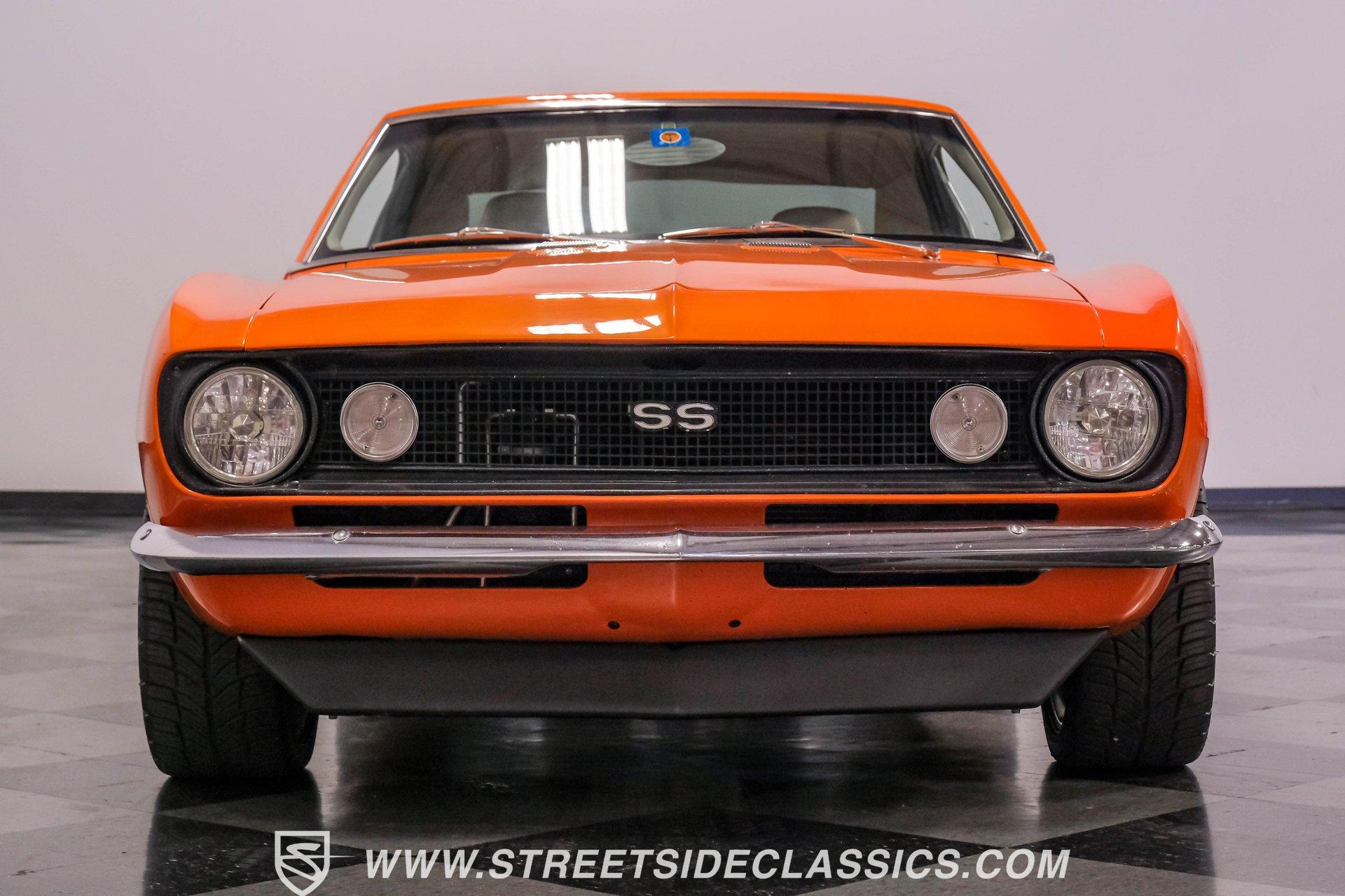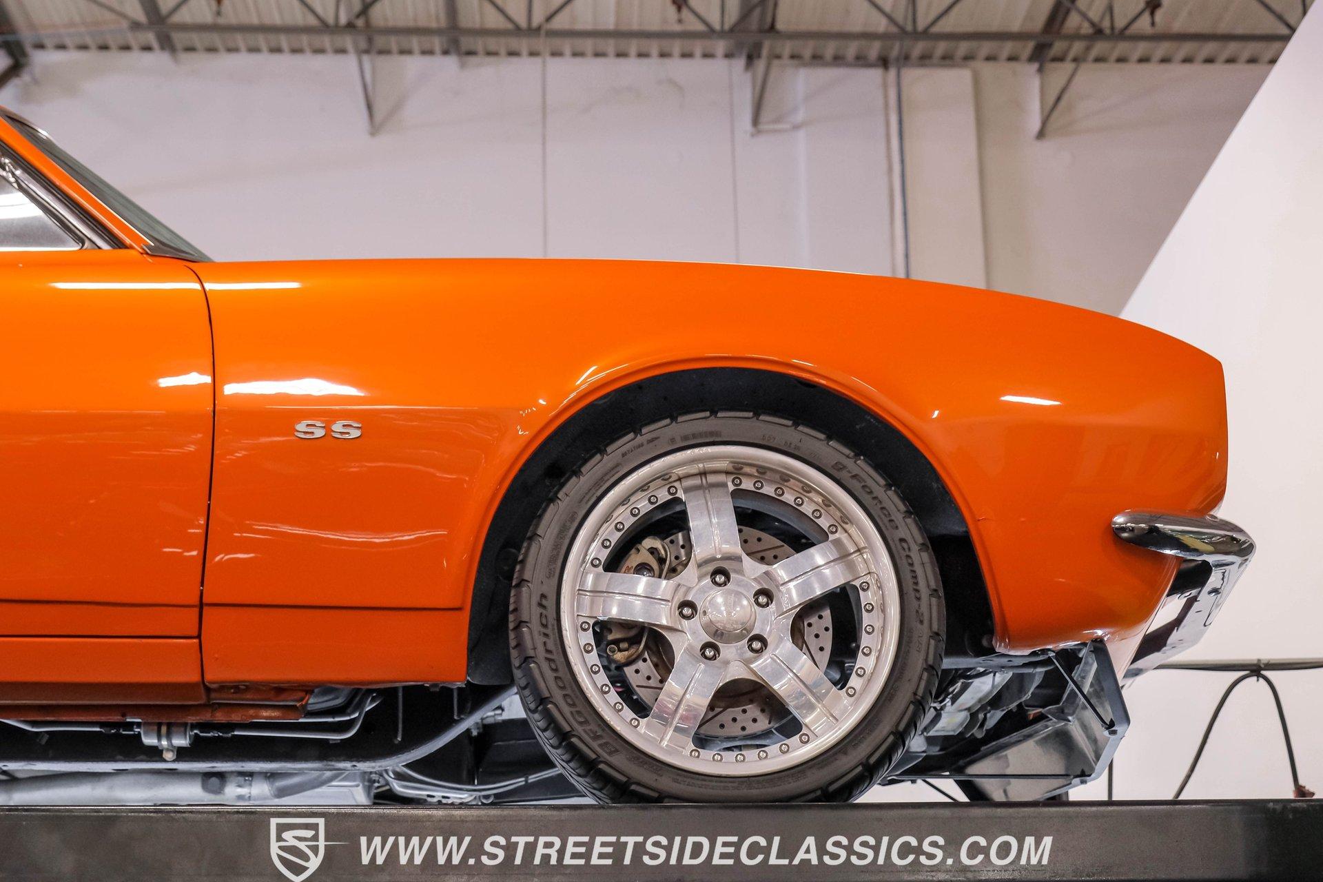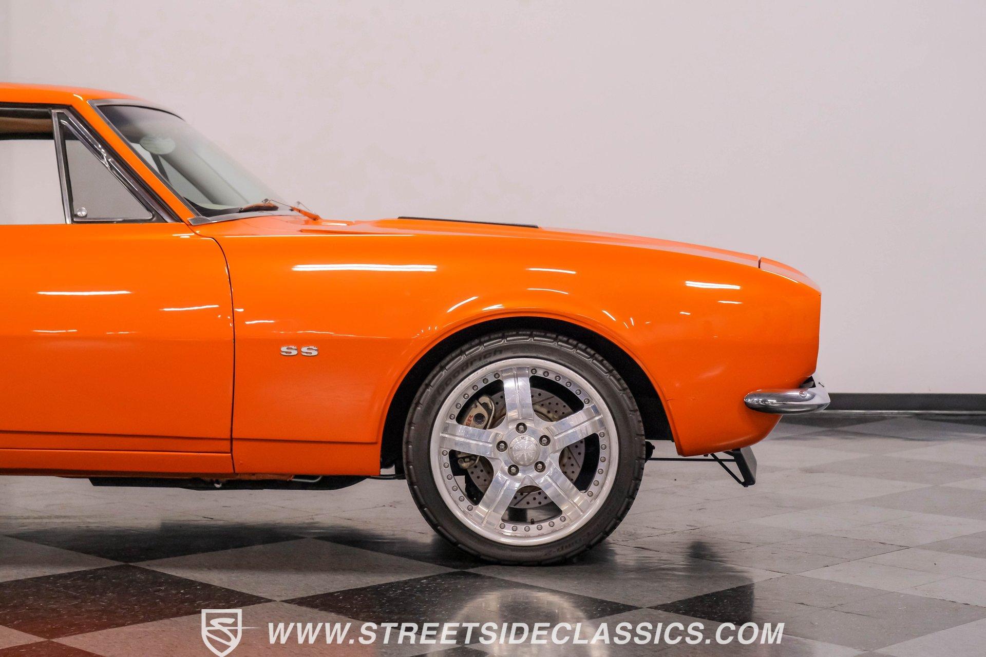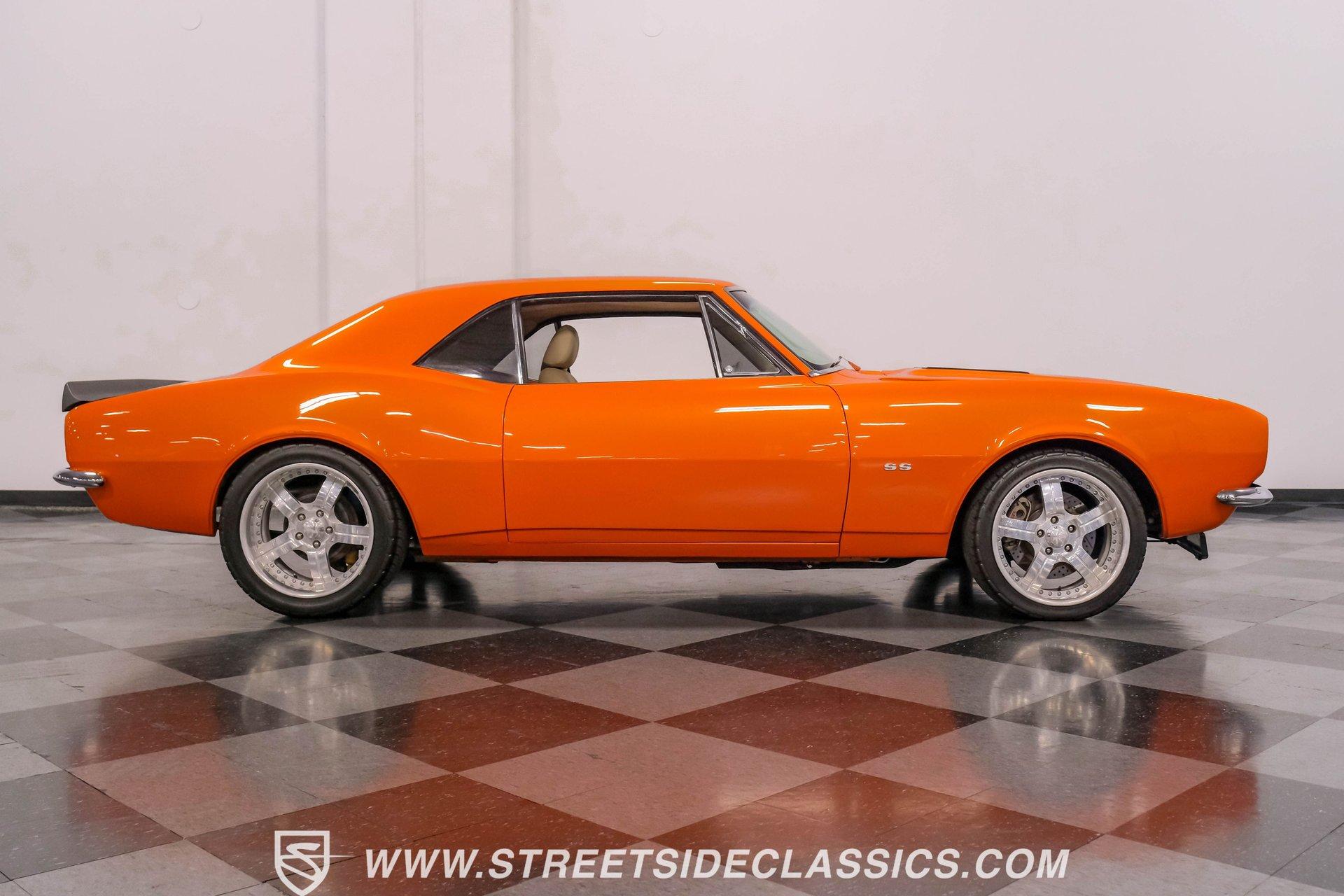Sunburst Orange Metallic coats every inch of this fully customized 1967 Chevrolet Camaro Restomod, making it a vibrant icon of American muscle gone modern. Built with a tasteful Super Sport hood, front and rear spoilers, deleted side mirrors, and shaved door handles for a cleaner appearance, this Camaro displays custom craftsmanship in every curve. The aggressive stance comes courtesy of SpeedTech tubular upper control arms, while the 18" Bonspeed wheels wrapped in BFG rubber (235/40ZR18 front and 275/40ZR18 rear) anchor this beast firmly to the ground. The shaved drip rails gives this Camaro a sleek, custom profile unlike anything else on the road. The beige leather interior features custom later model bucket seats and a full custom console with cup holders - pure comfort blended with style. The completely custom-built dash houses AutoMeter gauges and a Pioneer head unit connected to JBL speakers and amplifiers throughout (check out what used to be the back seat!). A B&M floor shifter sits ready on the console while the Budnick custom billet steering wheel crowns a tilt billet steering column. Modern amenities include air conditioning, power windows disguised as window cranks, keyless ignition with turn knob to start, and remote door poppers. The trunk has been completely finished out and combines with the back seat equipment for maximum audio impact. Generating power is a GM Goodwrench 350 V8 crate engine equipped with performance aluminum heads and a performance cam. The motor breathes through a Holley Sniper EFI system mounted on an Edelbrock air-gap intake manifold. Power flows through a TH350 3-speed automatic transmission to the 12-bolt rear end. The braking system features Wilwood master cylinder with front disc brakes using Baer calipers and slotted/cross-drilled rotors. Mid-length headers feed into a FlowMaster dual exhaust system, creating the perfect soundtrack. A BeCool radiator keeps temperatures in check during spirited driving sessions. HIGHLIGHTS: GM Goodwrench 350 V8 Crate Engine Performance Aluminum Heads Performance Cam Holley Sniper Electronic Fuel Injection Edelbrock Air-Gap Intake Manifold TH350 3-Speed Automatic Transmission 12-Bolt Rear End Headers with FlowMaster Dual Exhaust Wilwood Master Cylinder Front Disc Brakes Featuring Baer Calipers & Slotted/Cross-Drilled Rotors SpeedTech Tubular Upper Control Arms BeCool Radiator Sunburst Orange Metallic Paint Super Sport Hood 18" Bonspeed Wheels with 235/40ZR18 Front, 275/40ZR18 Rear BFG Tires Beige Interior with Leather Bucket Seats Full Custom Console with Cup Holders B&M Floor Shifter AutoMeter Gauges Pioneer Head Unit JBL Speakers and Amplifiers Budnick Custom Billet Steering Wheel Tilt Billet Steering Column Power Windows Keyless Ignition with Turn Knob Air Conditioning Power Steering A true masterpiece of American muscle with modern comfort and performance, this 1967 Chevrolet Camaro Restomod blends classic style with contemporary technology. With its 350 V8 engine, custom interior, and striking Sunburst Orange Metallic exterior, this Camaro offers an unmatched driving package. Call today!