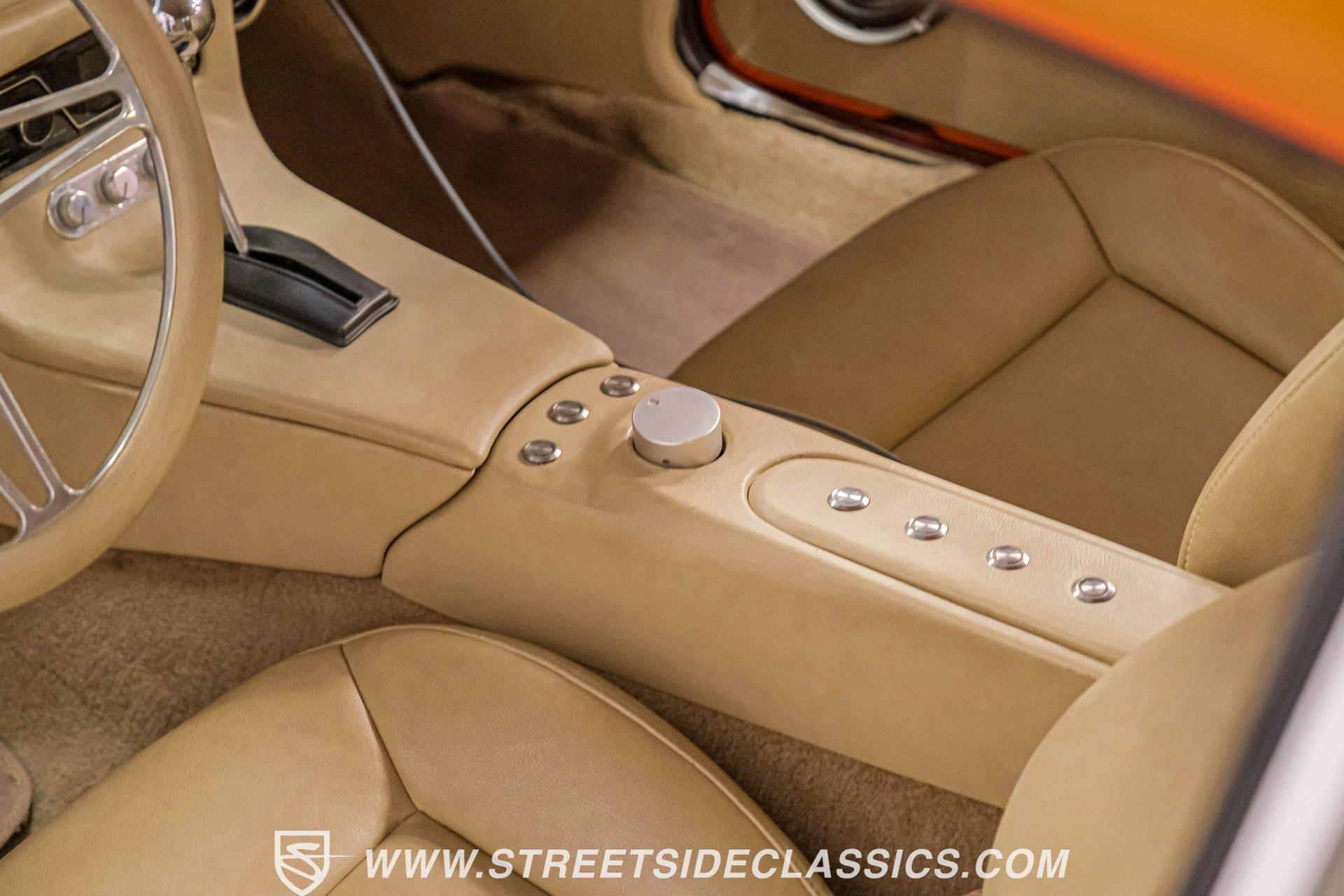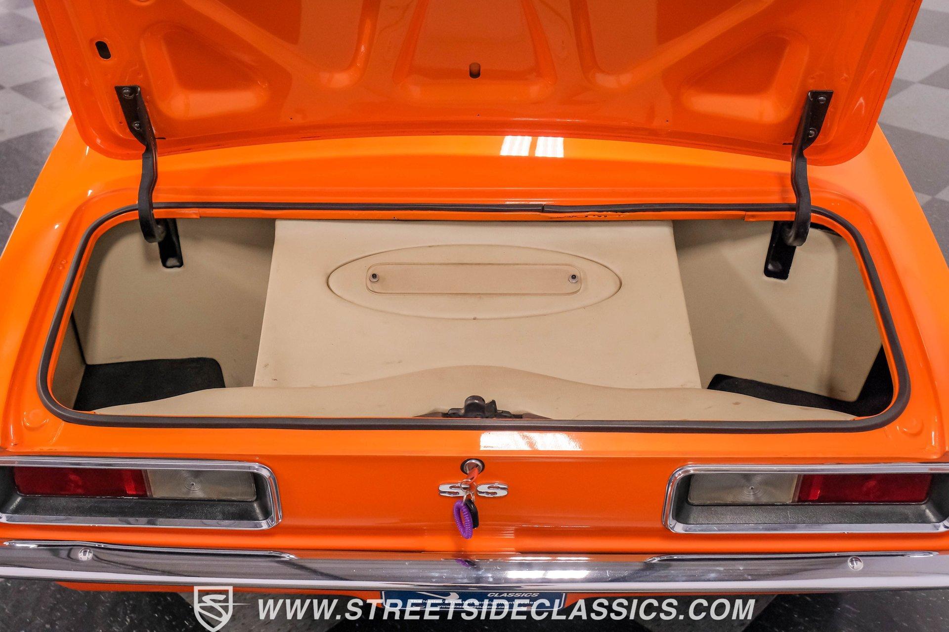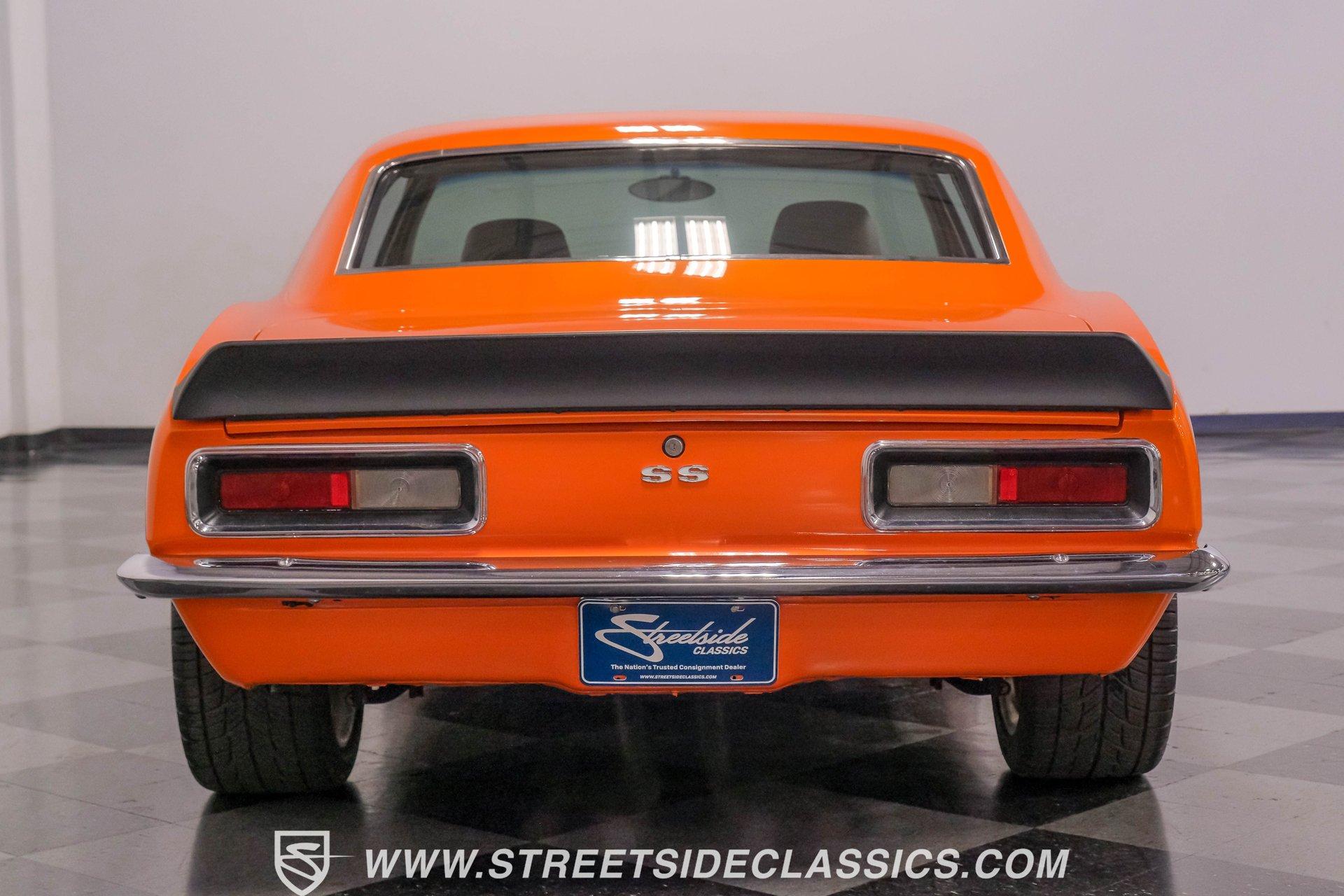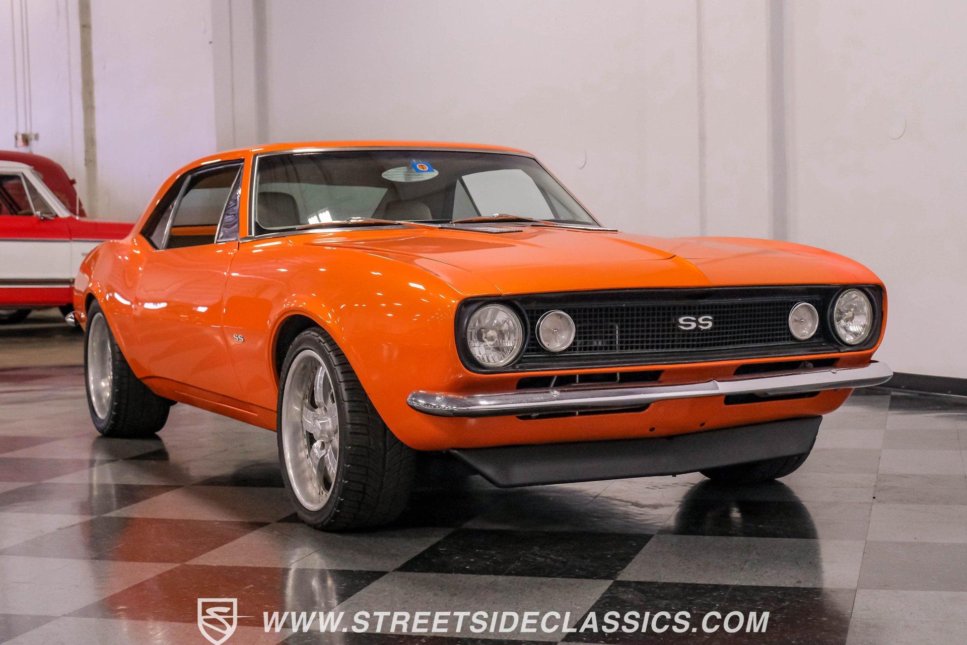 Sunburst Orange Metallic coats every inch of this fully customized 1967 Chevrolet Camaro Restomod, making it a vibrant icon of American muscle gone modern. Built with a tasteful Super Sport hood, front and rear spoilers, deleted side mirrors, and shaved door handles for a cleaner appearance, this Camaro displays custom craftsmanship in every curve. The aggressive stance comes courtesy of SpeedTech tubular upper control arms, while the 18" Bonspeed wheels wrapped in BFG rubber (235/40ZR18 front and 275/40ZR18 rear) anchor this beast firmly to the ground. The shaved drip rails gives this Camaro a sleek, custom profile unlike anything else on the road. The beige leather interior features custom later model bucket seats and a full custom console with cup holders - pure comfort blended with style. The completely custom-built dash houses AutoMeter gauges and a Pioneer head unit connected to JBL speakers and amplifiers throughout (check out what used to be the back seat!). A B&M floor shifter sits ready on the console while the Budnick custom billet steering wheel crowns a tilt billet steering column. Modern amenities include air conditioning, power windows disguised as window cranks, keyless ignition with turn knob to start, and remote door poppers. The trunk has been completely finished out and combines with the back seat equipment for maximum audio impact. Generating power is a GM Goodwrench 350 V8 crate engine equipped with performance aluminum heads and a performance cam. The motor breathes through a Holley Sniper EFI system mounted on an Edelbrock air-gap intake manifold. Power flows through a TH350 3-speed automatic transmission to the 12-bolt rear end. The braking system features Wilwood master cylinder with front disc brakes using Baer calipers and slotted/cross-drilled rotors. Mid-length headers feed into a FlowMaster dual exhaust system, creating the perfect soundtrack. A BeCool radiator keeps temperatures in check during spirited driving sessions. HIGHLIGHTS: GM Goodwrench 350 V8 Crate Engine Performance Aluminum Heads Performance Cam Holley Sniper Electronic Fuel Injection Edelbrock Air-Gap Intake Manifold TH350 3-Speed Automatic Transmission 12-Bolt Rear End Headers with FlowMaster Dual Exhaust Wilwood Master Cylinder Front Disc Brakes Featuring Baer Calipers & Slotted/Cross-Drilled Rotors SpeedTech Tubular Upper Control Arms BeCool Radiator Sunburst Orange Metallic Paint Super Sport Hood 18" Bonspeed Wheels with 235/40ZR18 Front, 275/40ZR18 Rear BFG Tires Beige Interior with Leather Bucket Seats Full Custom Console with Cup Holders B&M Floor Shifter AutoMeter Gauges Pioneer Head Unit JBL Speakers and Amplifiers Budnick Custom Billet Steering Wheel Tilt Billet Steering Column Power Windows Keyless Ignition with Turn Knob Air Conditioning Power Steering A true masterpiece of American muscle with modern comfort and performance, this 1967 Chevrolet Camaro Restomod blends classic style with contemporary technology. With its 350 V8 engine, custom interior, and striking Sunburst Orange Metallic exterior, this Camaro offers an unmatched driving package. Call today!