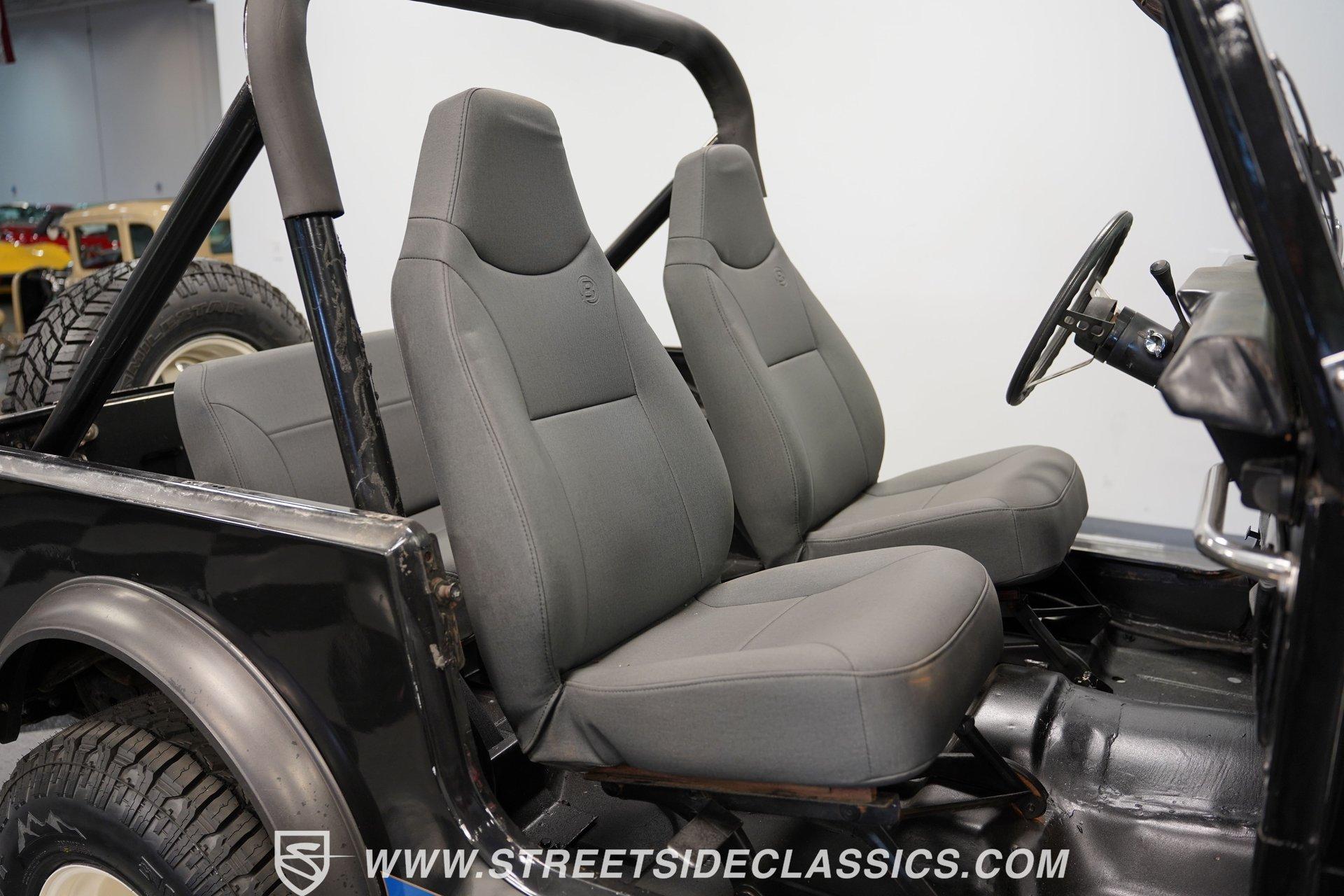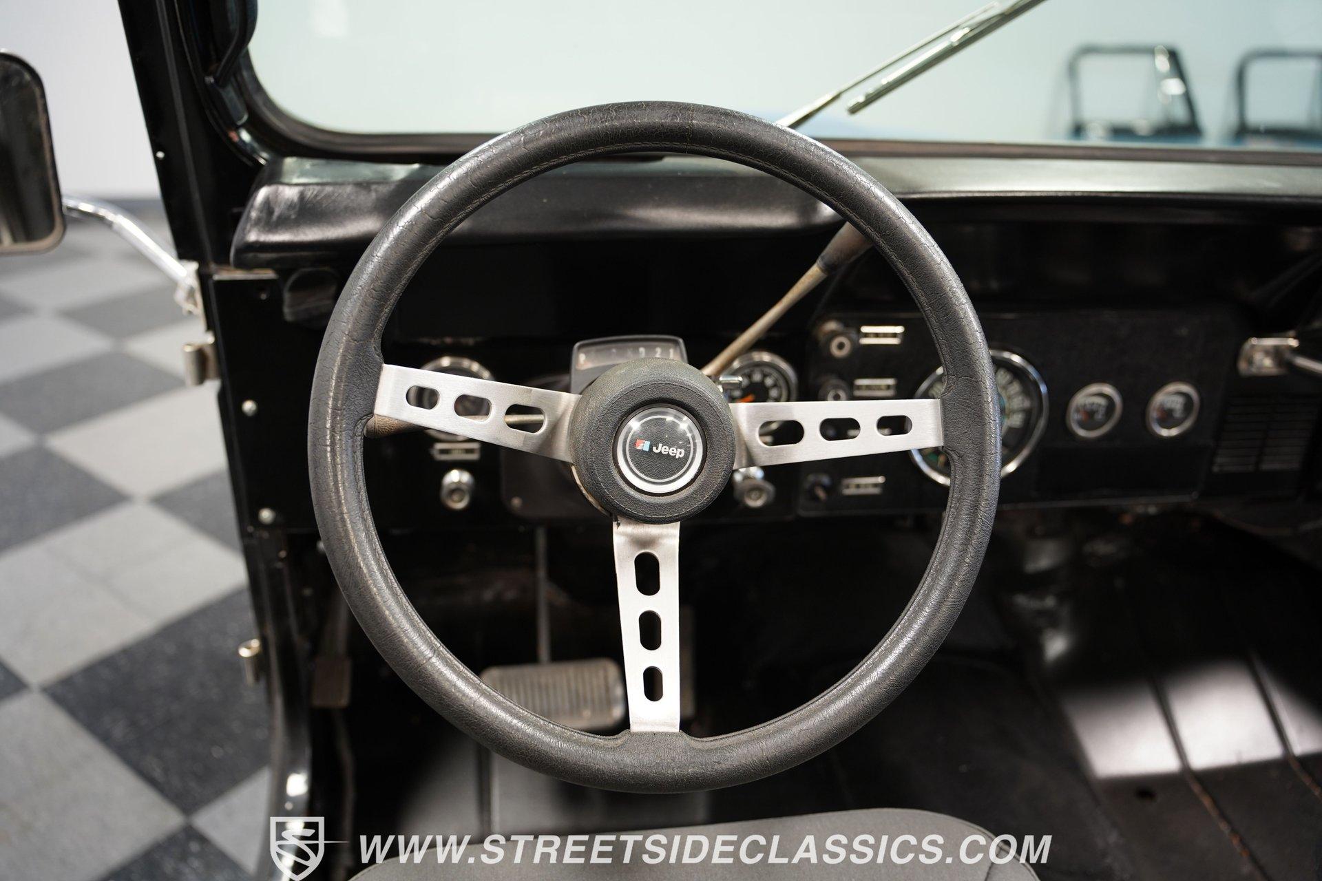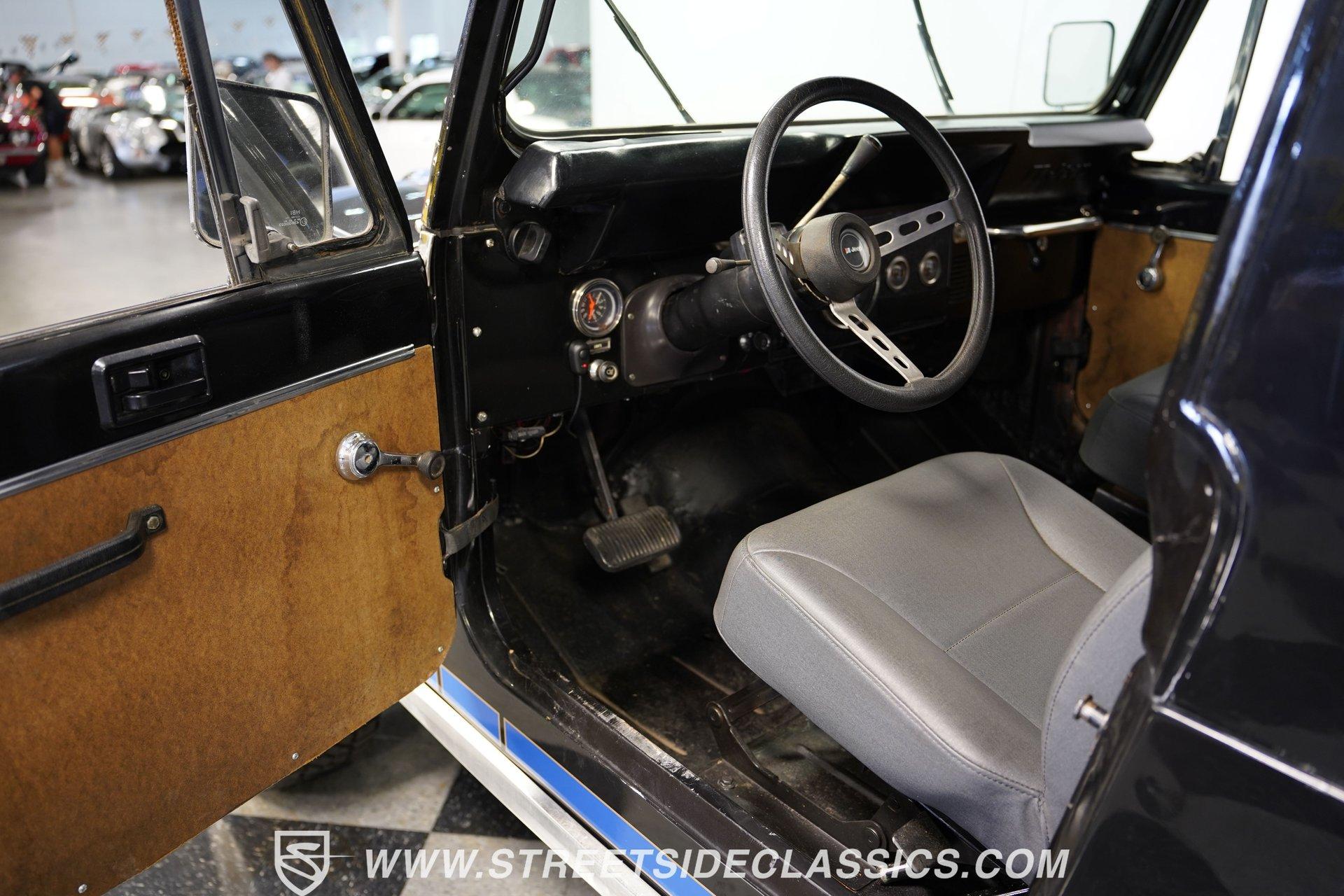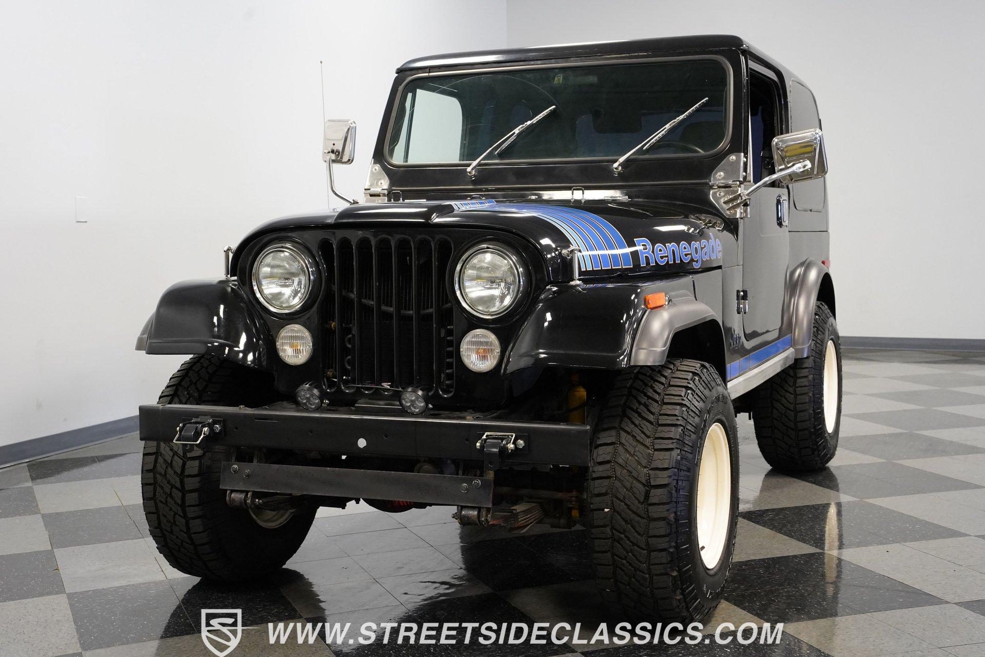 Taken from the army and made for the masses, few trucks can compare with the iconic status of the Civilian Jeep (CJ) series of one of America's favorite vehicles. This 1977 Jeep CJ7 Renegade comes decked out in a deep black exterior paint featuring blue hood and trim graphics to give it even more charisma. Keep its removable hardtop on, and you're ready to take on any weather conditions that come your way. Or, take the top off and enjoy the fun and leisurely side of this off-roading warrior. Inside, this CJ retains its military no-frills personality with the exception of a redone set of front bucket seats that offer far more lateral and lumbar support than its military predecessor. A three-spoke tilt wheel sits before a column-mounted shifter and gear selector. Offset to the wheel's right sits a 6,000-rpm tach, while the larger speedometer and corresponding ancillary gauges sit mid-dashboard. HVAC controls consist of a series of push/pull and twist knobs, making it easy to keep your eyes focused out the upright fold-down windshield. A chrome expletive bar gives the front passenger something to grab onto when the road disappears and their center of gravity begins to shift outside of their comfort zone. Under the hood, we find a big 360 cubic-inch V-8 engine, which has received a new ignition switch to go along with a new single two-barrel carburetor. A set of long tube headers feeds into a true dual exhaust to give this truck a bit more power and sound than its enlisted forebearers. That power is funneled through an AMC version of a TH400 three-speed automatic transmission on its way to all four wheels to give this truck maximum traction. HIGHLIGHTS: *CJ7 Renegade *Removable Hardtop *Removable Soft Top *Four Wheel Drive *360 CID V8 *New Carb *New Ignition Switch *Long Tubes *Dual Exhaust *TH400 Three Speed Auto *Power Brakes *Front Disc Brakes *Power Steering *31 Inch Milstar Tires *Full Sized Spare This 1977 Jeep CJ7 Renegade keeps its authentic feel thanks to leaf springs at the front and rear. Deep fifteen-inch white rims are covered by 31-inch Milstar all-terrain tires, with a fifth full-sized spare mounted just above the rear tow-hitch. If you want to participate in the famous Jeep Wave and also enjoy driving one of the most respected trucks ever made, then don't wait another second; this CJ7 is the one you've been waiting for. Call today!