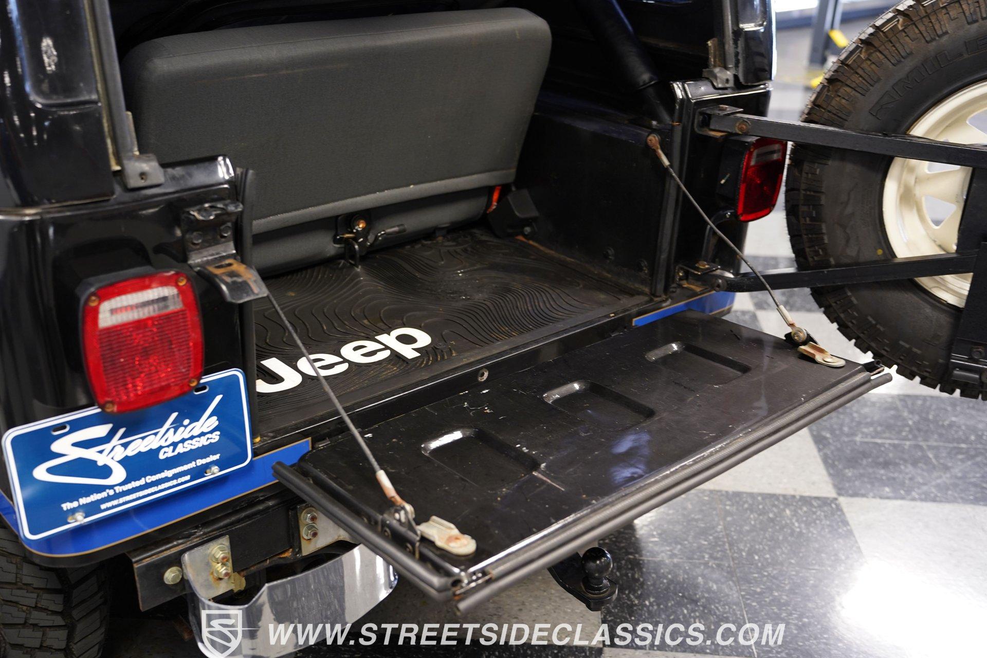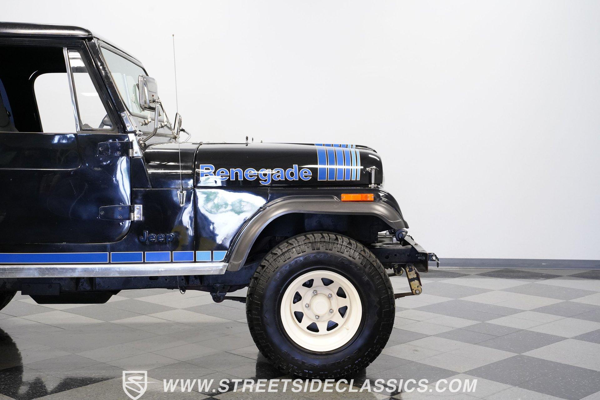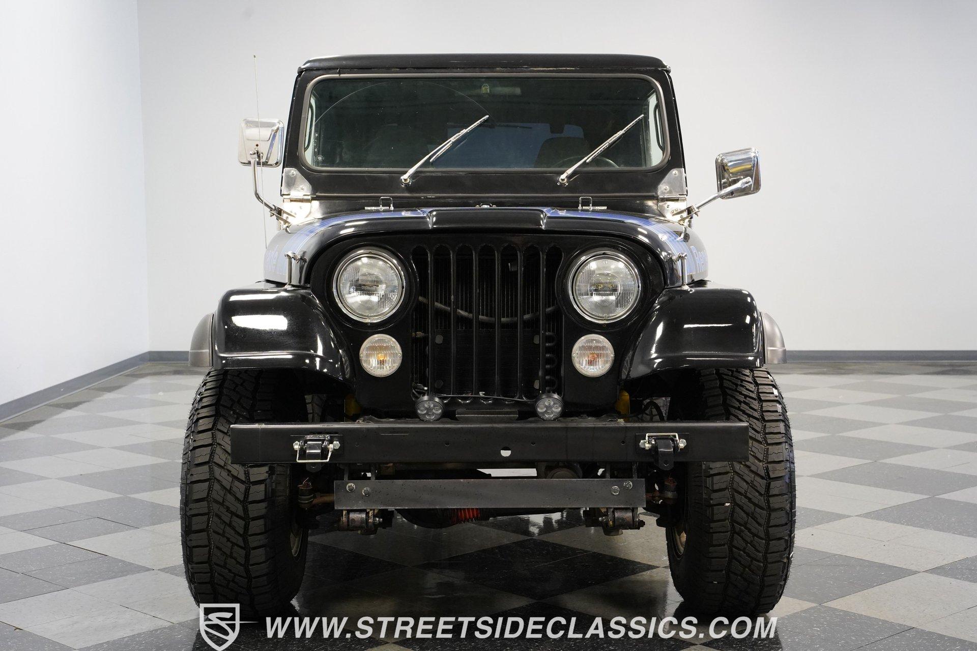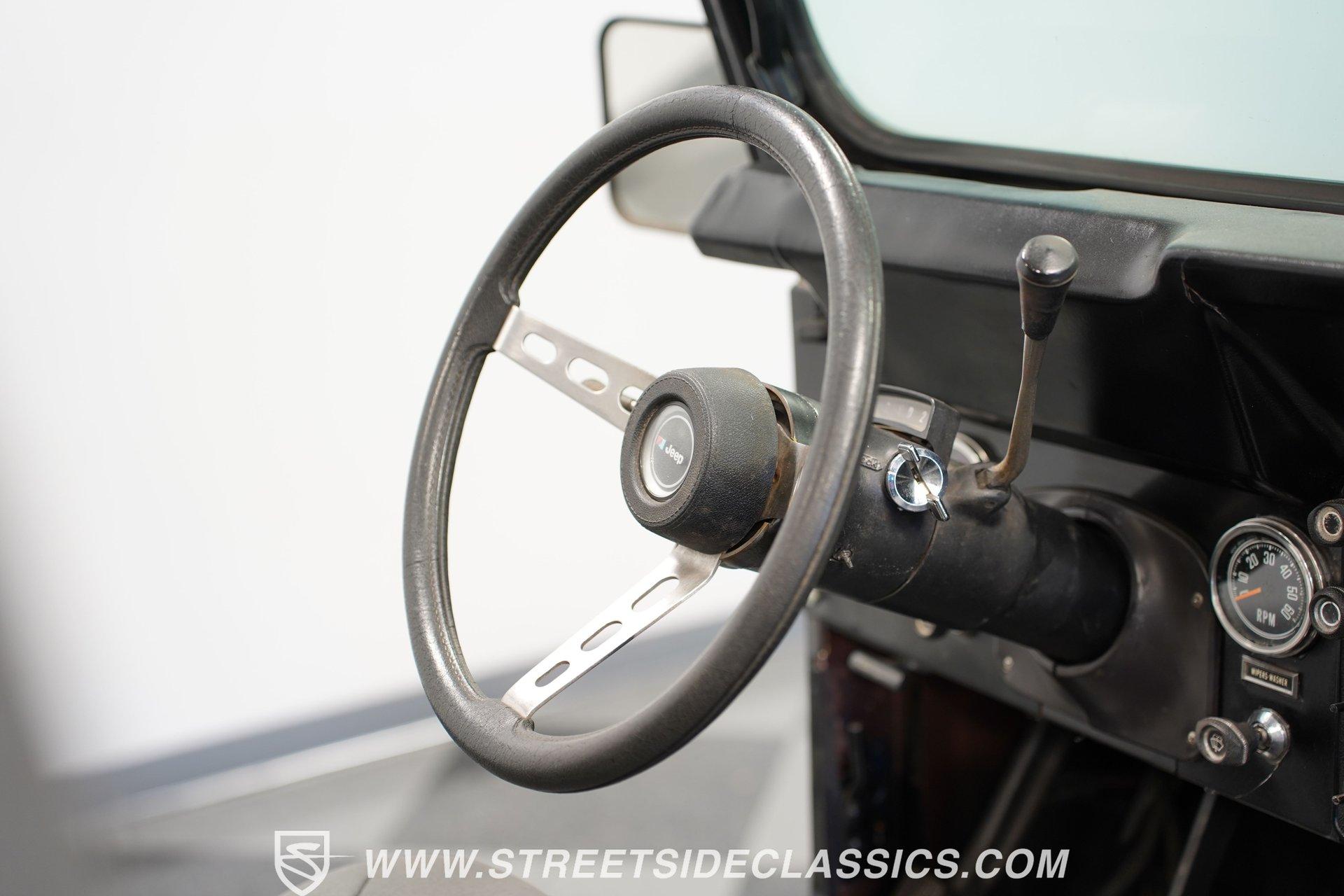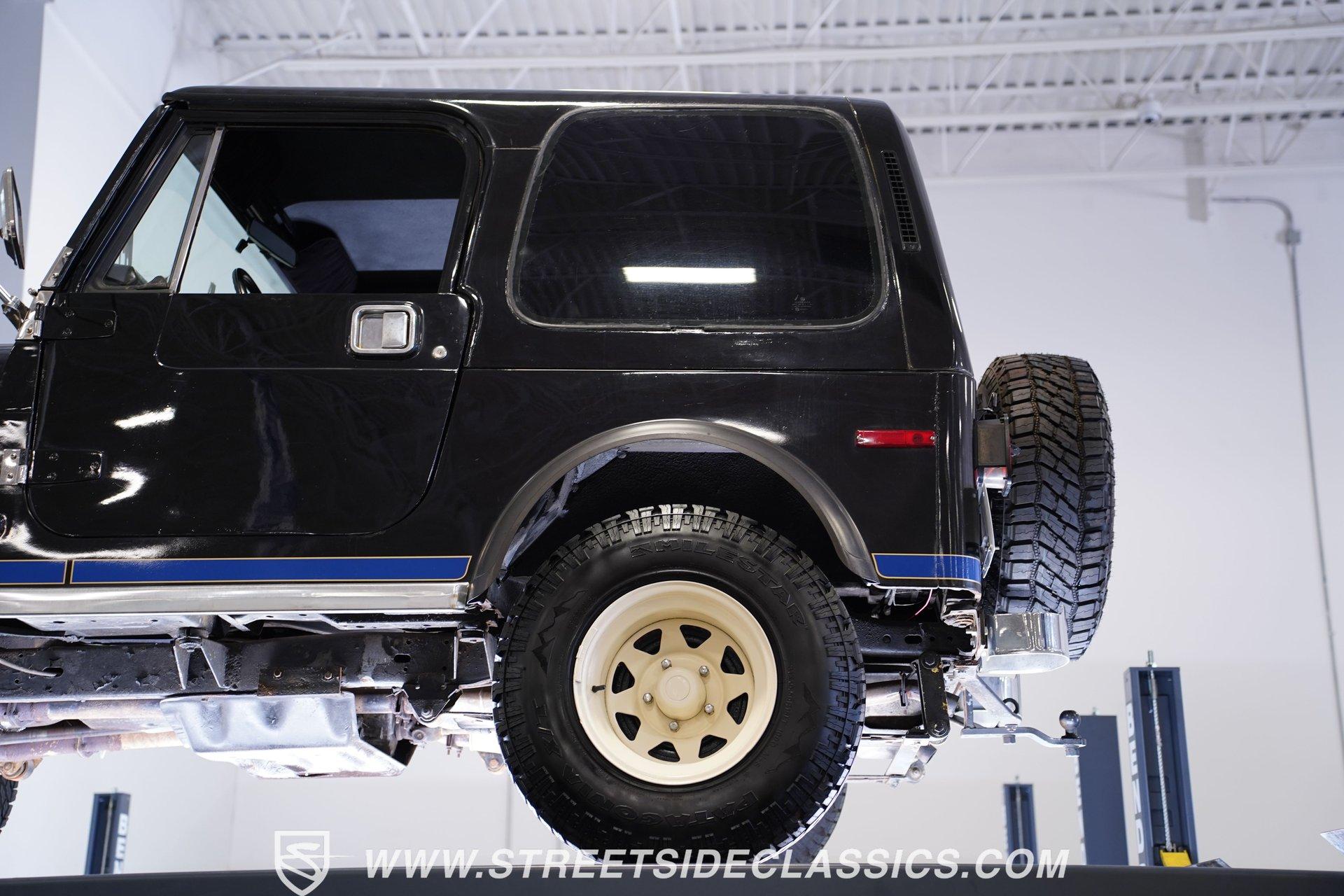 Taken from the army and made for the masses, few trucks can compare with the iconic status of the Civilian Jeep (CJ) series of one of America's favorite vehicles. This 1977 Jeep CJ7 Renegade comes decked out in a deep black exterior paint featuring blue hood and trim graphics to give it even more charisma. Keep its removable hardtop on, and you're ready to take on any weather conditions that come your way. Or, take the top off and enjoy the fun and leisurely side of this off-roading warrior. Inside, this CJ retains its military no-frills personality with the exception of a redone set of front bucket seats that offer far more lateral and lumbar support than its military predecessor. A three-spoke tilt wheel sits before a column-mounted shifter and gear selector. Offset to the wheel's right sits a 6,000-rpm tach, while the larger speedometer and corresponding ancillary gauges sit mid-dashboard. HVAC controls consist of a series of push/pull and twist knobs, making it easy to keep your eyes focused out the upright fold-down windshield. A chrome expletive bar gives the front passenger something to grab onto when the road disappears and their center of gravity begins to shift outside of their comfort zone. Under the hood, we find a big 360 cubic-inch V-8 engine, which has received a new ignition switch to go along with a new single two-barrel carburetor. A set of long tube headers feeds into a true dual exhaust to give this truck a bit more power and sound than its enlisted forebearers. That power is funneled through an AMC version of a TH400 three-speed automatic transmission on its way to all four wheels to give this truck maximum traction. HIGHLIGHTS: *CJ7 Renegade *Removable Hardtop *Removable Soft Top *Four Wheel Drive *360 CID V8 *New Carb *New Ignition Switch *Long Tubes *Dual Exhaust *TH400 Three Speed Auto *Power Brakes *Front Disc Brakes *Power Steering *31 Inch Milstar Tires *Full Sized Spare This 1977 Jeep CJ7 Renegade keeps its authentic feel thanks to leaf springs at the front and rear. Deep fifteen-inch white rims are covered by 31-inch Milstar all-terrain tires, with a fifth full-sized spare mounted just above the rear tow-hitch. If you want to participate in the famous Jeep Wave and also enjoy driving one of the most respected trucks ever made, then don't wait another second; this CJ7 is the one you've been waiting for. Call today!