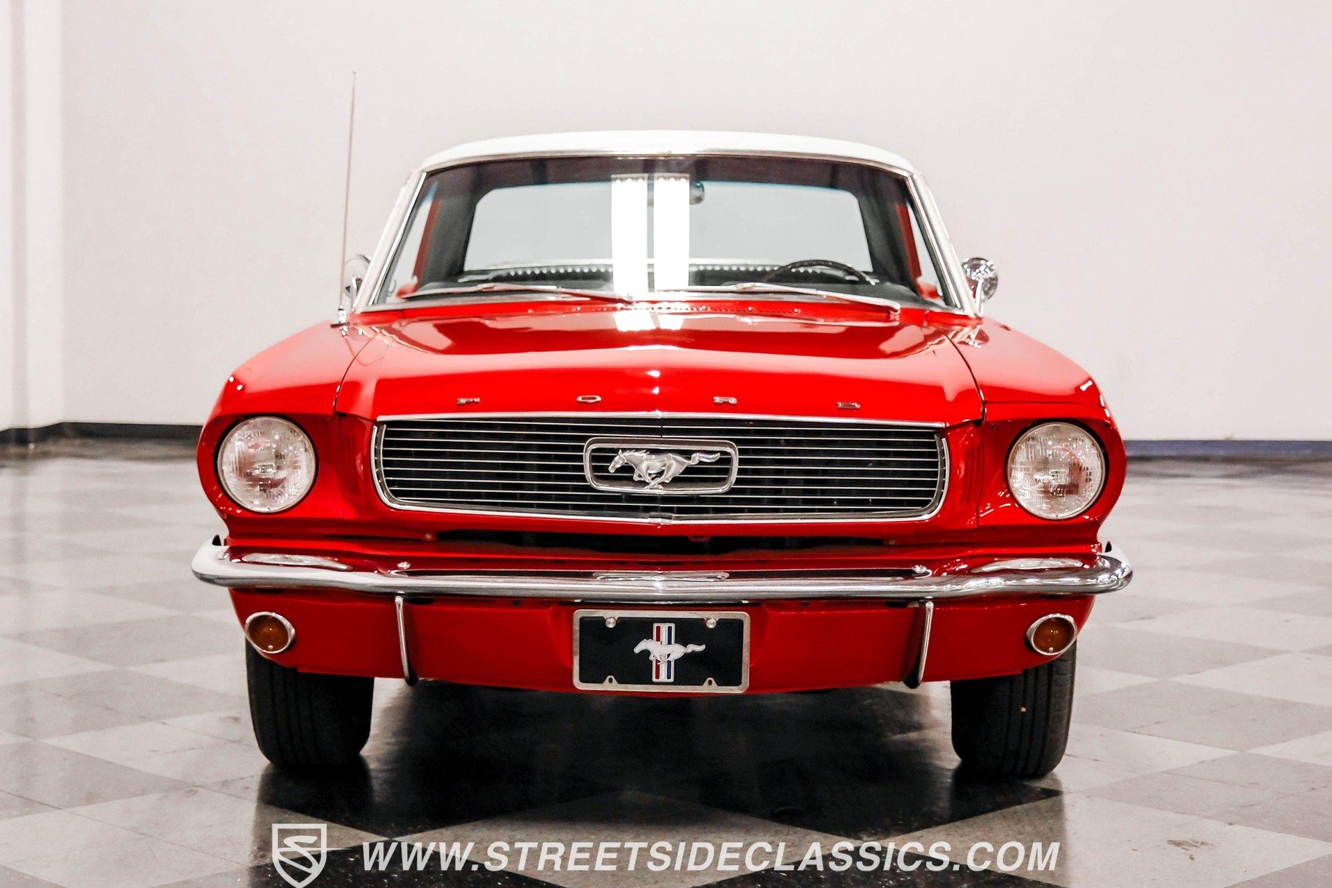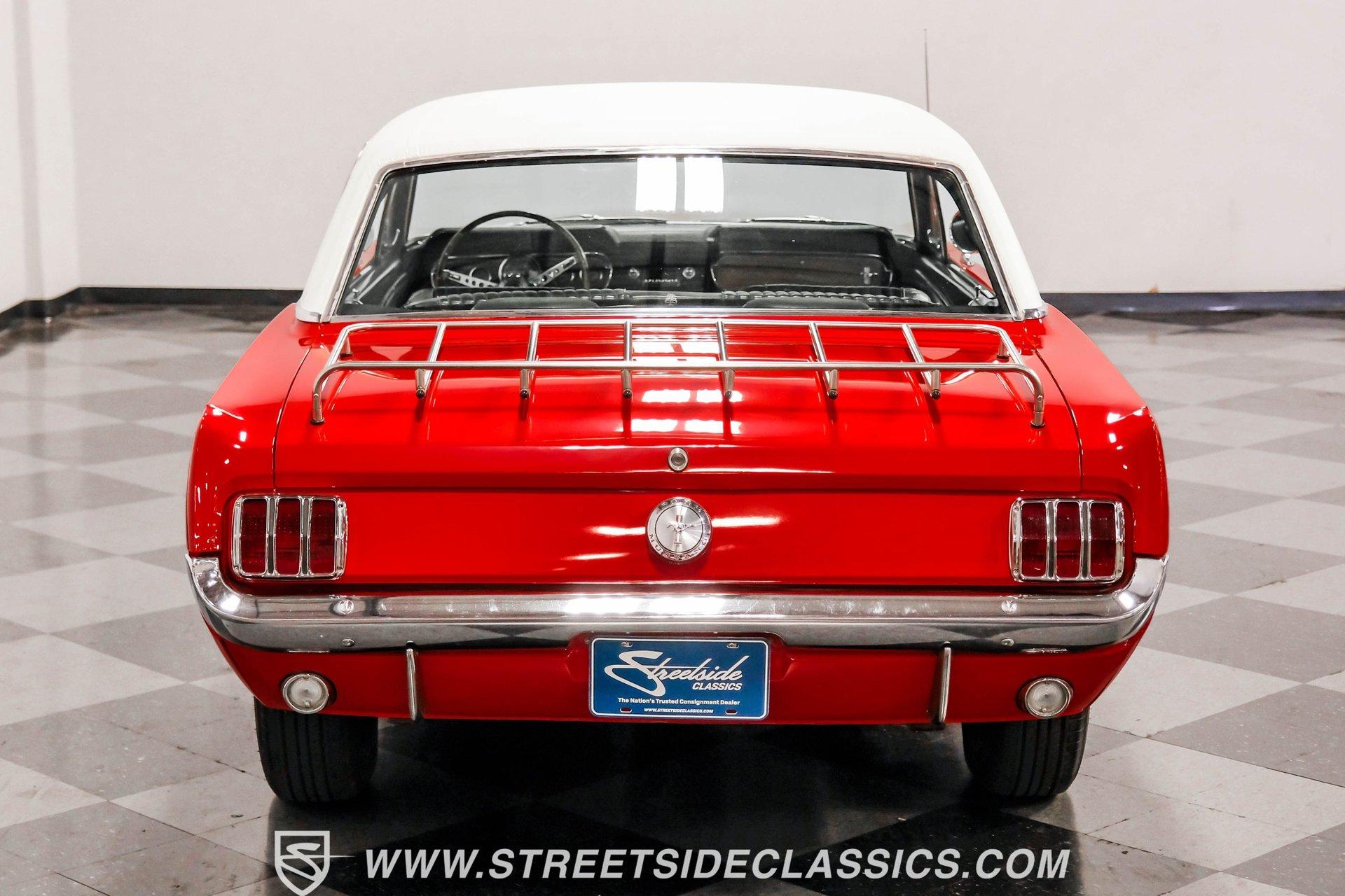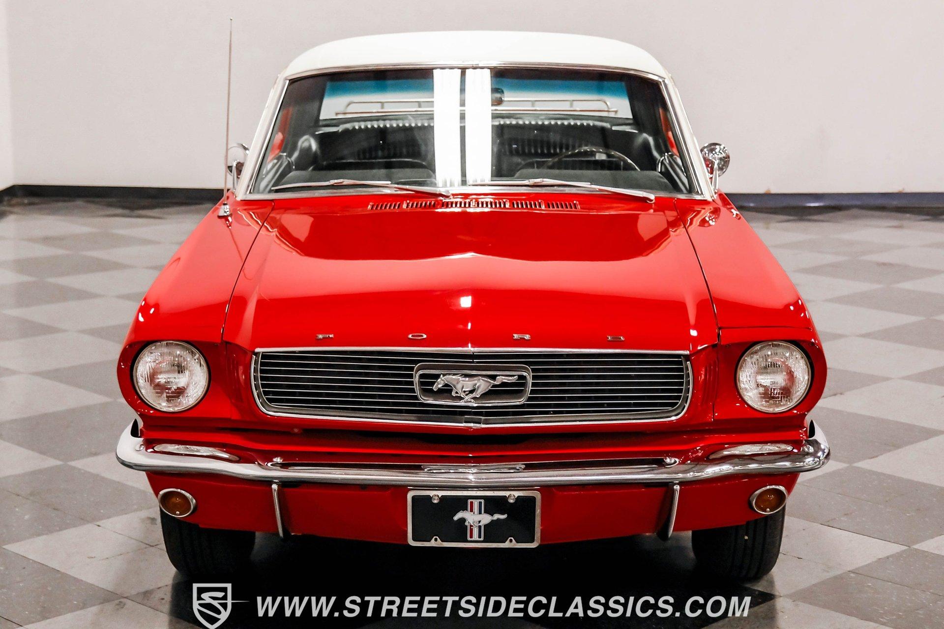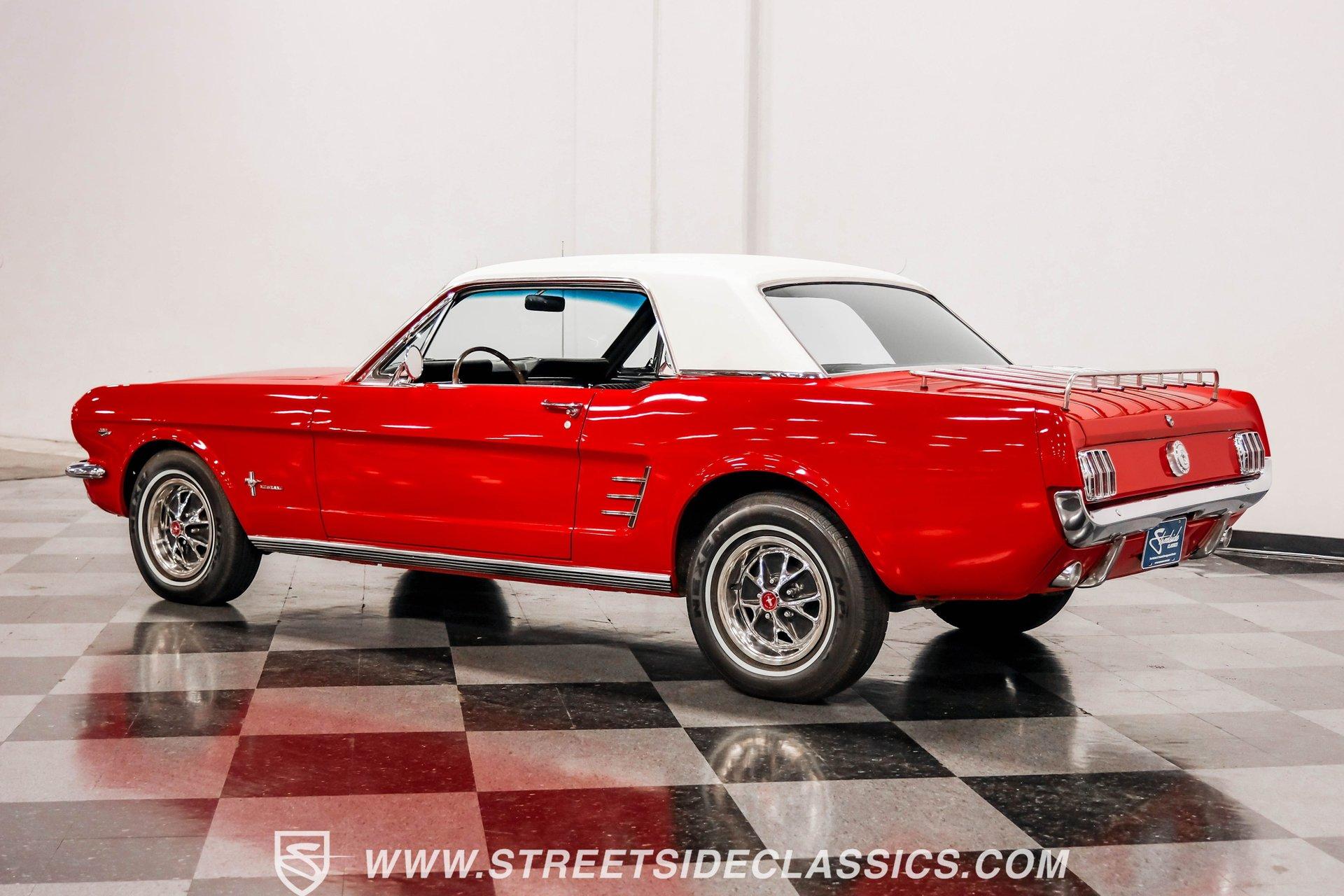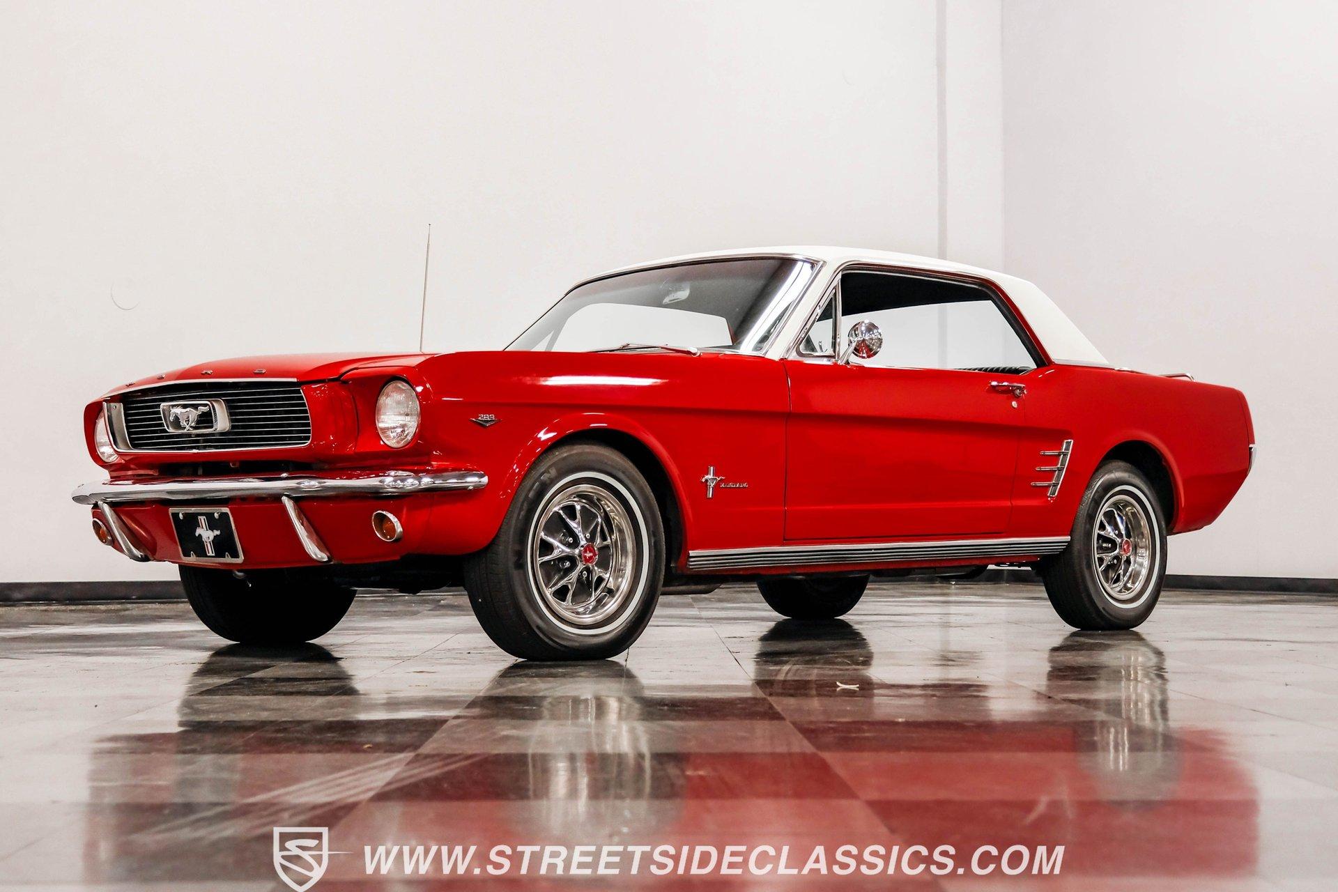 Born in San Jose as a C-code machine, this 1966 Ford Mustang presents a bold red paint job complemented by a contrasting white vinyl top. The combination creates a two-tone visual effect that amplifies the car's classic proportions and flowing lines. Riding on 14-inch wheels wrapped in 205/75R14 Nexen tires, this Mustang maintains both period-correct aesthetics and modern road manners. The functional trunk rack installed on the rear deck provides extra cargo capacity for longer trips without compromising the car's clean silhouette. The black pony interior offers a sporty atmosphere with its bucket seats and center console. A wood-grip steering wheel and digital Retro Sounds AM/FM/AUX radio add both classic aesthetics and modern audio capabilities. The under-dash air conditioning keeps occupants cool during summer drives and factory-style gauges with wood grain trim fill the dash panel. Front and rear seatbelts provide added safety without taking away from the authentic 60s vibe. The 289 cubic inch V8 engine works in tandem with a C4 3-speed automatic transmission for solid acceleration and highway cruising. The Holley four-barrel carburetor improves throttle response while dual exhaust creates that unmistakable V8 sound. Additional mechanical features include power brakes, power steering, and an 8-inch rear end. The engine compartment includes a useful bracer bar for added structural rigidity and Cobra valve covers for a custom look. Floor pan repairs were completed with quality workmanship, creating a solid, road-ready classic. HIGHLIGHTS: 289 V8 Engine 3-Speed Automatic Transmission (C4) Holley 4-Barrel Carburetor Power Brakes Power Steering 8-Inch Rear End Dual Exhaust Cobra Valve Covers Engine Bay Bracer Bar Red Exterior Paint w/ White Vinyl Top 14" Wheels 205/75R14 Nexen Tires Black Interior with Bucket Seats & Center Console Air Conditioning Wood Grip Steering Wheel Digital Retro Sounds AM/FM/AUX Radio Factory-Style Gauges with Wood Grain Trim This 1966 Ford Mustang has long been considered an excellent gateway into classic car ownership. With its 289 V8, automatic transmission, air conditioning, and power options, this example gives you all the right ingredients for weekend drives and car shows. Call today!