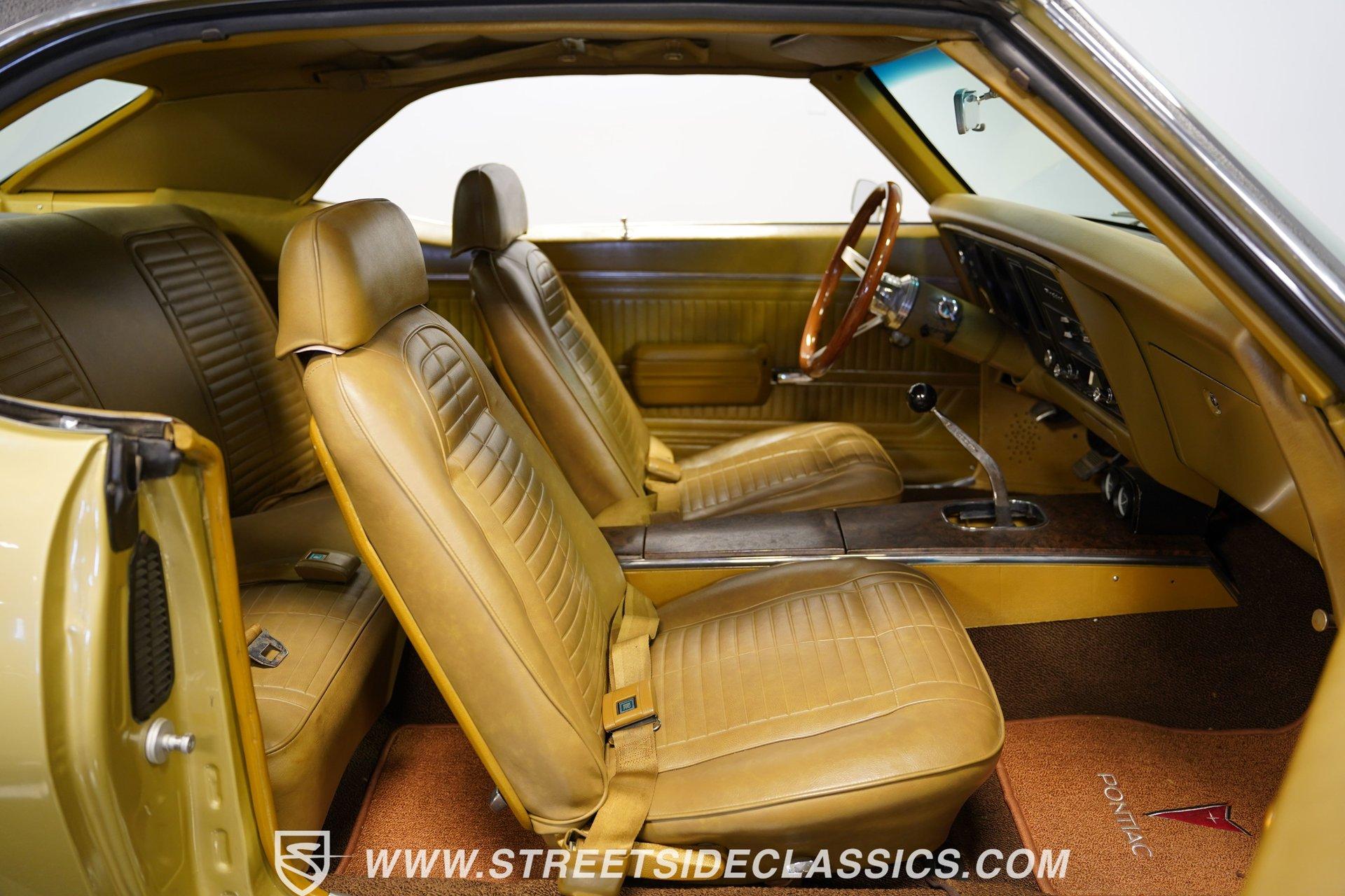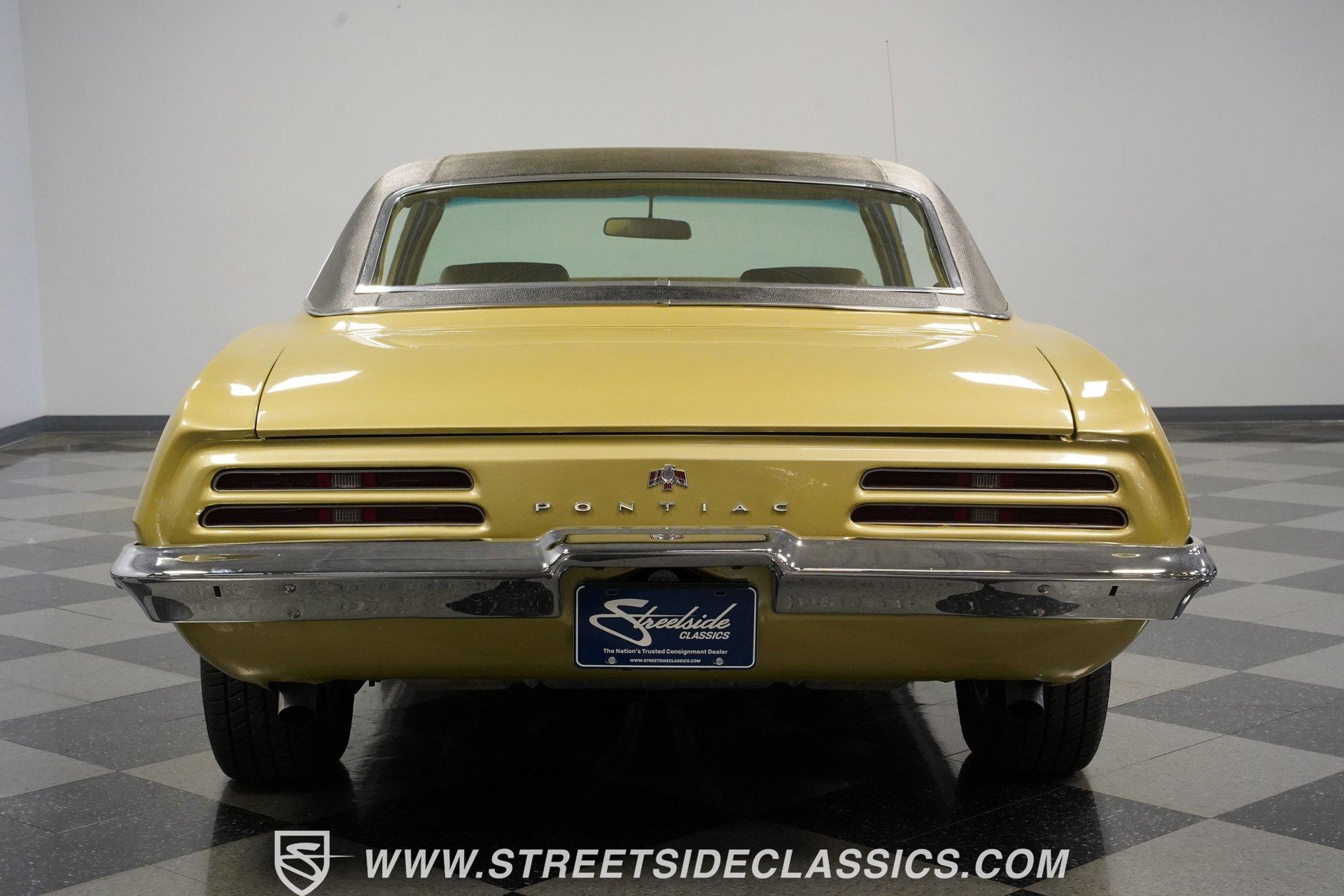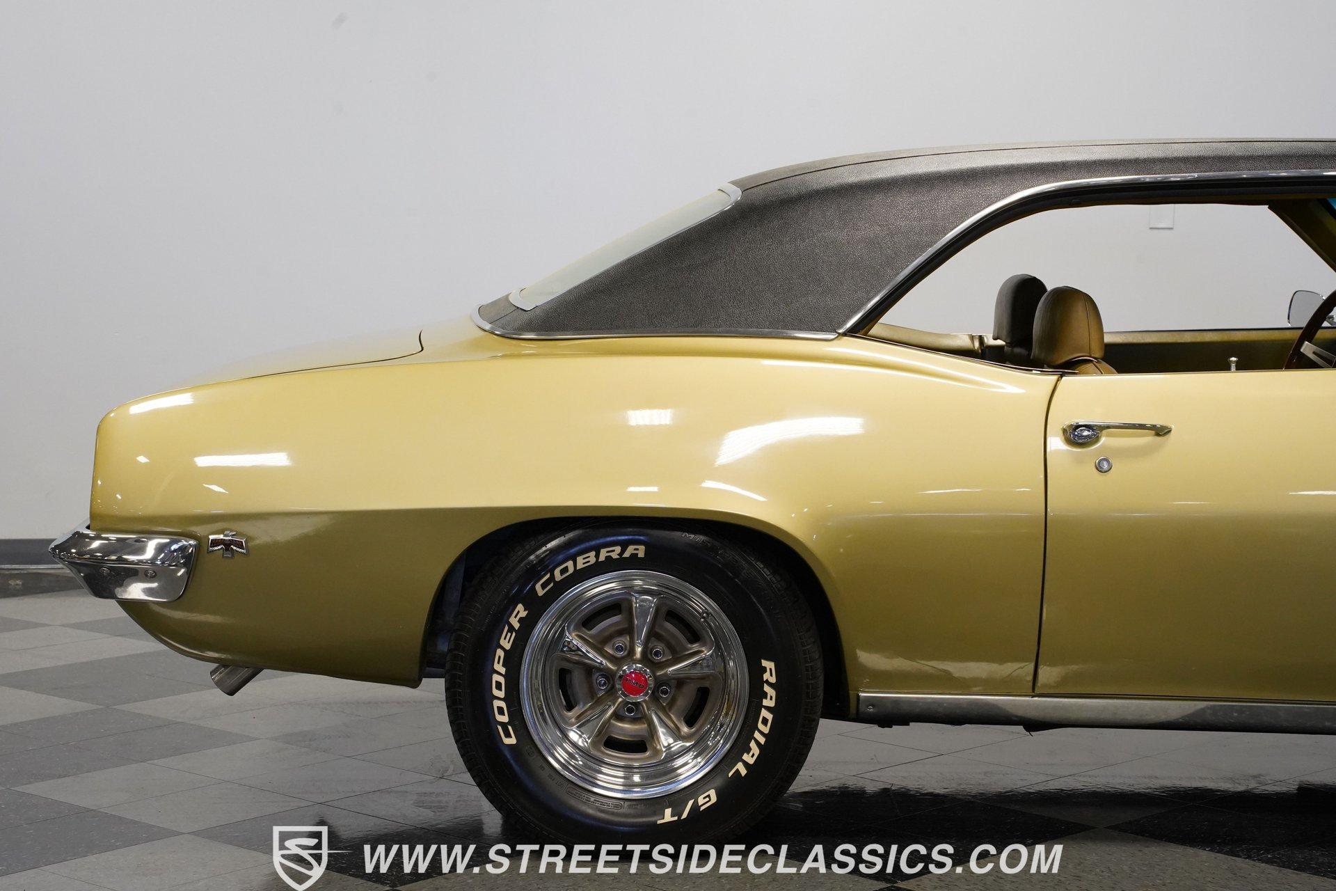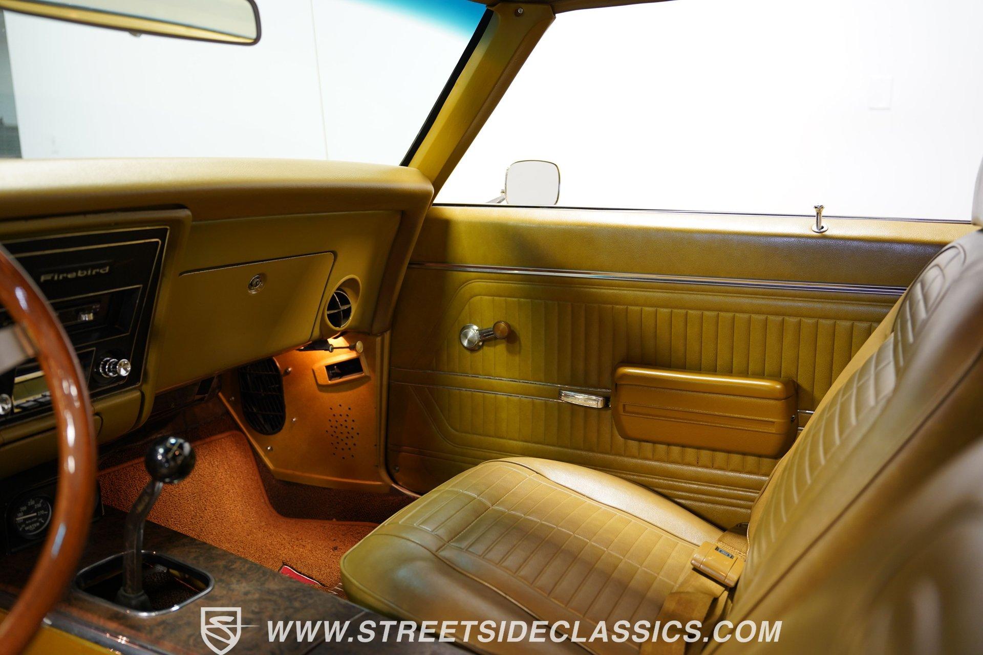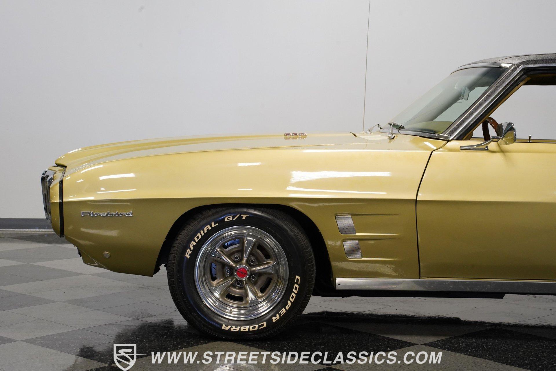 When American muscle flexed in 1969, this Pontiac Firebird came out swinging. The Antique Gold finish displays a measured amount of metal flake that adds dimension without overwhelming the eyes. From the distinctive split-grille nose to the clean rear deck, this Firebird shows off the pure aesthetic that made these cars icons. The vinyl top provides perfect contrast against the gold exterior, completing the look of a true performance machine. Set on 15-inch wheels with 215/65R15 front and 225/70R15 rear tires, this Firebird maintains an ideal stance that suggests speed even when parked. The gold vinyl interior matches the exterior for a complete package. The bucket seats flank a center console where the shifter sits ready for action. A wood steering wheel gives the driver a tactile connection to the road while adding visual flair to the cabin. The dash houses a newer pad along with original-style gauges that allow quick monitoring of vital statistics. The AM/FM radio with aux input provides musical options while cruising. Defroster and heater systems stand ready to make driving comfortable regardless of outside conditions. The 350 cubic inch V8 sits inside a well-organized engine bay, fitted with a Holley four-barrel carburetor and electric choke mounted on a high-rise intake manifold. Chrome valve covers and air cleaner give it extra visual punch. The Muncie M20 4-speed manual transmission connects to a solid 10-bolt rear end. Performance upgrades include tubular front arms and a Hotchkis rear sway bar for improved handling. The braking system features power disc brakes for strong stopping ability. The exhaust flows through long tube manifolds and a dual-to-single-to-dual system with aftermarket mufflers for an appropriate exhaust note. HIGHLIGHTS: 350 V8 Engine Muncie M20 4-Speed Manual Transmission Holley Four Barrel Carburetor with Electric Choke High Rise Intake Manifold Chrome Valve Covers Chrome Air Cleaner 10-Bolt Rear End Tubular Front Arms Hotchkis Rear Sway Bar Power Front Disc Brakes Long Tube Manifolds Dual to Single to Dual Exhaust System Aftermarket Mufflers Aluminum Radiator with Electric Fan Antique Gold Paint Vinyl Top 15" Wheels 215/65R15 Front & 225/70R15 Rear Tires Gold Interior with Bucket Seats and Console Console Shifter Power Steering Wood Steering Wheel AM/FM Radio with Aux Input Newer Dash Pad This 1969 Pontiac Firebird 400 combines V8 power with the control of a manual transmission and wrapped in a classic design. The upgraded suspension components enhance handling while the exhaust system provides an appropriate soundtrack for such a capable machine. Call today!