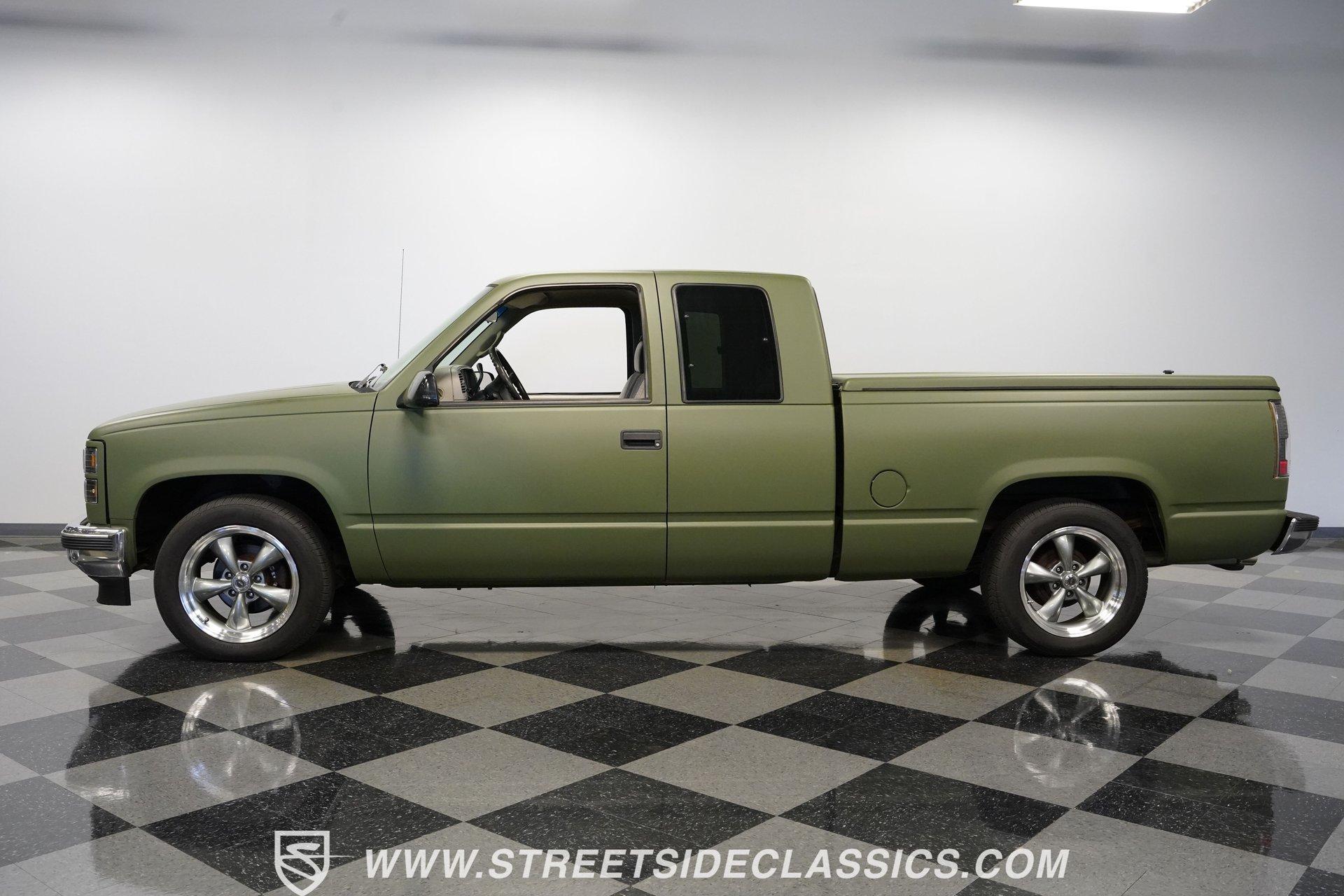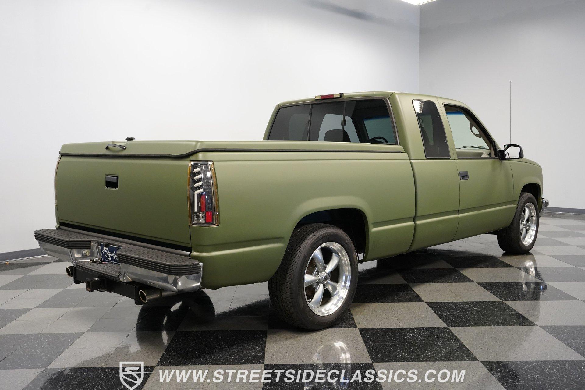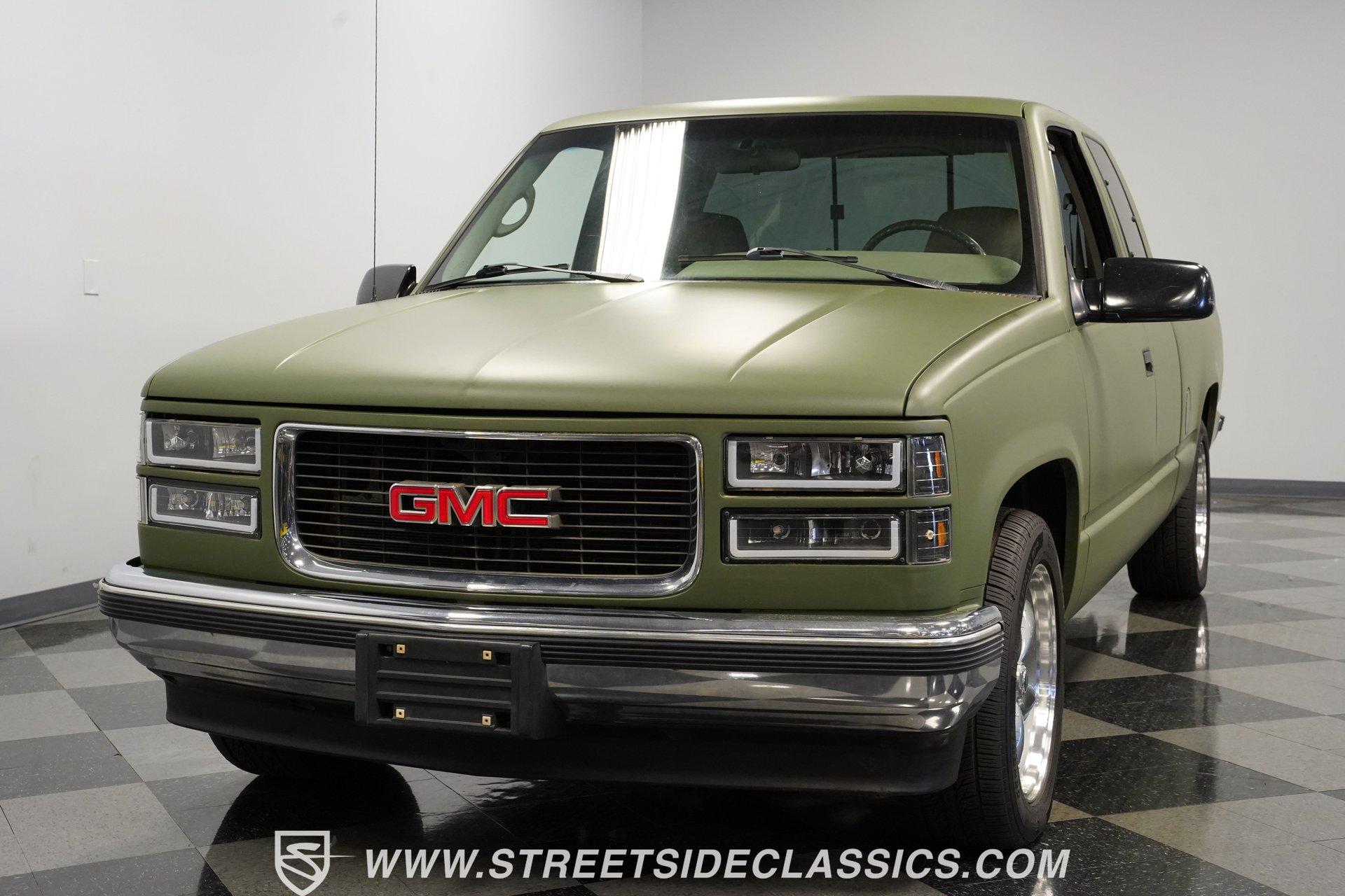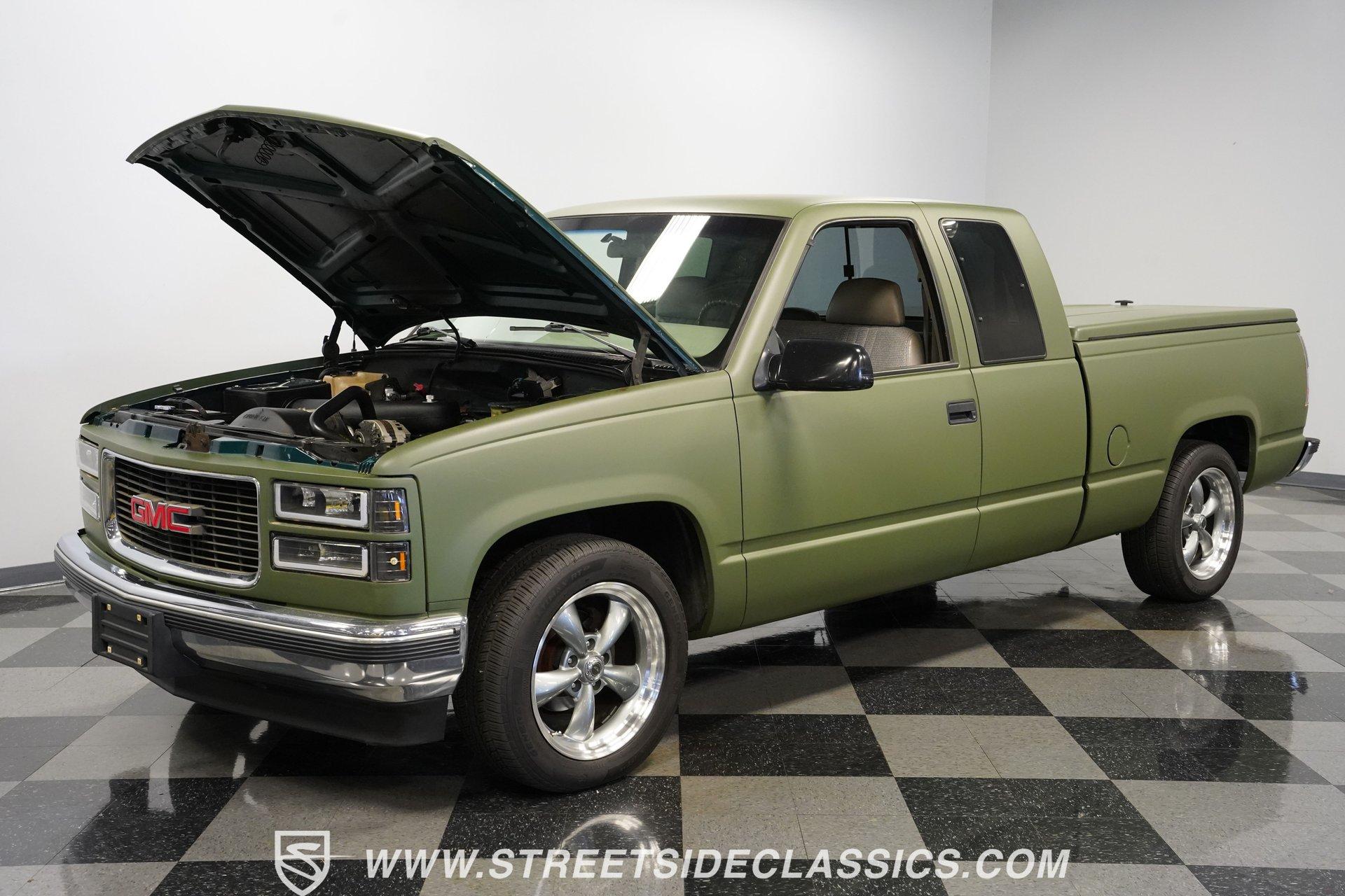 Military-inspired matte green vinyl wrap gives this 1995 GMC Sierra 1500 Extended Cab an unmistakable presence on the street or job site. The bold color choice works exceptionally well with the truck's angular body lines and extended cab profile. American Racing 18-inch wheels provide an upgraded stance, wrapped in meaty 245/55R18 tires for improved grip and visual appeal. The hard bed cover adds practicality for hauling gear while maintaining clean lines from front to back. Aftermarket headlights and taillights bring modern lighting technology, while dual chrome exhaust tips peek out from under the rear, hinting at the V8 soundtrack this truck produces when you push the accelerator. Jump into the gray cloth split-bench seat and you'll find yourself in a straightforward, no-nonsense workspace built for getting things done. The SONY touchscreen radio breaks up the classic dashboard with modern tech, offering Bluetooth connectivity and auxiliary inputs for your music. Long drives are made more comfortable with air conditioning to keep you cool, cruise control for highway stretches, and a tilt wheel for proper driving position. Carbon fiber door seal accents add a custom touch that contrasts nicely with the gray interior theme. The doors shut with a satisfying thunk that only solid American trucks can deliver. Muscle matters in a proper work truck, and the rebuilt 5.7 Liter V8 under the hood delivers with only 4,000 miles on the clock since its overhaul. The electronic fuel injection system fires up reliably in all weather conditions, while the equally fresh 4L60E 4-speed automatic transmission shifts with authority. Dual exhaust with aftermarket mufflers produces a growl worthy of a truck this size, and shorty manifolds help that V8 breathe more efficiently. The 10-bolt rear axle puts the power down when you need it, while the coil spring front and leaf spring rear suspension setup handles both empty highway cruising and loaded work duties with equal capability. HIGHLIGHTS: 5.7 Liter V8 Engine Engine Rebuilt (4,000 miles ago) 4 Speed Automatic 4L60E Transmission Transmission Rebuilt (4,000 miles ago) Electronic Fuel Injection Power Front Disc Brakes Dual Exhaust with Aftermarket Mufflers Shorty Manifolds 10 Bolt Rear Axle Coil Spring/Shock/Sway Bar Front Suspension Leaf Springs with Shocks Rear Suspension Matte Green Vinyl Wrap Hard Bed Cover 18" American Racing Wheels with 245/55R18 Tires Aftermarket Headlights Aftermarket Taillights Dual Chrome Exhaust Tips Gray Interior with Split-Bench Seat Air Conditioning Cruise Control Power Steering Tilt Wheel SONY Bluetooth, Auxiliary, Satellite Radio Backup Camera Original Window Sticker Service Receipts HD Trailering Package This 1995 GMC Sierra 1500 combines raw V8 power with modern upgrades for both style and function. With a freshly rebuilt drivetrain, tactical matte green exterior, and tech-updated interior, this truck is ready to tackle your daily duties and weekend adventures with equal skill. Call today!