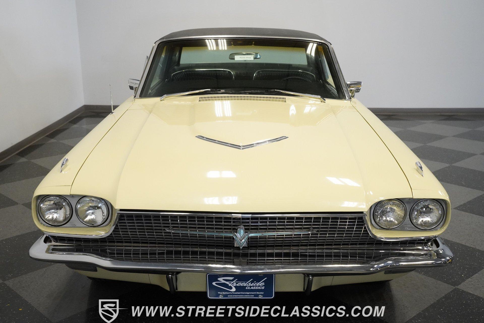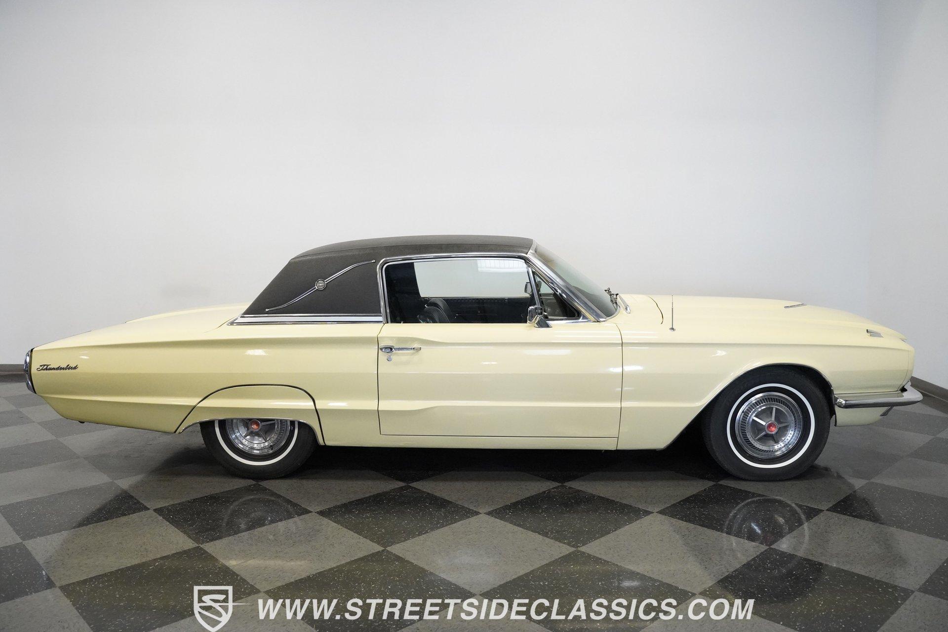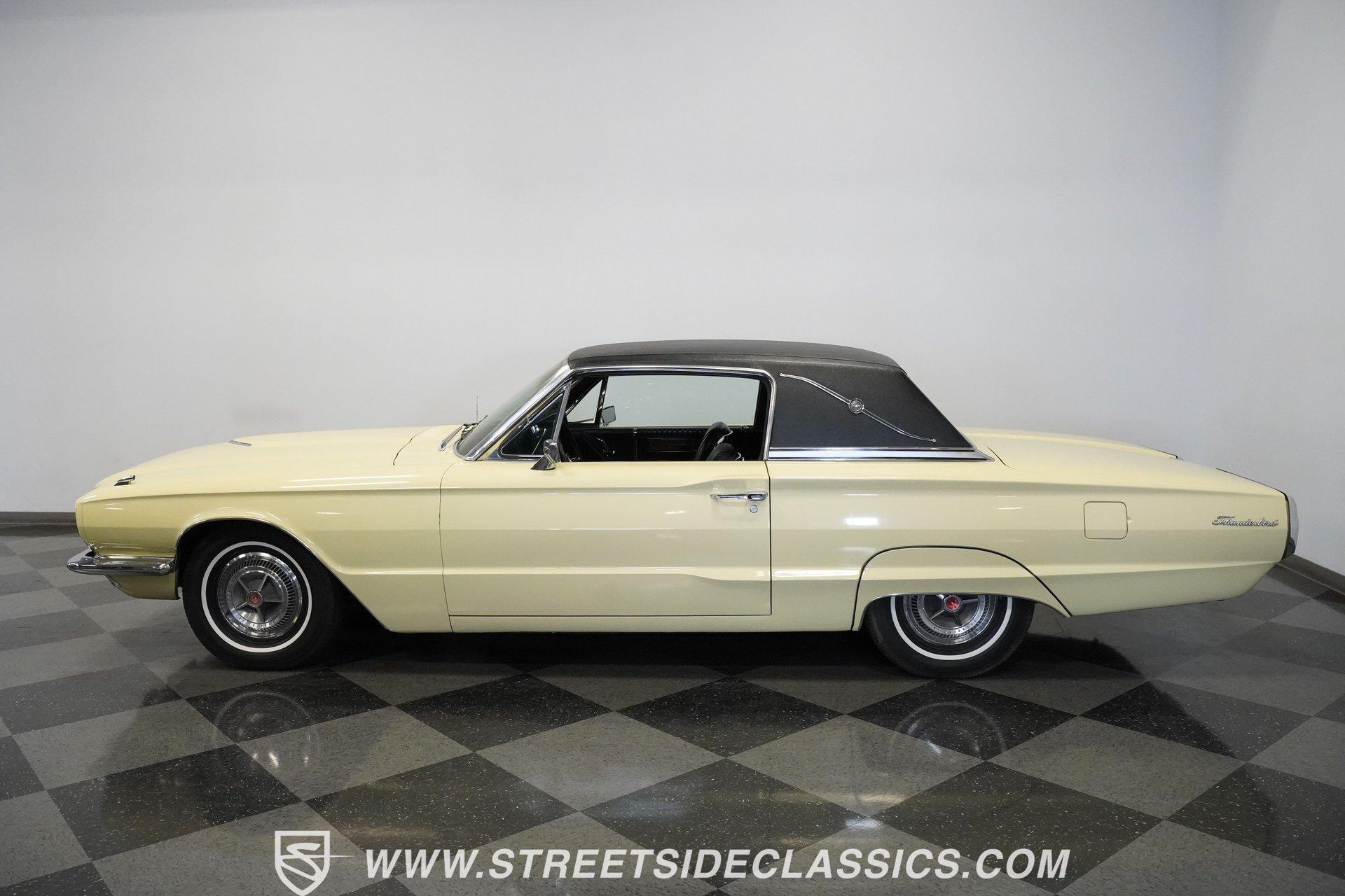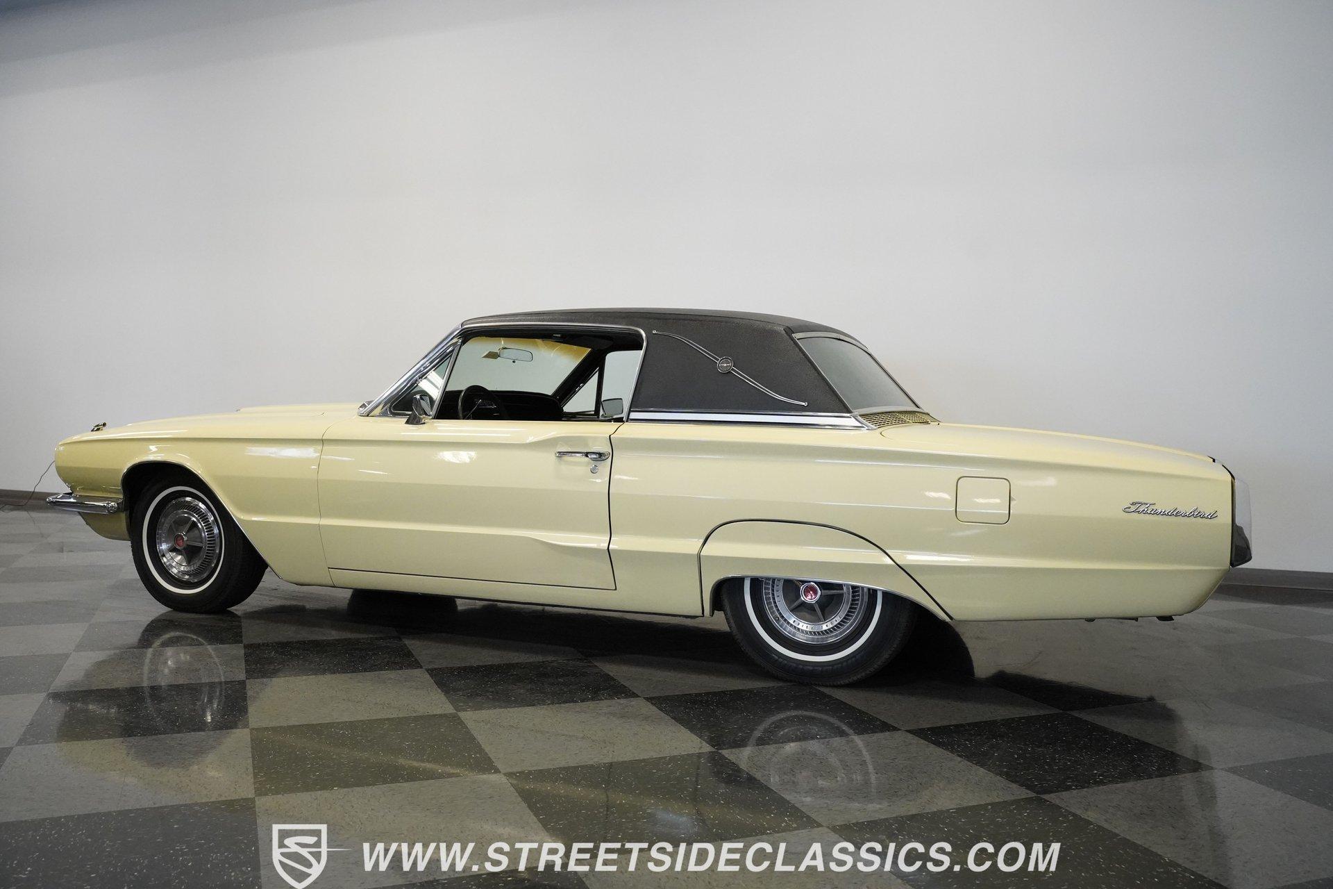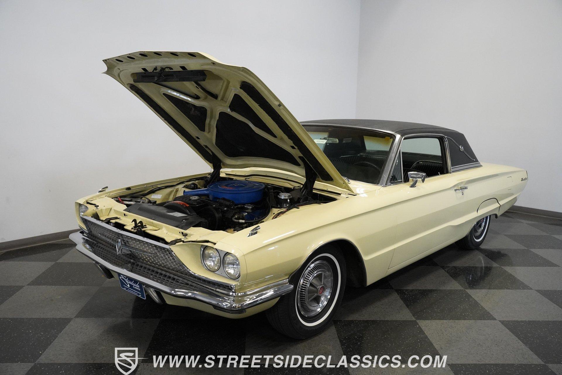 4225-PHX 1966 FORD THUNDERBIRD LANDAU Ford's elite personal luxury coupe shines in Ivy Yellow, a rare factory color choice that makes this 1966 Thunderbird Landau stand out from typical examples. The distinctive black vinyl Landau roof creates a striking two-tone effect against the vibrant yellow exterior. This special town roof body style features no rear quarter windows, giving it a cleaner, more exclusive silhouette. The classic lines flow seamlessly from the imposing front grille back to the horizontal taillights. Rolling on 15" steel wheels with factory wheel covers and Bridgestone Insignia SE200 215/75R15 tires, this Thunderbird balances luxury and presence. Black vinyl interior creates a sophisticated atmosphere inside this Thunderbird. The bucket seats provide excellent support, while the overhead console adds an exclusive touch unique to the Landau package. A column-mounted shifter maintains the clean cabin layout, complemented by a functional center console. The instrument cluster presents clear readouts behind the factory steering wheel. Air conditioning, power windows, power locks, and power seats deliver expected Thunderbird luxury features, while the AM radio provides period-correct entertainment. The dash, carpet, and headliner maintain their classic Ford design. The 390 V8 engine delivers authoritative power through the smooth-operating 3-speed FMX automatic transmission. An Autolite 4-barrel carburetor manages fuel delivery efficiently. The independent front suspension with control arms and coil springs pairs with a solid 9-inch rear axle with leaf springs for a solid foundation. Power steering makes navigating this substantial luxury coupe effortless. Power brakes with front discs provide superior stopping capability. The dual exhaust with aftermarket mufflers produces a refined exhaust note fitting of this luxury model. HIGHLIGHTS: 390 V8 Engine 3 Speed FMX Automatic Transmission Single 4-Barrel Autolite Carburetor Power Steering Power Front Disc Brakes Independent Front Suspension with Control Arms and Coil Springs Solid Axle Rear Suspension with Leaf Springs 9-inch Rear Axle Dual Exhaust with Aftermarket Mufflers Ivy Yellow Paint Black Vinyl Landau Roof 15" Steel Wheels with Thunderbird Wheel Covers 215/75R15 Bridgestone Insignia SE200 Tires Black Interior with Bucket Seats Power Seats Column Shifter Center Console Air Conditioning Power Windows Power Locks AM Radio Among Ford's most distinctive luxury designs, this 1966 Thunderbird Landau combines the rare Ivy Yellow paint, black vinyl roof, comfortable black interior, and reliable 390 V8 power. A true personal luxury coupe from the golden age of American automotive design. Call today!