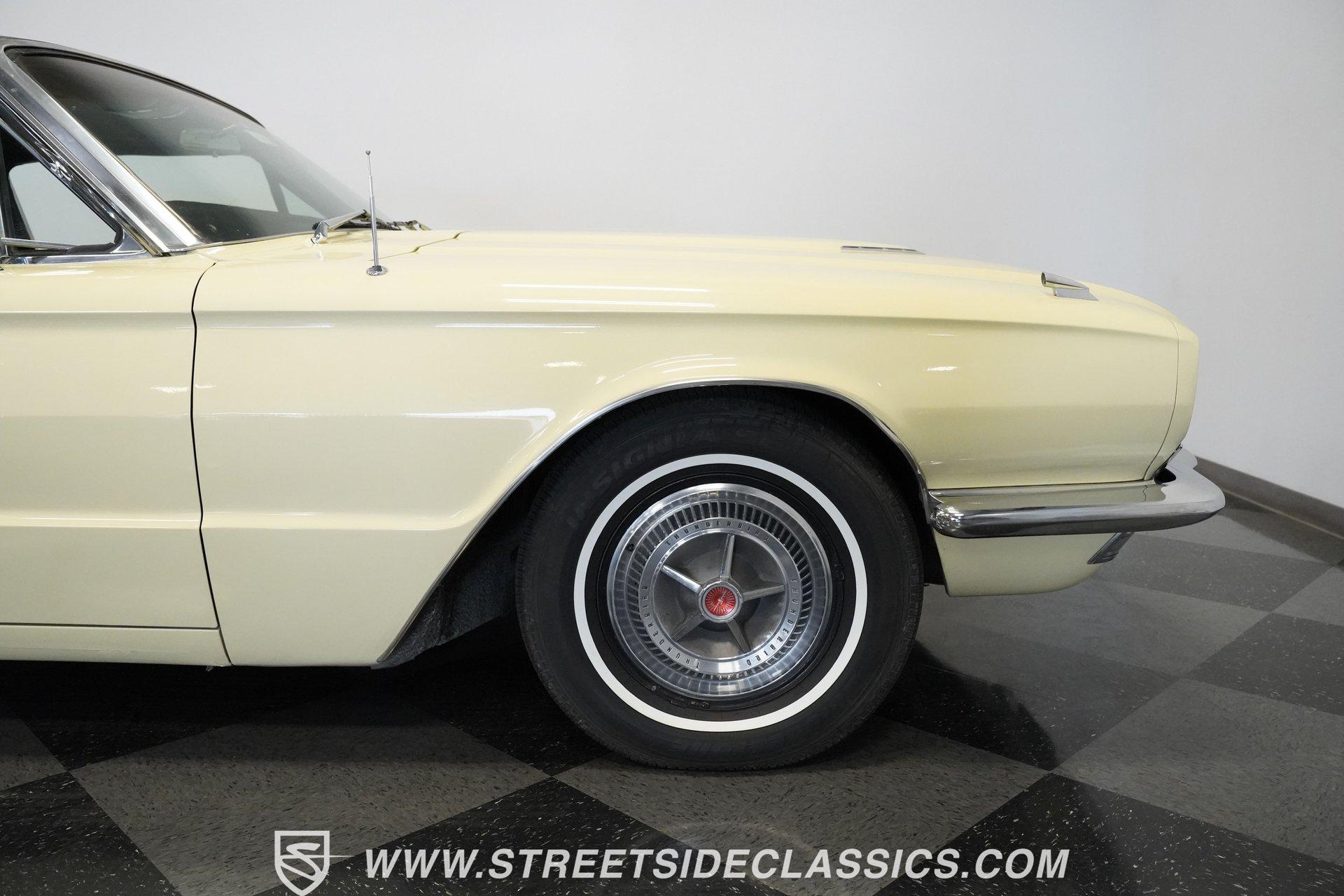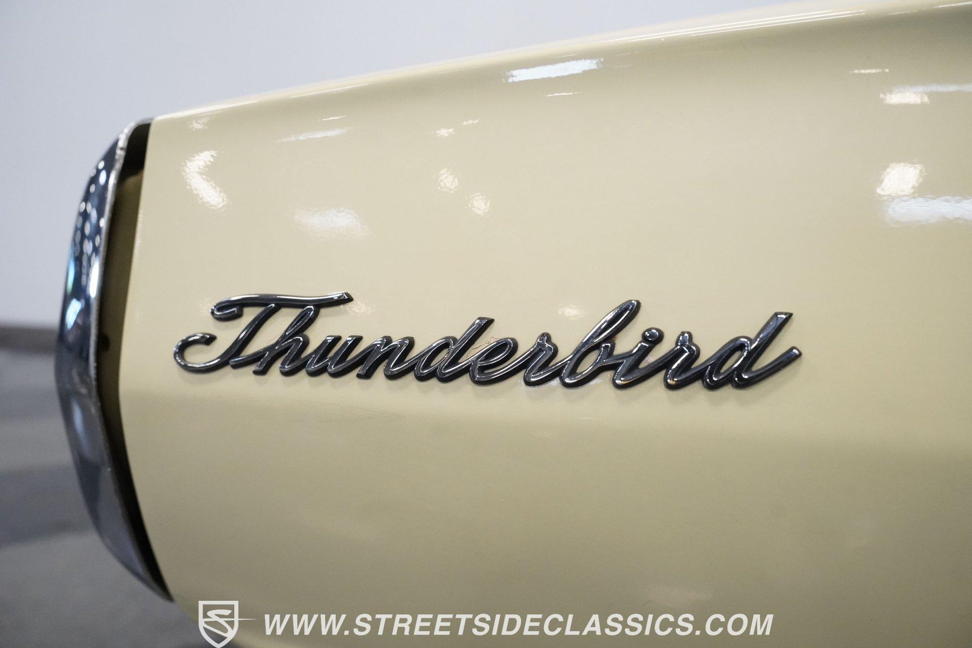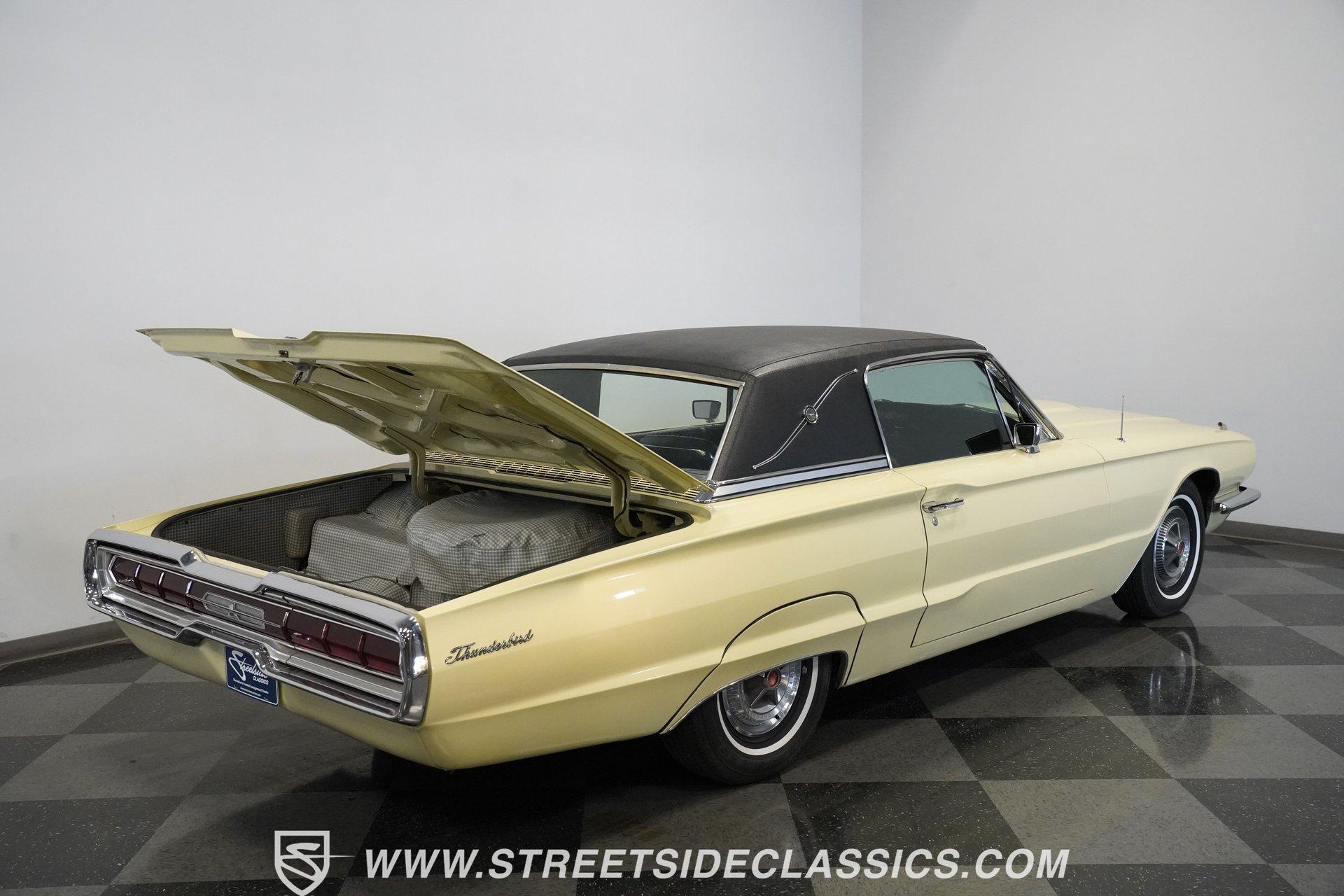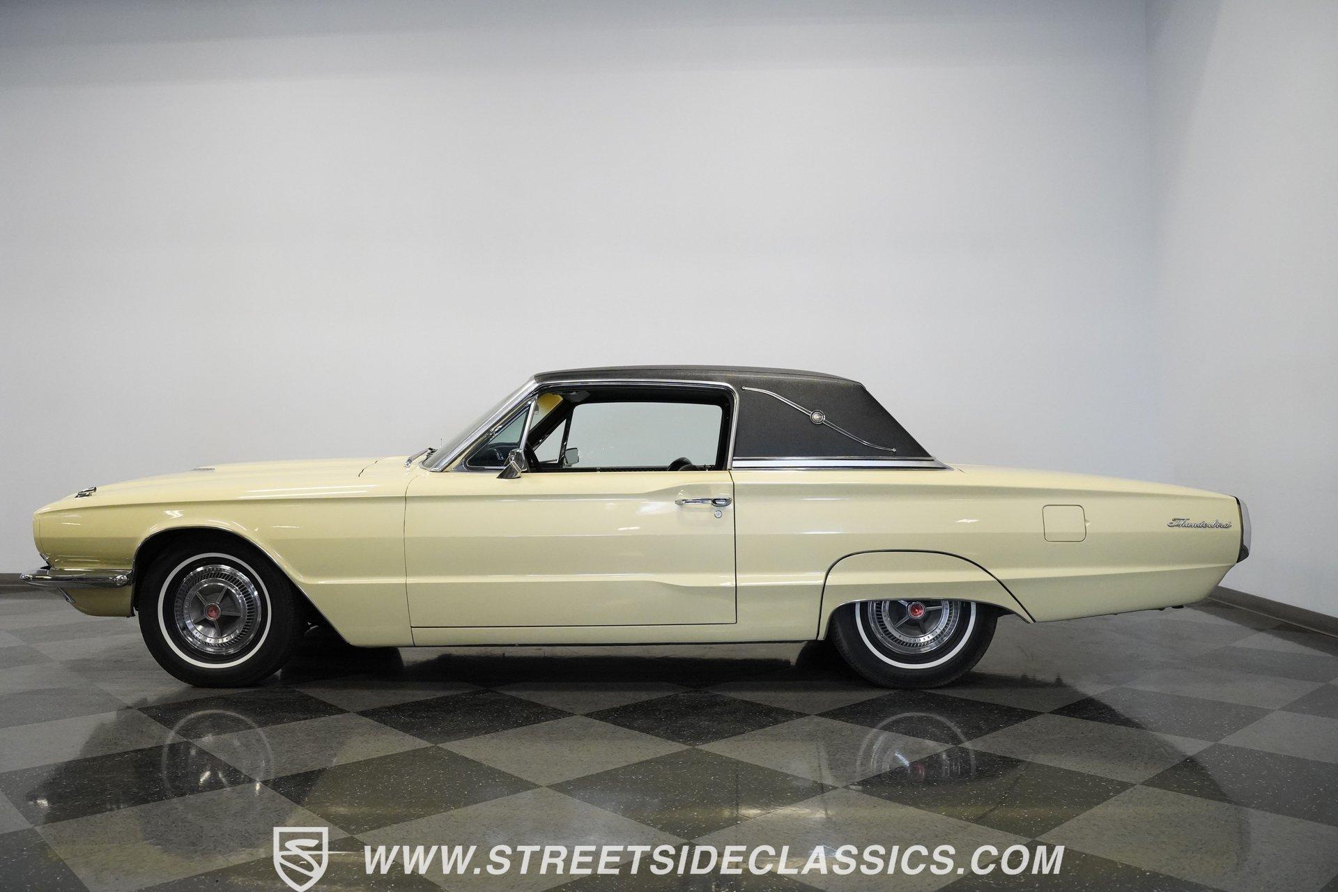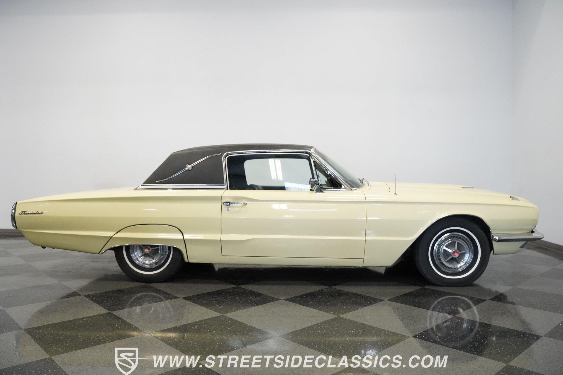 4225-PHX 1966 FORD THUNDERBIRD LANDAU Ford's elite personal luxury coupe shines in Ivy Yellow, a rare factory color choice that makes this 1966 Thunderbird Landau stand out from typical examples. The distinctive black vinyl Landau roof creates a striking two-tone effect against the vibrant yellow exterior. This special town roof body style features no rear quarter windows, giving it a cleaner, more exclusive silhouette. The classic lines flow seamlessly from the imposing front grille back to the horizontal taillights. Rolling on 15" steel wheels with factory wheel covers and Bridgestone Insignia SE200 215/75R15 tires, this Thunderbird balances luxury and presence. Black vinyl interior creates a sophisticated atmosphere inside this Thunderbird. The bucket seats provide excellent support, while the overhead console adds an exclusive touch unique to the Landau package. A column-mounted shifter maintains the clean cabin layout, complemented by a functional center console. The instrument cluster presents clear readouts behind the factory steering wheel. Air conditioning, power windows, power locks, and power seats deliver expected Thunderbird luxury features, while the AM radio provides period-correct entertainment. The dash, carpet, and headliner maintain their classic Ford design. The 390 V8 engine delivers authoritative power through the smooth-operating 3-speed FMX automatic transmission. An Autolite 4-barrel carburetor manages fuel delivery efficiently. The independent front suspension with control arms and coil springs pairs with a solid 9-inch rear axle with leaf springs for a solid foundation. Power steering makes navigating this substantial luxury coupe effortless. Power brakes with front discs provide superior stopping capability. The dual exhaust with aftermarket mufflers produces a refined exhaust note fitting of this luxury model. HIGHLIGHTS: 390 V8 Engine 3 Speed FMX Automatic Transmission Single 4-Barrel Autolite Carburetor Power Steering Power Front Disc Brakes Independent Front Suspension with Control Arms and Coil Springs Solid Axle Rear Suspension with Leaf Springs 9-inch Rear Axle Dual Exhaust with Aftermarket Mufflers Ivy Yellow Paint Black Vinyl Landau Roof 15" Steel Wheels with Thunderbird Wheel Covers 215/75R15 Bridgestone Insignia SE200 Tires Black Interior with Bucket Seats Power Seats Column Shifter Center Console Air Conditioning Power Windows Power Locks AM Radio Among Ford's most distinctive luxury designs, this 1966 Thunderbird Landau combines the rare Ivy Yellow paint, black vinyl roof, comfortable black interior, and reliable 390 V8 power. A true personal luxury coupe from the golden age of American automotive design. Call today!