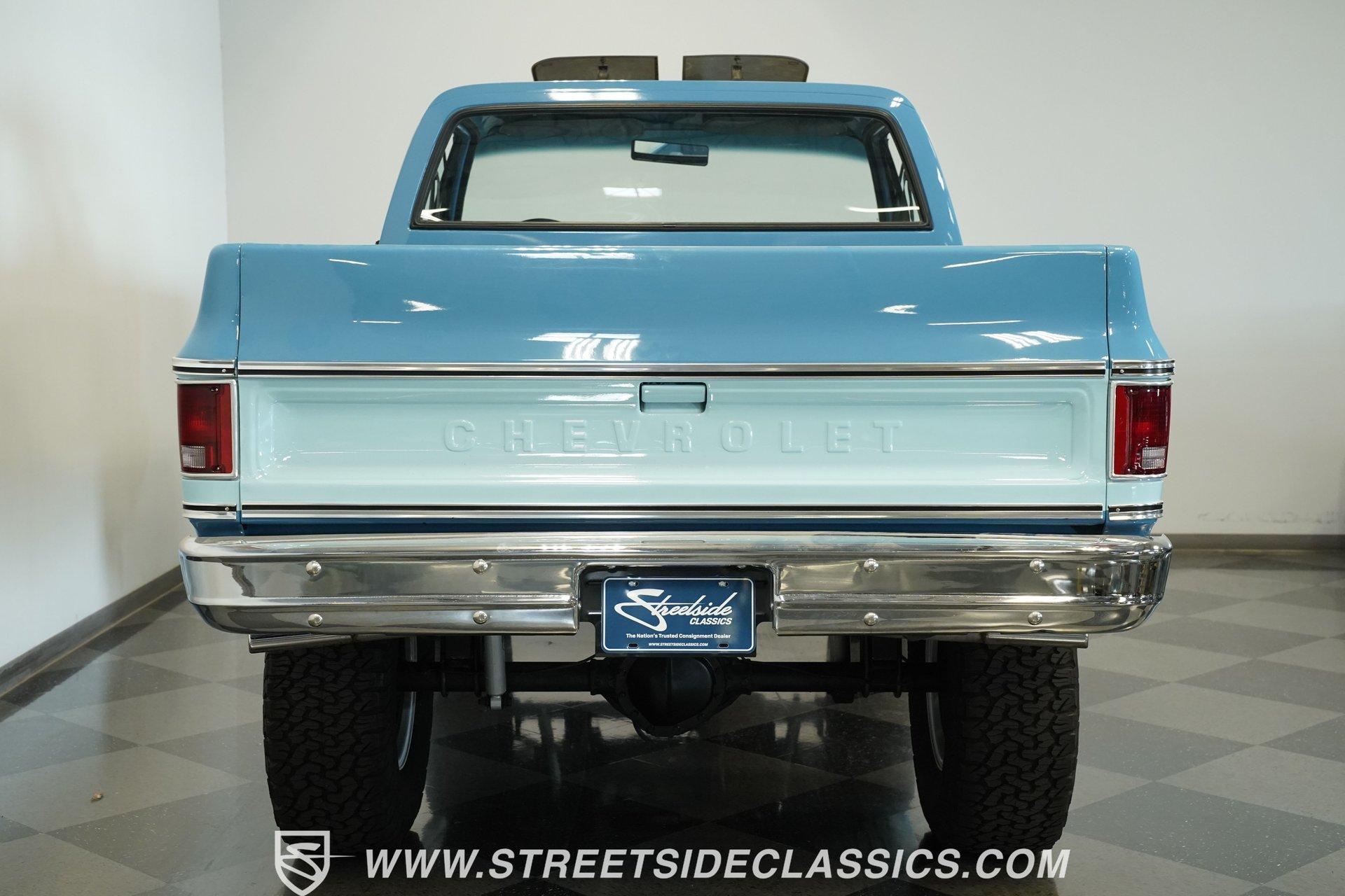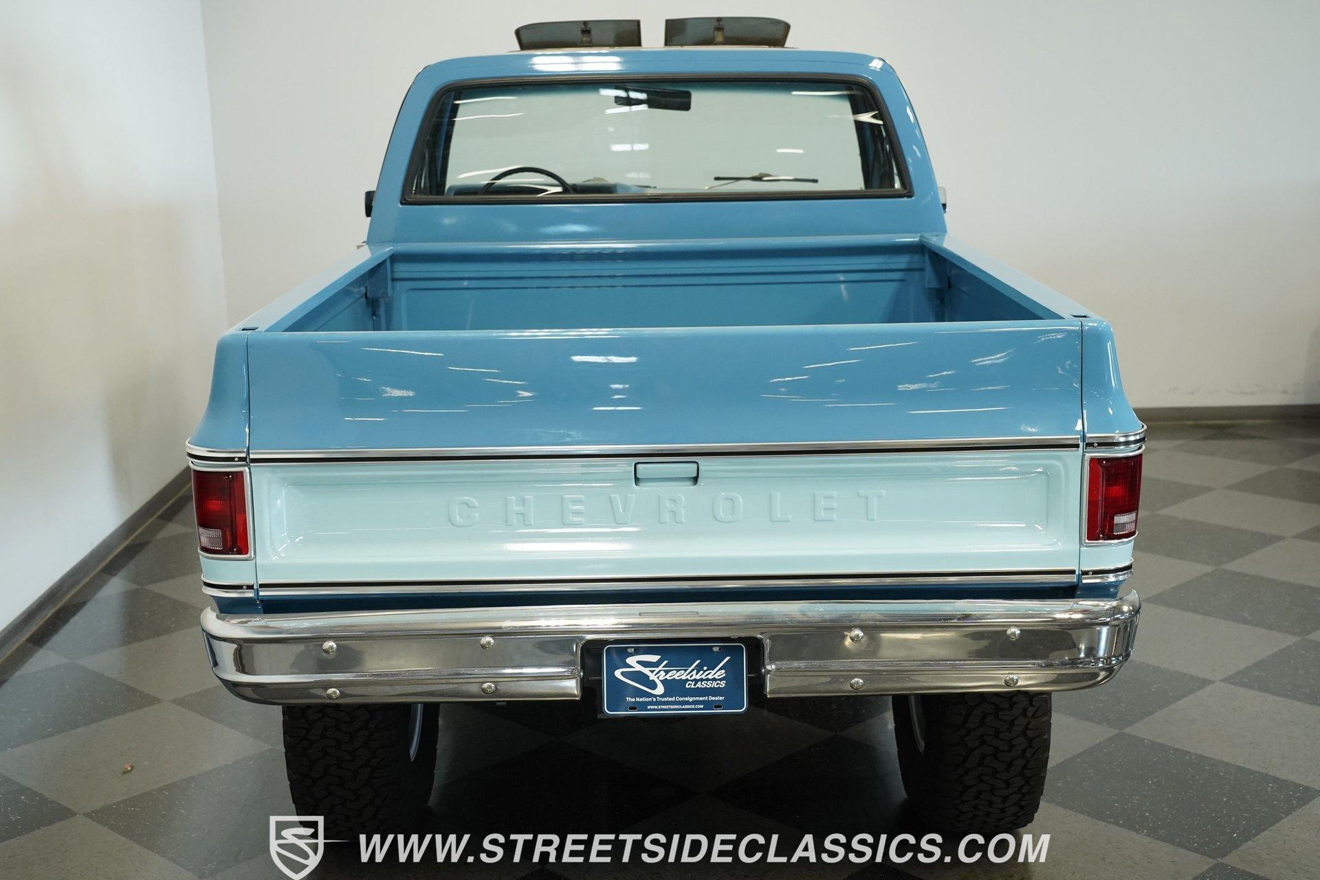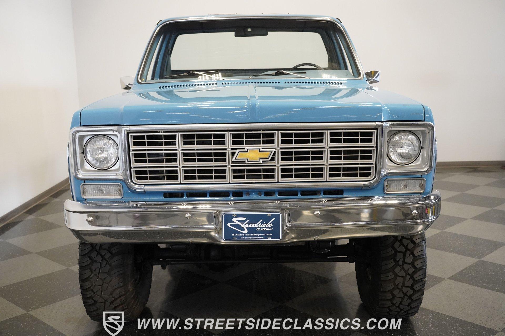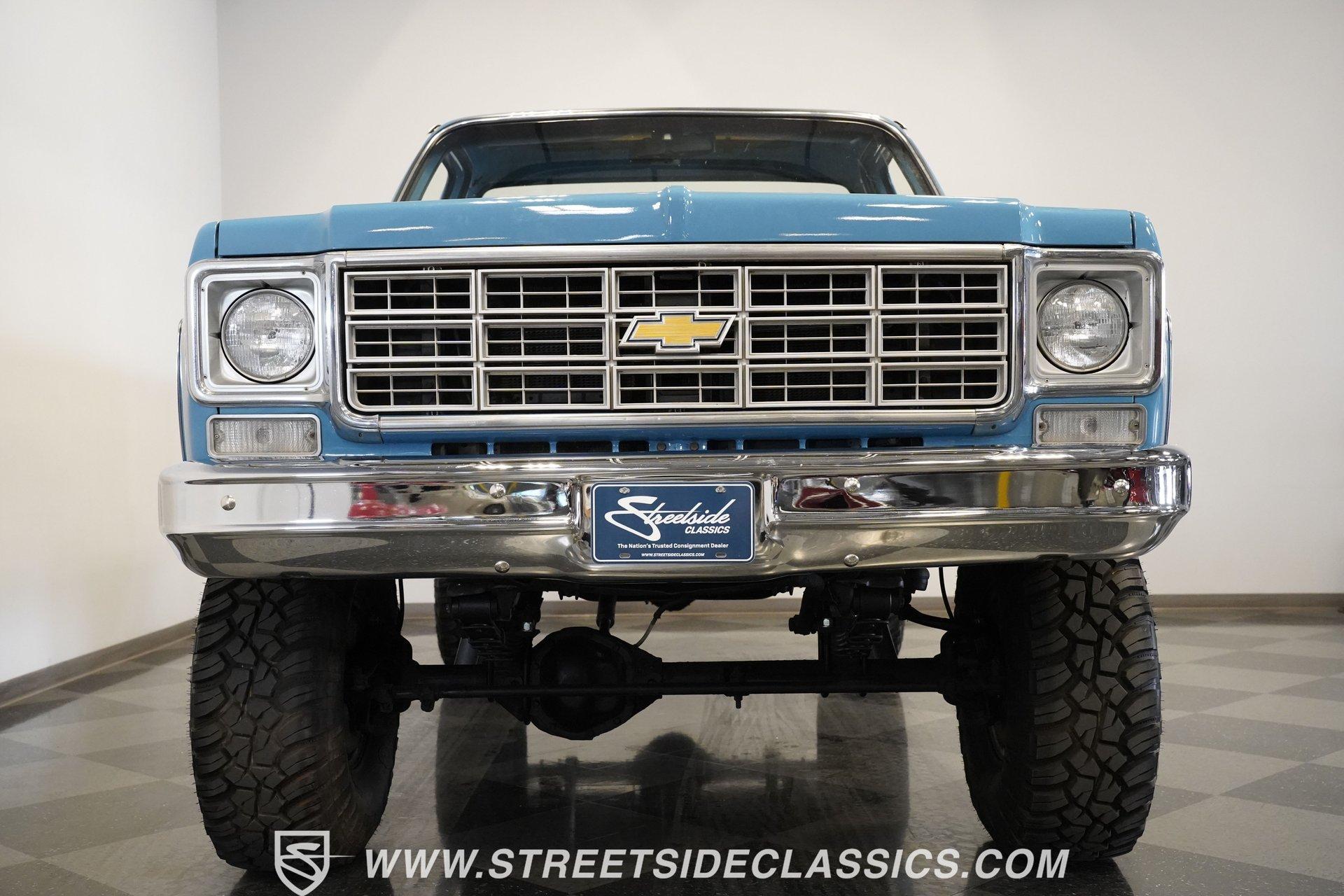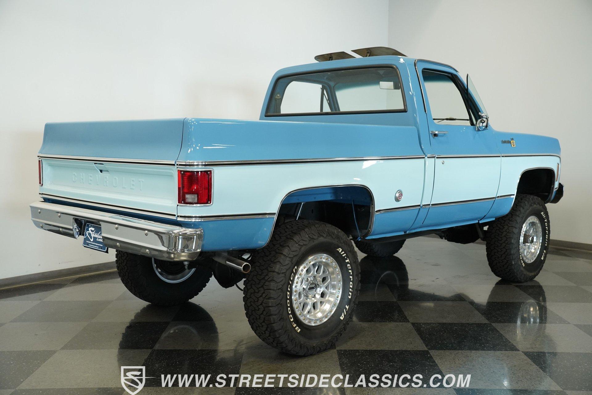 4232-PHX 1977 CHEVROLET K10 SCOTTSDALE 4X4 Reaching high above the asphalt, this 1977 Chevrolet K10 Scottsdale 4X4 dominates in its Hawaiian Blue and Light Blue two-tone paint. The approximately 6-inch lift kit elevates the truck to new heights, creating an imposing road presence without sacrificing classic proportions. Riding on 15-inch aluminum aftermarket wheels, the massive 35x12.50R15LT General Grabber X3 tires add to this Chevy's towering profile. The short bed design keeps the truck's profile well-balanced despite its increased stature. The clean front grille, bumpers, and an aftermarket sunroof complete the distinctive exterior appearance of this classic pickup. The blue cloth interior maintains visual harmony with the exterior color scheme. A full-width bench seat offers plenty of room for riders in this spacious cabin. Blue door panels feature carpeted lower sections that match the floor carpeting for a unified look. The dashboard houses an upgraded gauge cluster for improved instrumentation, while the floor-mounted 4x4 shifter sits within easy reach. Comfort and convenience come standard with functional air conditioning, heat, defrost, and an AM radio. The tilt wheel and power steering allow for easy handling despite this truck's substantial size and height. A 350 cubic inch V8 engine gives this elevated Chevy its muscle, working through a 3-speed TH350 automatic transmission for effortless cruising. The NP205 transfer case provides rugged four-wheel drive capability when the terrain gets rough. The dual tank fuel system extends the driving range for longer adventures. Front power disc brakes deliver solid stopping control. The truck's exhaust note comes courtesy of a FlowMaster dual exhaust system. Suspension consists of solid axles with leaf springs at both ends - a Dana 44 up front and a 12-bolt rear - with Rough Country shocks controlling the ride at all four corners. HIGHLIGHTS: 350 V8 Engine 3-Speed TH350 Automatic Transmission NP205 Transfer Case Dana 44 Front Axle 12-Bolt Rear Axle 4-Barrel QJet Carburetor Front Power Disc Brakes Four Wheel Drive Dual Fuel Tanks FlowMaster Dual Exhaust Rough Country Shocks 6-Inch Lift Kit Hawaiian Blue and Light Blue Two-Tone Paint Short Bed Sunroof 15" Aluminum Aftermarket Wheels 35x12.50R15LT General Grabber X3 Tires Blue Interior with Bench Seat Carpeted Door Panels Air Conditioning Power Steering AM Radio Floor-Mounted 4x4 Shifter Upgraded Gauge Cluster Tilt Wheel Seatbelts RPO Sticker Receipts Historical Record Book Tough, tall, and trail-ready, this 1977 Chevrolet K10 Scottsdale 4X4 combines classic truck styling with substantial off-road capability. The V8 power, capable 4x4 drivetrain, and well-equipped interior make this lifted Chevy equally suited for show display or backcountry exploration. Call today!