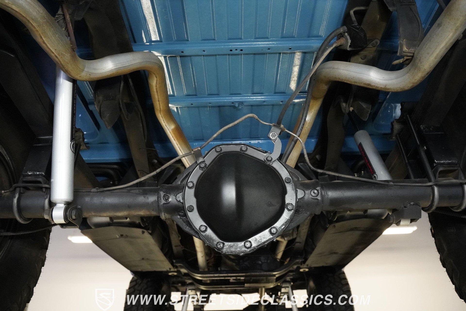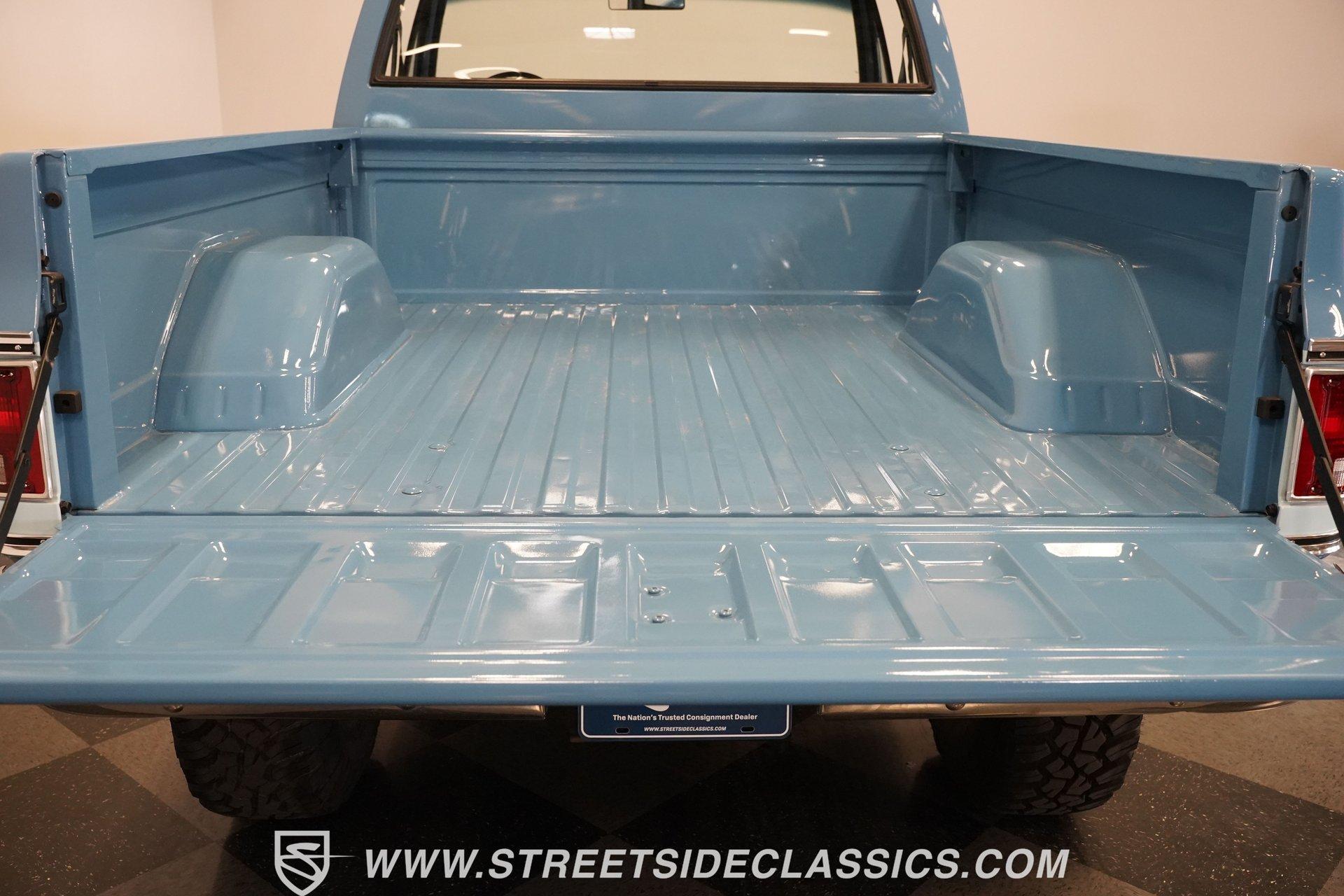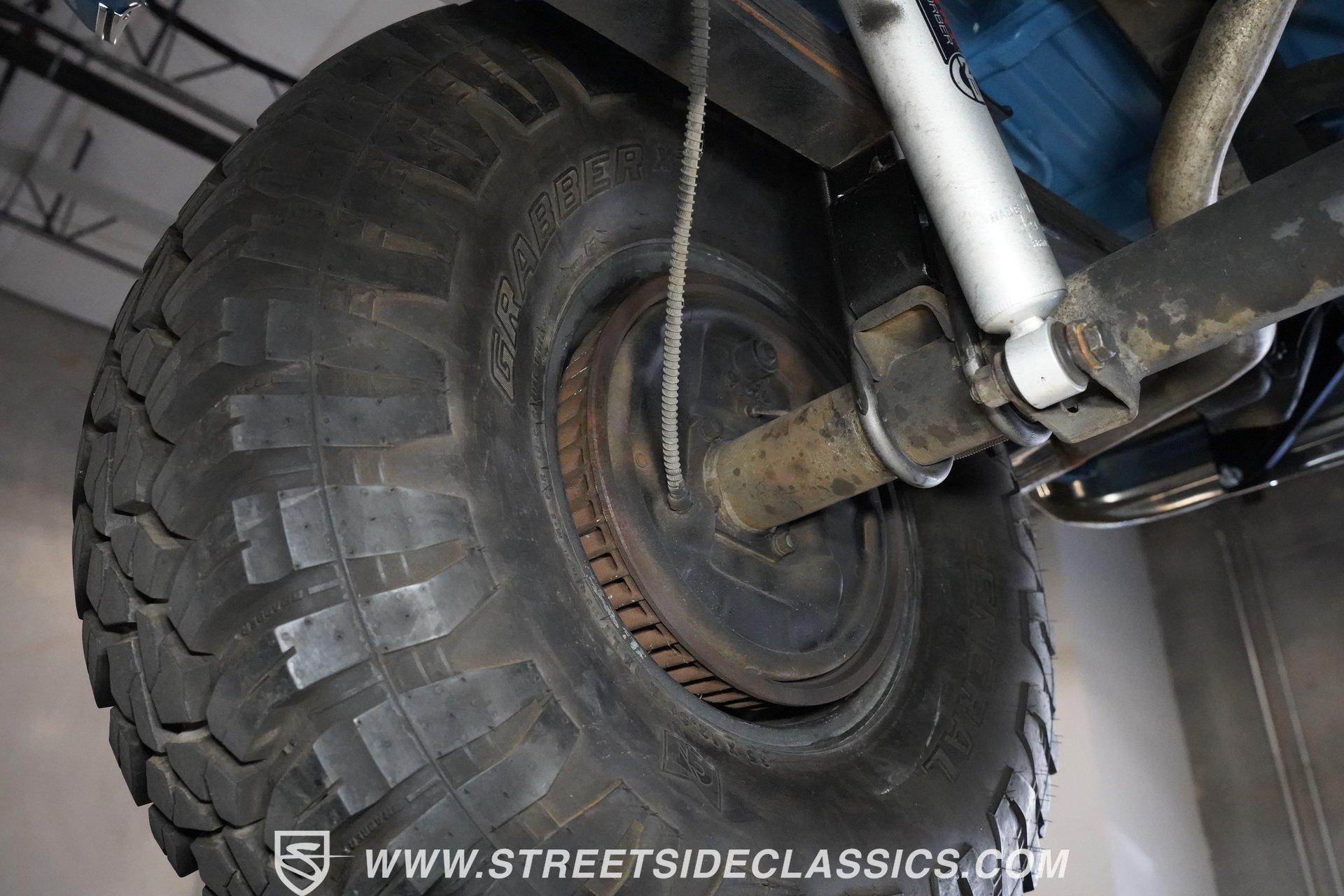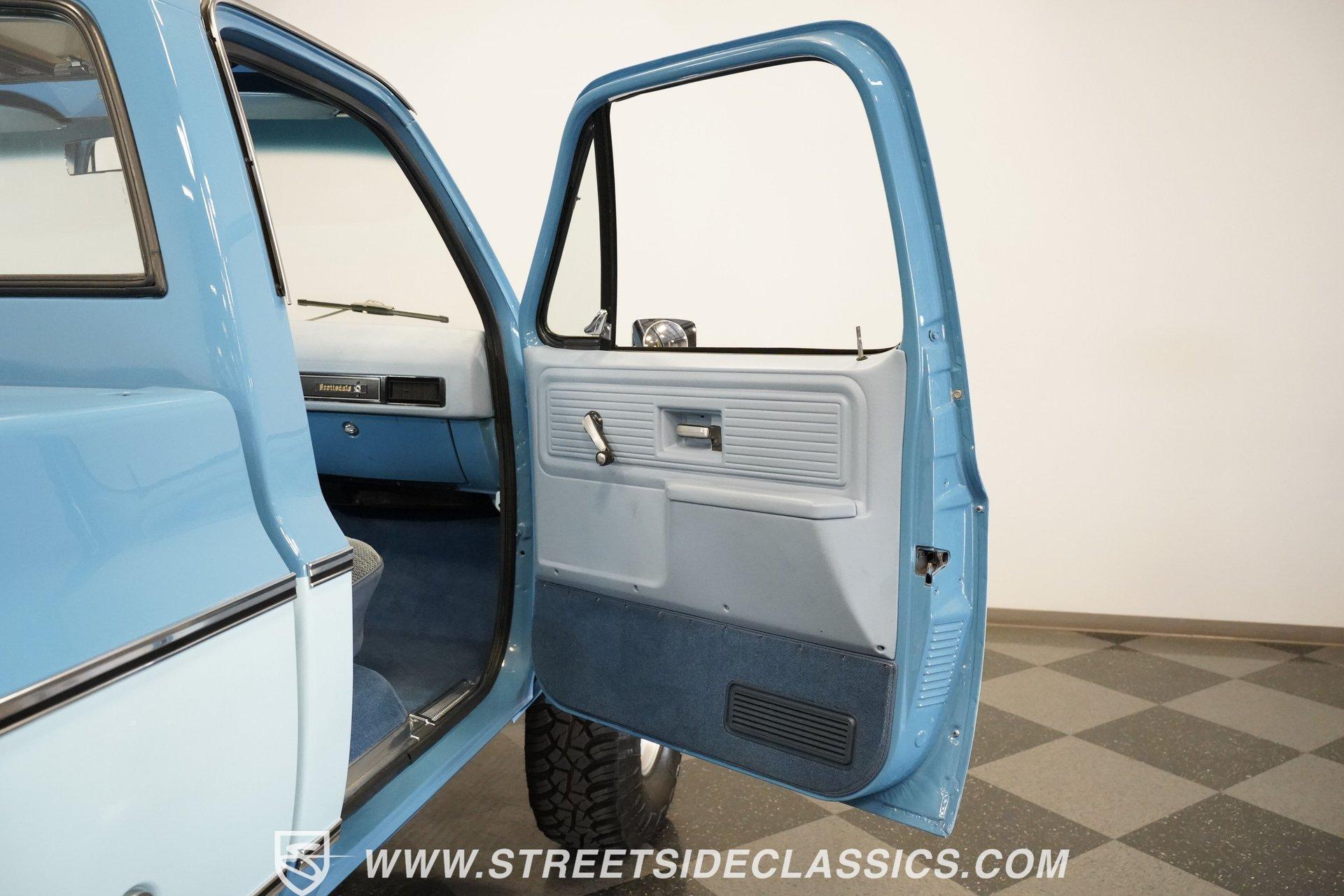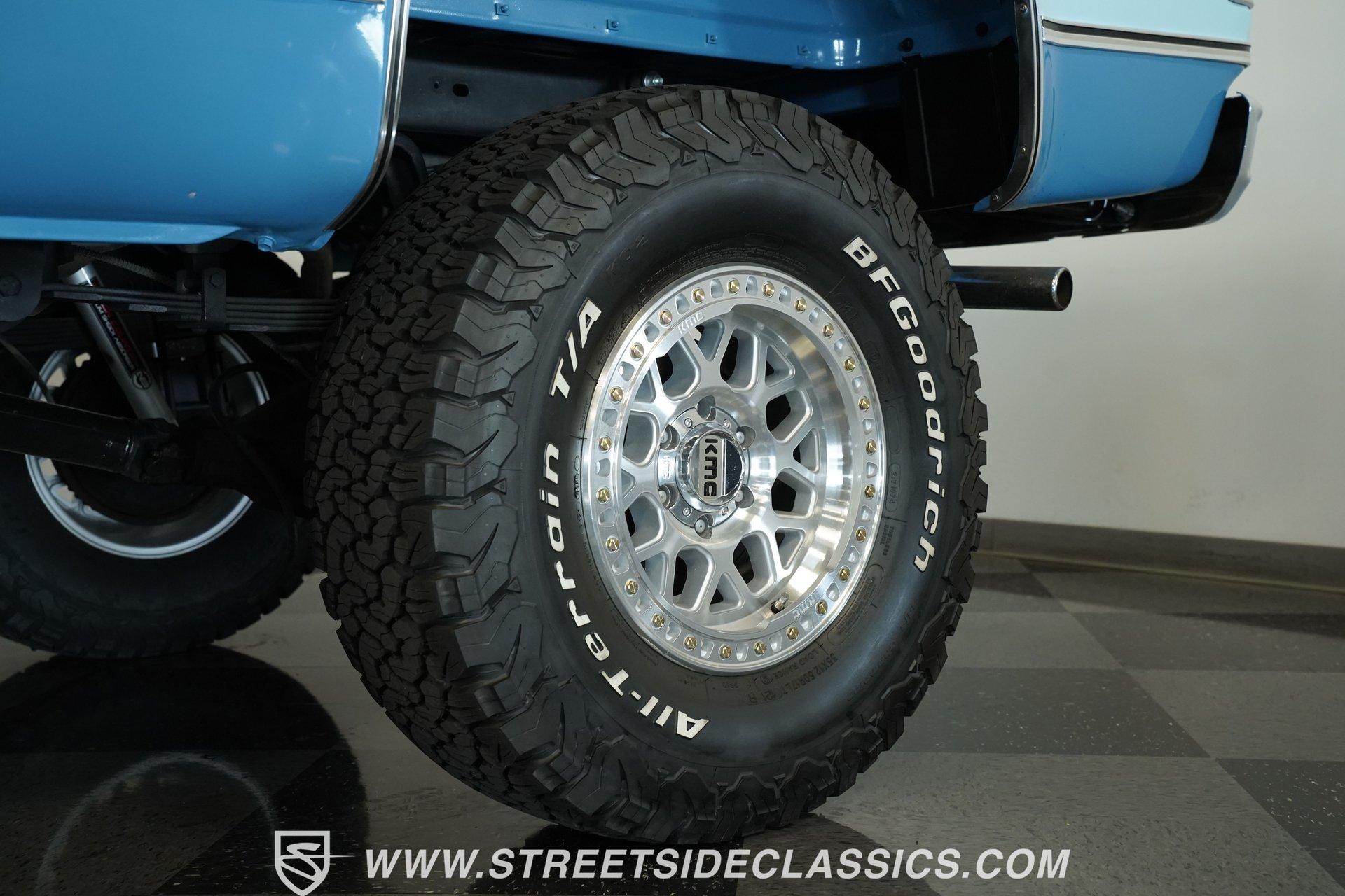 4232-PHX 1977 CHEVROLET K10 SCOTTSDALE 4X4 Reaching high above the asphalt, this 1977 Chevrolet K10 Scottsdale 4X4 dominates in its Hawaiian Blue and Light Blue two-tone paint. The approximately 6-inch lift kit elevates the truck to new heights, creating an imposing road presence without sacrificing classic proportions. Riding on 15-inch aluminum aftermarket wheels, the massive 35x12.50R15LT General Grabber X3 tires add to this Chevy's towering profile. The short bed design keeps the truck's profile well-balanced despite its increased stature. The clean front grille, bumpers, and an aftermarket sunroof complete the distinctive exterior appearance of this classic pickup. The blue cloth interior maintains visual harmony with the exterior color scheme. A full-width bench seat offers plenty of room for riders in this spacious cabin. Blue door panels feature carpeted lower sections that match the floor carpeting for a unified look. The dashboard houses an upgraded gauge cluster for improved instrumentation, while the floor-mounted 4x4 shifter sits within easy reach. Comfort and convenience come standard with functional air conditioning, heat, defrost, and an AM radio. The tilt wheel and power steering allow for easy handling despite this truck's substantial size and height. A 350 cubic inch V8 engine gives this elevated Chevy its muscle, working through a 3-speed TH350 automatic transmission for effortless cruising. The NP205 transfer case provides rugged four-wheel drive capability when the terrain gets rough. The dual tank fuel system extends the driving range for longer adventures. Front power disc brakes deliver solid stopping control. The truck's exhaust note comes courtesy of a FlowMaster dual exhaust system. Suspension consists of solid axles with leaf springs at both ends - a Dana 44 up front and a 12-bolt rear - with Rough Country shocks controlling the ride at all four corners. HIGHLIGHTS: 350 V8 Engine 3-Speed TH350 Automatic Transmission NP205 Transfer Case Dana 44 Front Axle 12-Bolt Rear Axle 4-Barrel QJet Carburetor Front Power Disc Brakes Four Wheel Drive Dual Fuel Tanks FlowMaster Dual Exhaust Rough Country Shocks 6-Inch Lift Kit Hawaiian Blue and Light Blue Two-Tone Paint Short Bed Sunroof 15" Aluminum Aftermarket Wheels 35x12.50R15LT General Grabber X3 Tires Blue Interior with Bench Seat Carpeted Door Panels Air Conditioning Power Steering AM Radio Floor-Mounted 4x4 Shifter Upgraded Gauge Cluster Tilt Wheel Seatbelts RPO Sticker Receipts Historical Record Book Tough, tall, and trail-ready, this 1977 Chevrolet K10 Scottsdale 4X4 combines classic truck styling with substantial off-road capability. The V8 power, capable 4x4 drivetrain, and well-equipped interior make this lifted Chevy equally suited for show display or backcountry exploration. Call today!