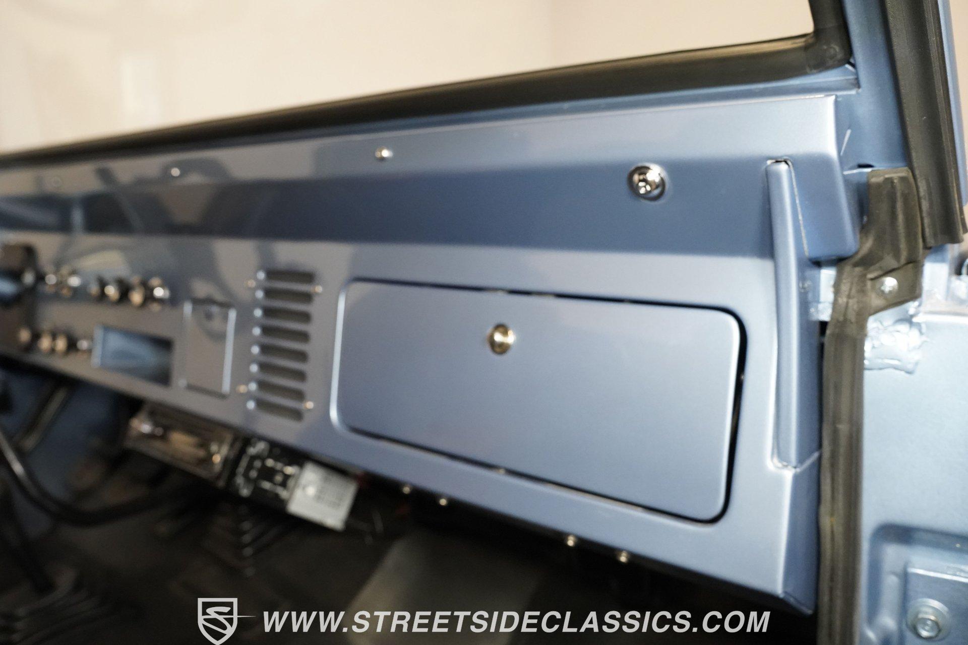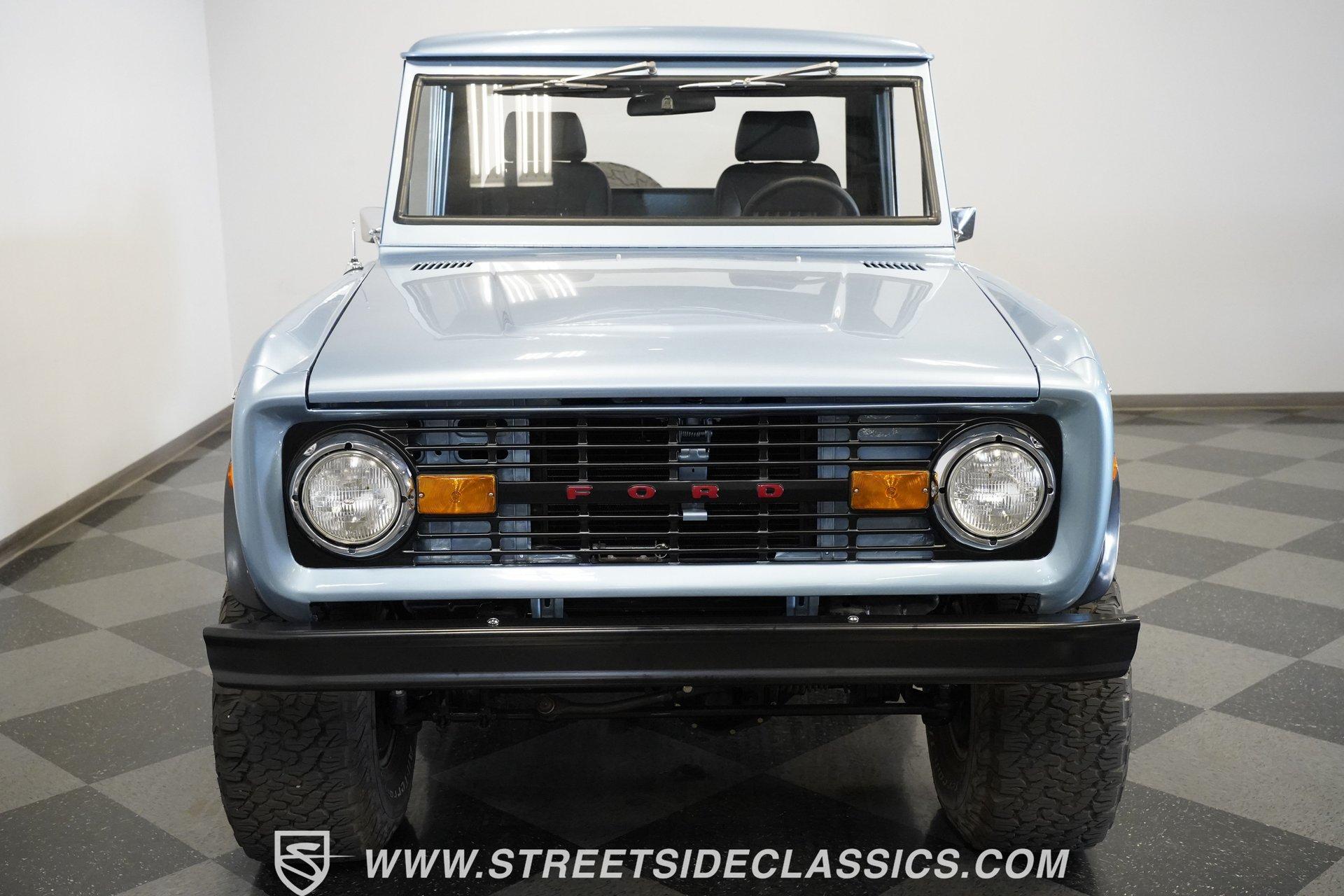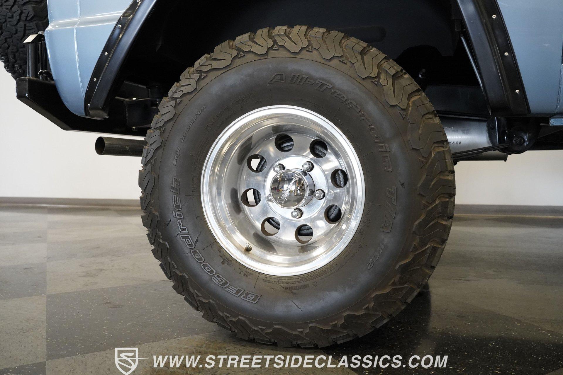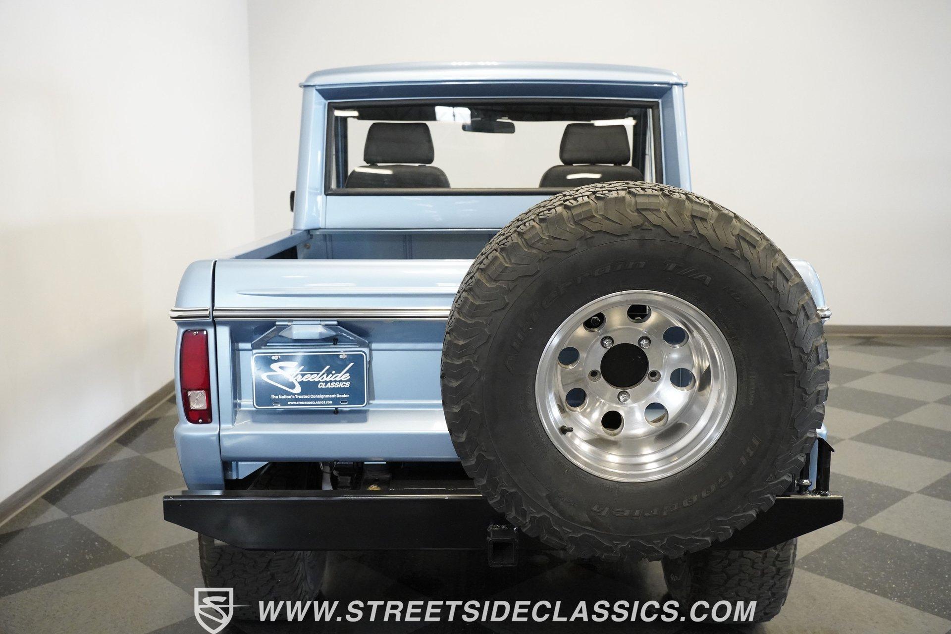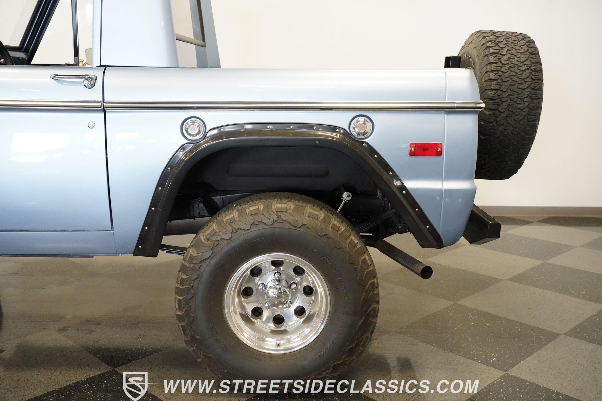 4113-PHX 1970 FORD BRONCO HALF-CAB 4X4 Forged for the wild, this 1970 Ford Bronco Half-Cab 4x4 comes coated in Brittany Blue paint. Ford created something special with the sought-after half-cab configuration - a rugged blend of open-air utility and all-terrain capability. A 3.5-inch suspension lift combined with a 1-inch body lift gives this American classic its tall and mighty profile. Aluminum 15-inch wheels sit at all four corners, wrapped in massive 33/12.50/15 BFGoodrich KO2 all-terrain tires for ultimate traction. Aftermarket fender flares accommodate the wider rubber while the custom rear bumper houses a full-size matching spare, ever-ready for backcountry exploration. The black vinyl interior serves as your off-road control station. Bucket seats hold you in place across uneven ground, while the custom center console with floor shifter puts the 4-speed manual right where you need it. A blue-painted dash matches the exterior color, creating visual harmony throughout the cabin. The Pioneer radio with Bluetooth and satellite capability adds modern audio to your wilderness runs. Power steering makes handling manageable on tight mountain trails, allowing you to focus on conquering whatever terrain lies ahead. A 302 V8 engine sits front and center, enhanced with GT40 heads and Summit intake manifold, fed by a Holley Truck Avenger 4-barrel carburetor. The NP435 4-speed manual transmission works alongside a Dana 20 transfer case to distribute power. A Dana 44 front axle with Auburn locker and a Ford 9-inch rear axle with Detroit locker provide traction in all conditions. Both axles run 31-spline axles with 4.11 gears for excellent crawling ability. Ceramic-coated long-tube headers connect to a dual exhaust system for improved exhaust flow. Power disc brakes with hydroboost offer solid stopping power, complemented by dual front shocks for improved control. HIGHLIGHTS: 302 V8 Engine GT40 Heads with Summit Intake Holley Truck Avenger 4-Barrel Carburetor NP435 4-Speed Manual Transmission Dana 20 Transfer Case Dana 44 Front Axle with Auburn Locker 9-inch Rear Axle with Detroit Locker Ceramic Coated Long Tube Headers Dual Exhaust Power Disc Brakes with Hydroboost Dual Front Shocks 3.5-Inch Suspension Lift 1-Inch Body Lift Brittany Blue Paint Aftermarket Fender Flares Aftermarket Front, Rear Bumper with Spare Tire Mount 15-Inch Aluminum Wheels 33/12.50/15 BFGoodrich KO2 All-Terrain Tires Black Interior with Bucket Seats Custom Center Console Floor-Mounted Shifter Power Steering Blue Painted Dashboard Pioneer AM/FM/AUX Stereo with Bluetooth and Satellite Black Headliner Book of Restoration Photos 1,788 Miles Since Built Made for adventure, this 1970 Ford Bronco Half-Cab 4x4 mixes classic Ford 4x4 capability with thoughtfully selected upgrades. The 302 V8, heavy-duty drivetrain, and distinctive Brittany Blue exterior come together in a package that's ready to tackle any trail or mountain pass. Call today!