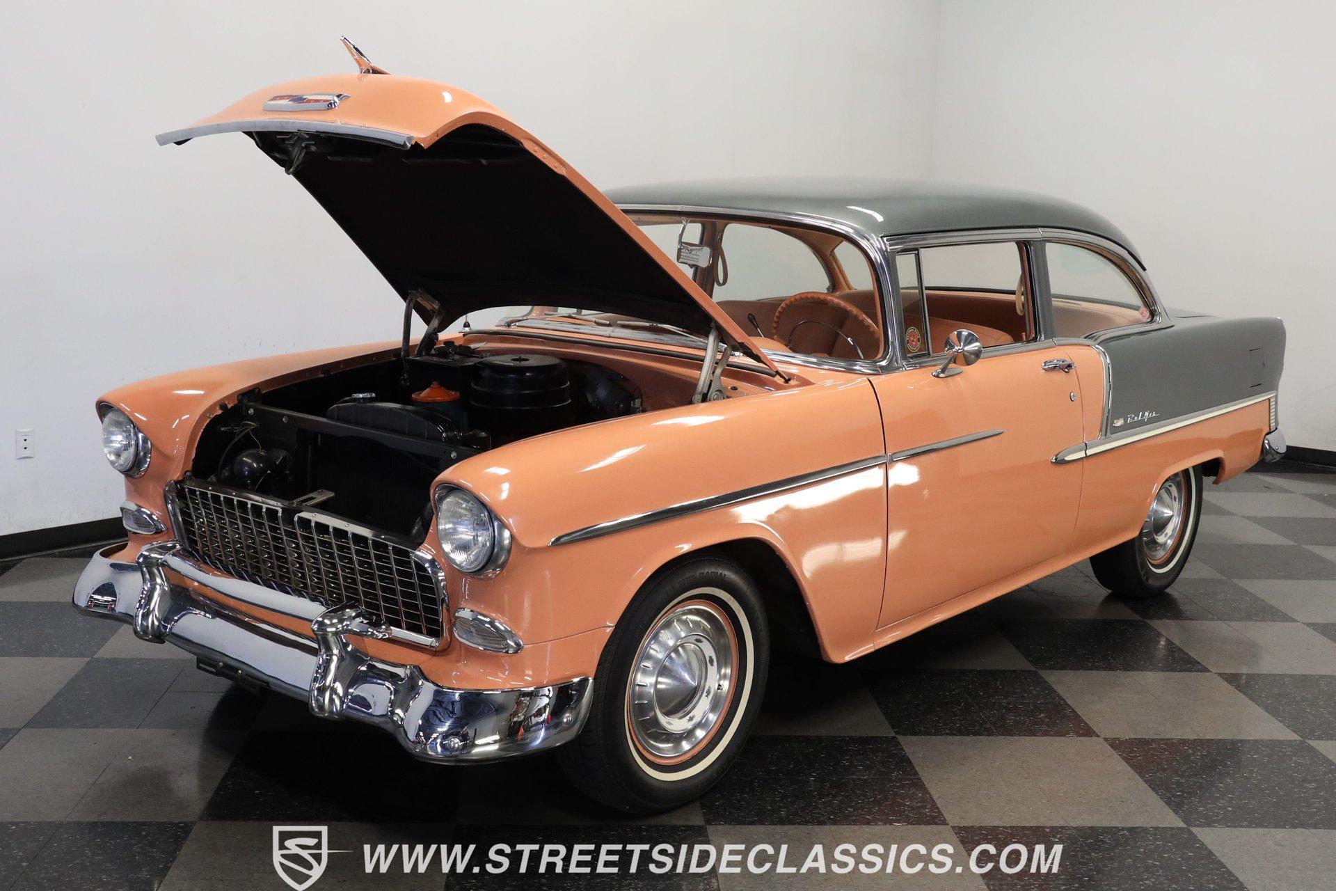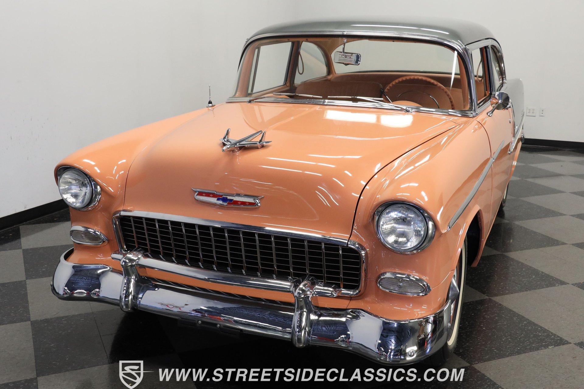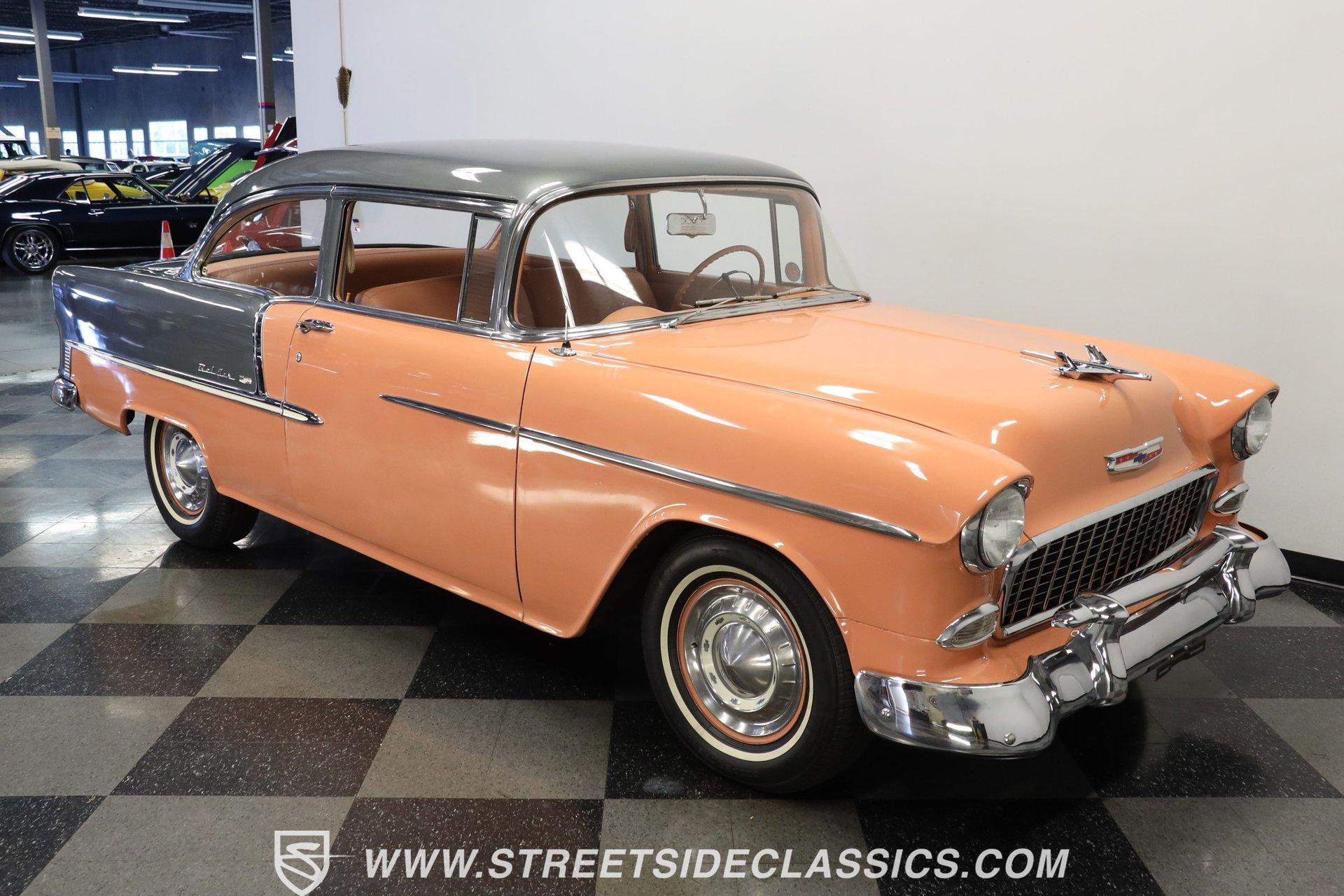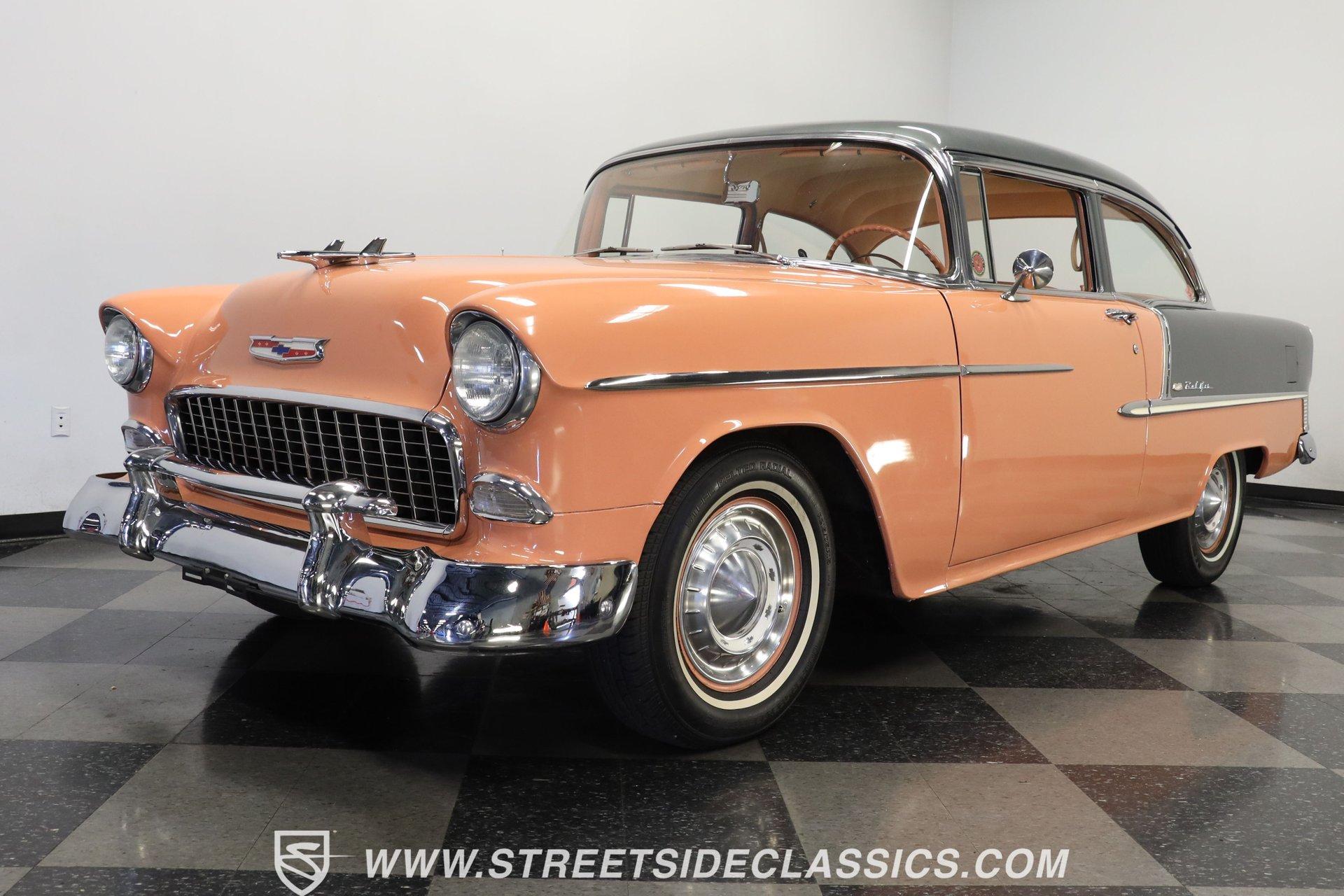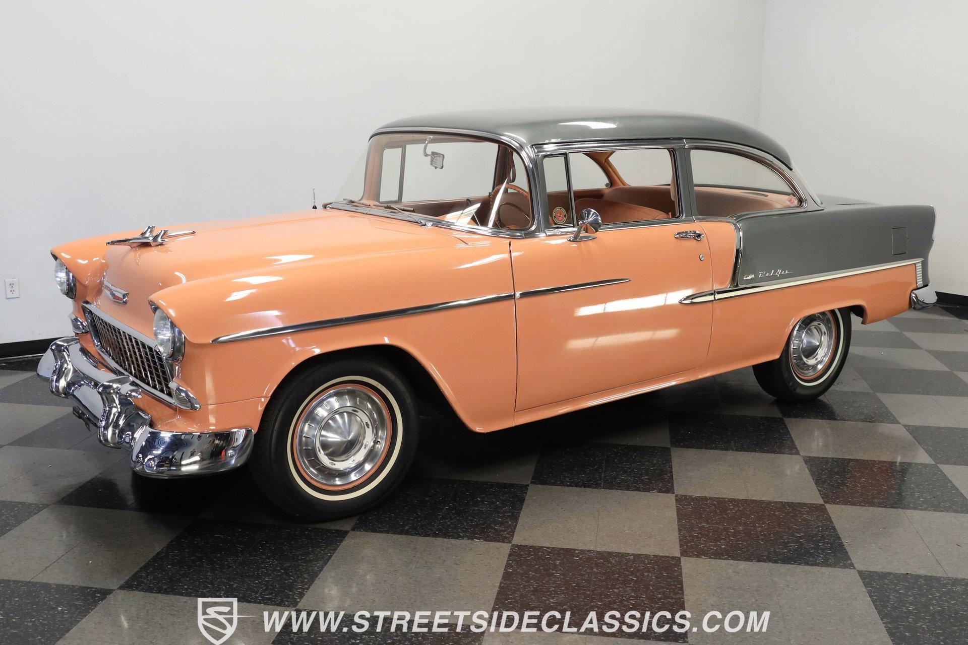 The 1955 Chevrolet was one of the most popular cars of the 1950's when new and it is equally as popular today. One look at this beautiful 1955 Chevrolet Bel Air two-door sedan and it is easy to see why. This is a very early production car built on October 5th, 1954. Finished attractively in two-toned factory colors Coral and Shadow Gray, this Bel Air has been tastefully upgraded in just the right places. With its glossy paint finish, accessory front bumper guard, back up lights, bow-tie shaped chrome exhaust tip and whitewall radial tires, this top-of-the-line trim level Bel Air is full of 1950's flair and character. Inside, the upholstery is restored to original specifications with a comfortable two-tone pattern that matches the exterior paint scheme. The interior features a factory wonderbar radio, optional heater/defroster, electric wipers, seat belts, an AM/FM/cassette player hidden in the below-dash mounted tissue dispenser, plus a removable center armrest console with cup holders. HIGHLIGHTS: Early Production Car Built in October of 1954 265 Cubic Inch Engine Powerglide Transmission Power Steering Upgraded Front Disc Brakes Attractive Factory Color Scheme of Coral and Shadow Gray Factory Wonderbar Radio Additional Hidden AM/FM Stereo Radio Factory Front Grill Guard Factory Optional Electric Wipers Removable Center Armrest Console with Cup Holders Under the hood the correct 265 cubic inch V8 engine and 2-speed Powerglide transmission has been preserved and runs smoothly. The bay appears mostly stock and features power steering. This classic Bel Air drives exceptionally well thanks to upgraded front disc brakes with dual master cylinder that combine to deliver a comfortable and confidant driving experience. Thoughtfully upgraded to enhance comfort and drivability, this classic 1955 Chevrolet Bel Air is ready to enjoy. Call today! We can assist you with getting an Extended Vehicle Service Plan from Freedom Warranty, which provides comprehensive coverage that can save thousands of dollars on unexpected repairs. Inquire for more details and pricing!