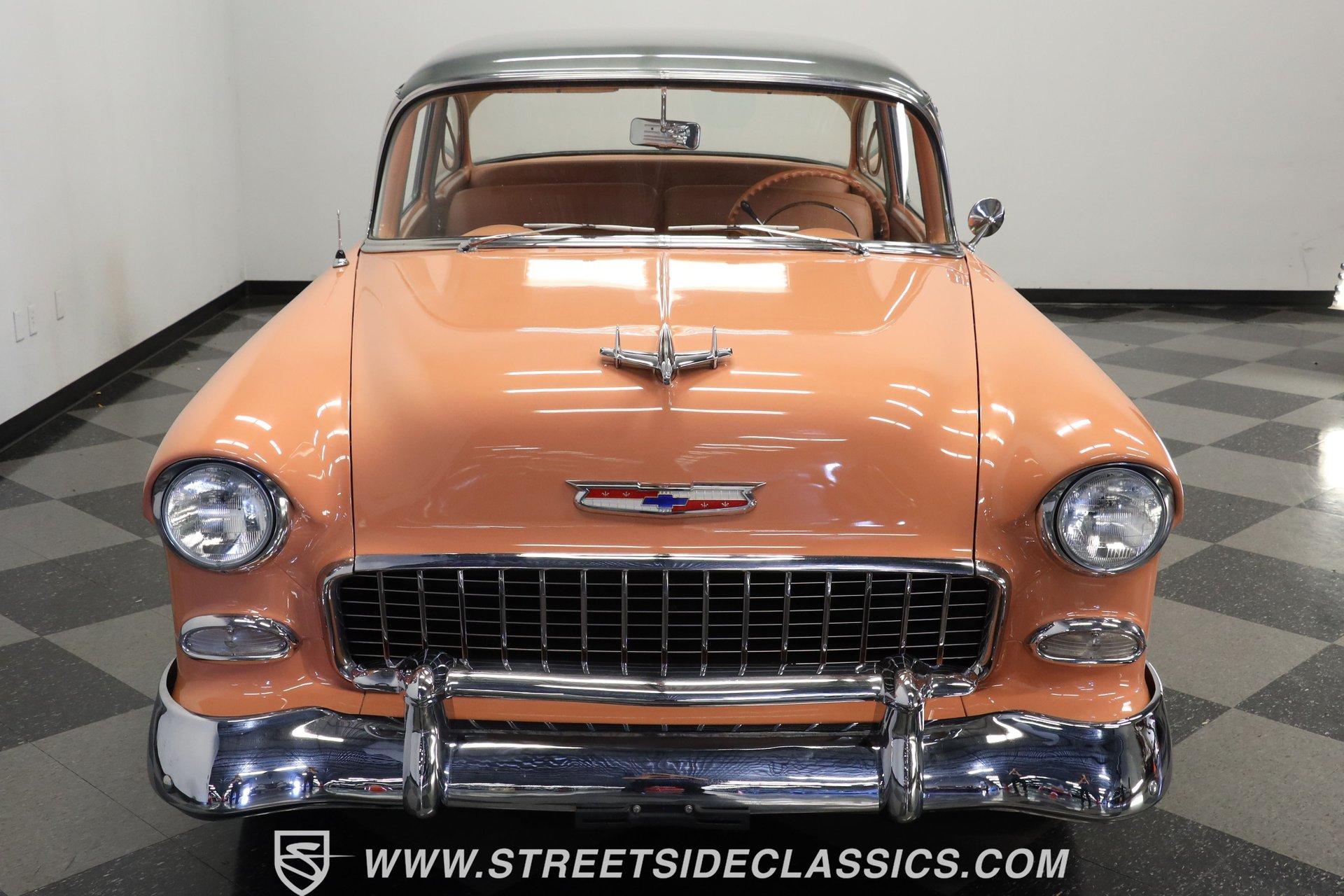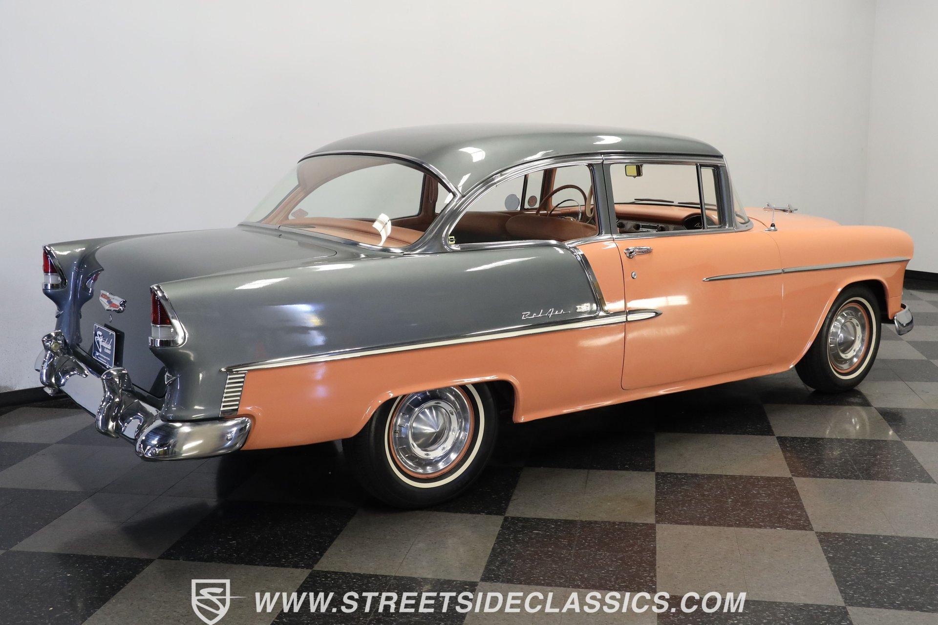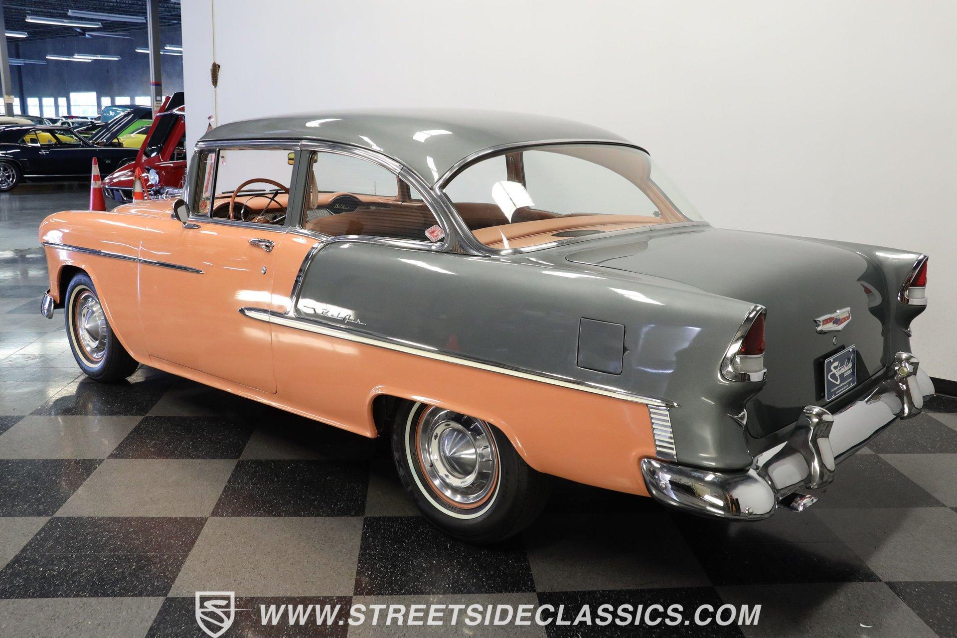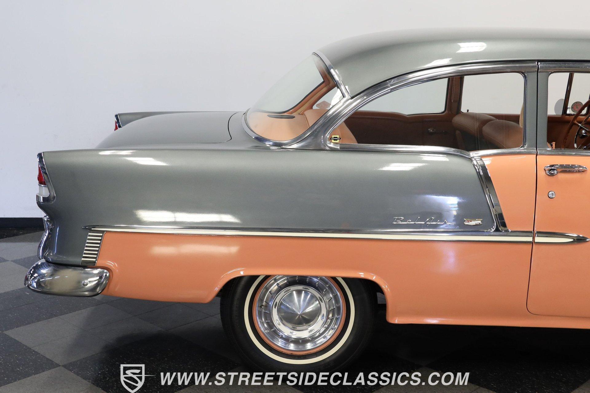 The 1955 Chevrolet was one of the most popular cars of the 1950's when new and it is equally as popular today. One look at this beautiful 1955 Chevrolet Bel Air two-door sedan and it is easy to see why. This is a very early production car built on October 5th, 1954. Finished attractively in two-toned factory colors Coral and Shadow Gray, this Bel Air has been tastefully upgraded in just the right places. With its glossy paint finish, accessory front bumper guard, back up lights, bow-tie shaped chrome exhaust tip and whitewall radial tires, this top-of-the-line trim level Bel Air is full of 1950's flair and character. Inside, the upholstery is restored to original specifications with a comfortable two-tone pattern that matches the exterior paint scheme. The interior features a factory wonderbar radio, optional heater/defroster, electric wipers, seat belts, an AM/FM/cassette player hidden in the below-dash mounted tissue dispenser, plus a removable center armrest console with cup holders. HIGHLIGHTS: Early Production Car Built in October of 1954 265 Cubic Inch Engine Powerglide Transmission Power Steering Upgraded Front Disc Brakes Attractive Factory Color Scheme of Coral and Shadow Gray Factory Wonderbar Radio Additional Hidden AM/FM Stereo Radio Factory Front Grill Guard Factory Optional Electric Wipers Removable Center Armrest Console with Cup Holders Under the hood the correct 265 cubic inch V8 engine and 2-speed Powerglide transmission has been preserved and runs smoothly. The bay appears mostly stock and features power steering. This classic Bel Air drives exceptionally well thanks to upgraded front disc brakes with dual master cylinder that combine to deliver a comfortable and confidant driving experience. Thoughtfully upgraded to enhance comfort and drivability, this classic 1955 Chevrolet Bel Air is ready to enjoy. Call today! We can assist you with getting an Extended Vehicle Service Plan from Freedom Warranty, which provides comprehensive coverage that can save thousands of dollars on unexpected repairs. Inquire for more details and pricing!