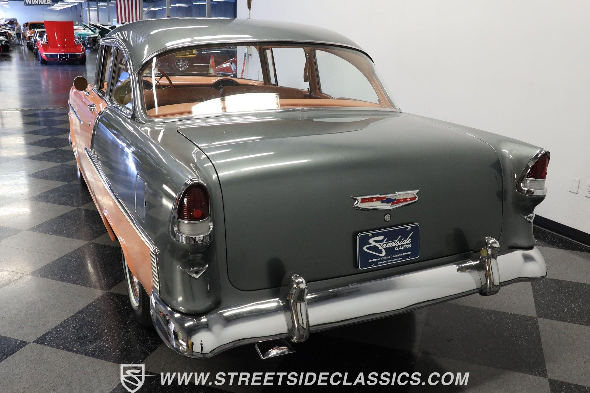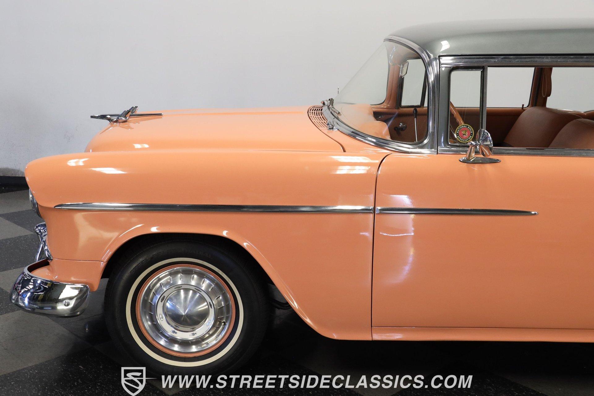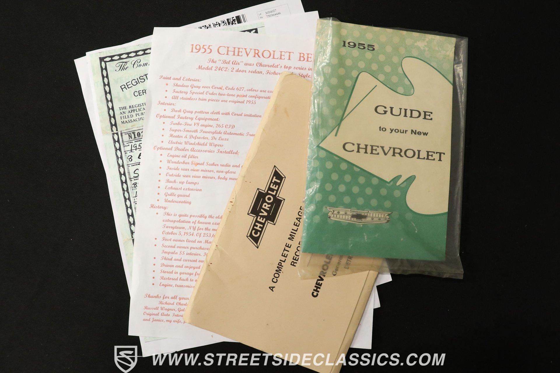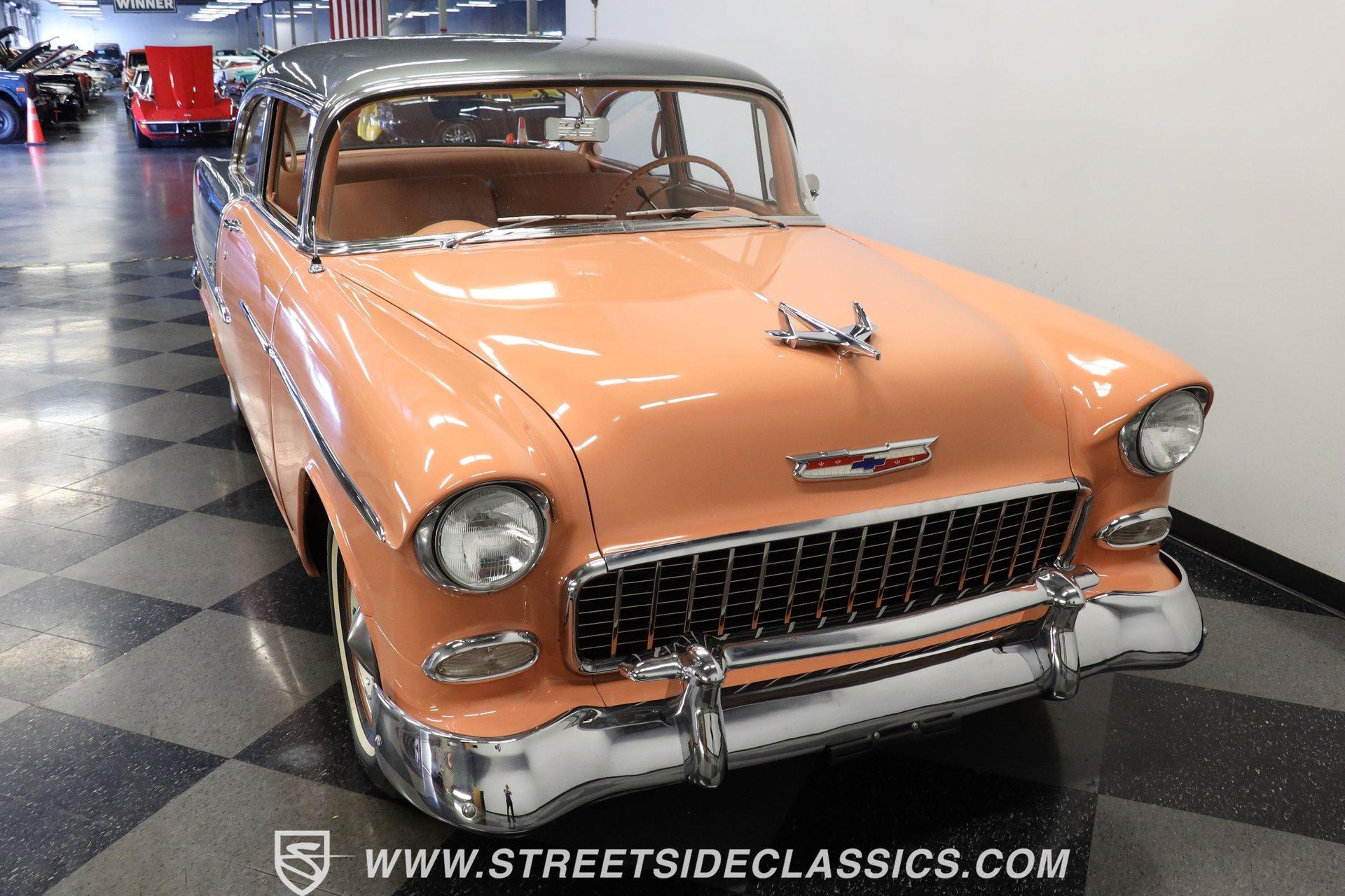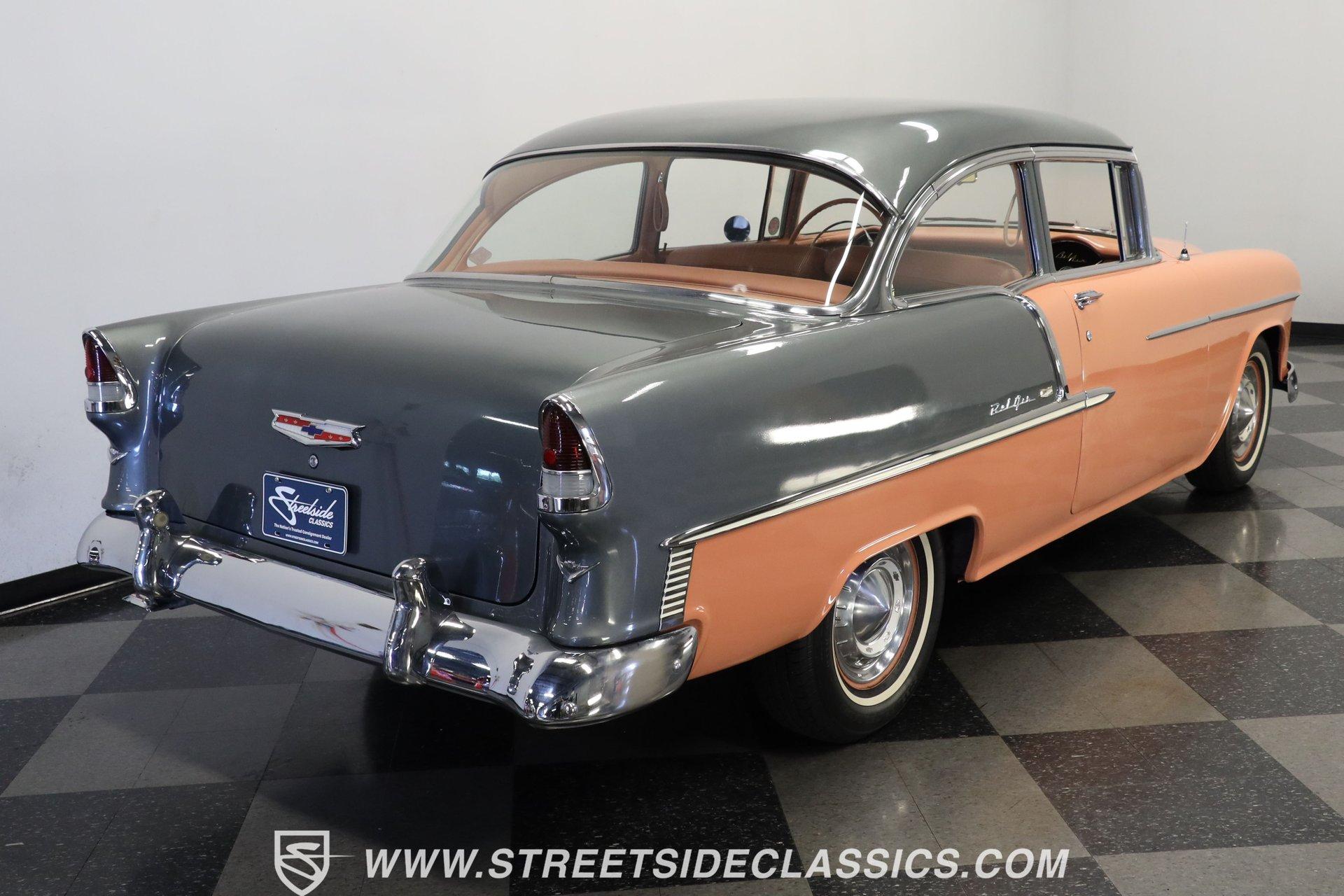 The 1955 Chevrolet was one of the most popular cars of the 1950's when new and it is equally as popular today. One look at this beautiful 1955 Chevrolet Bel Air two-door sedan and it is easy to see why. This is a very early production car built on October 5th, 1954. Finished attractively in two-toned factory colors Coral and Shadow Gray, this Bel Air has been tastefully upgraded in just the right places. With its glossy paint finish, accessory front bumper guard, back up lights, bow-tie shaped chrome exhaust tip and whitewall radial tires, this top-of-the-line trim level Bel Air is full of 1950's flair and character. Inside, the upholstery is restored to original specifications with a comfortable two-tone pattern that matches the exterior paint scheme. The interior features a factory wonderbar radio, optional heater/defroster, electric wipers, seat belts, an AM/FM/cassette player hidden in the below-dash mounted tissue dispenser, plus a removable center armrest console with cup holders. HIGHLIGHTS: Early Production Car Built in October of 1954 265 Cubic Inch Engine Powerglide Transmission Power Steering Upgraded Front Disc Brakes Attractive Factory Color Scheme of Coral and Shadow Gray Factory Wonderbar Radio Additional Hidden AM/FM Stereo Radio Factory Front Grill Guard Factory Optional Electric Wipers Removable Center Armrest Console with Cup Holders Under the hood the correct 265 cubic inch V8 engine and 2-speed Powerglide transmission has been preserved and runs smoothly. The bay appears mostly stock and features power steering. This classic Bel Air drives exceptionally well thanks to upgraded front disc brakes with dual master cylinder that combine to deliver a comfortable and confidant driving experience. Thoughtfully upgraded to enhance comfort and drivability, this classic 1955 Chevrolet Bel Air is ready to enjoy. Call today! We can assist you with getting an Extended Vehicle Service Plan from Freedom Warranty, which provides comprehensive coverage that can save thousands of dollars on unexpected repairs. Inquire for more details and pricing!