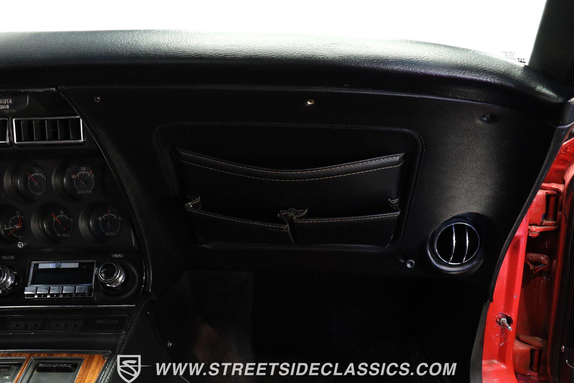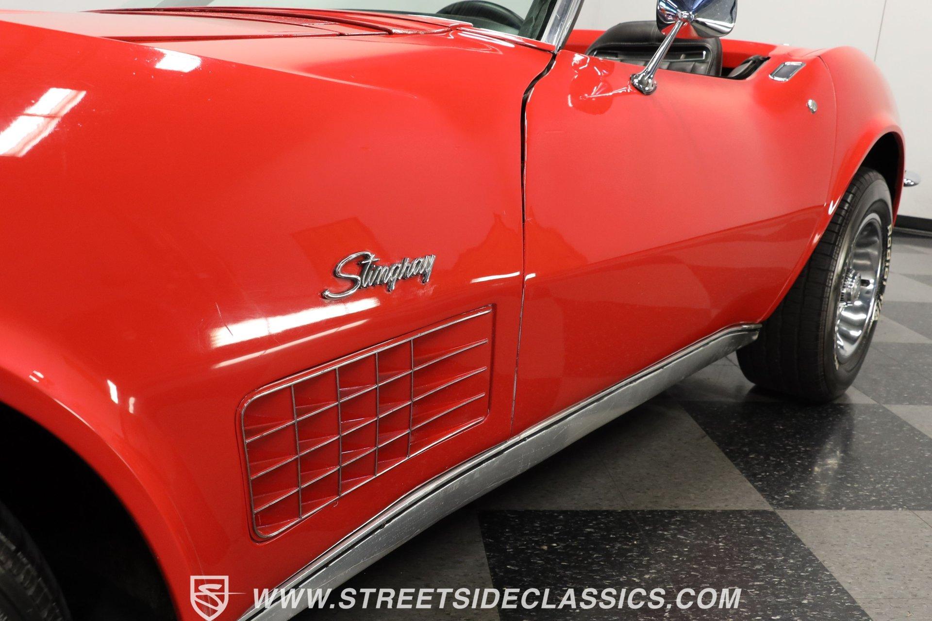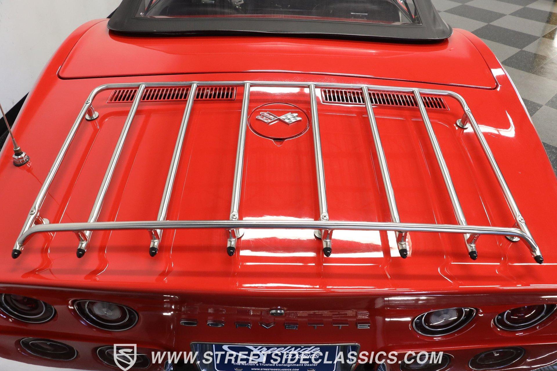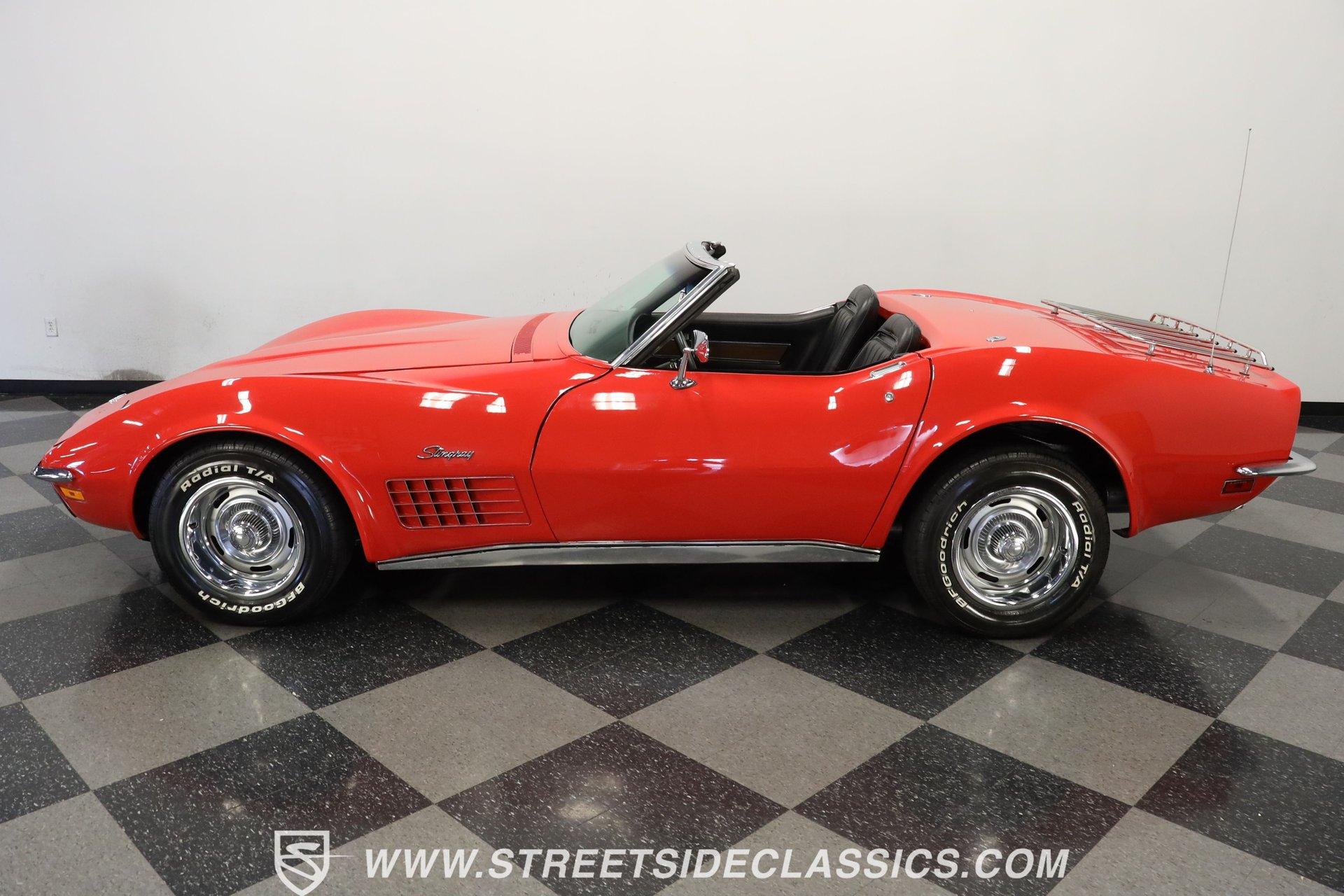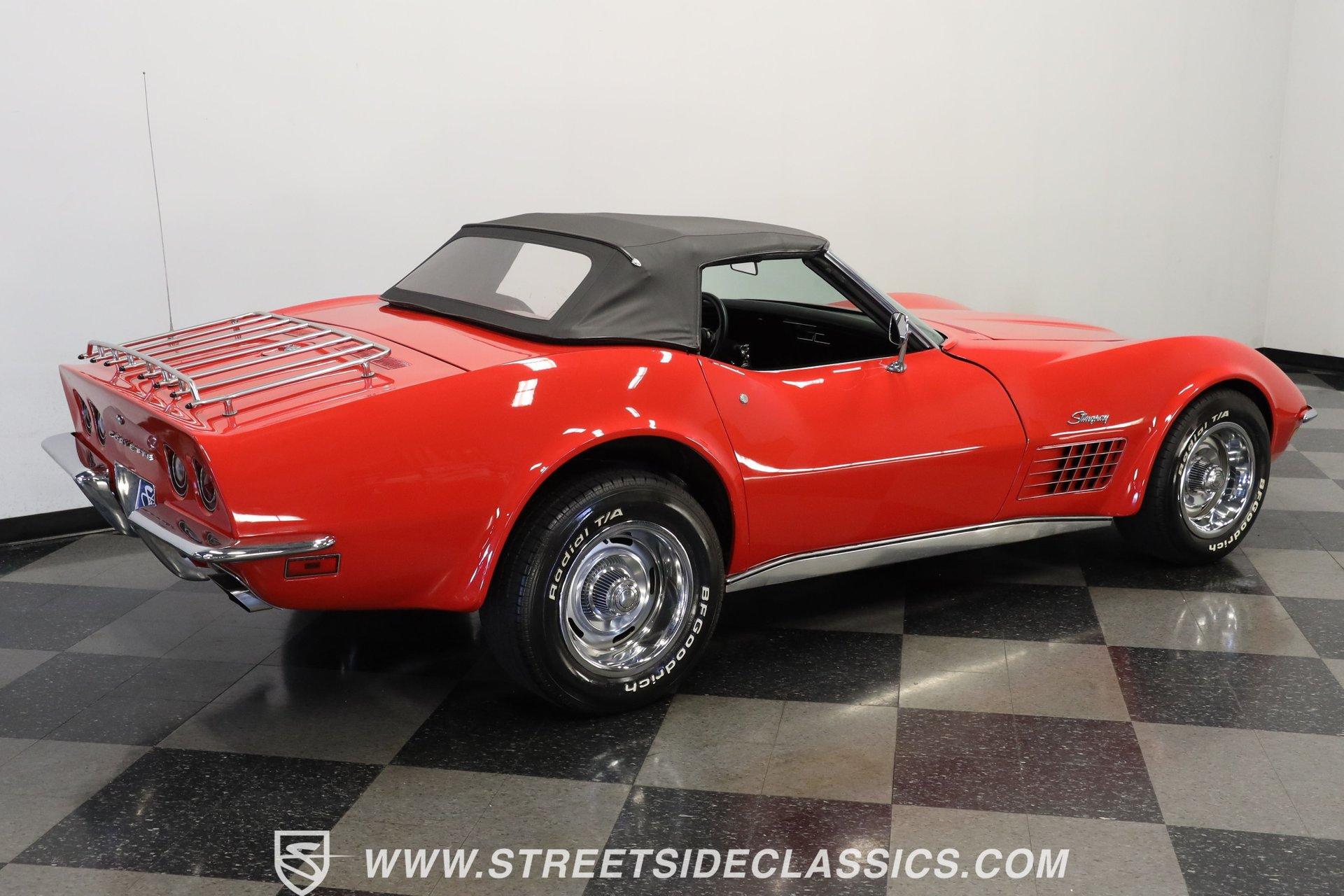 5112-TPA 1971 CHEVROLET CORVETTE CONVERTIBLE Sculpted curves and aggressive lines dominate this 1971 Chevrolet Corvette Convertible painted in brilliant red. The classic C3 styling features that unmistakable low-slung profile and wide stance that made these early Stingrays automotive icons. Chrome bumpers add flash to the front and rear, while the functional luggage rack offers both style and utility. The manual black canvas top folds neatly away for true open-air motoring. Those 15" chrome wheels complete the package with 235/60R15 front and 245/60R15 rear tires providing proper grip and visual balance to this legendary American sports car. The black vinyl interior offers a driver-focused environment with bucket seats positioned low in the cabin. The dash layout wraps around the driver with clear, legible gauges that monitor all vital functions. A tilt steering wheel allows for custom positioning while the floor-mounted shifter for the Muncie 4-speed sits perfectly at hand. The center console houses controls for the air conditioning system, keeping occupants cool during summer drives. The AM/FM radio provides soundtrack options while power windows add convenience to this classic Corvette's cabin. Powering this American legend is the numbers-matching 350 cubic inch V8 engine-a perfect balance of performance and reliability. The Muncie M20 4-speed manual transmission allows for complete control over the V8's power delivery. An Edelbrock intake manifold topped with an Edelbrock 4-barrel carburetor enhances throttle response and acceleration. The A-arm front suspension with coil springs works in harmony with the upgraded mono-leaf rear setup for balanced handling. Power disc brakes at all four corners provide substantial stopping ability to match the powertrain's capabilities. HIGHLIGHTS: Numbers-Matching 350 V8 Engine Muncie M20 4-Speed Manual Transmission Edelbrock Intake Manifold Edelbrock 4-Barrel Carburetor Factory Style Exhaust Headers Power 4-Wheel Disc Brakes Power Steering A-Arm Front Suspension with Coil Springs Mono-Leaf Rear Suspension Red Exterior Paint 15" Chrome Wheels in 235/60R15 Front, 245/60R15 Rear Tires Black Canvas Manual Convertible Top Chrome Bumpers Chrome Luggage Rack Black Interior with Bucket Seats Tilt Steering Wheel R134 Air Conditioning Power Windows AM/FM Radio Center Console with Floor Shifter Owner's Manual Service Manuals Receipts The unmistakable appeal of a classic American drop-top, combined with the numbers-matching V8, manual transmission, and four-wheel disc brakes makes this 1971 Chevrolet Corvette Convertible a true collector's prize. Authentic performance and style await. Call today! We can assist you with getting an Extended Vehicle Service Plan from Freedom Warranty, which provides comprehensive coverage that can save thousands of dollars on unexpected repairs. Inquire for more details and pricing!