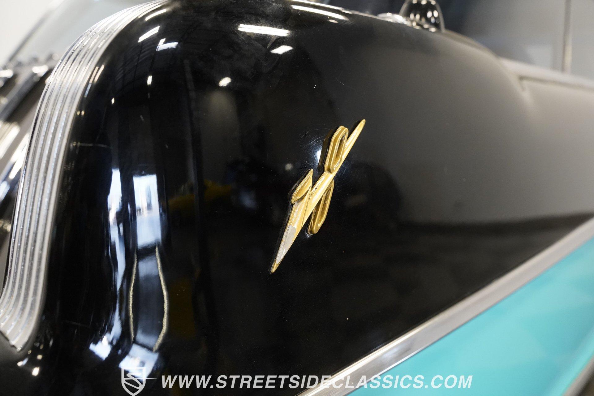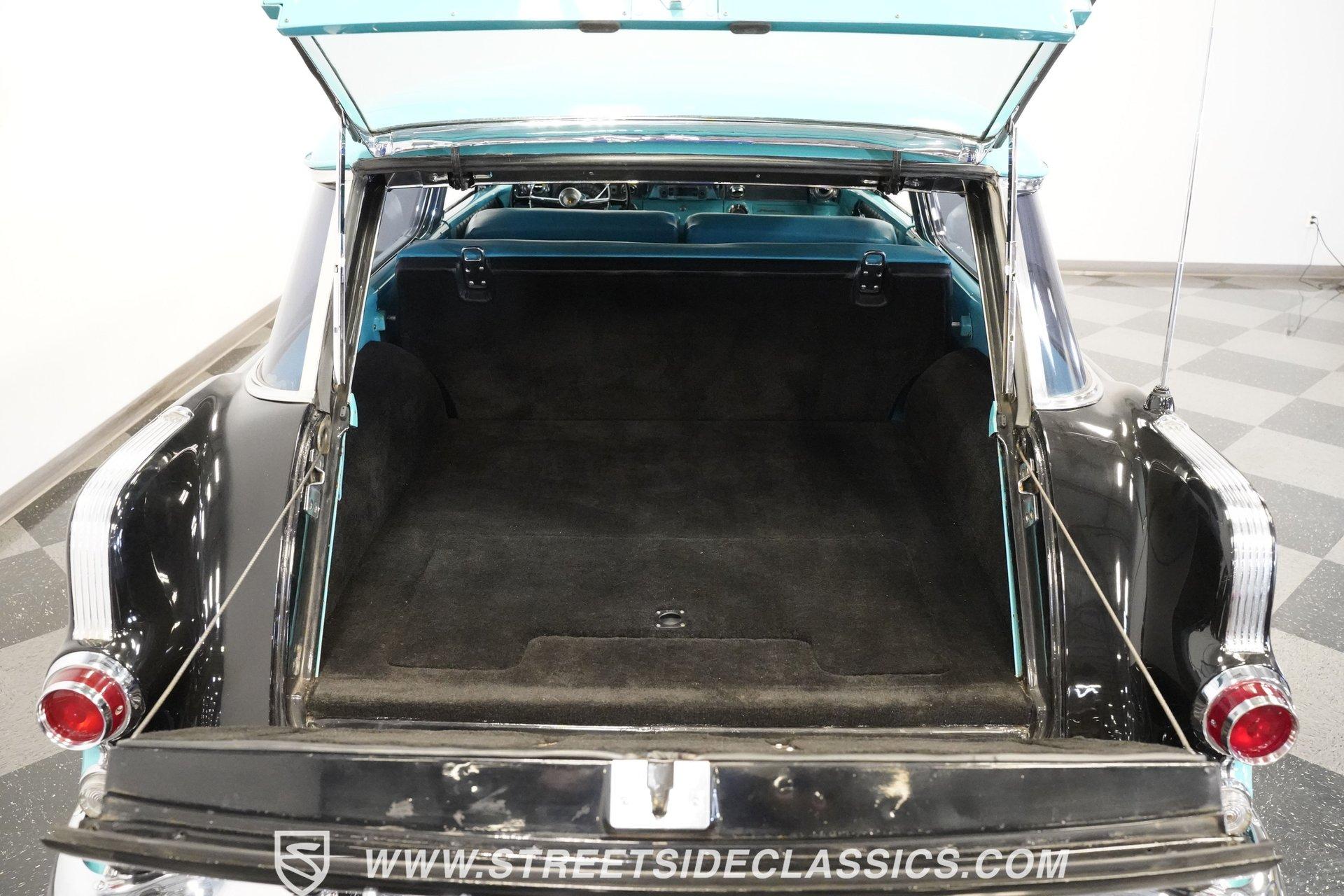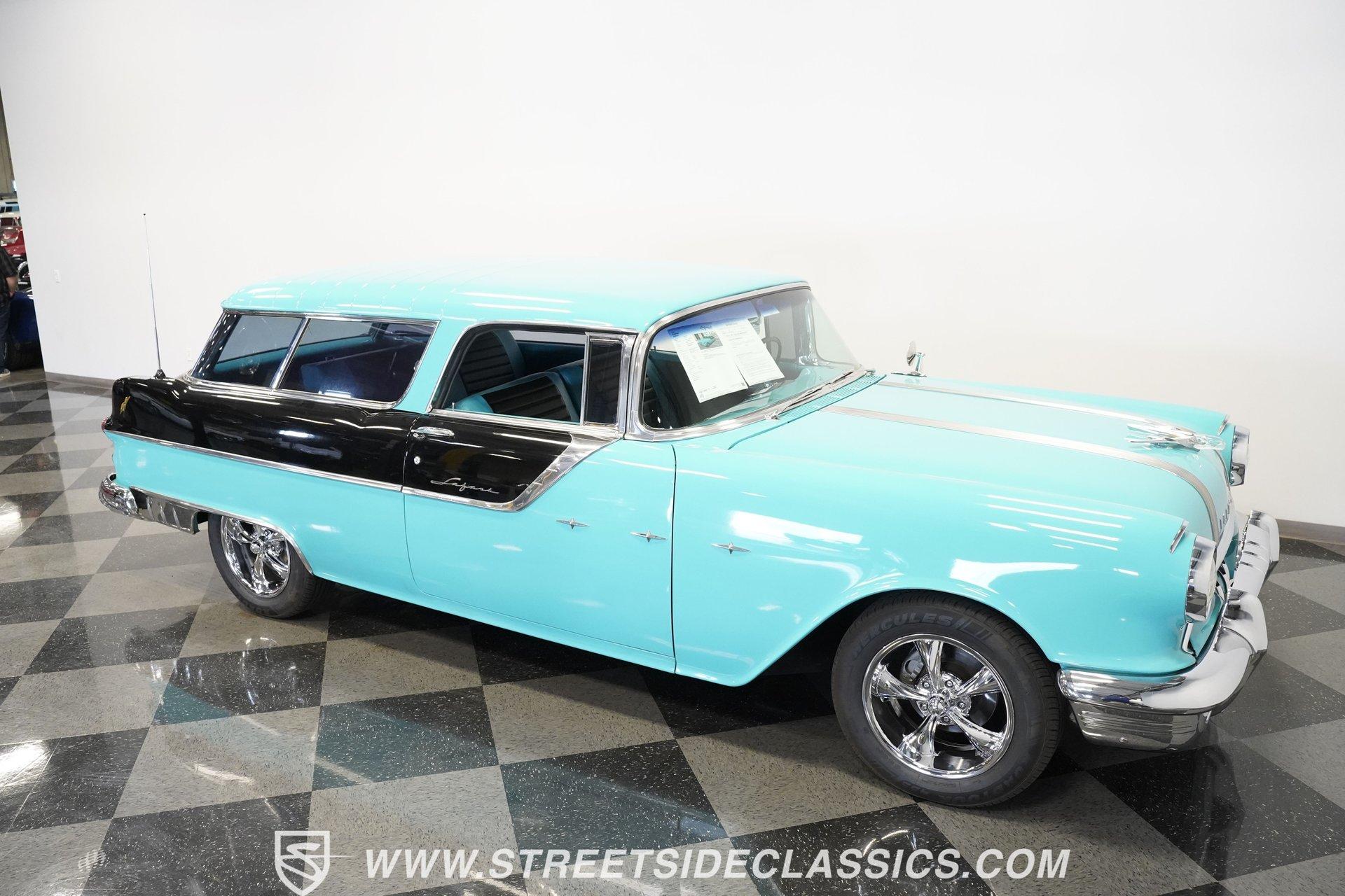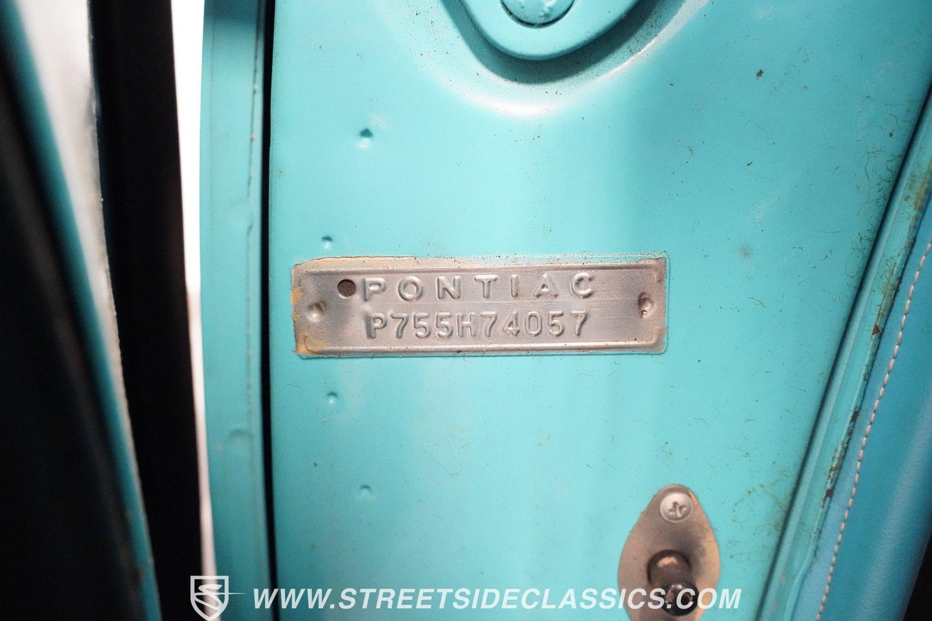 4354-PHX 1955 PONTIAC SAFARI Exceptionally rare with only 3,760 produced, this 1955 Pontiac Safari displays a spectacular two-tone Teal and Black paint scheme that highlights its distinctive wagon profile. The exterior lines pay homage to Chevy's Nomad styling while maintaining Pontiac's unique identity. Chrome Riddler 17-inch wheels add to this Safari's appearance, wrapped in Hercules 215/65R17 tires. Additional exterior features include an illuminating hood ornament, front bumper overrider, and dual exhaust outlets that exit beneath the rear bumper – all adding to this Safari's road presence. Black and Teal vinyl upholstery fills the interior, expertly matching the exterior color scheme. The split bench seat offers comfortable seating while maintaining the period-correct look. A column-mounted shifter keeps the cabin open, while modern additions improve the driving setup. The dash contains an AM/FM stereo with Bluetooth and auxiliary input options. Power steering allows for easy maneuvering, and strategically placed vents mounted below the dash allow for climate adjustment. A formidable 454 cubic inch V8 engine with electronic fuel injection sits in this classic wagon. The TH400 3-speed automatic transmission handles gear changes, making this Safari great for cruising or daily use. Power disc brakes up front, a 9-inch rear axle, and a tuned suspension system with independent front control arms with coil springs and a solid rear axle with leaf springs and air shocks improve handling. A custom aluminum radiator keeps temperatures in check, while Flowmaster mufflers create an ideal exhaust tone. HIGHLIGHTS: 454 V8 Engine Electronic Fuel Injection TH400 3-Speed Automatic Transmission Custom Aluminum Radiator Power Disc Brakes 9-Inch Rear Axle Independent Front Suspension with Coil Springs Solid Rear Axle with Leaf Springs and Air Shocks Dual Exhaust with Flowmaster Mufflers Ron Francis Wiring Kit Two-Tone Teal and Black Paint 17" Chrome Riddler Wheels with 215/65R17 Hercules Tires Illuminating Hood Ornament Front Bumper Overrider Custom Two-Tone Paint Job Black and Teal Interior with Split Bench Seat Column Shifter Power Steering AM/FM Stereo with Bluetooth and Auxiliary Input Digital Gear Indicator Display This 1955 Pontiac Safari gives you classic 50s design with upgraded performance. The 454 V8 engine, comfortable vinyl interior, and attractive two-tone exterior make this rare wagon a genuine collector's vehicle. Call today!