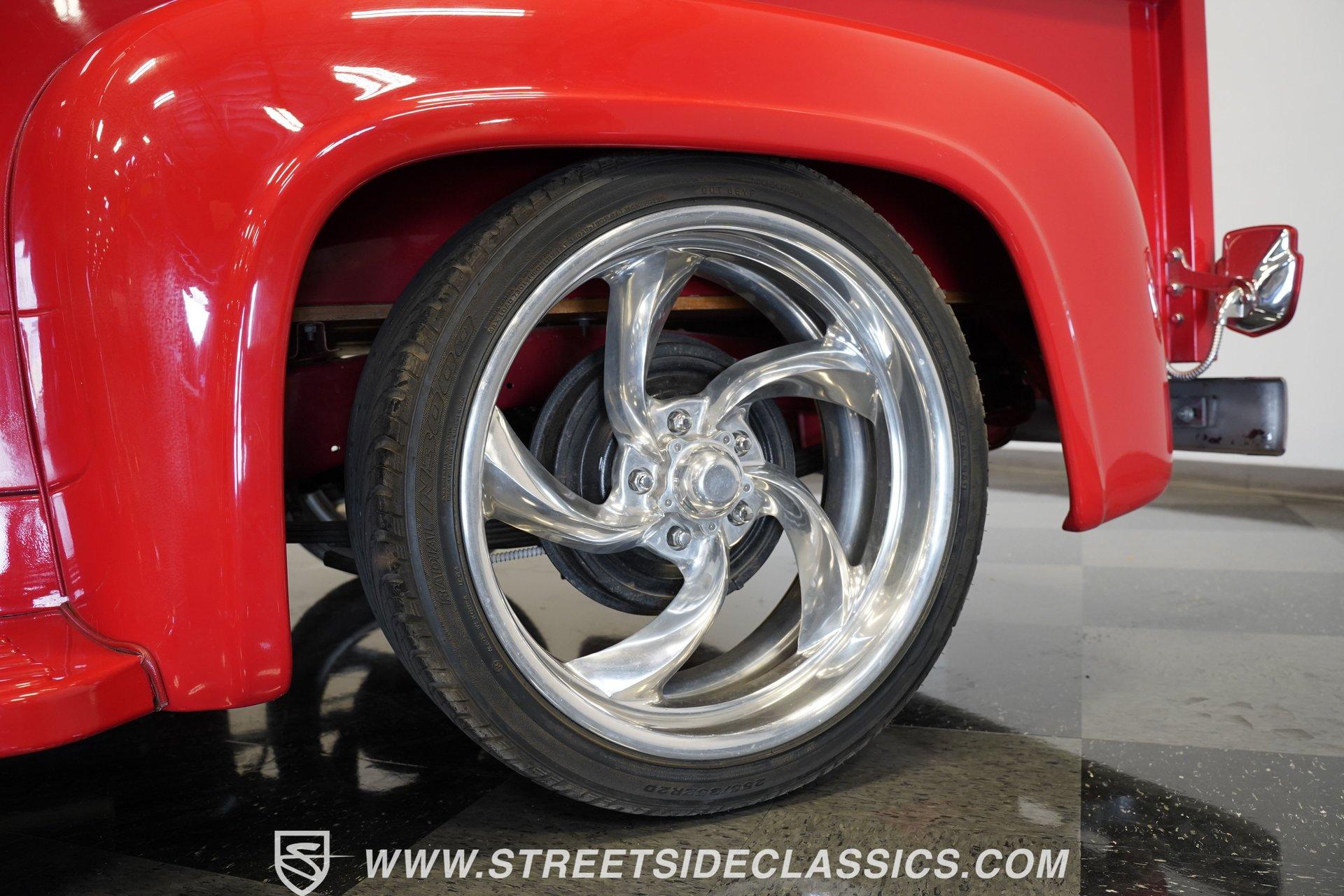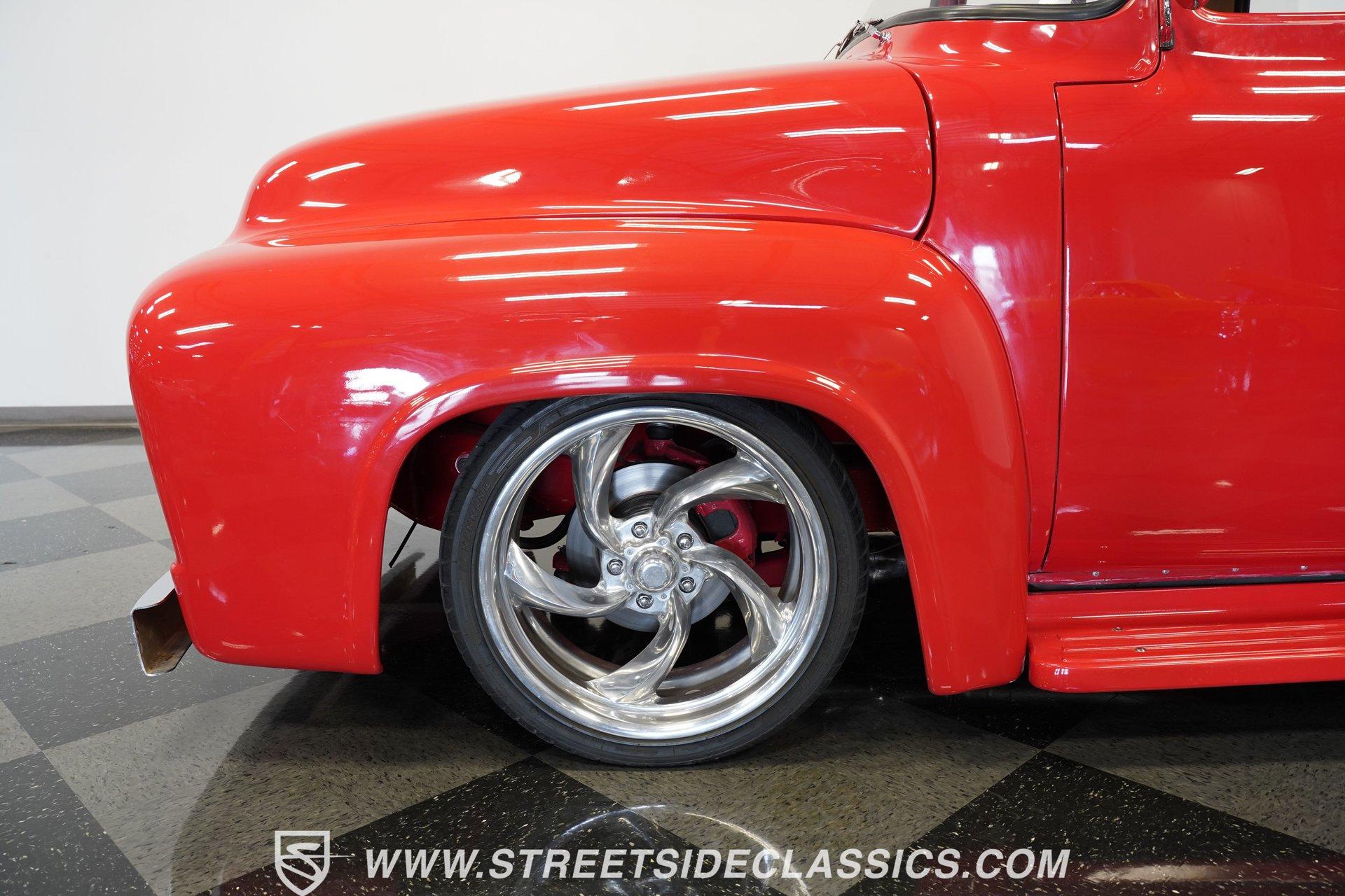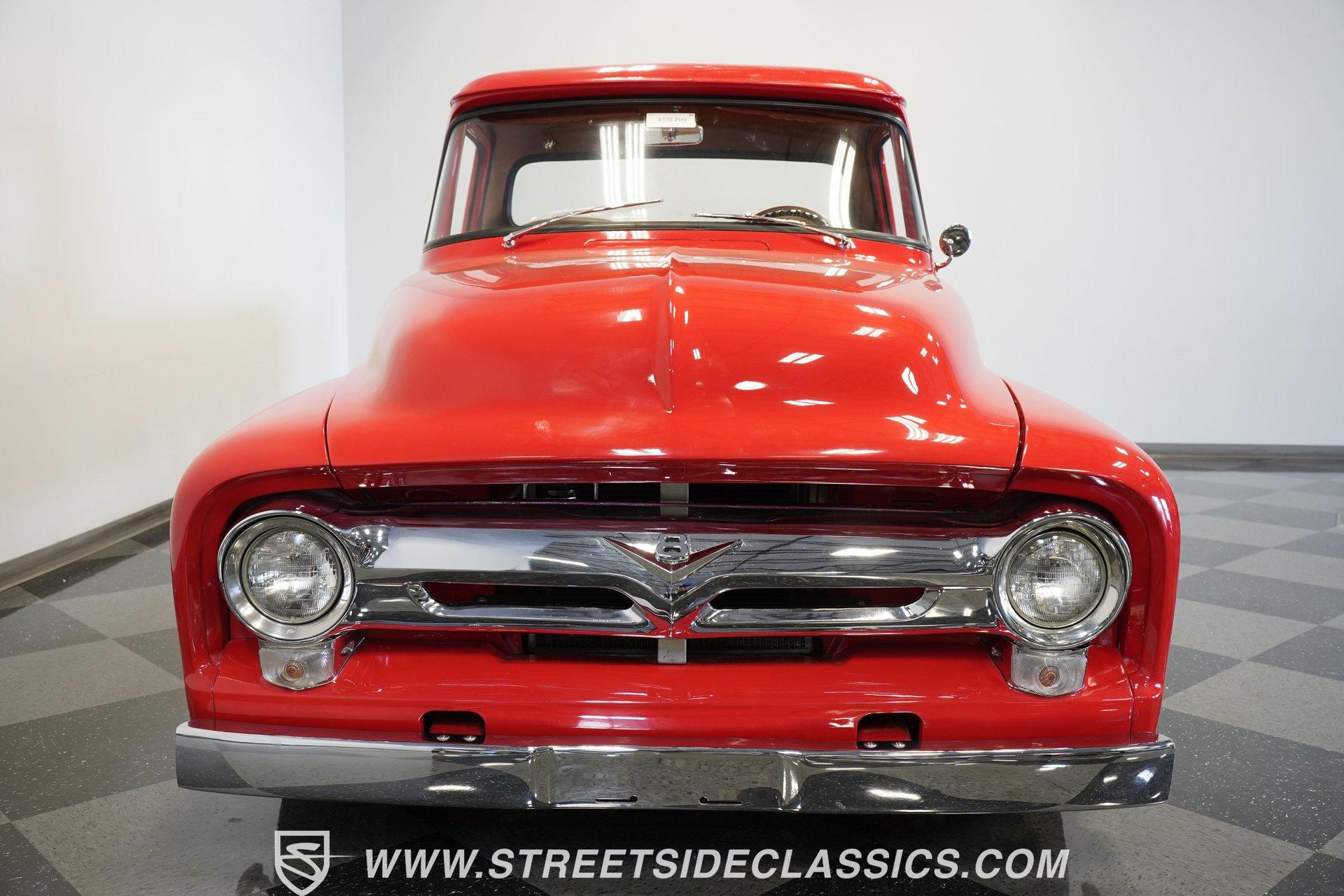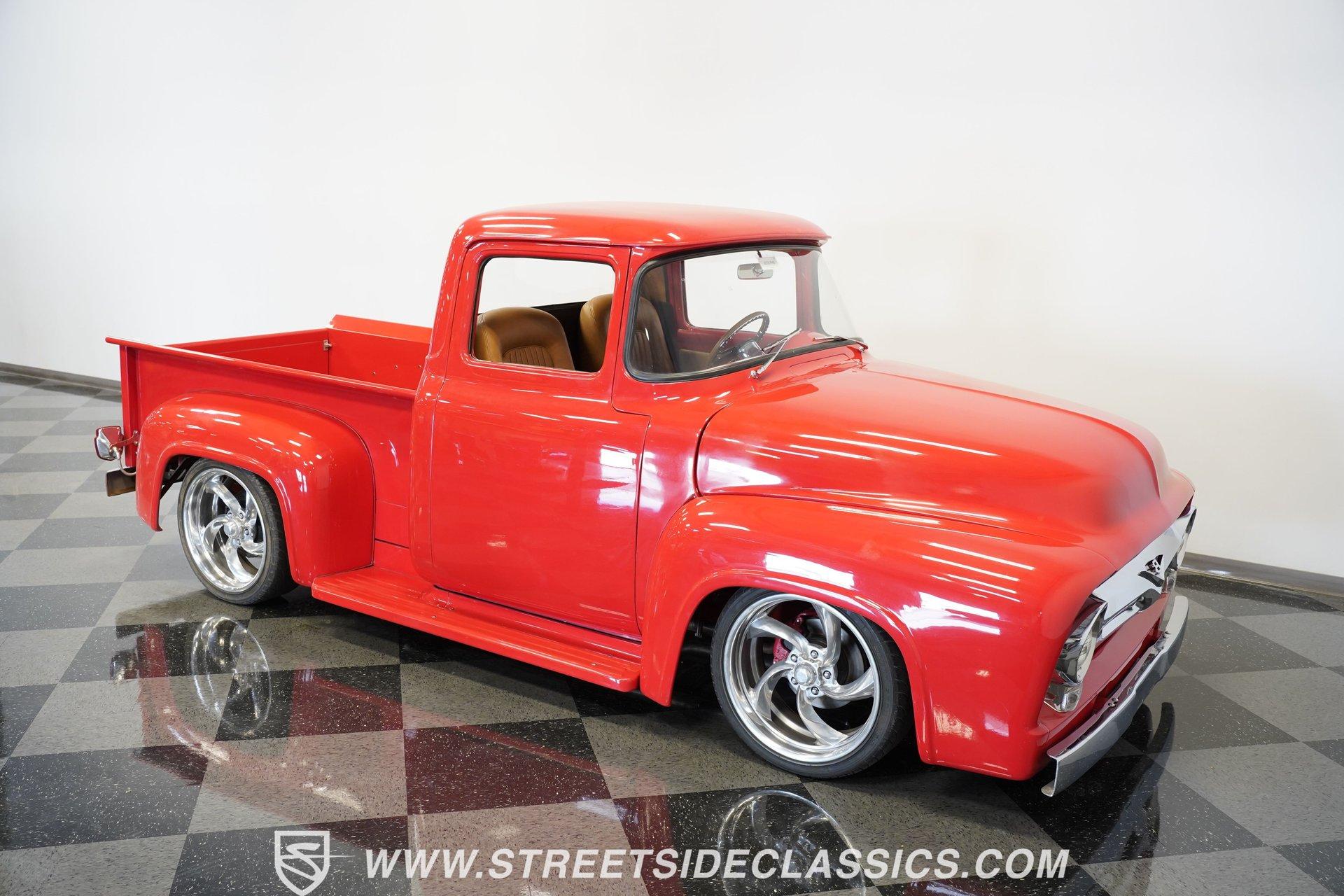 4378-PHX 1956 FORD F-100 American truck evolution took a major leap forward with this 1956 Ford F-100, sporting a fiery red finish that amplifies its classic pickup profile. Ford's iconic styling cues remain intact while the lowered stance gives this F-100 a planted, aggressive look that's distinctly modern. The front grille and bumper showcase the clean original design that made these trucks legendary, while the sleek lines of the hood flow perfectly toward the cab. Running along the sides, the trim pieces and clean body panels create a cohesive package, complemented by massive 20-inch wheels and Nexen 255/35/20 tires that fill the wheel wells perfectly. The wood-paneled bed adds a touch of craftsmanship, providing both function and style to this remarkable pickup. The camel-colored interior creates a warm, inviting cabin space that contrasts beautifully with the exterior. Vinyl bucket seats provide both comfort and support, while the matching headliner, sun visors, and door panels maintain design consistency throughout. The red-painted dashboard houses a set of aftermarket gauges delivering vital information at a glance. A chrome steering column topped with a leather-wrapped steering wheel combines modern touch with classic styling. Additional amenities include power windows, power seats, a tilt wheel, and a modern touchscreen radio system with Bluetooth and satellite capabilities, bringing contemporary convenience to this vintage truck's cabin. Powering this classic is a Chevrolet 350 cubic inch V8 engine with an Edelbrock four-barrel carburetor mounted on a polished intake manifold. The powerplant pairs with a TH350 three-speed automatic transmission for effortless cruising. Long tube headers and dual exhaust provide improved breathing and a muscular exhaust note. The chassis has been upgraded with an independent front suspension featuring control arms, coil springs, shocks, and a sway bar, while the rear retains a solid 10-bolt axle with leaf springs. Stopping power comes from power-assisted front disc brakes, and the power steering system makes maneuvering this pickup a breeze. HIGHLIGHTS: 350 Cubic Inch V8 Engine TH350 3-Speed Automatic Transmission Single Edelbrock 4-Barrel Carburetor Polished Intake Manifold Long Tube Headers Dual Exhaust Power Disc Brakes Independent Front Suspension with Control Arms, Coil Springs, Shocks, and Sway Bar Solid Axle Rear Suspension with Leaf Springs 10-Bolt Rear Axle Red Paint 20" Front and Rear Wheels 255/35/20 Front and Rear Nexen Tires Lowered Stance Wood-Paneled Short Bed Camel Interior with Power Bucket Seats Custom Center Console Matching Headliner and Door Panels Red-Painted Dashboard Aftermarket Gauges Chrome Steering Column Leather-Wrapped Steering Wheel Power Windows Power Steering Tilt Wheel Touchscreen Nav, AM/FM, Bluetooth, Satellite Radio Ford's legendary F-100 receives a masterful transformation in this 1956 model, blending vintage truck styling with modern performance upgrades. From the rumbling 350 V8 to the comfortable custom interior and aggressive stance on 20-inch wheels, this pickup delivers the perfect balance of classic looks and modern drivability. Call today!